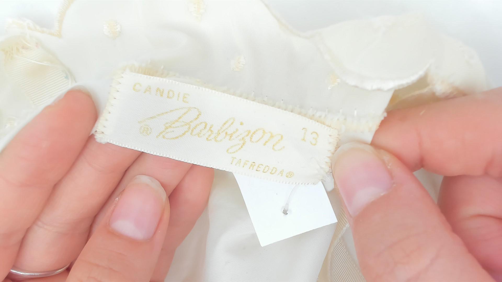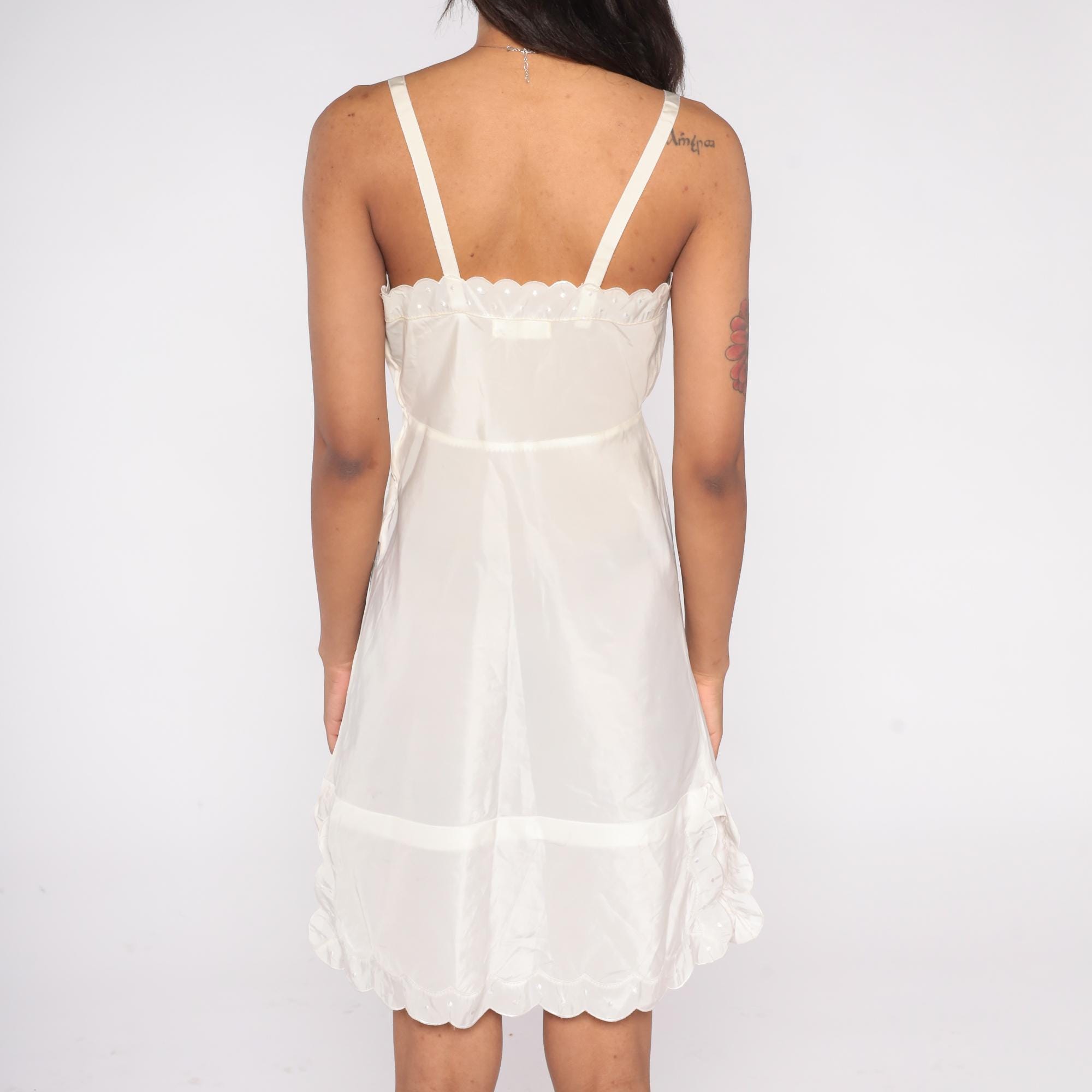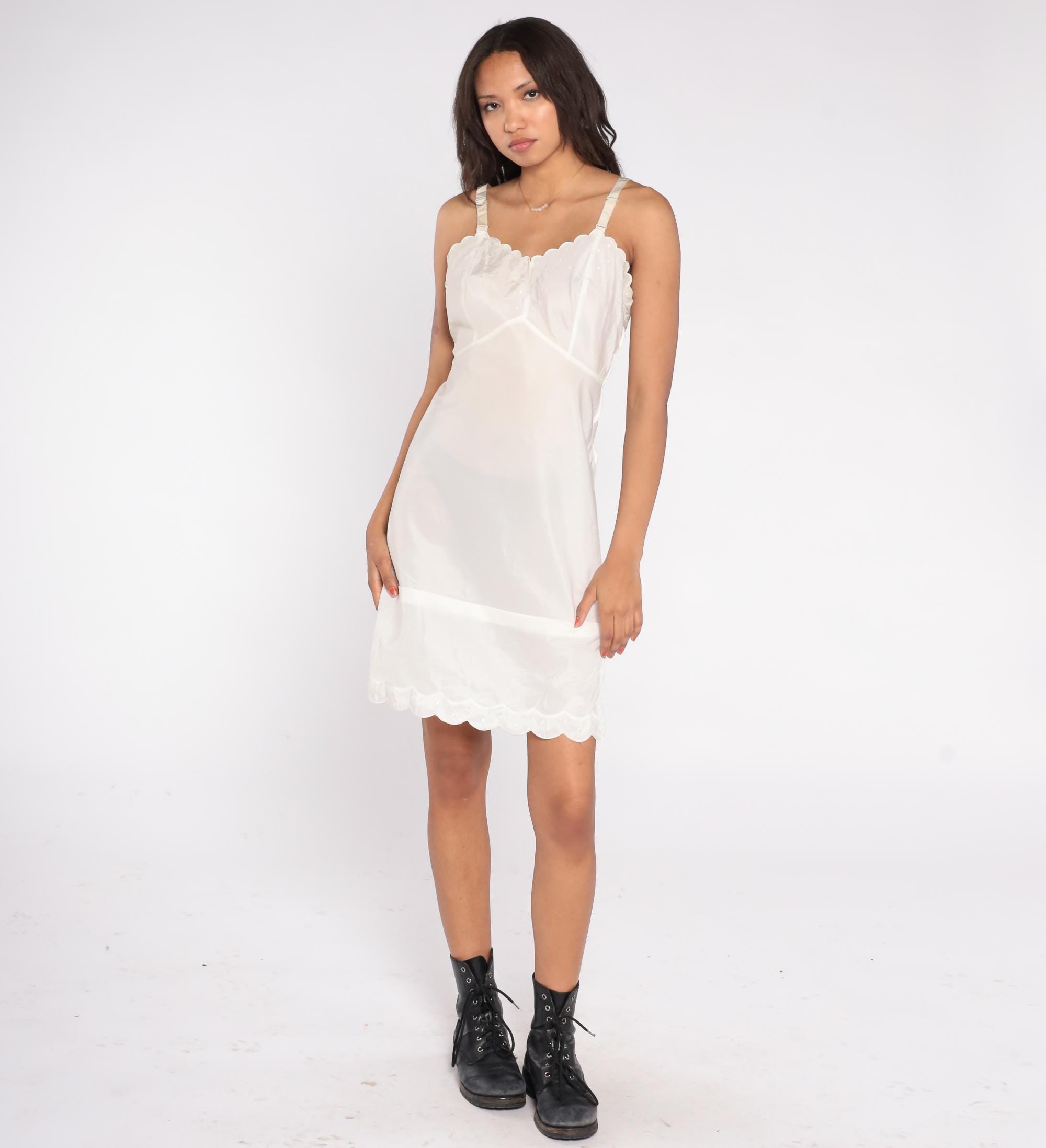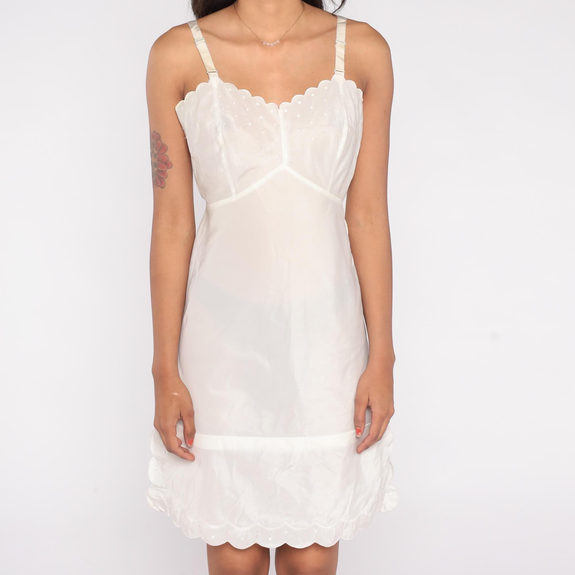 60s Barbizon slip dress in pristine white featuring elegant dotted Swiss fabric at bodice. Feminine scalloped edges at neckline and hem. Structured sweetheart bodice with princess seams. Adjustable satin straps. Empire waist design with full skirt.