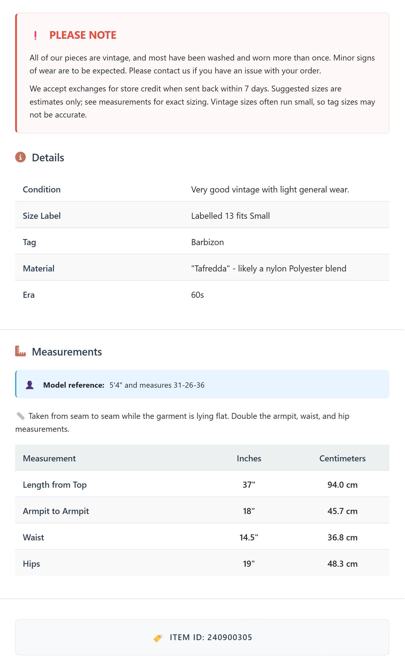 All of our pieces are vintage, and most have been washed and worn more than once. Minor signs of wear are to be expected. Please contact us if you have an issue with your order. We accept exchanges for store credit when sent back within 7 days.