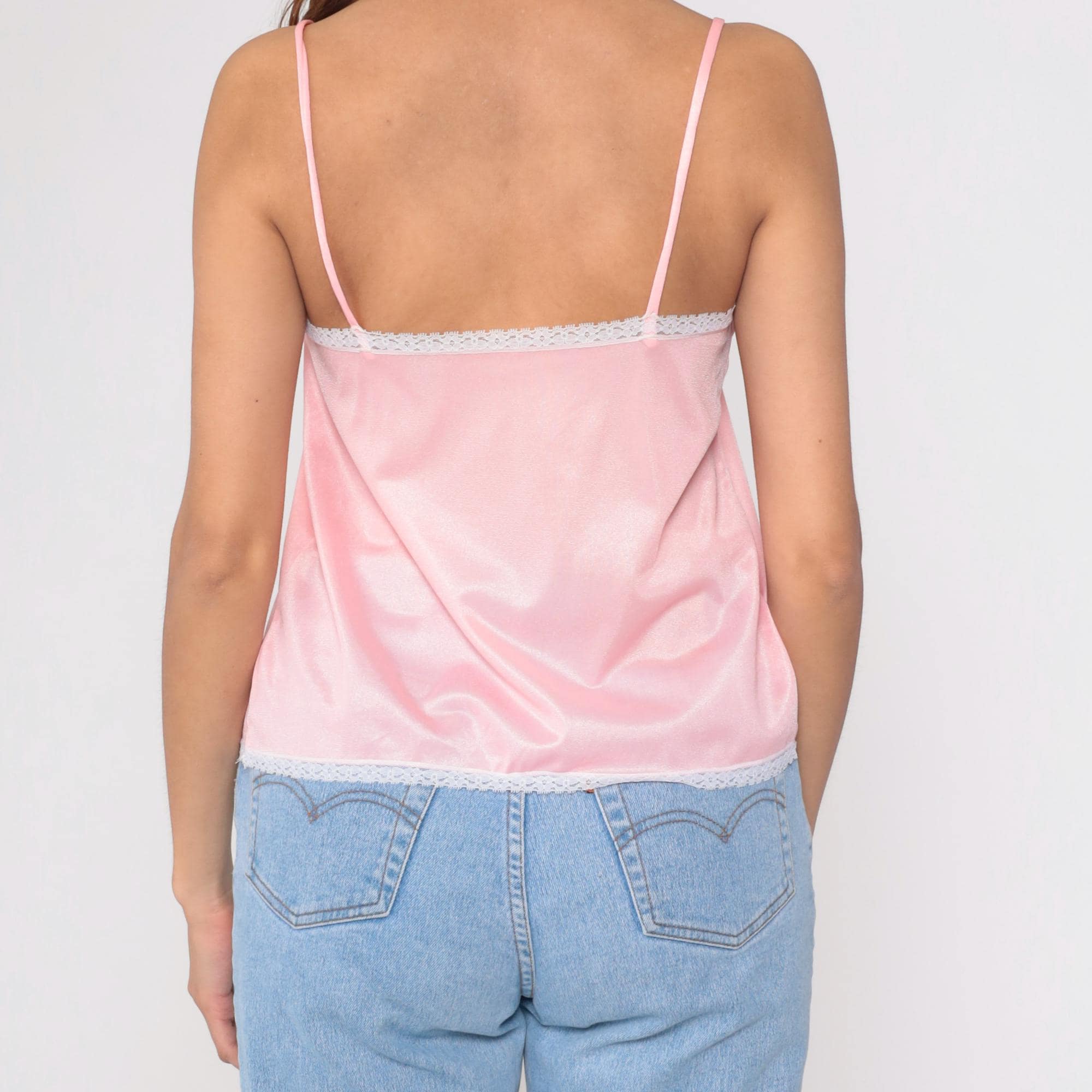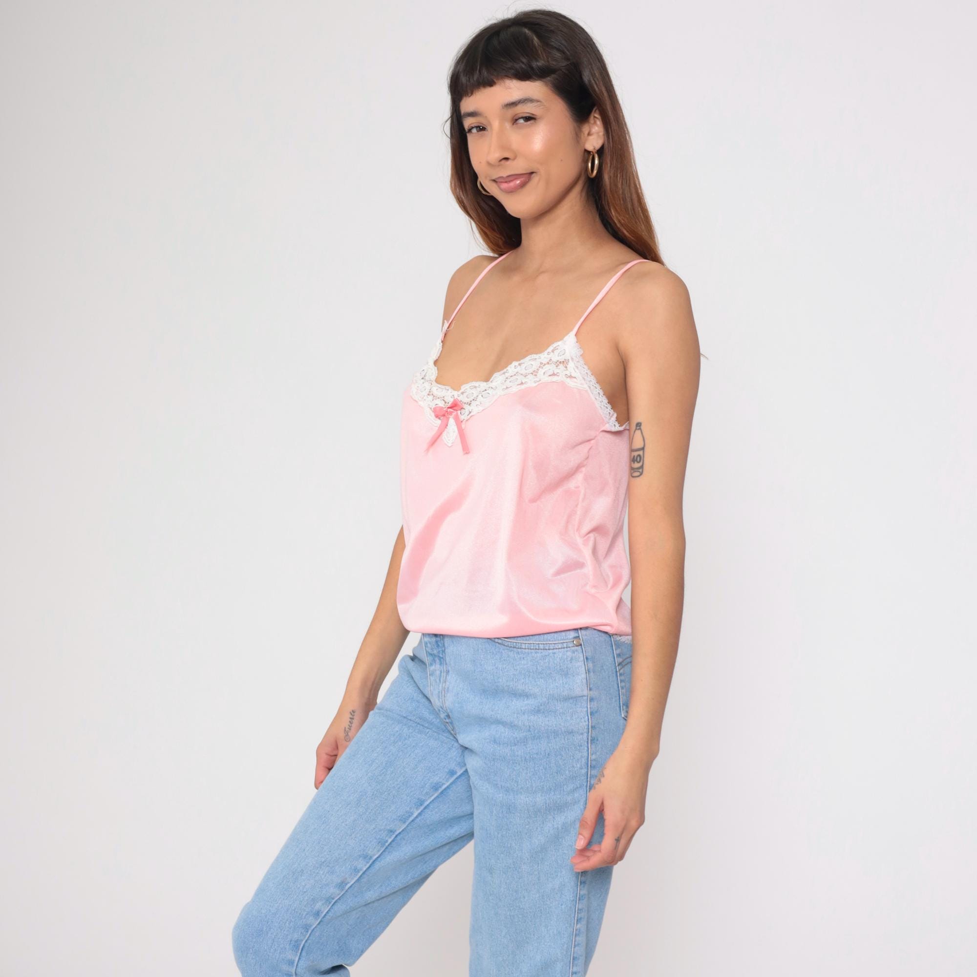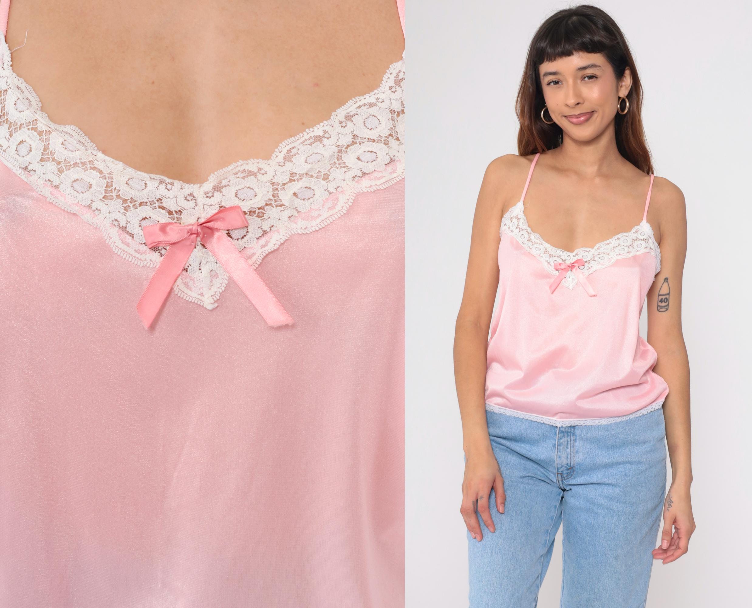 Vintage 80s camisole in beautiful pink satin with white lace trim. Features delicate spaghetti straps and sweet bow detail at center front. Silky nylon fabric with scalloped lace edging at neckline and hem.