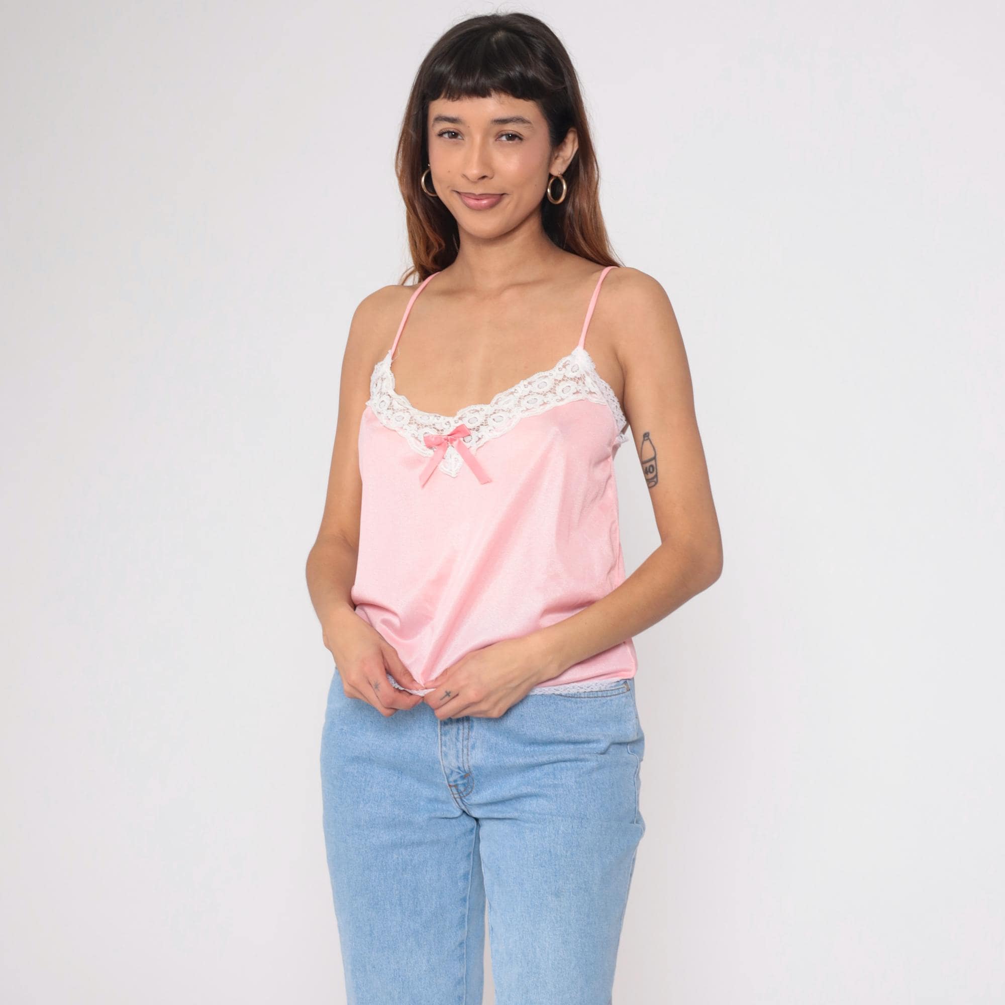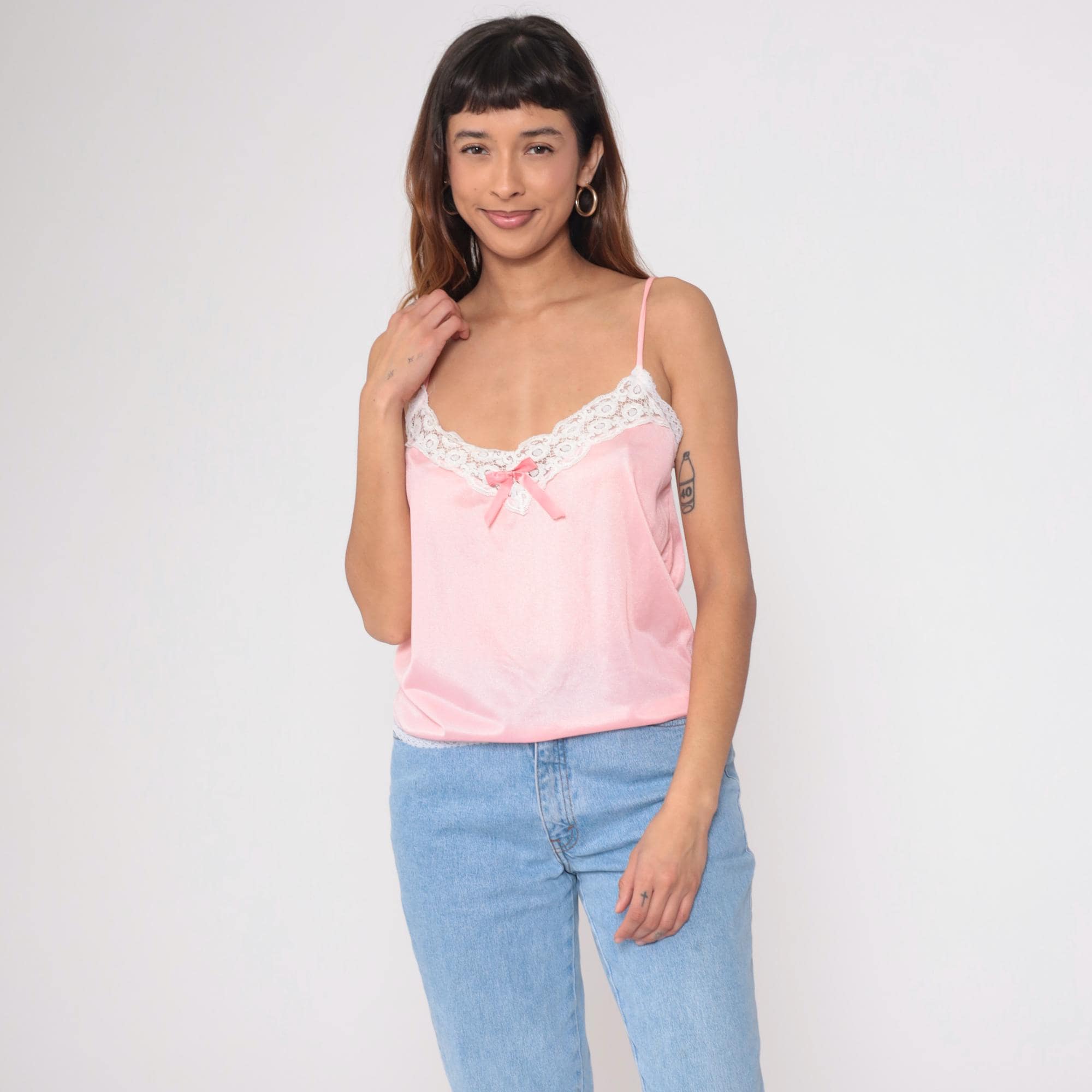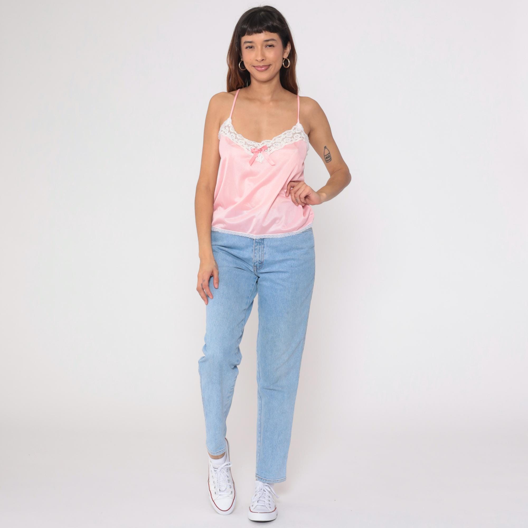 Vintage 80s camisole in beautiful pink satin with white lace trim. Features delicate spaghetti straps and sweet bow detail at center front. Silky nylon fabric with scalloped lace edging at neckline and hem.