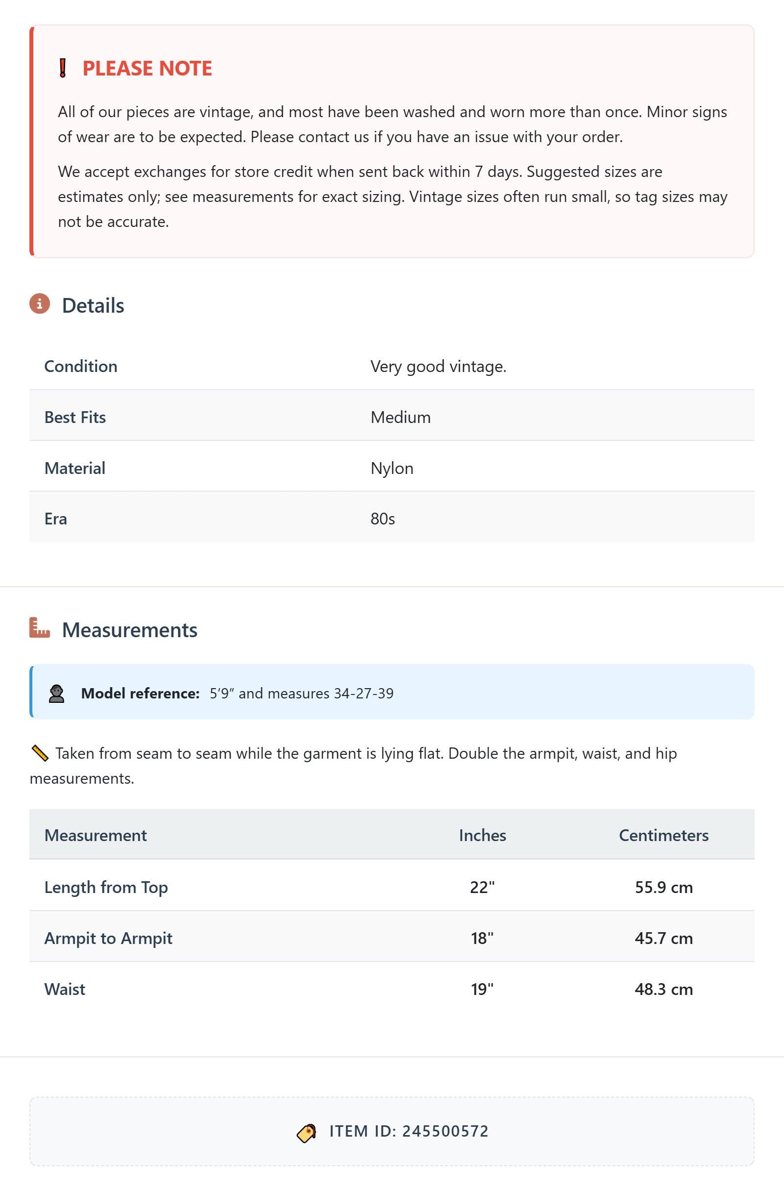 All of our pieces are vintage, and most have been washed and worn more than once. Minor signs of wear are to be expected. Please contact us if you have an issue with your order. We accept exchanges for store credit when sent back within 7 days.