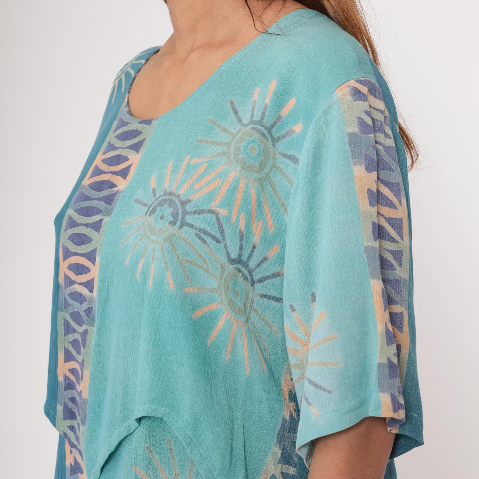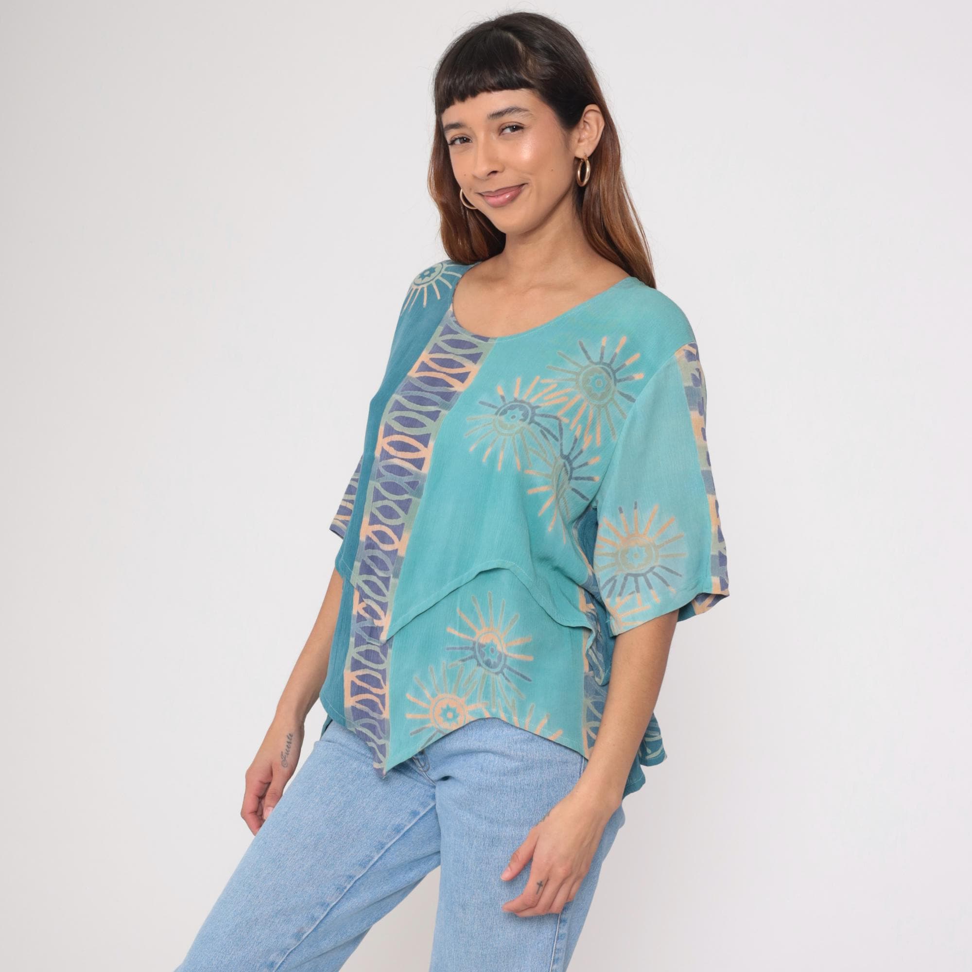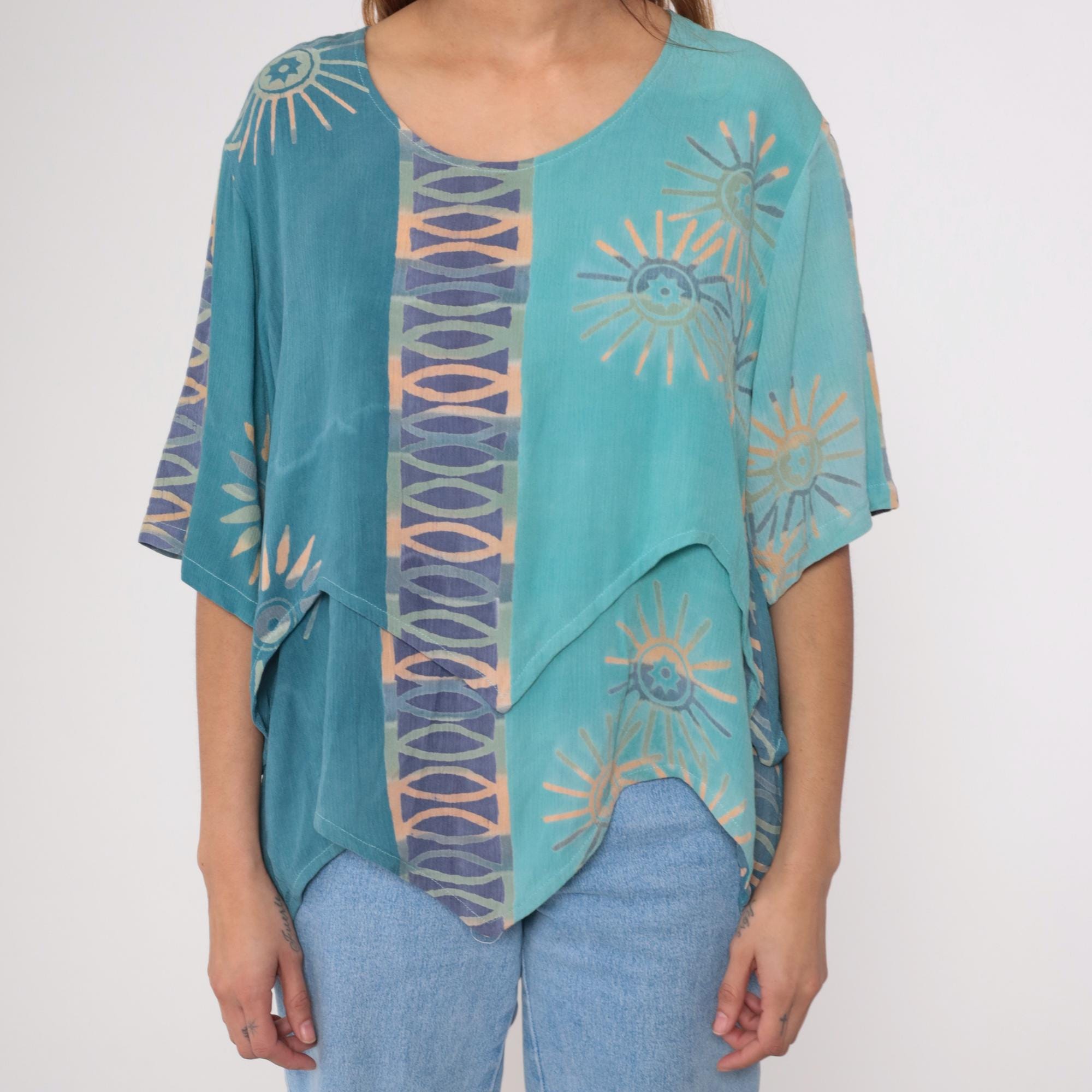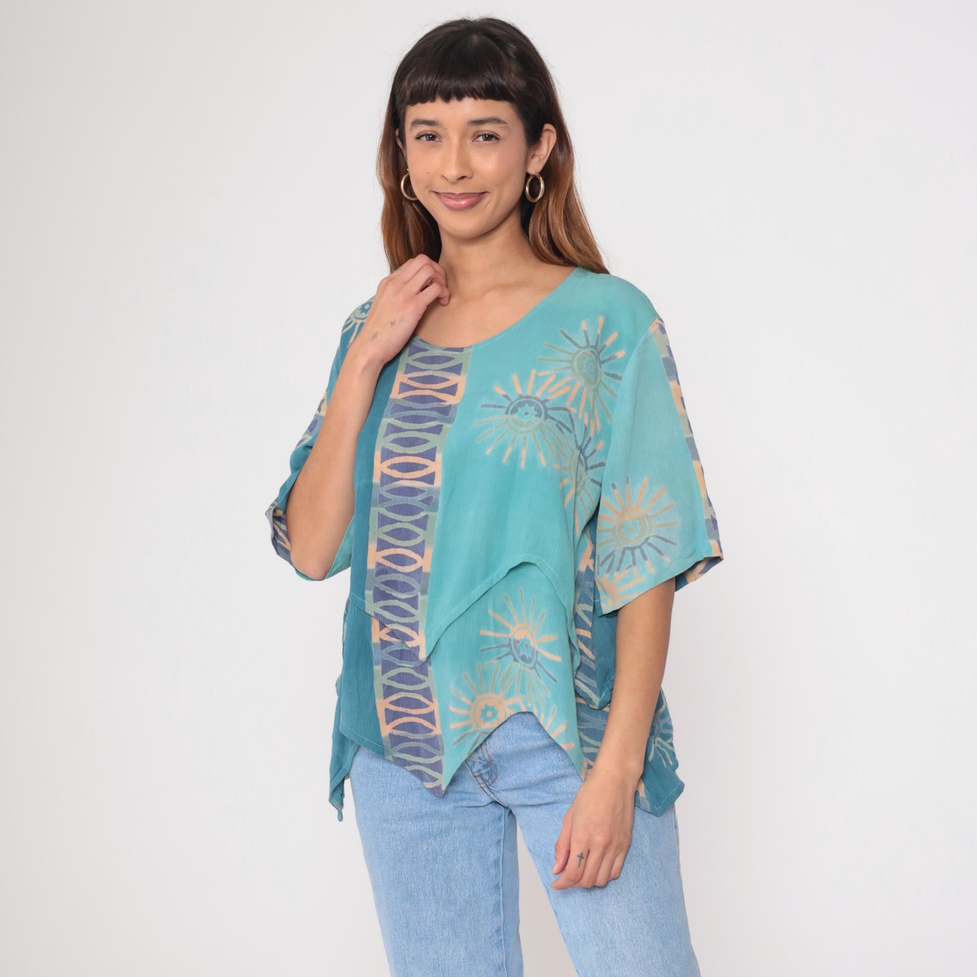 Vintage Y2K asymmetric layered top from Silver Stream featuring a teal blue background with sun pattern print. Geometric design with purple and peach accents creates visual interest. Short sleeves with scoop neck and layered asymmetric hem. Button closure at back.