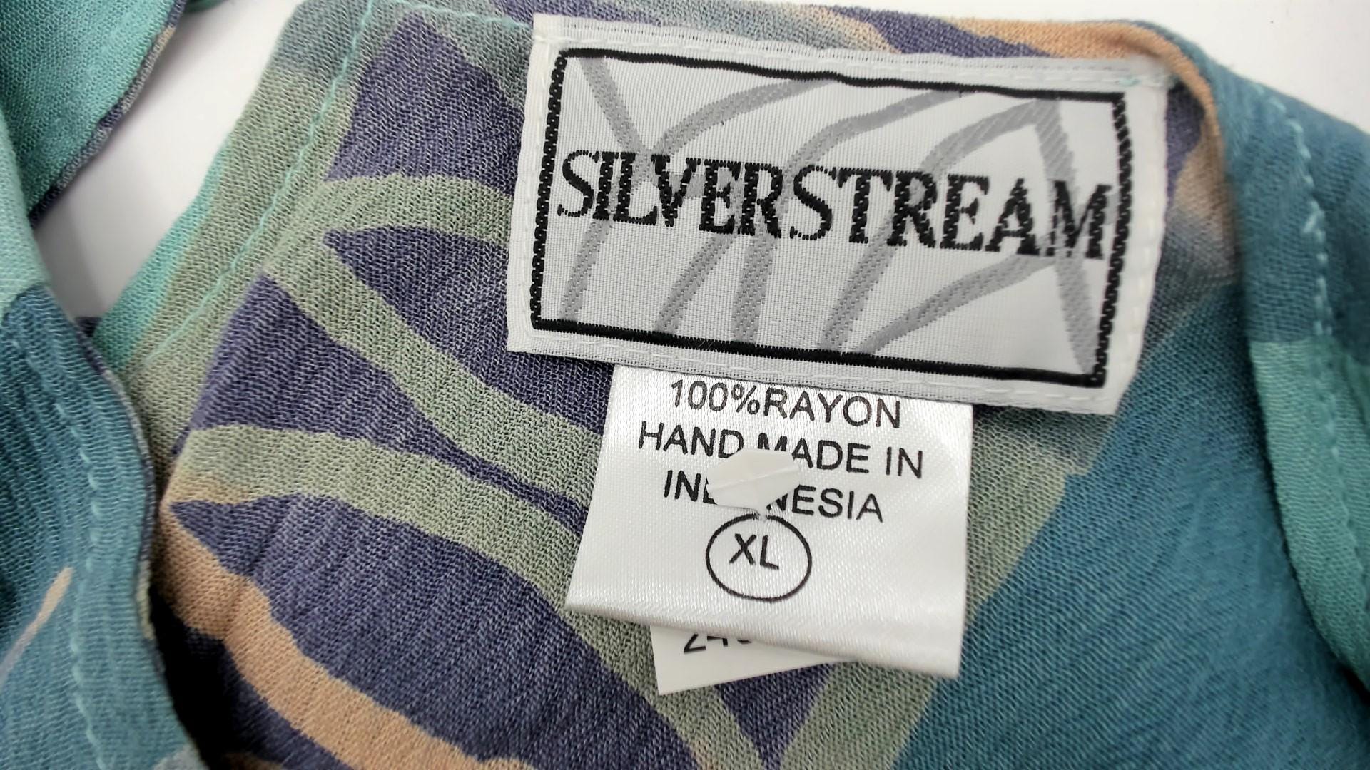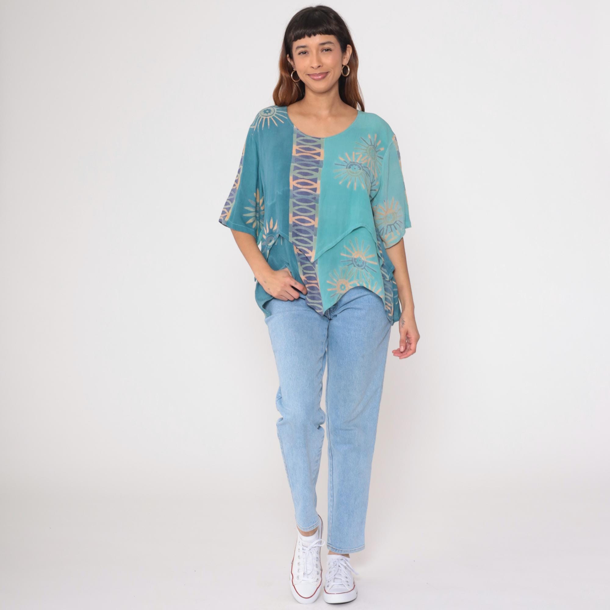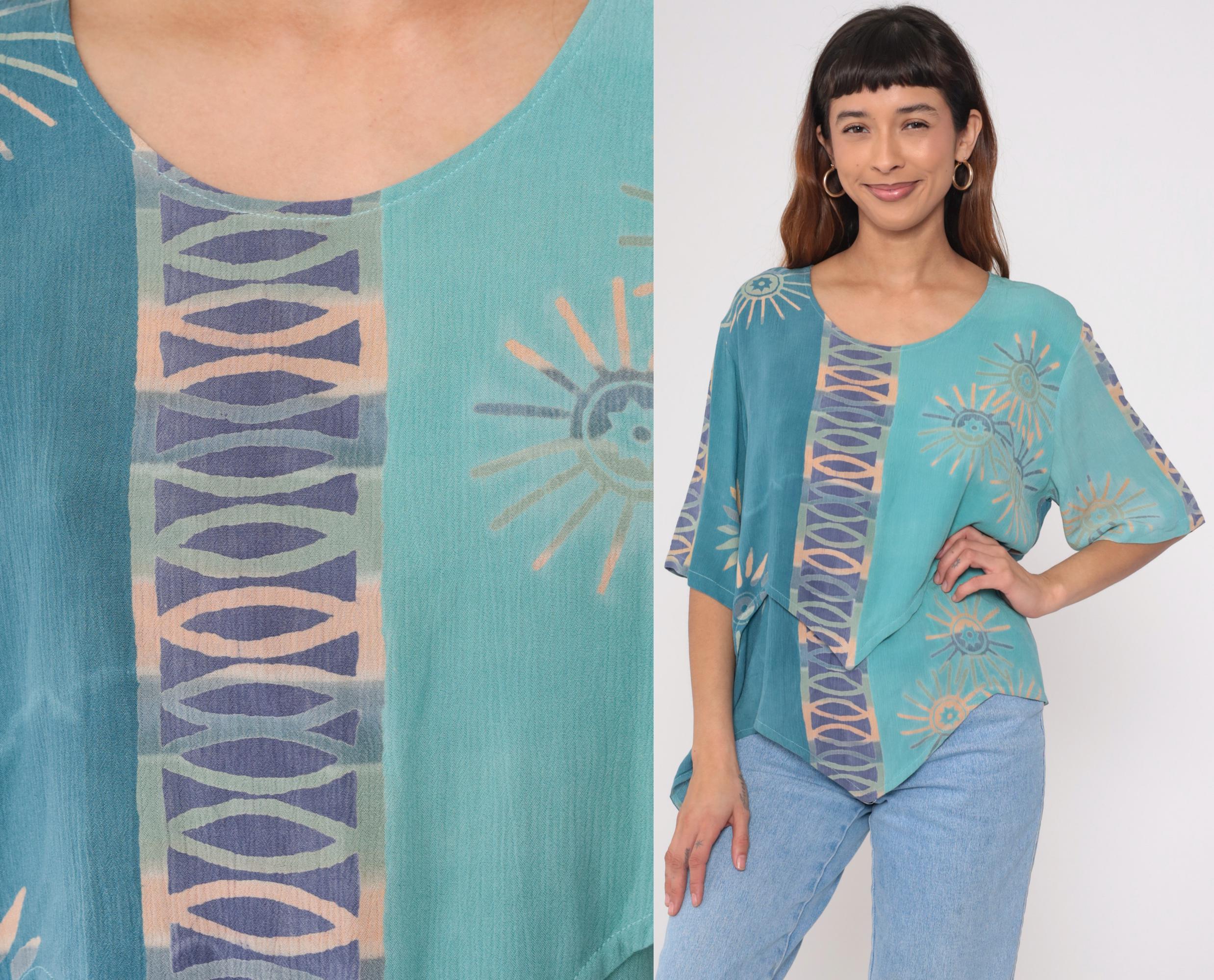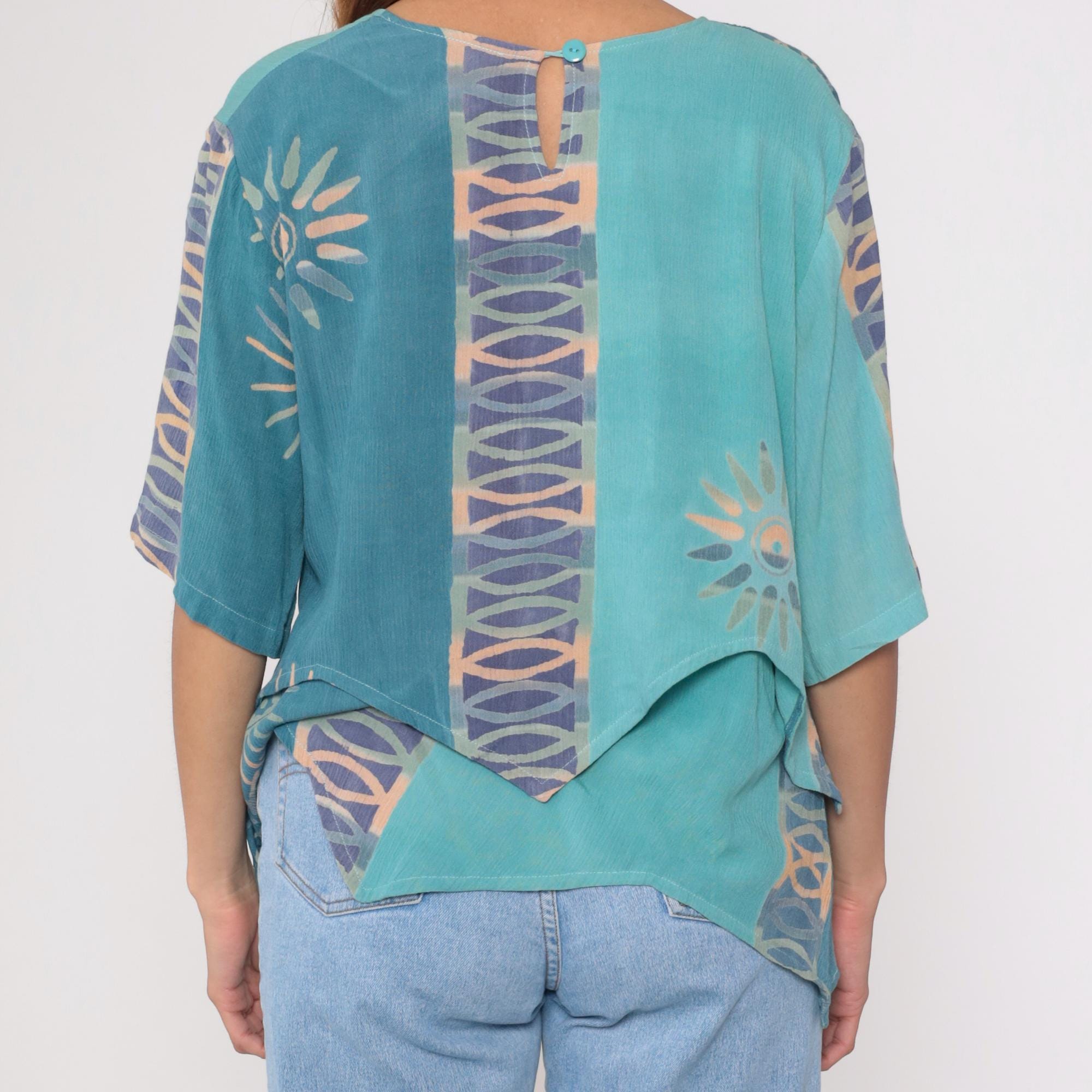 Vintage Y2K asymmetric layered top from Silver Stream featuring a teal blue background with sun pattern print. Geometric design with purple and peach accents creates visual interest. Short sleeves with scoop neck and layered asymmetric hem. Button closure at back.