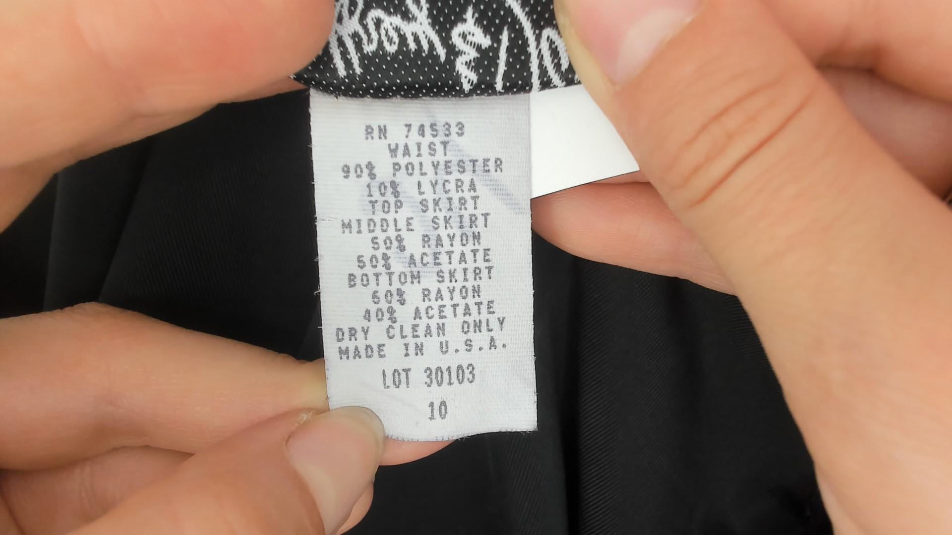 Material: Labelled waist 90 Polyester 10 lycra top skirt middle skirt 50 Rayon 50 Acetate bottom skirt 60 Rayon 40 Acetate