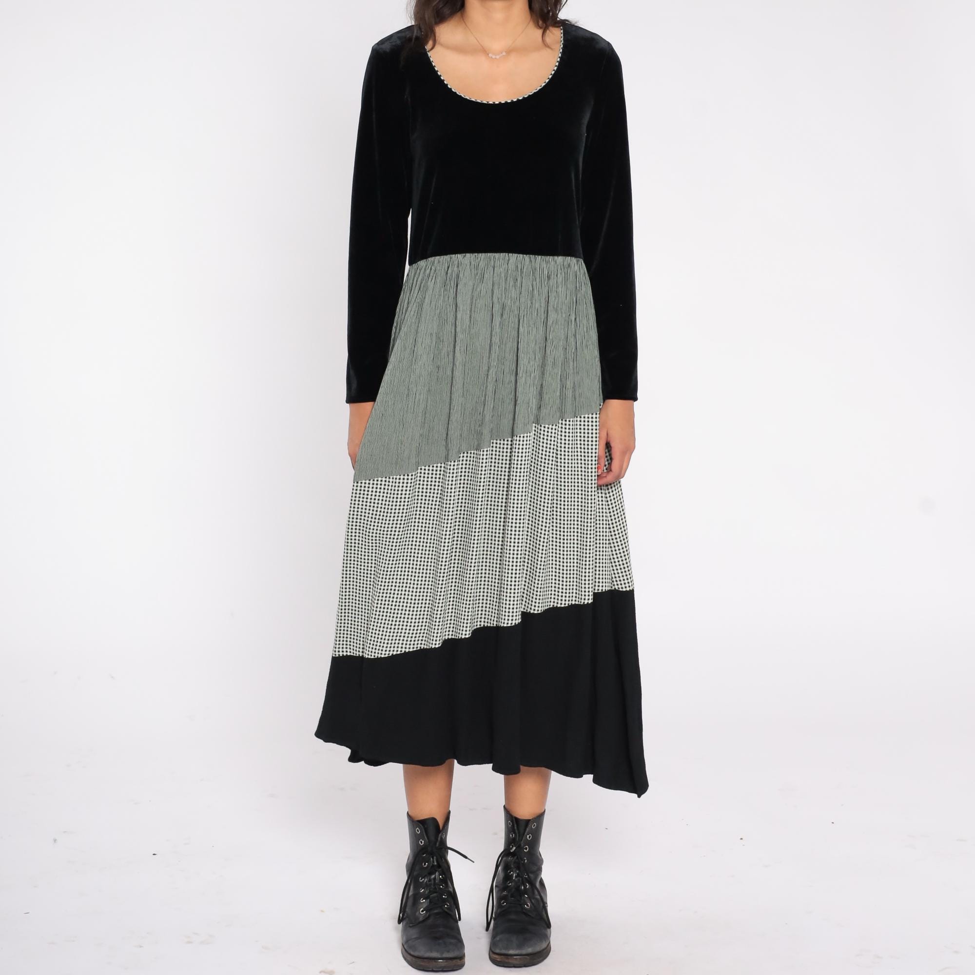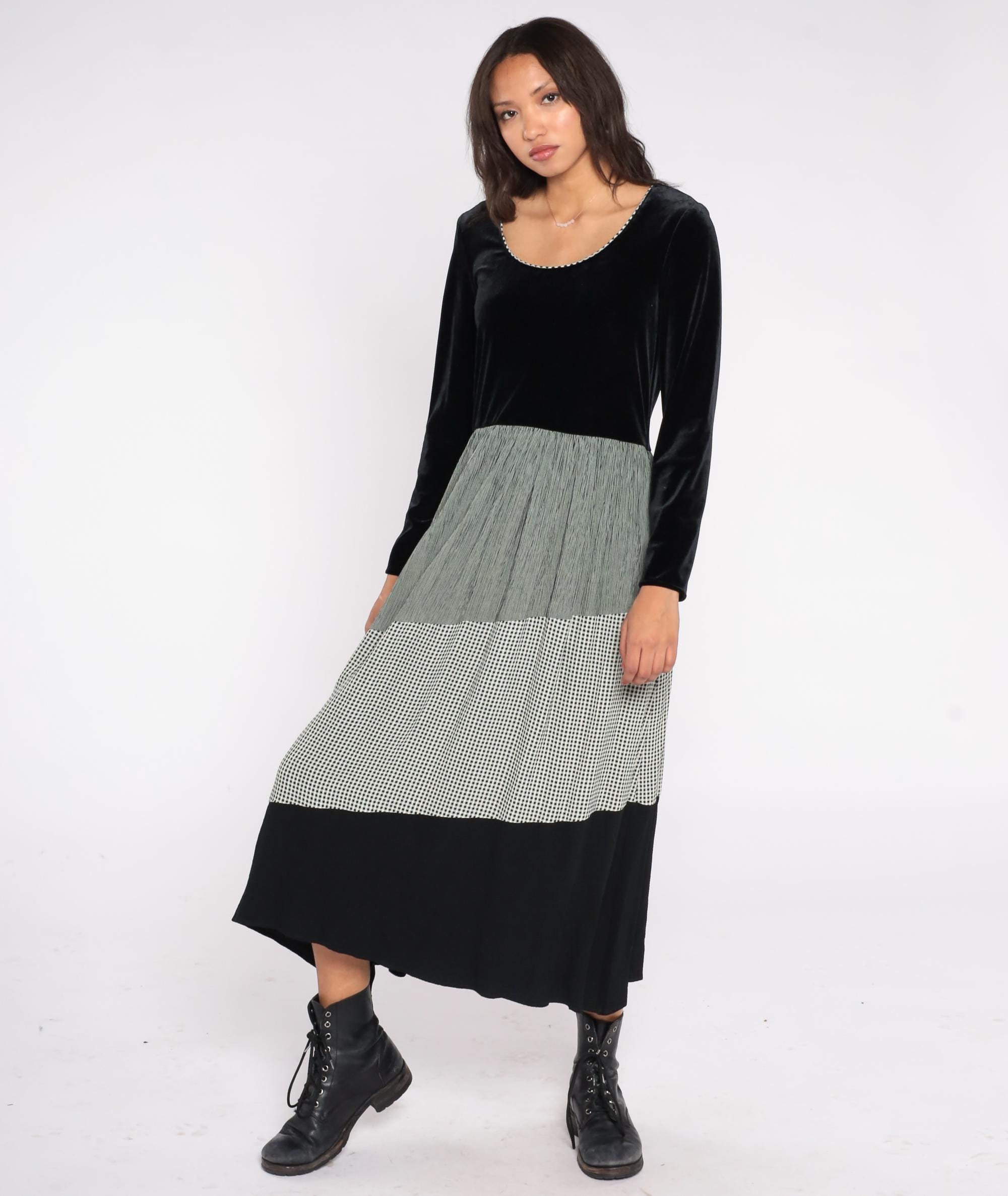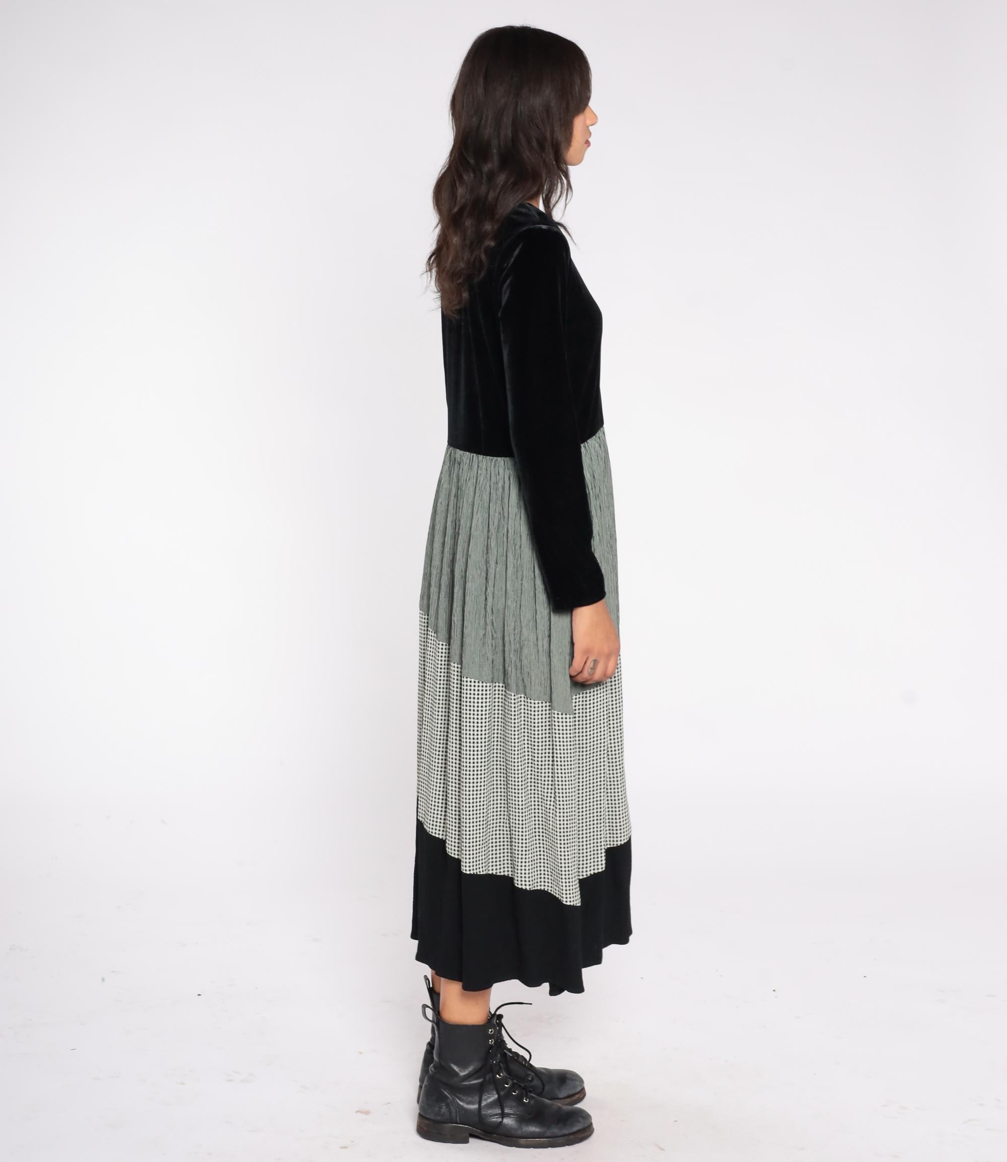 90s Jeffrey & Dara dress featuring a black velvet bodice with a scoop neckline and long sleeves. The skirt has a tiered diagonal panel design combining green, gingham, and solid black pleated sections. Falls to a midi length.