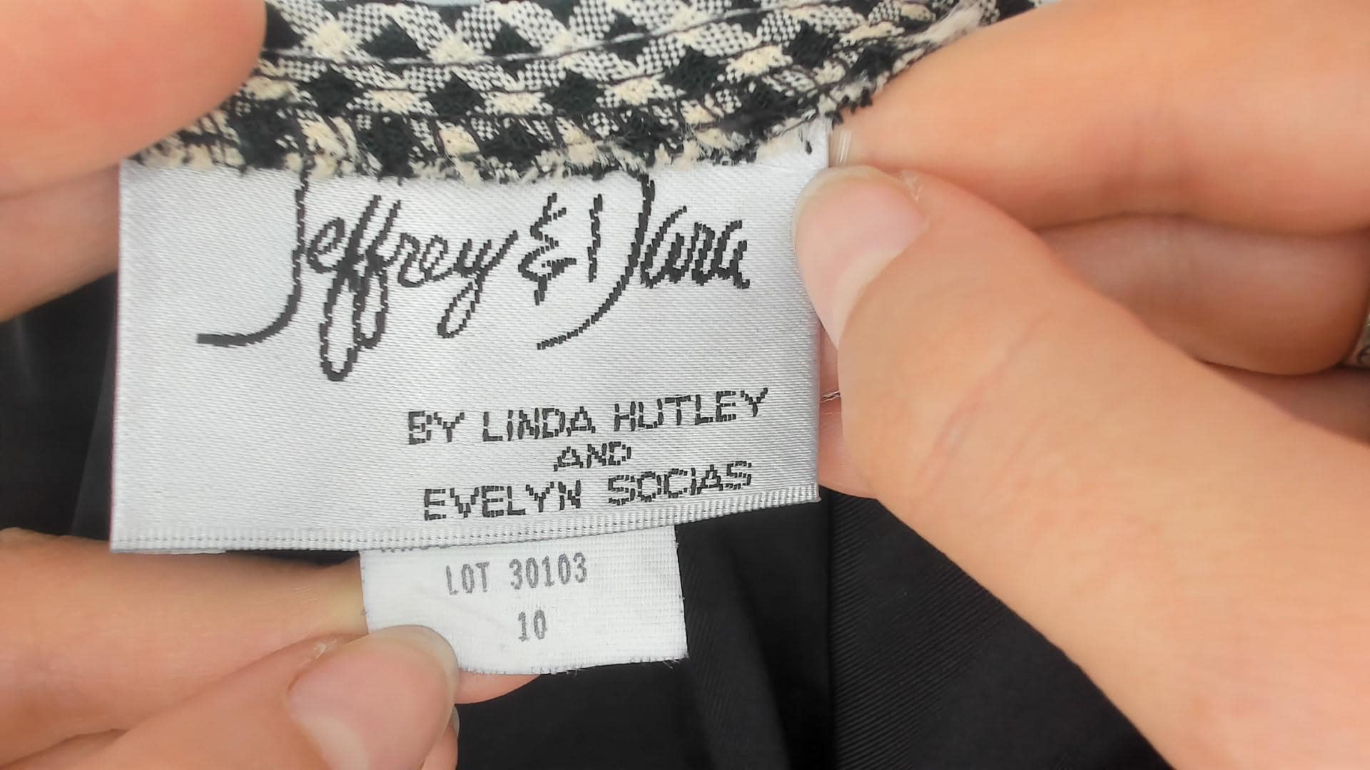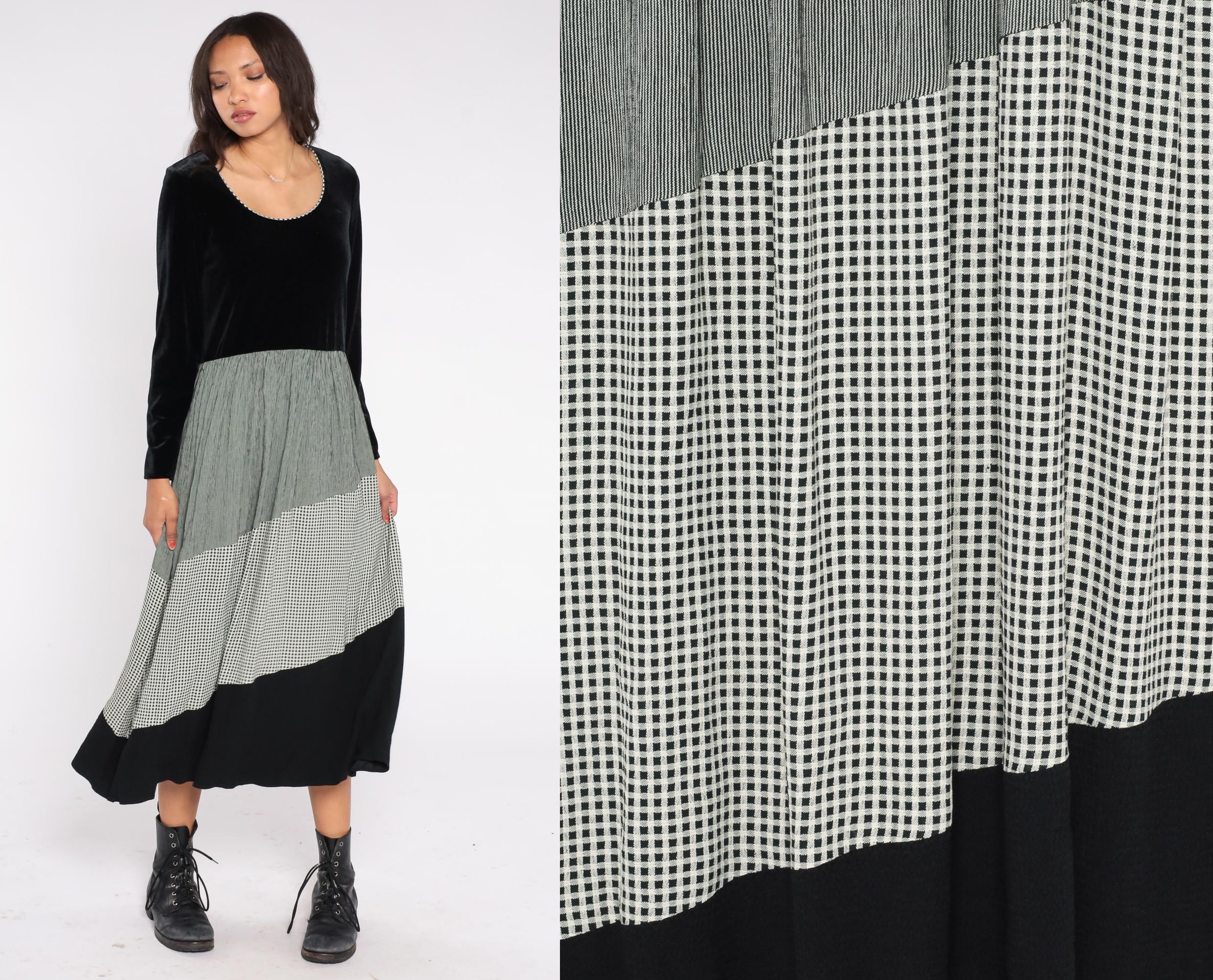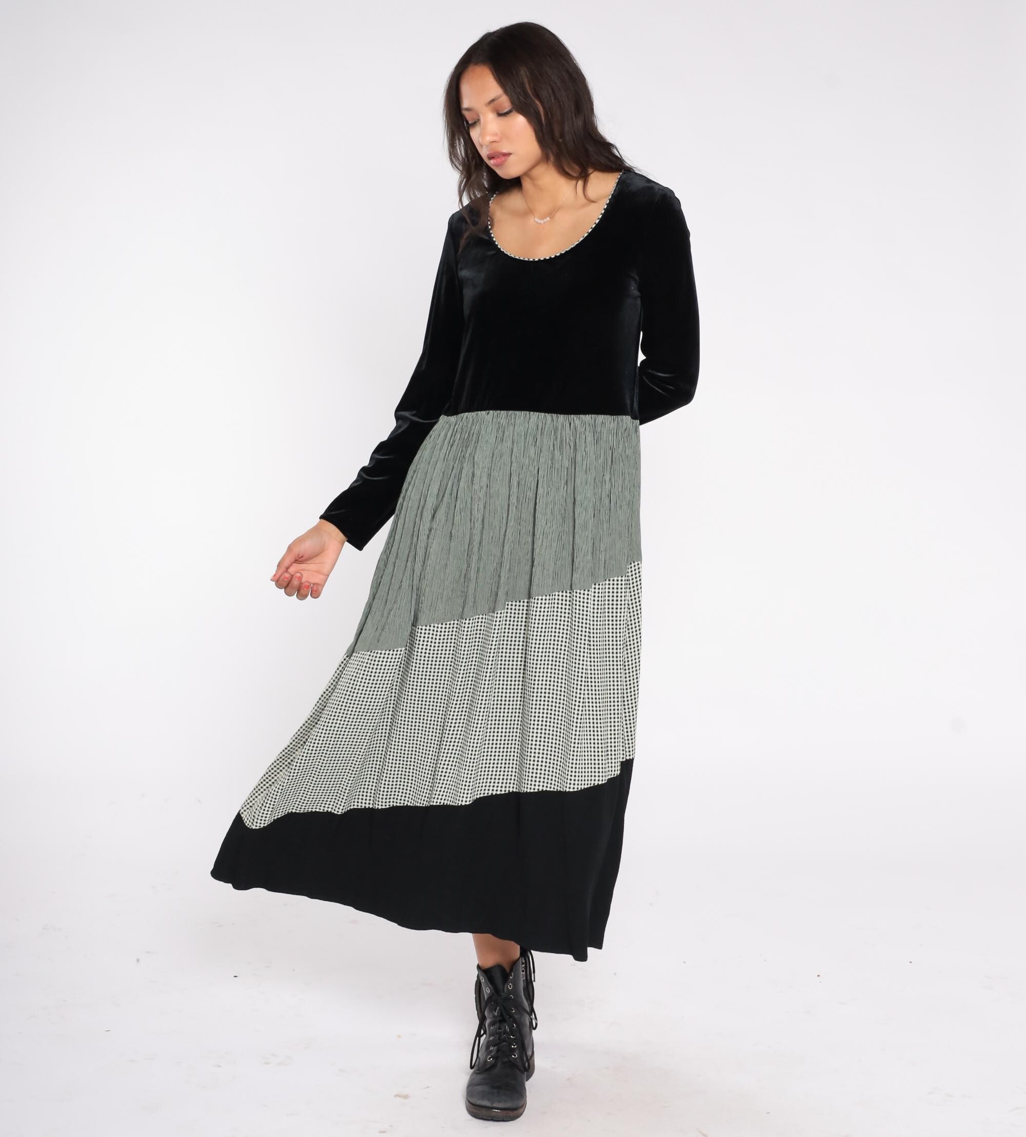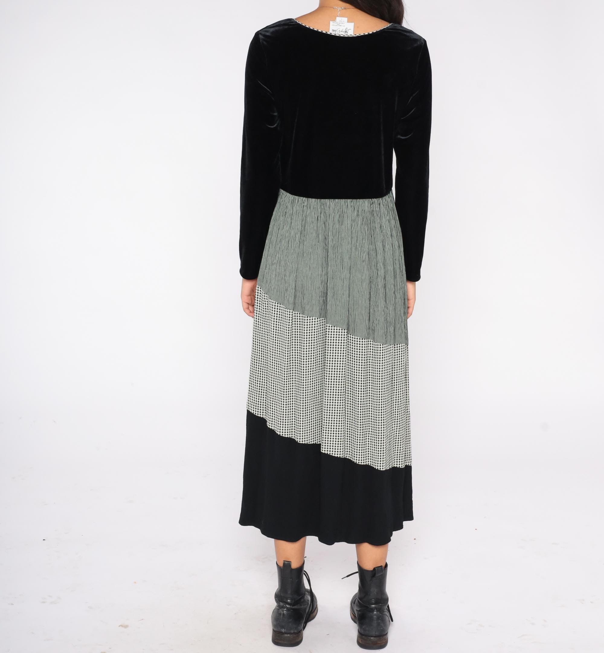 90s Jeffrey & Dara dress featuring a black velvet bodice with a scoop neckline and long sleeves. The skirt has a tiered diagonal panel design combining green, gingham, and solid black pleated sections. Falls to a midi length.
