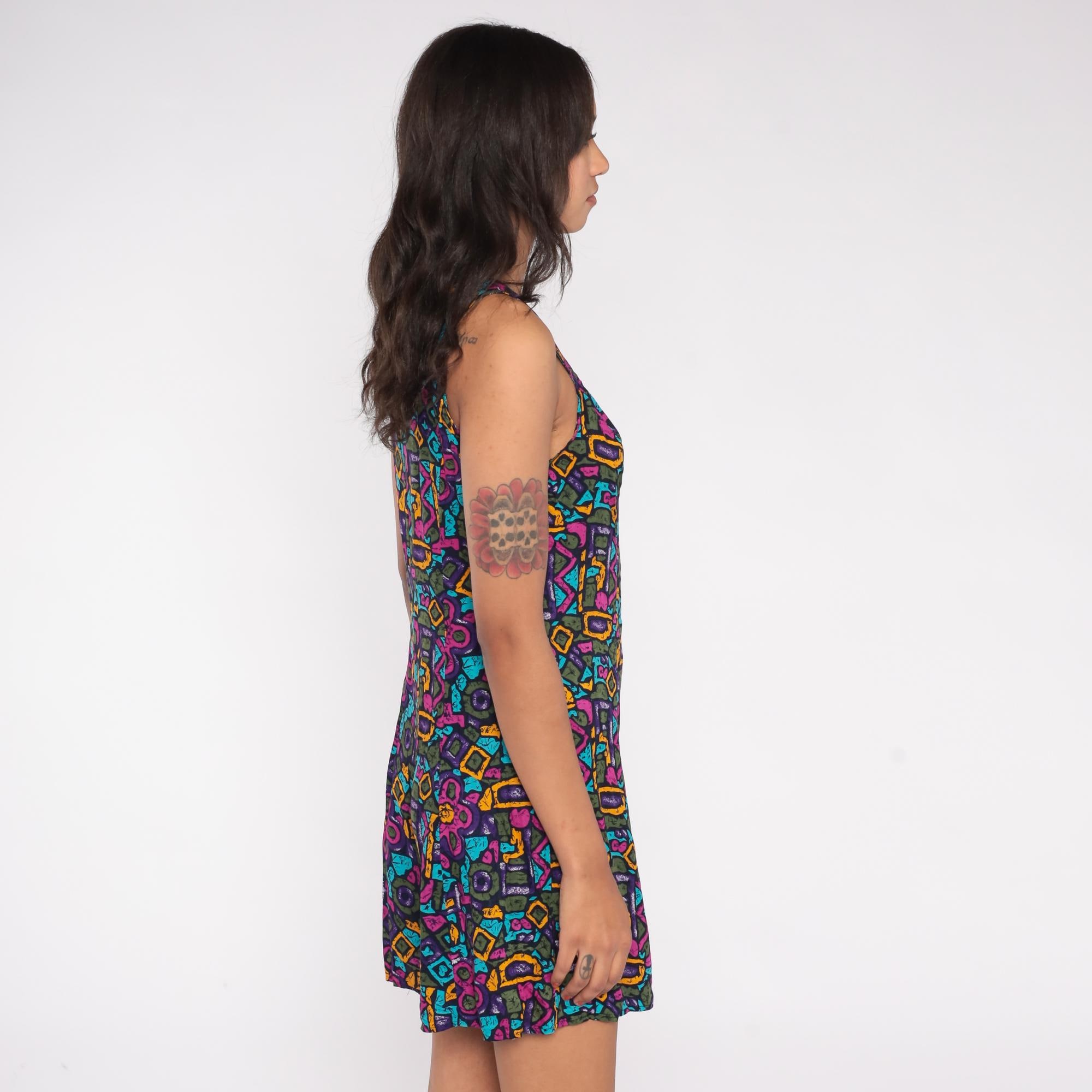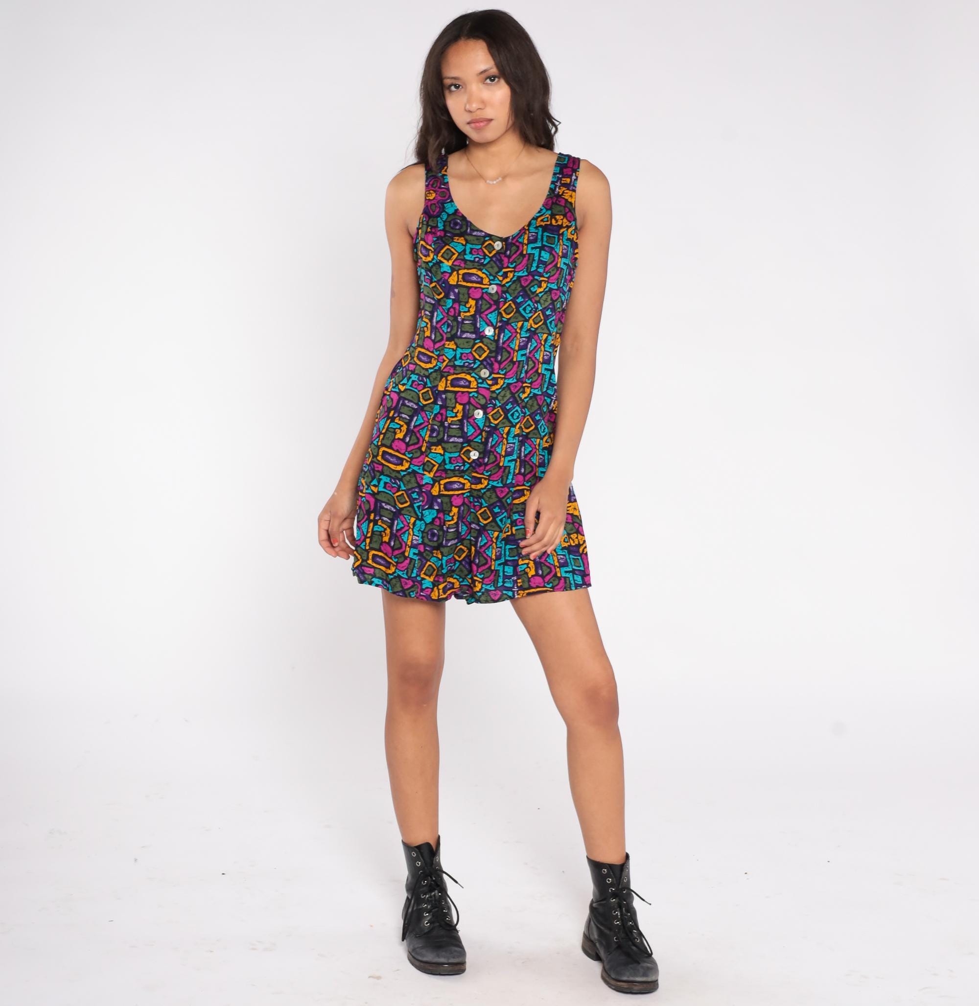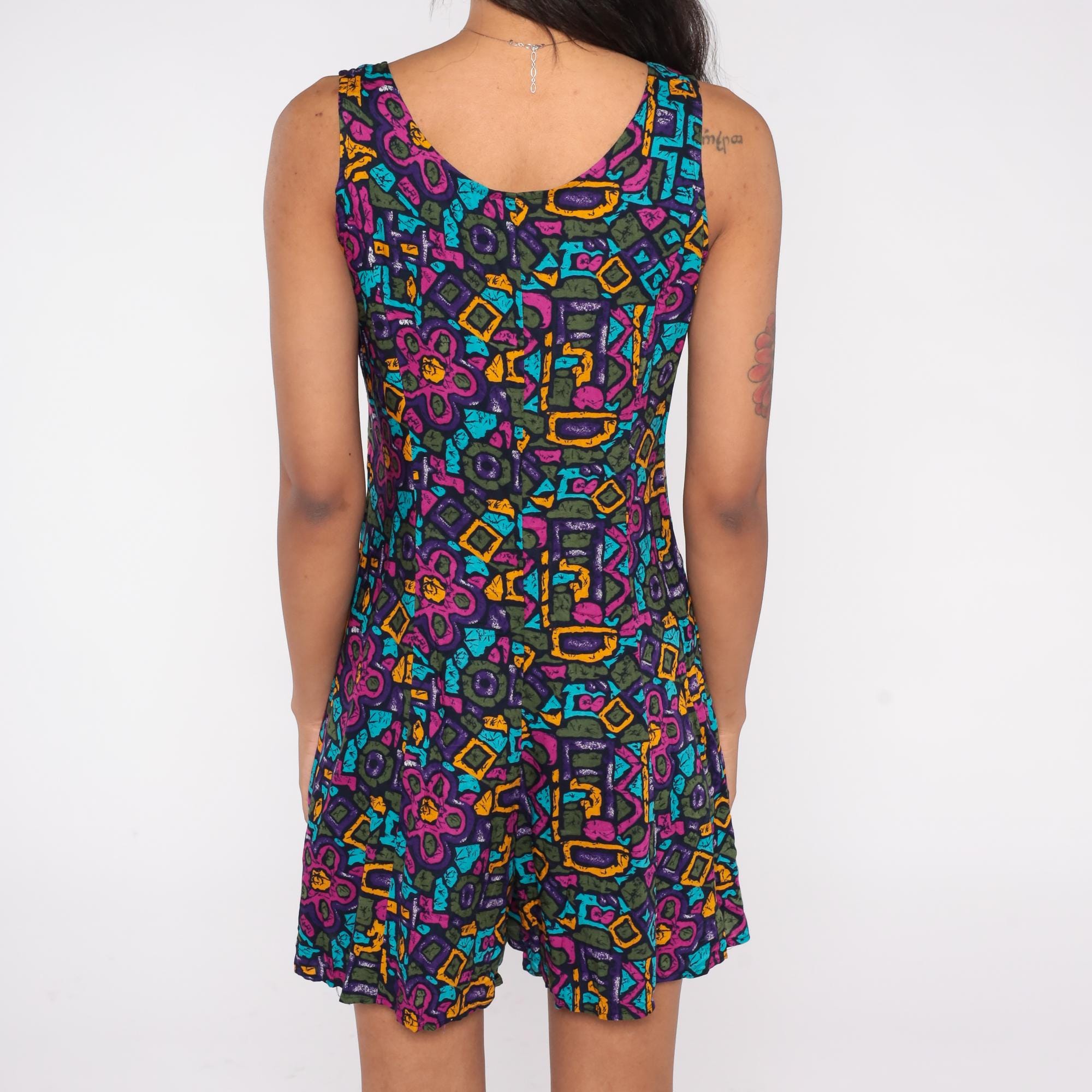 90s Gabriella romper featuring a bold abstract geometric print in pink, teal, orange, and purple on a black base. Made with a button front, scoop neckline, and sleeveless cut. Relaxed fit through the hips with short-length bottoms.
