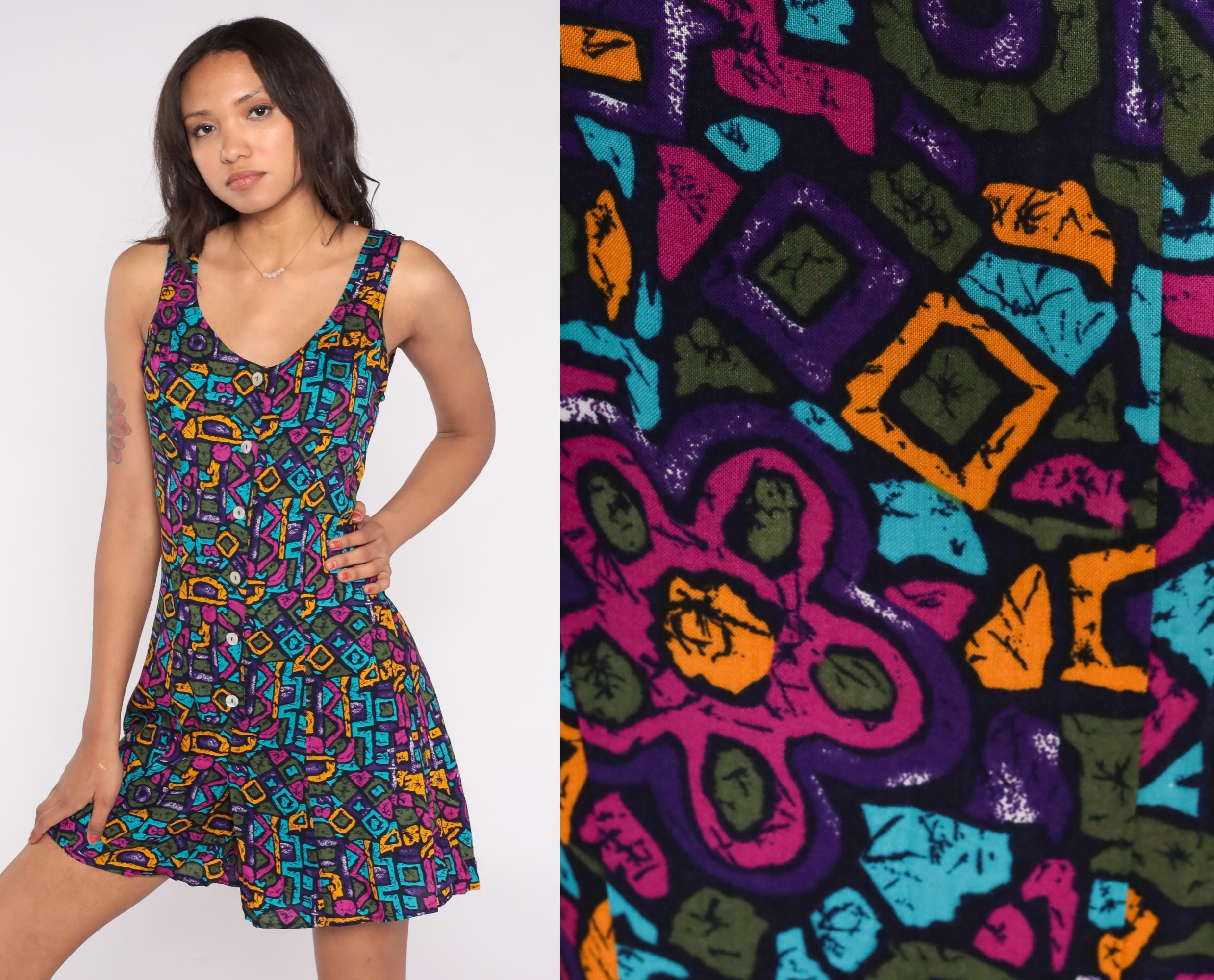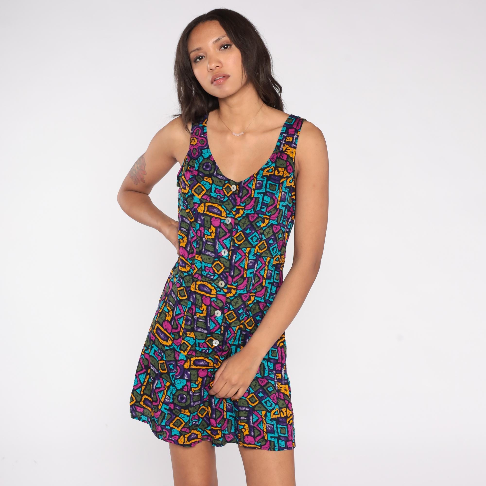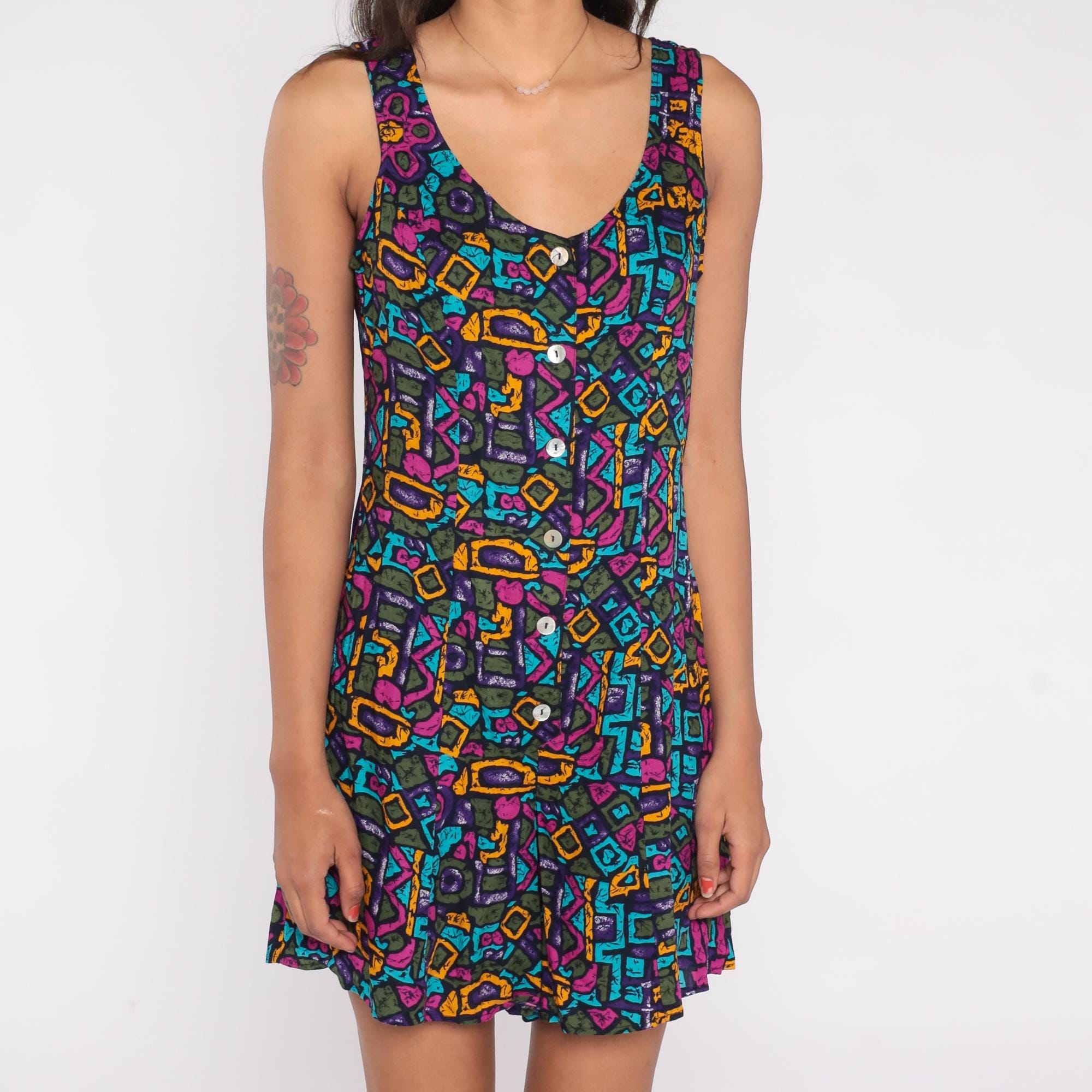 90s Gabriella romper featuring a bold abstract geometric print in pink, teal, orange, and purple on a black base. Made with a button front, scoop neckline, and sleeveless cut. Relaxed fit through the hips with short-length bottoms.