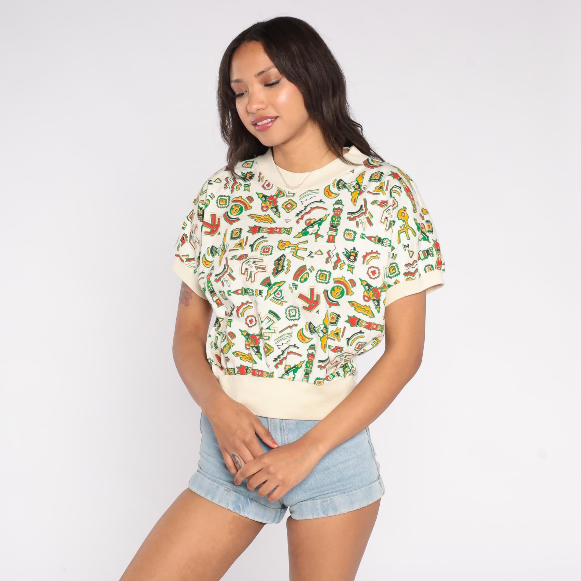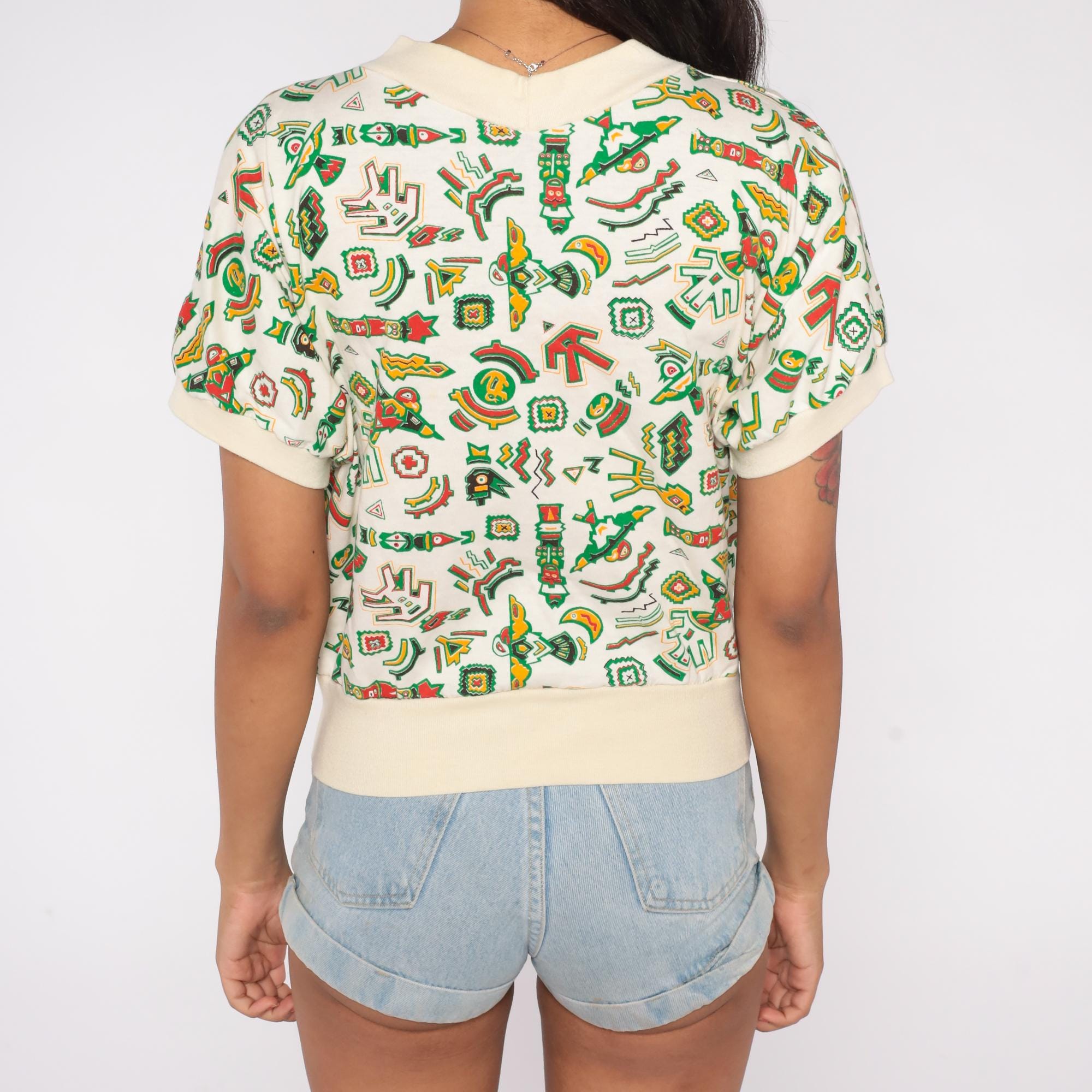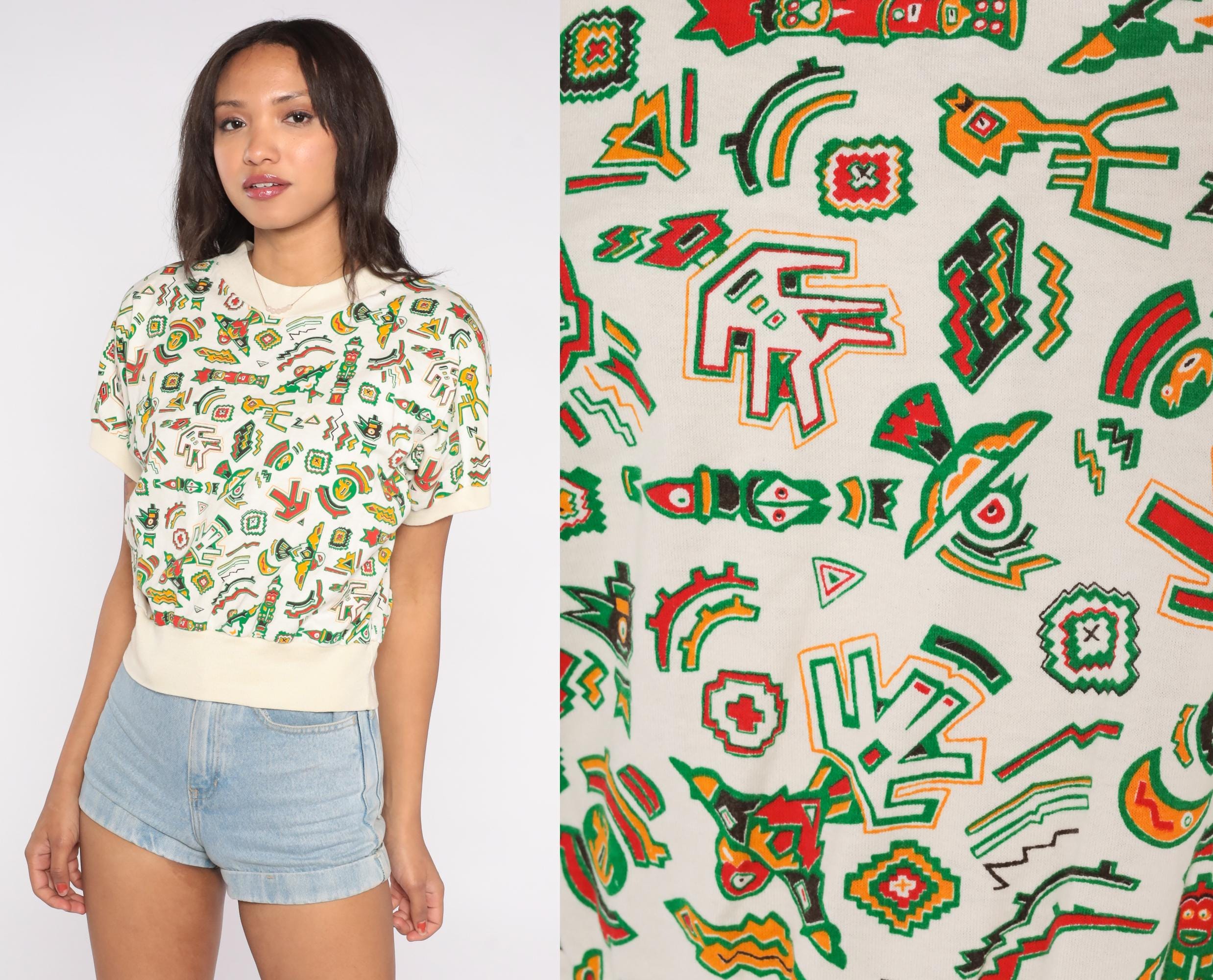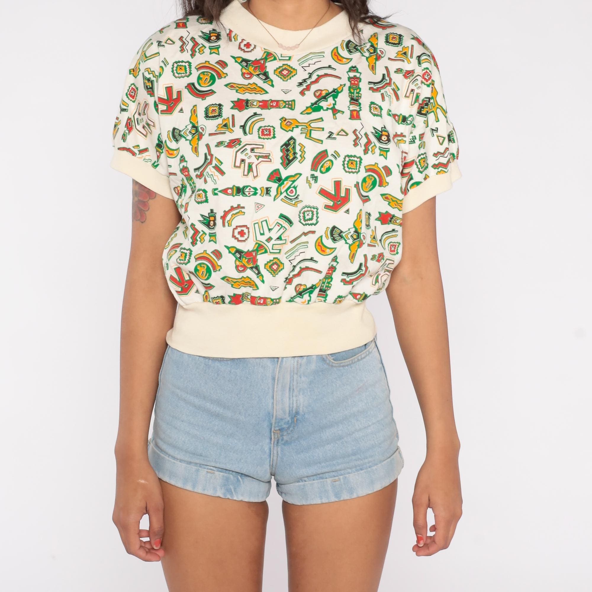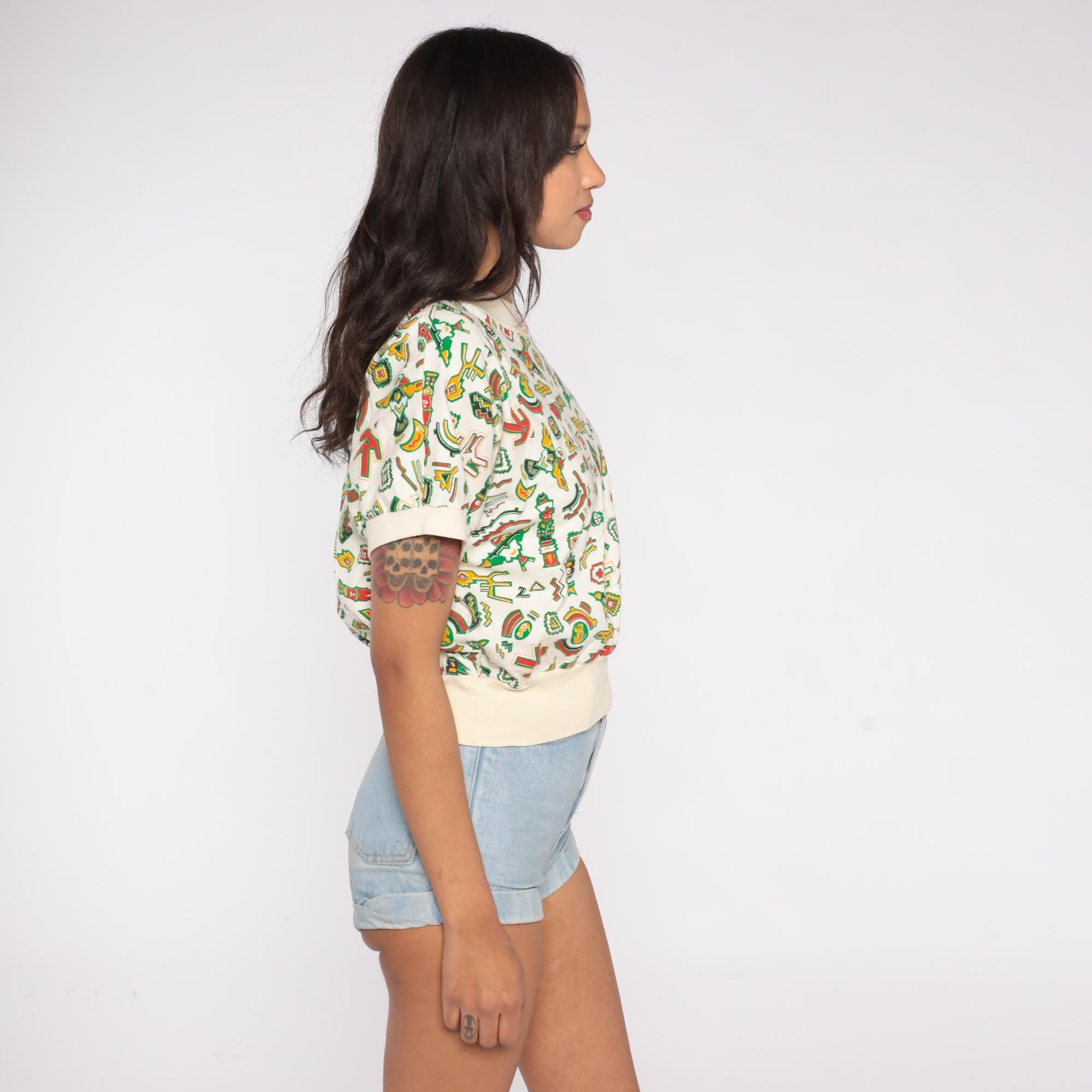 90s short sleeve knit shirt with a bold abstract graphic print in red, green, and yellow on a cream base. Made from soft cotton knit fabric with a crew neckline and elastic waistband for a slightly cropped fit.