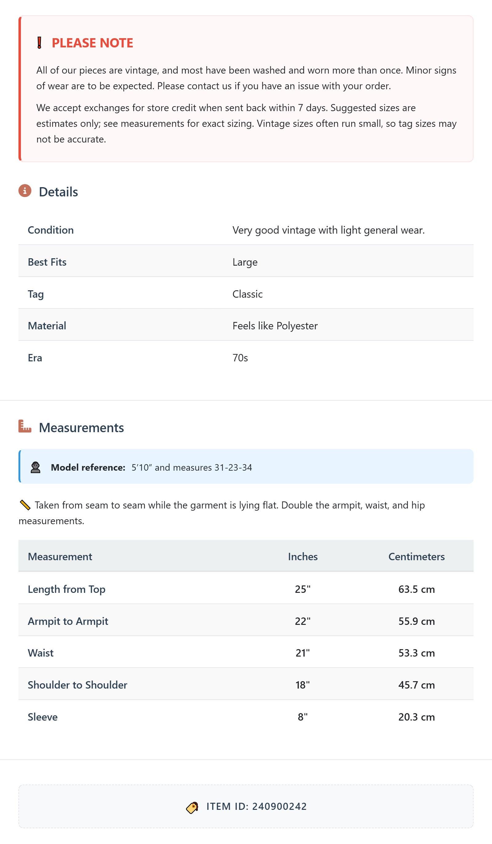 Measurements are taken laying flat and should be doubled where applicable. The "best fits" size is just an estimate, and vintage sizing can vary from modern sizing. Please use measurements to ensure proper fit. The best thing to do is measure a similar item of your own, and compare. When an item has stretch, we will list the unstretched dimensions with the stretched measurement afterwards.