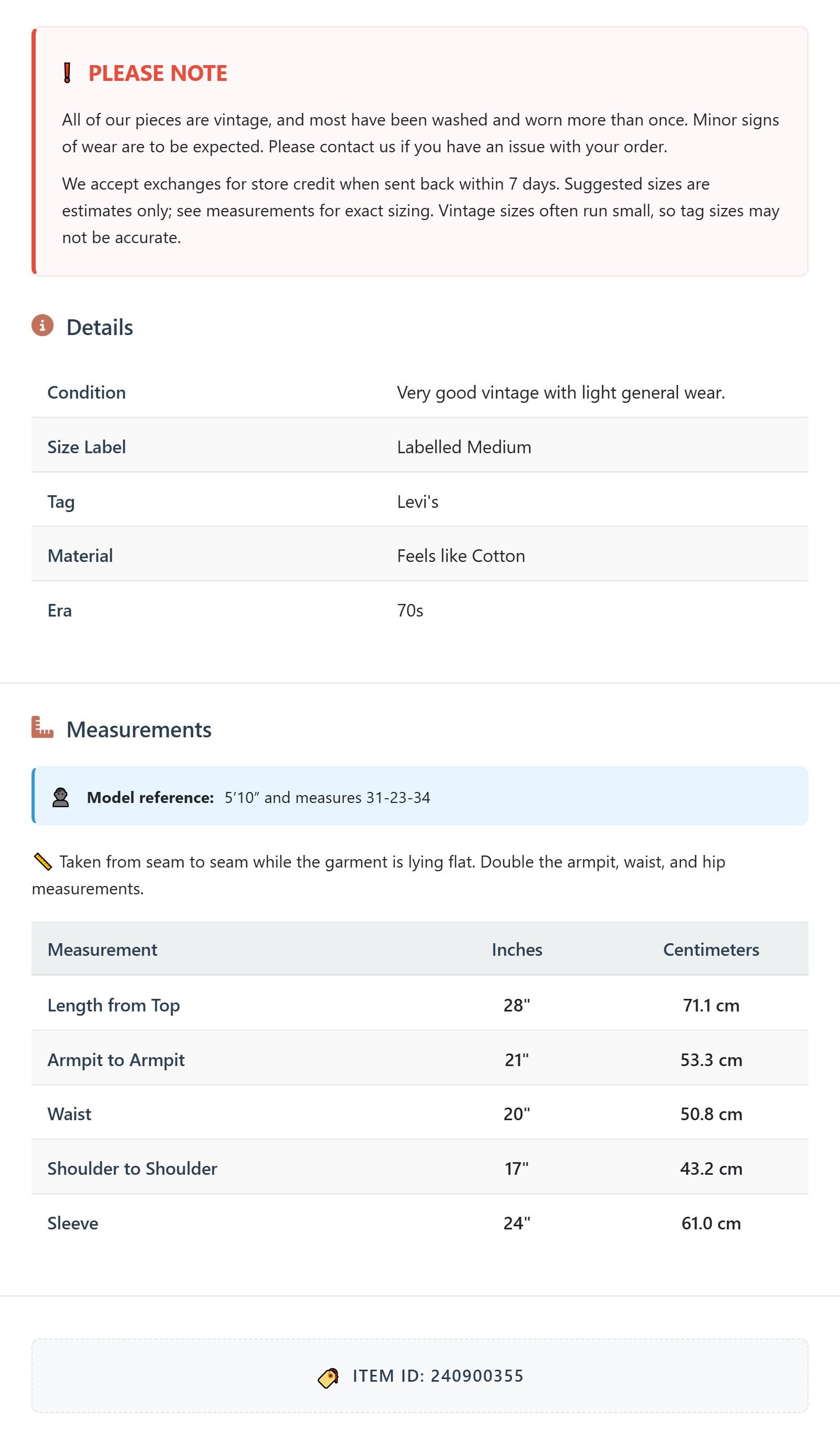 All of our pieces are vintage, and most have been washed and worn more than once. Minor signs of wear are to be expected. Please contact us if you have an issue with your order. We accept exchanges for store credit when sent back within 7 days.