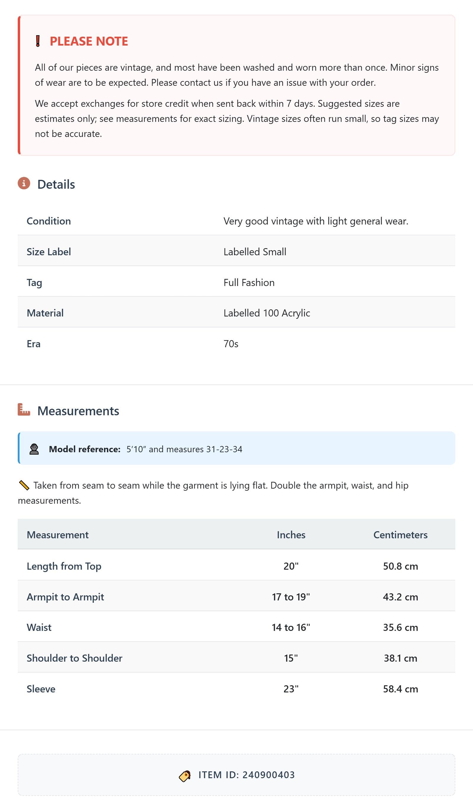 All of our pieces are vintage, and most have been washed and worn more than once. Minor signs of wear are to be expected. Please contact us if you have an issue with your order. We accept exchanges for store credit when sent back within 7 days.