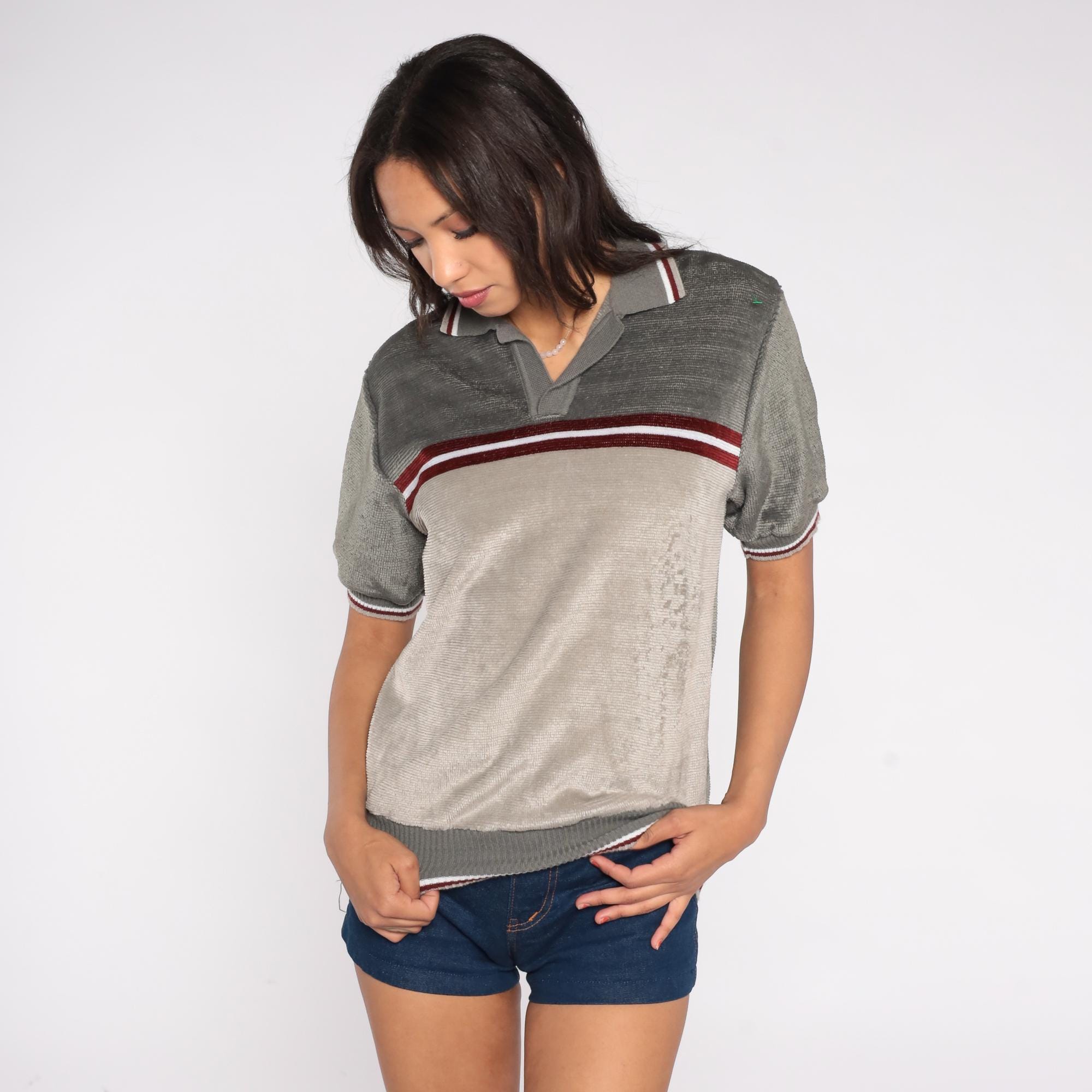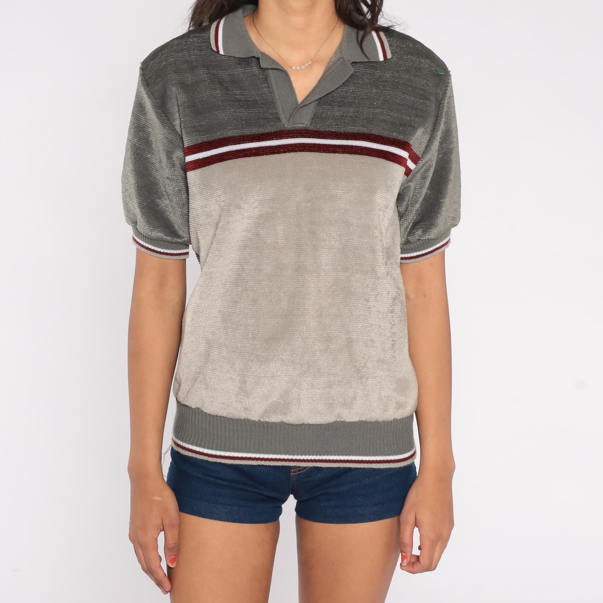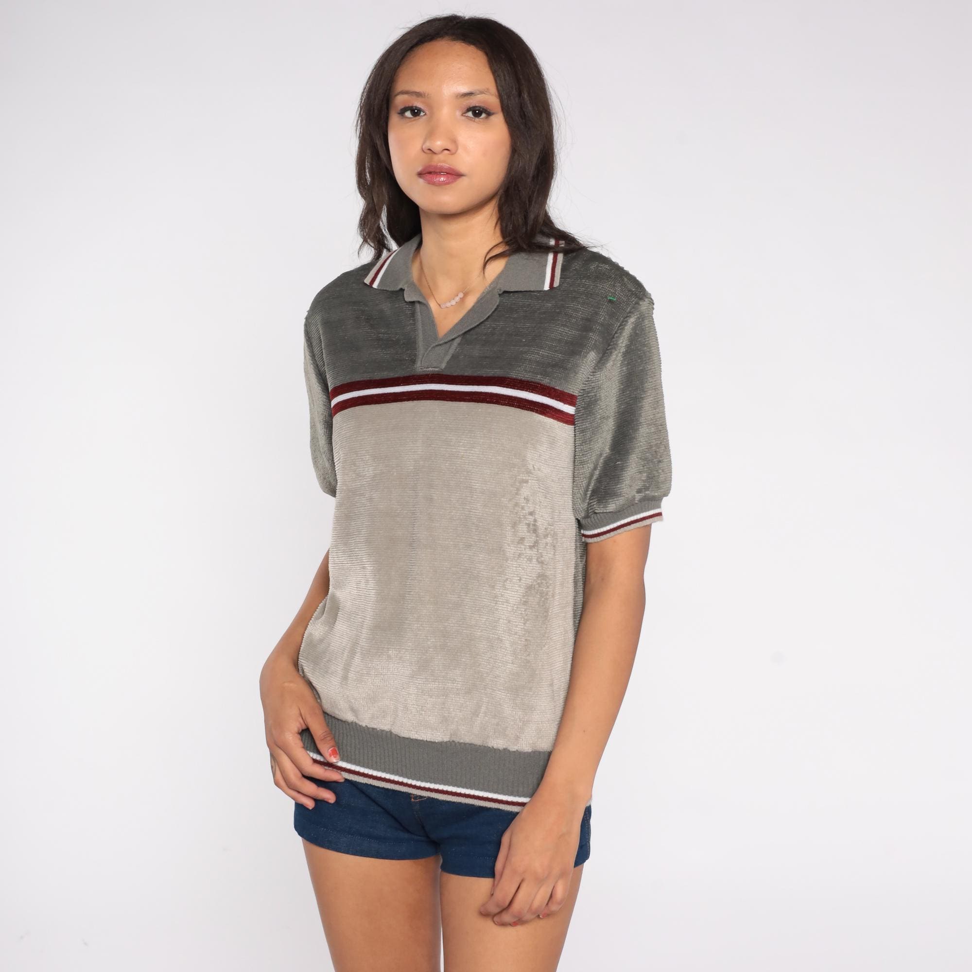 70s Peter B knit polo shirt in gray and taupe with a red and white horizontal stripe across the chest. Features a collared neckline, short sleeves, and ribbed trim at the cuffs and hem.