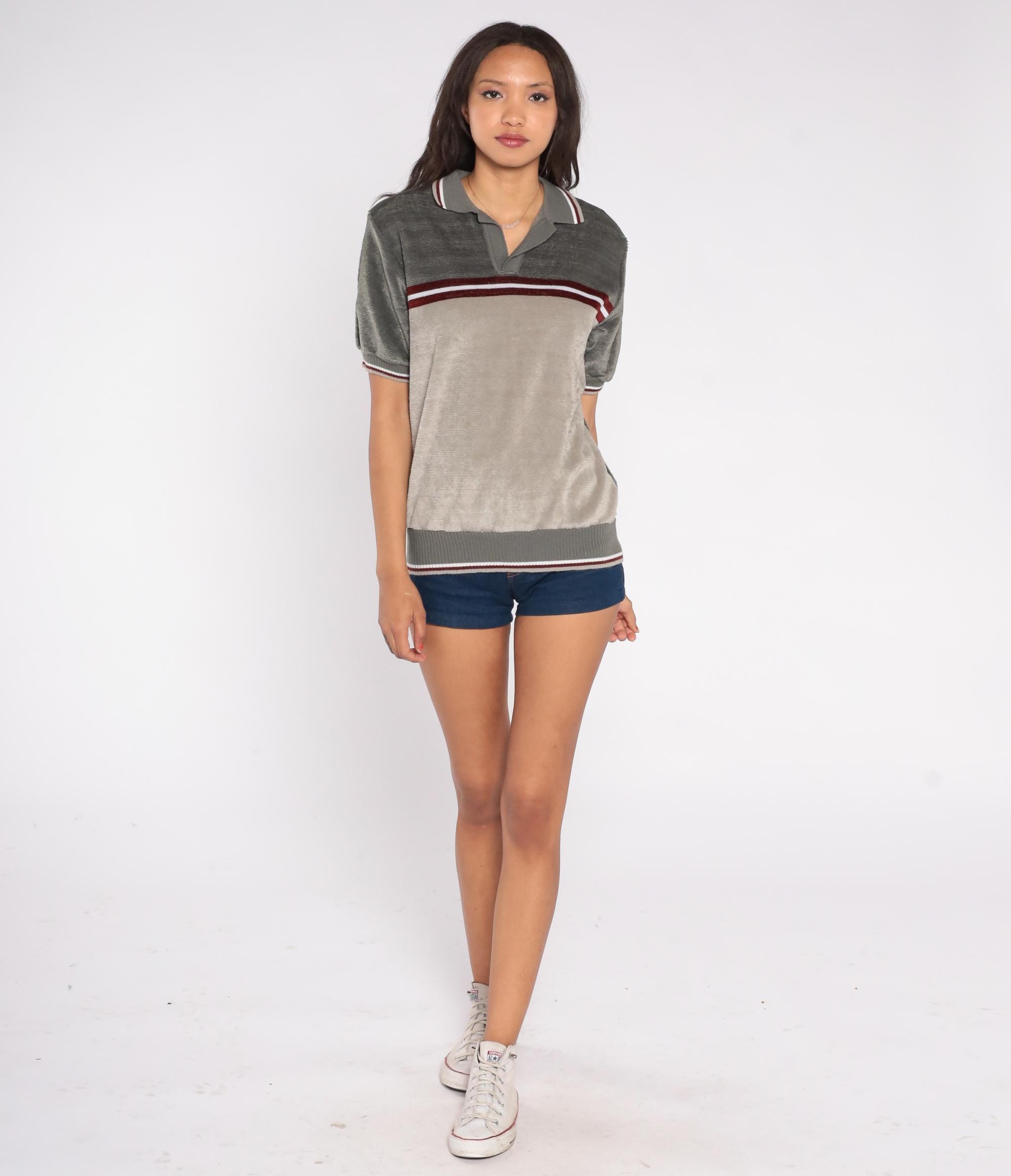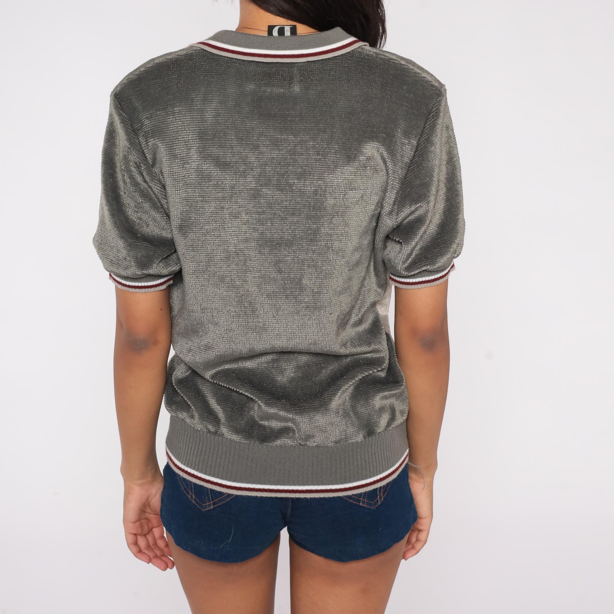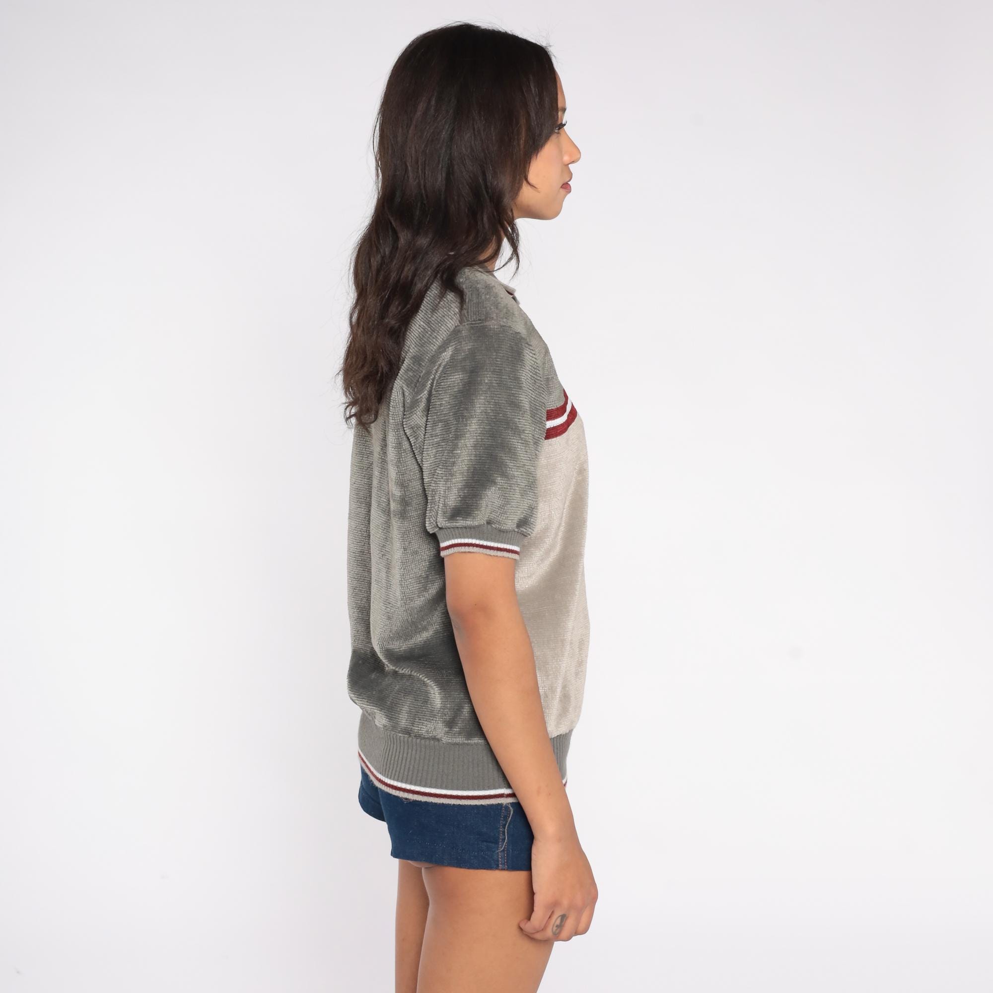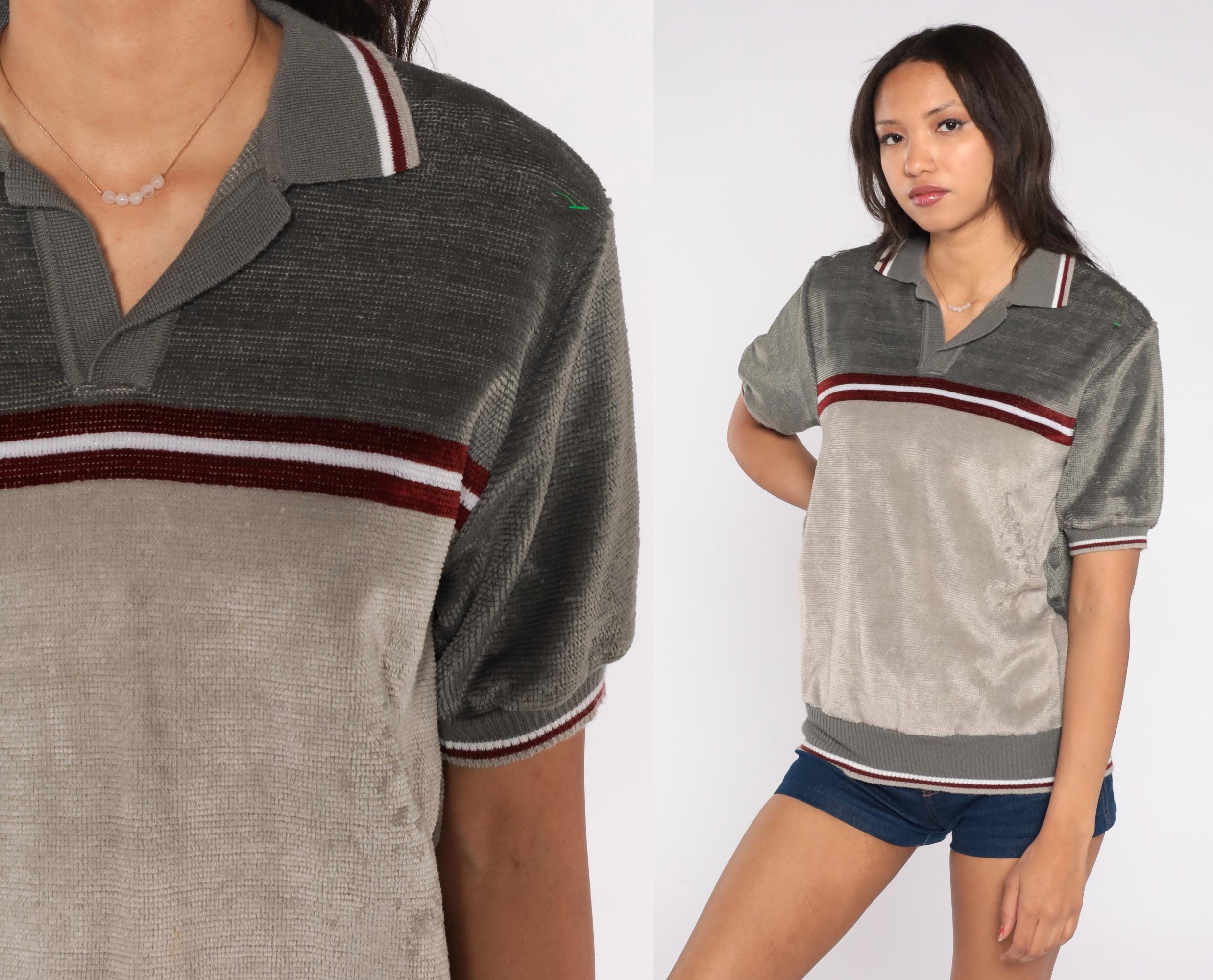 70s Peter B knit polo shirt in gray and taupe with a red and white horizontal stripe across the chest. Features a collared neckline, short sleeves, and ribbed trim at the cuffs and hem.