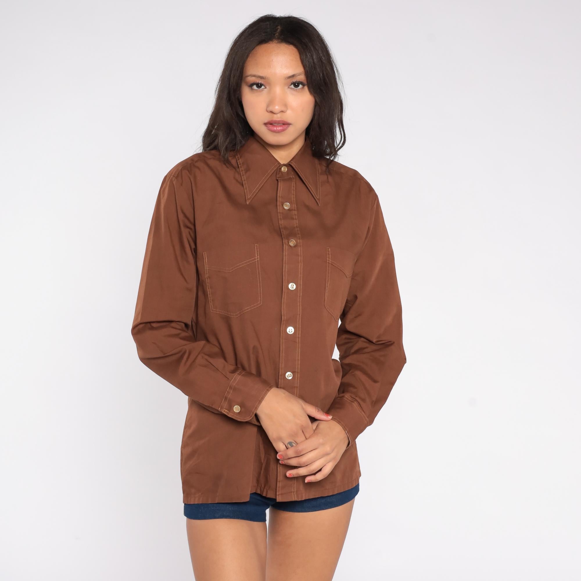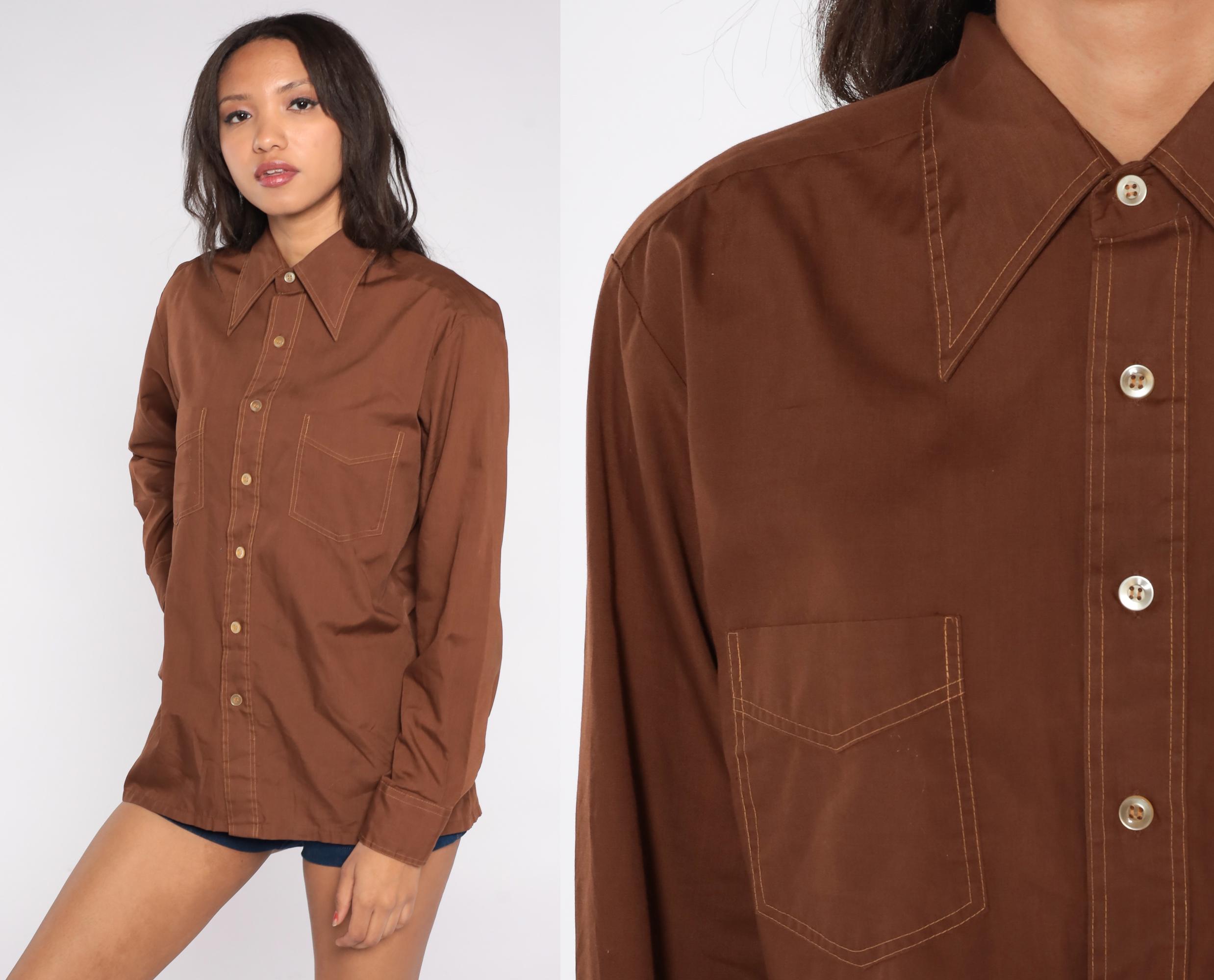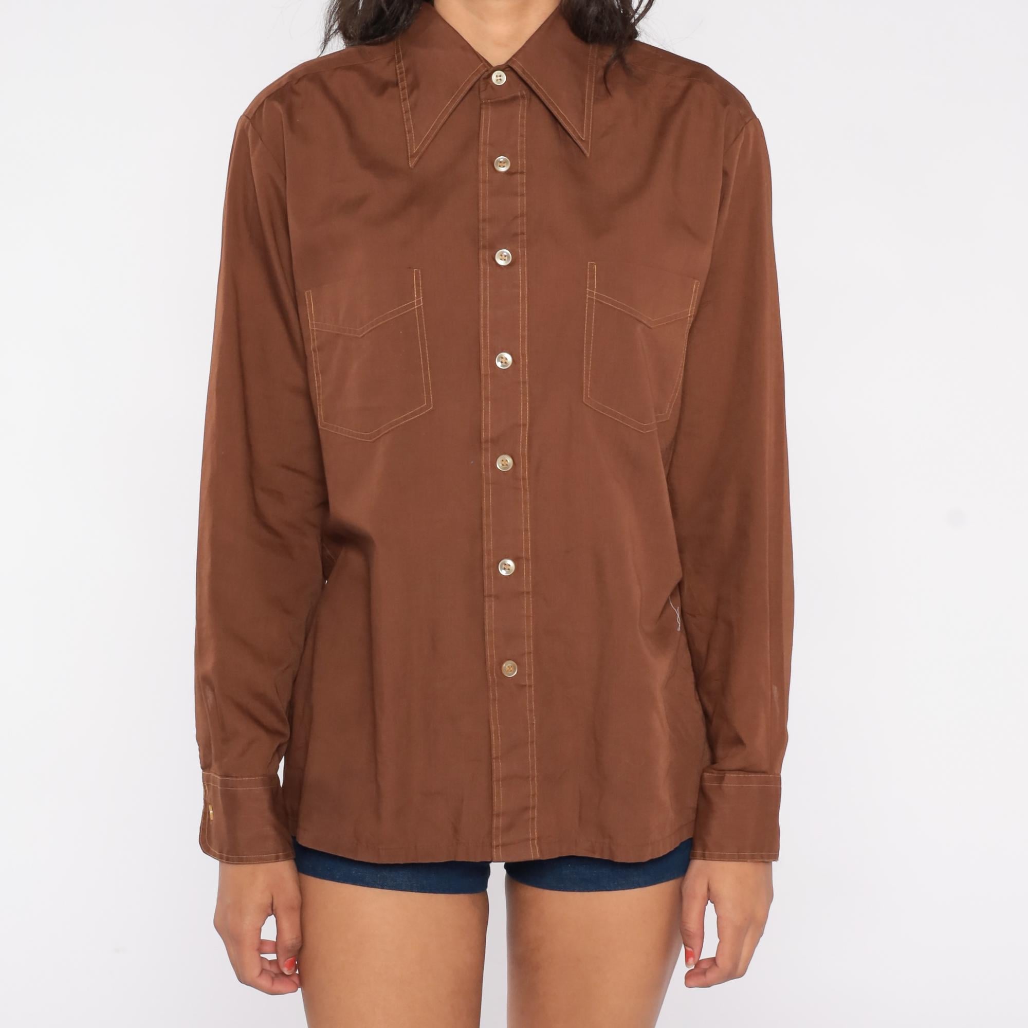 70s chocolate brown button-up shirt from JCPenney. Features distinctive contrast stitching, pointed collar, and front button closure with pearlescent buttons. Two front chest pockets with angular flaps. Long sleeves with button cuffs.