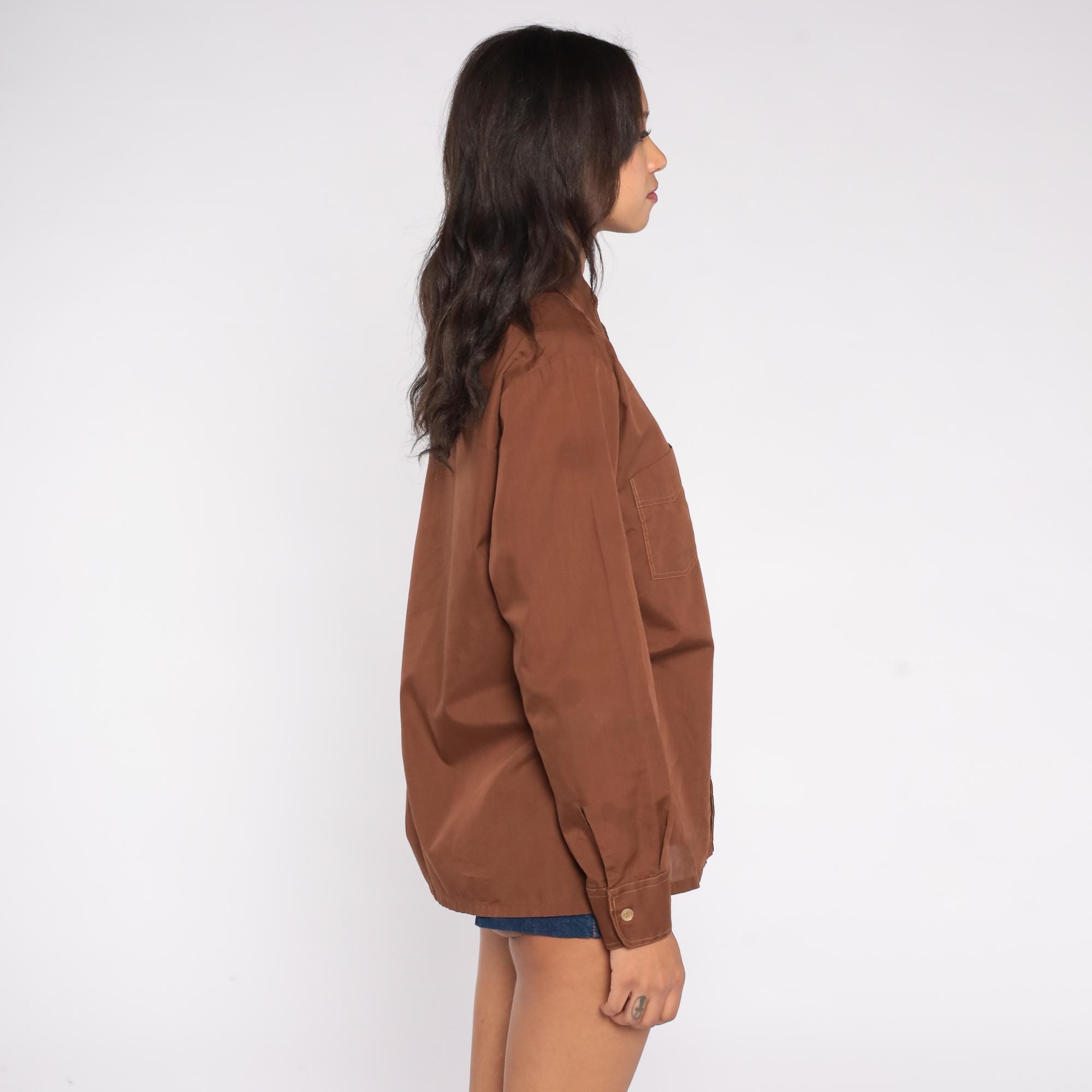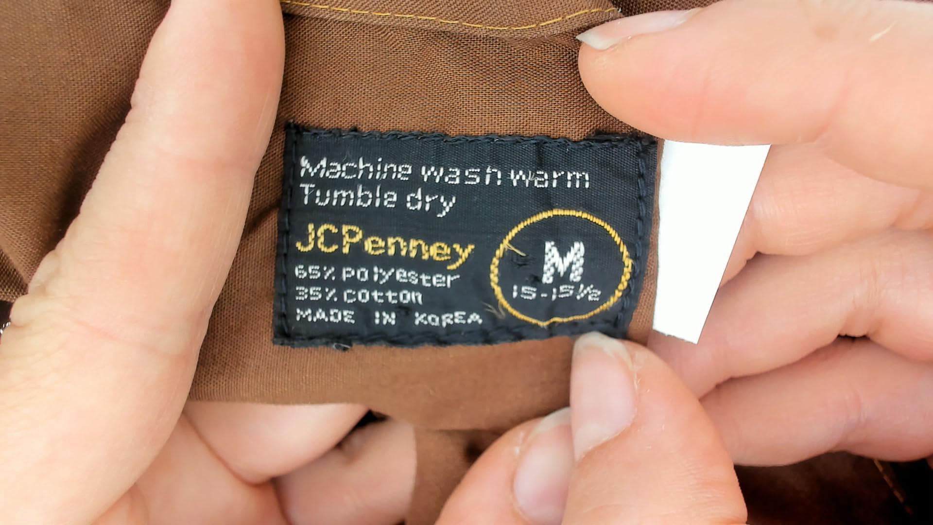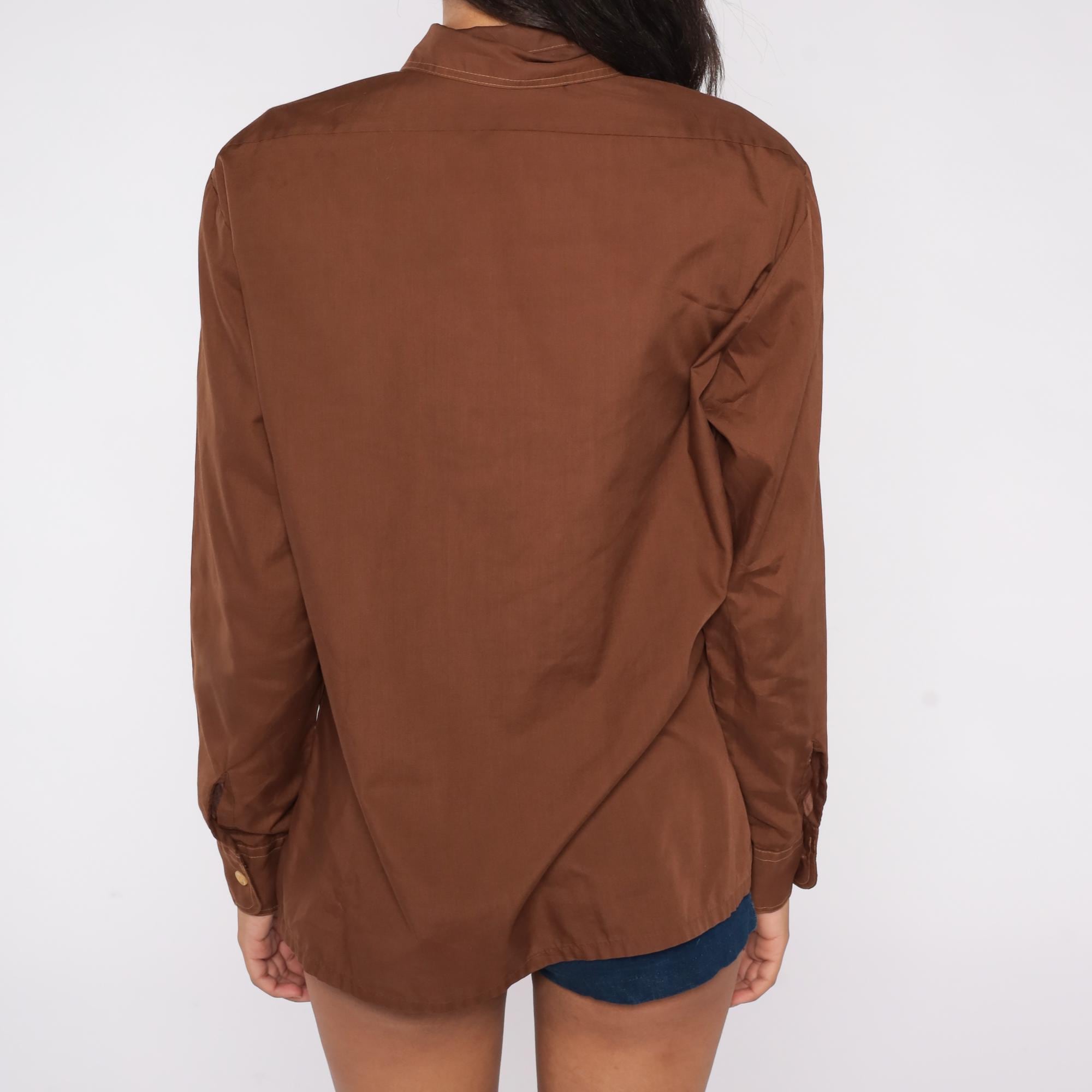 70s chocolate brown button-up shirt from JCPenney. Features distinctive contrast stitching, pointed collar, and front button closure with pearlescent buttons. Two front chest pockets with angular flaps. Long sleeves with button cuffs.