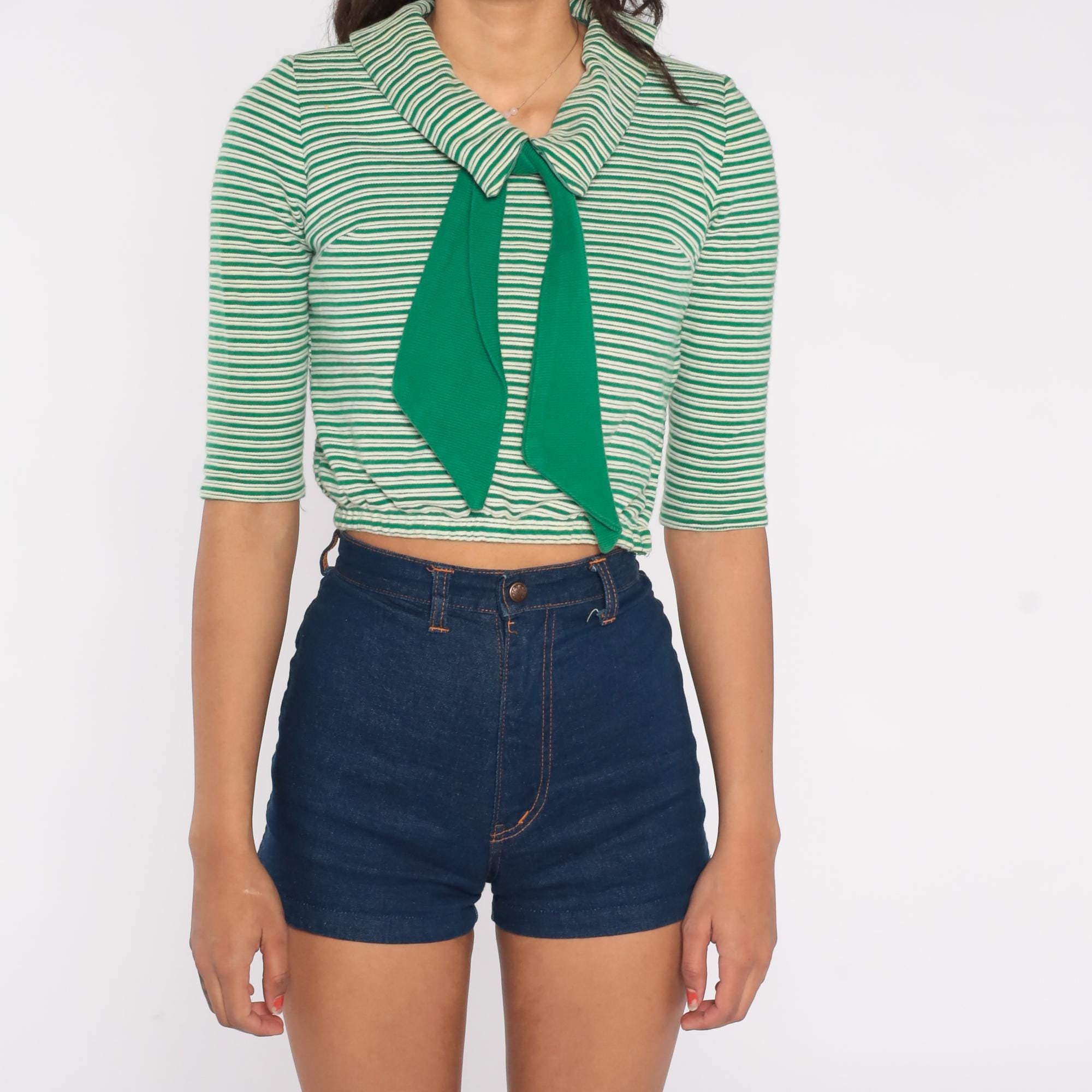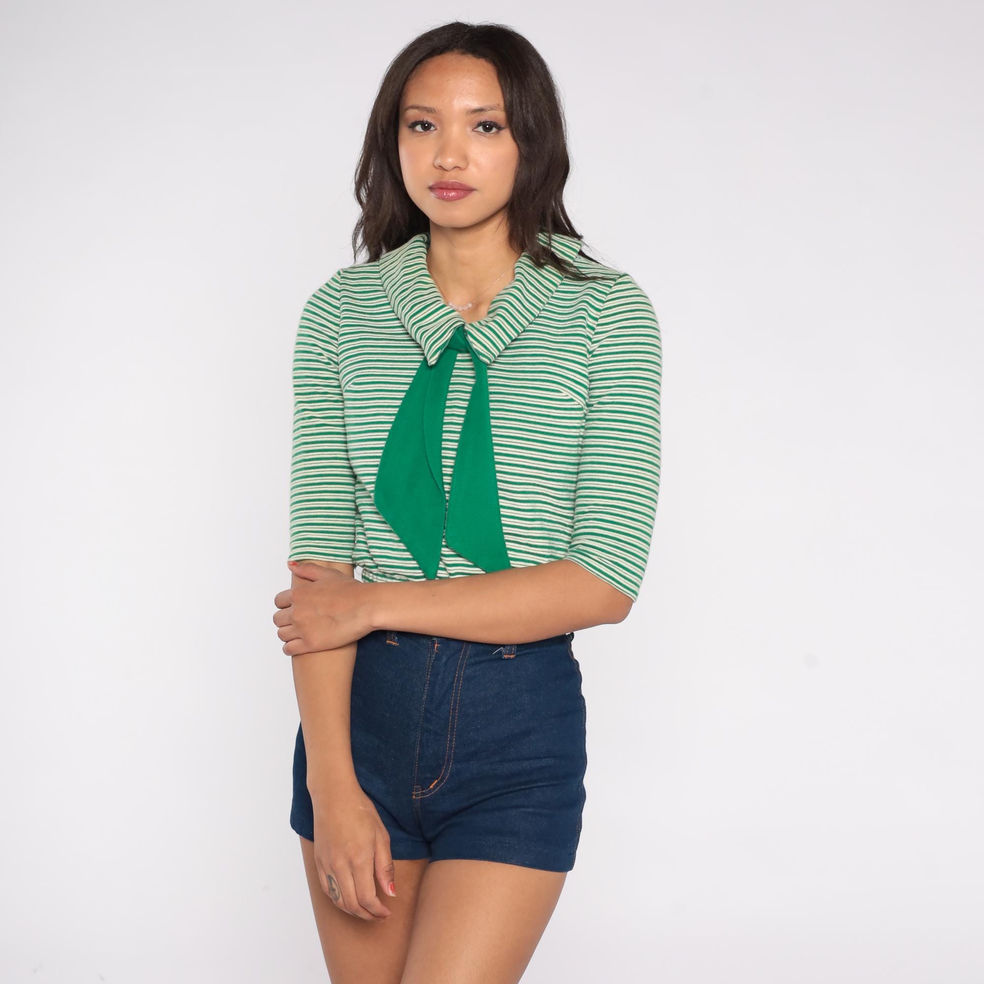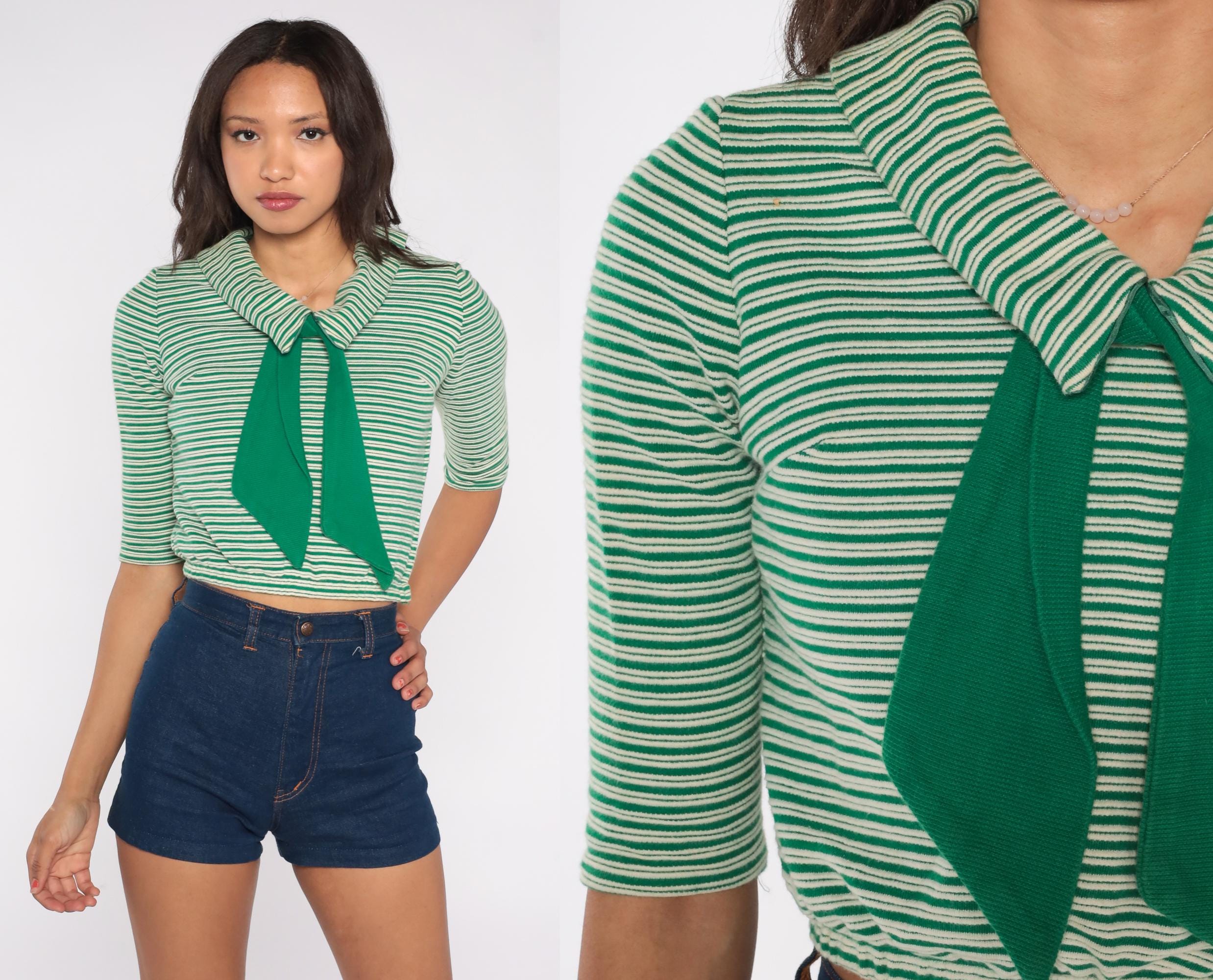 60s green and white striped crop top with sailor-inspired styling. Features distinctive emerald green tie at collar, short sleeves, and keyhole back with small zipper closure. Fitted silhouette with slight stretch.