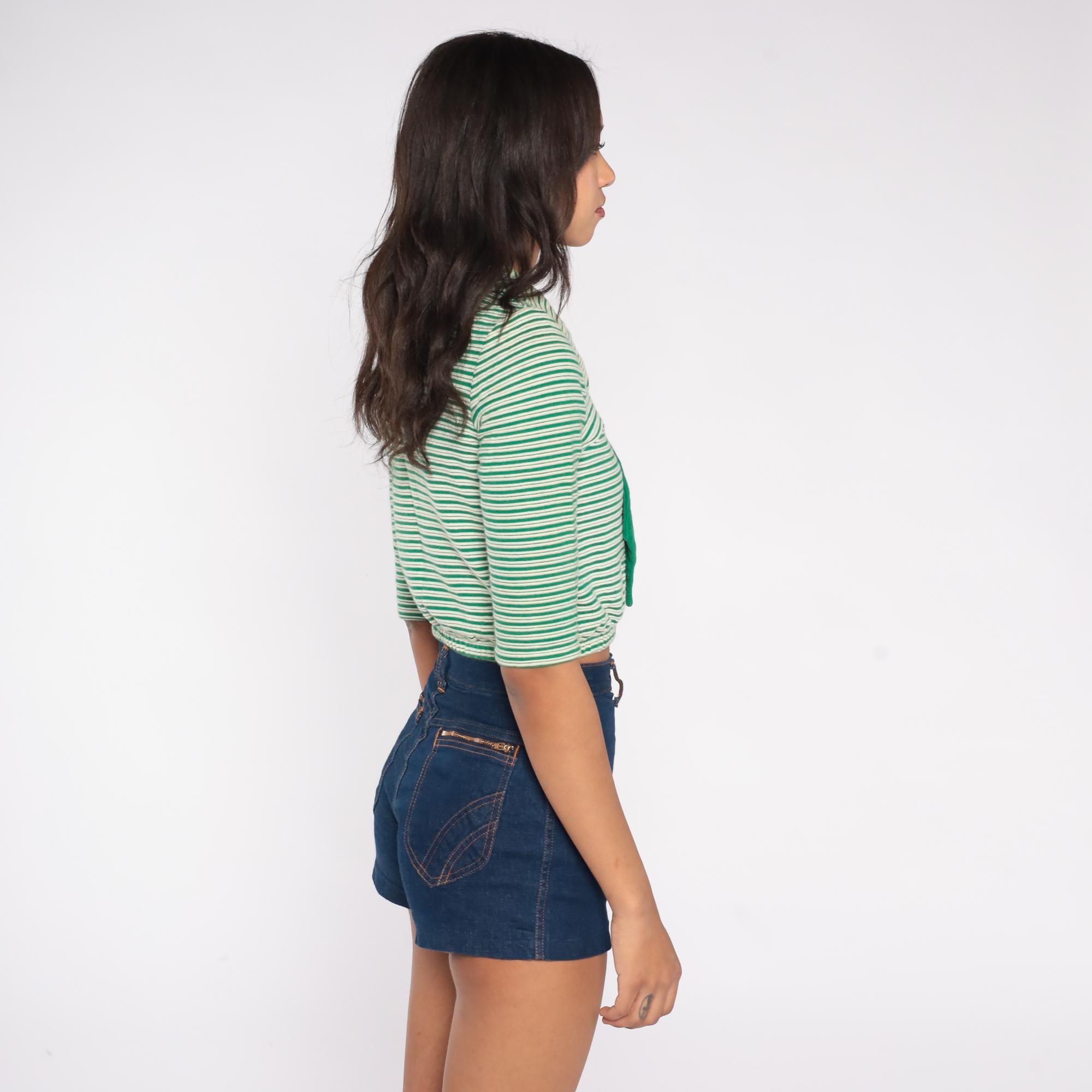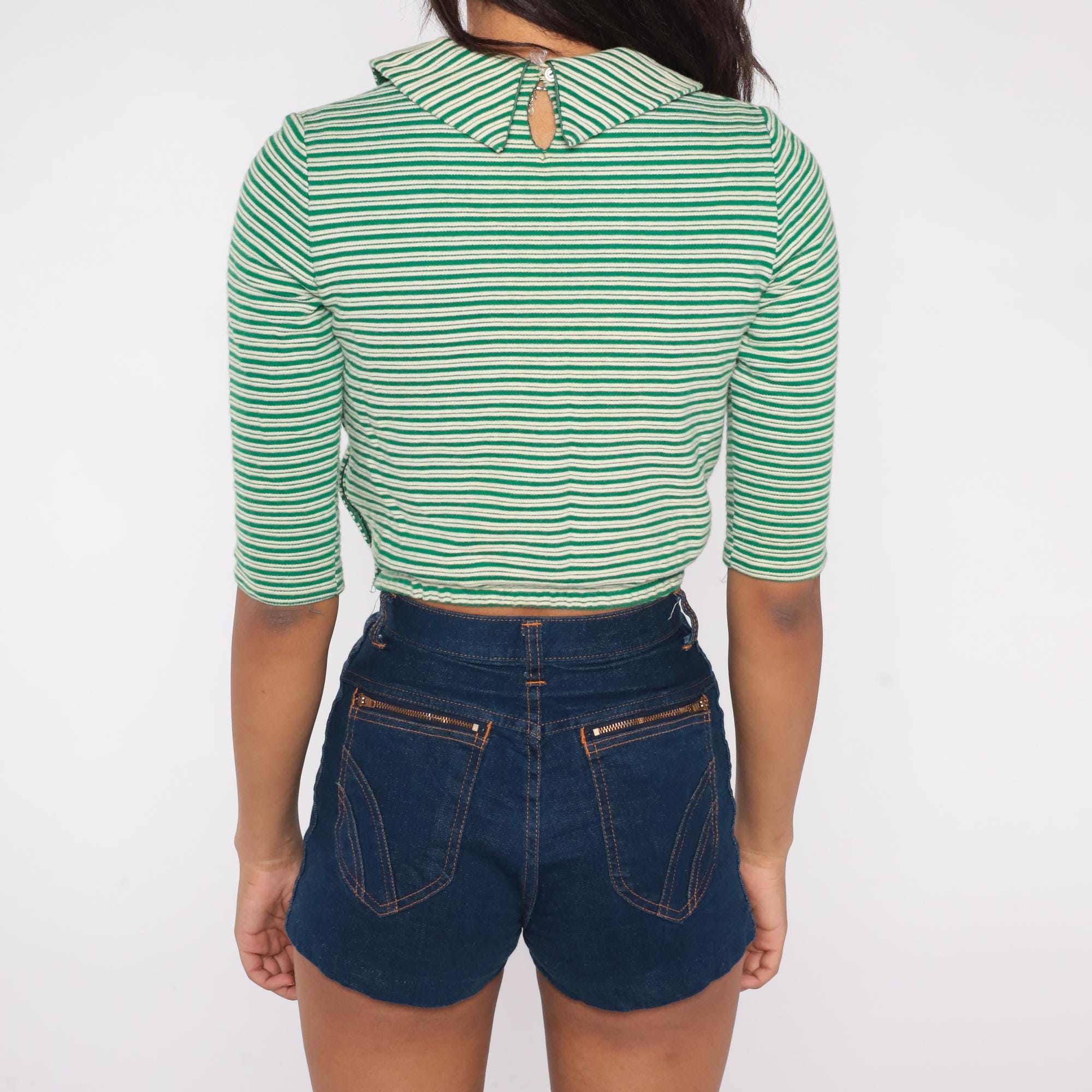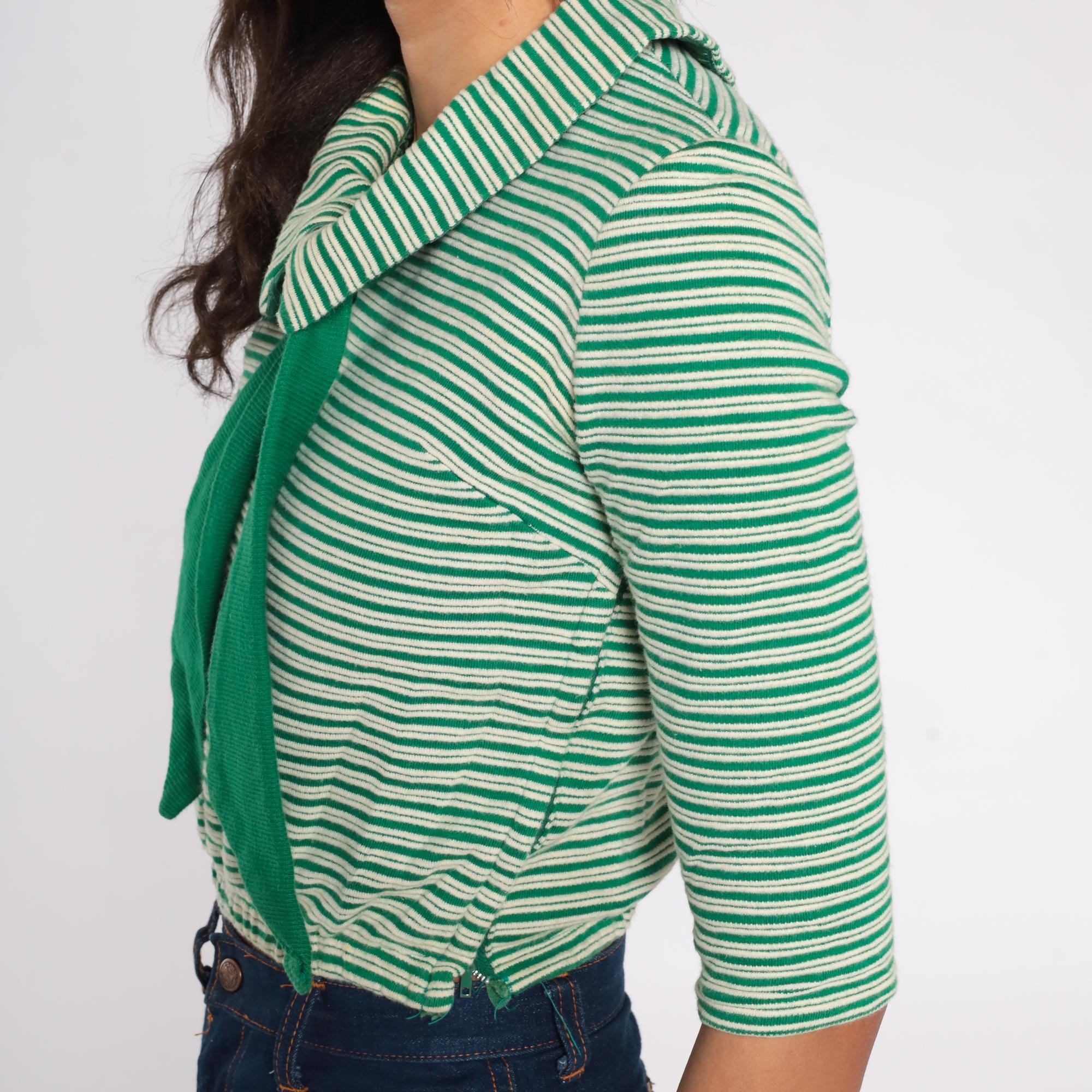 60s green and white striped crop top with sailor-inspired styling. Features distinctive emerald green tie at collar, short sleeves, and keyhole back with small zipper closure. Fitted silhouette with slight stretch.