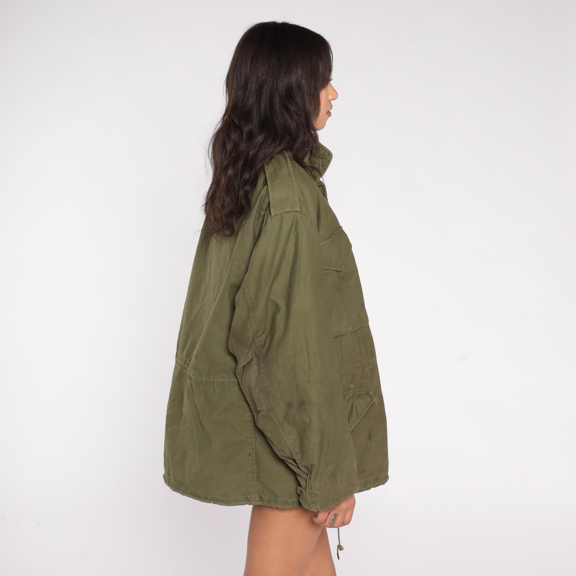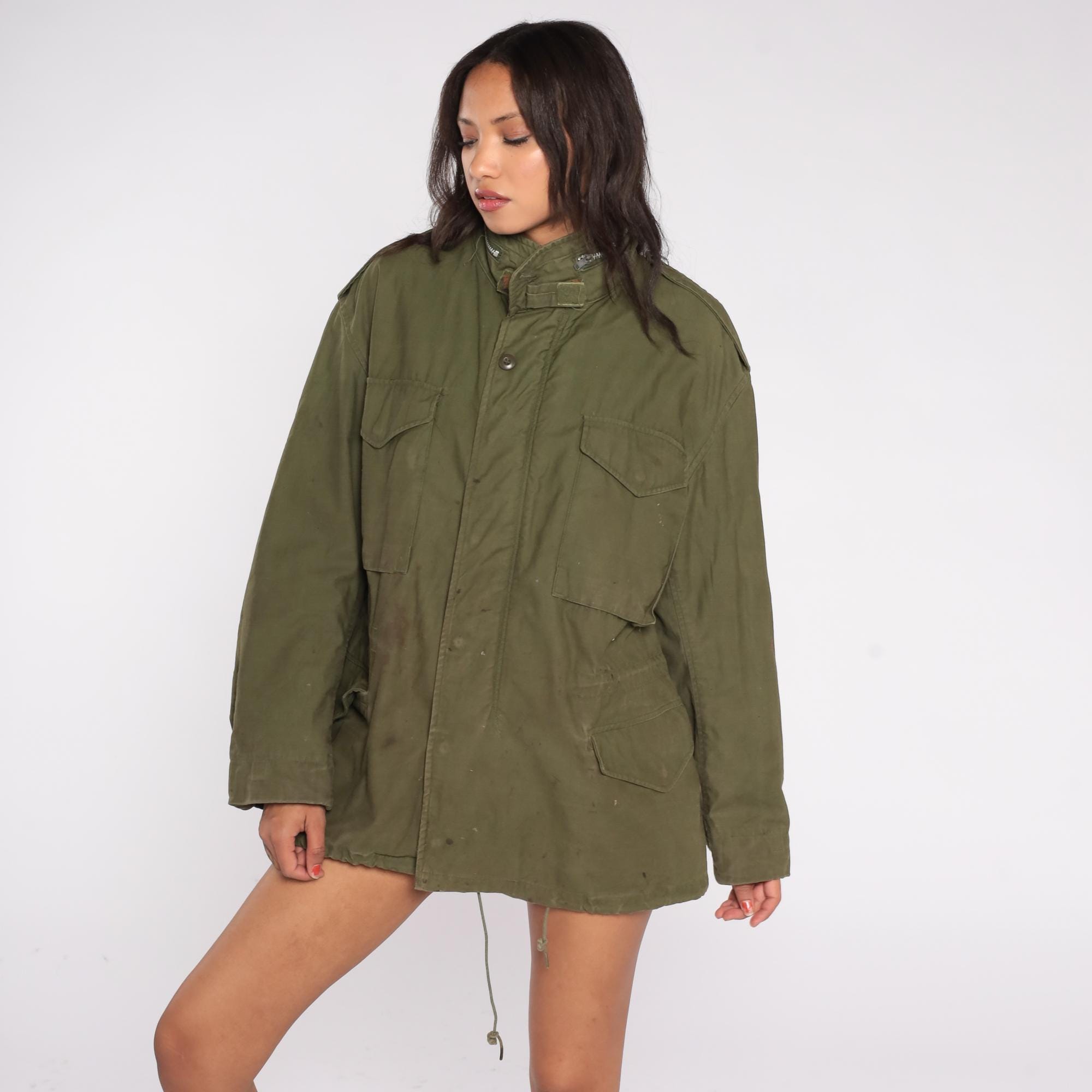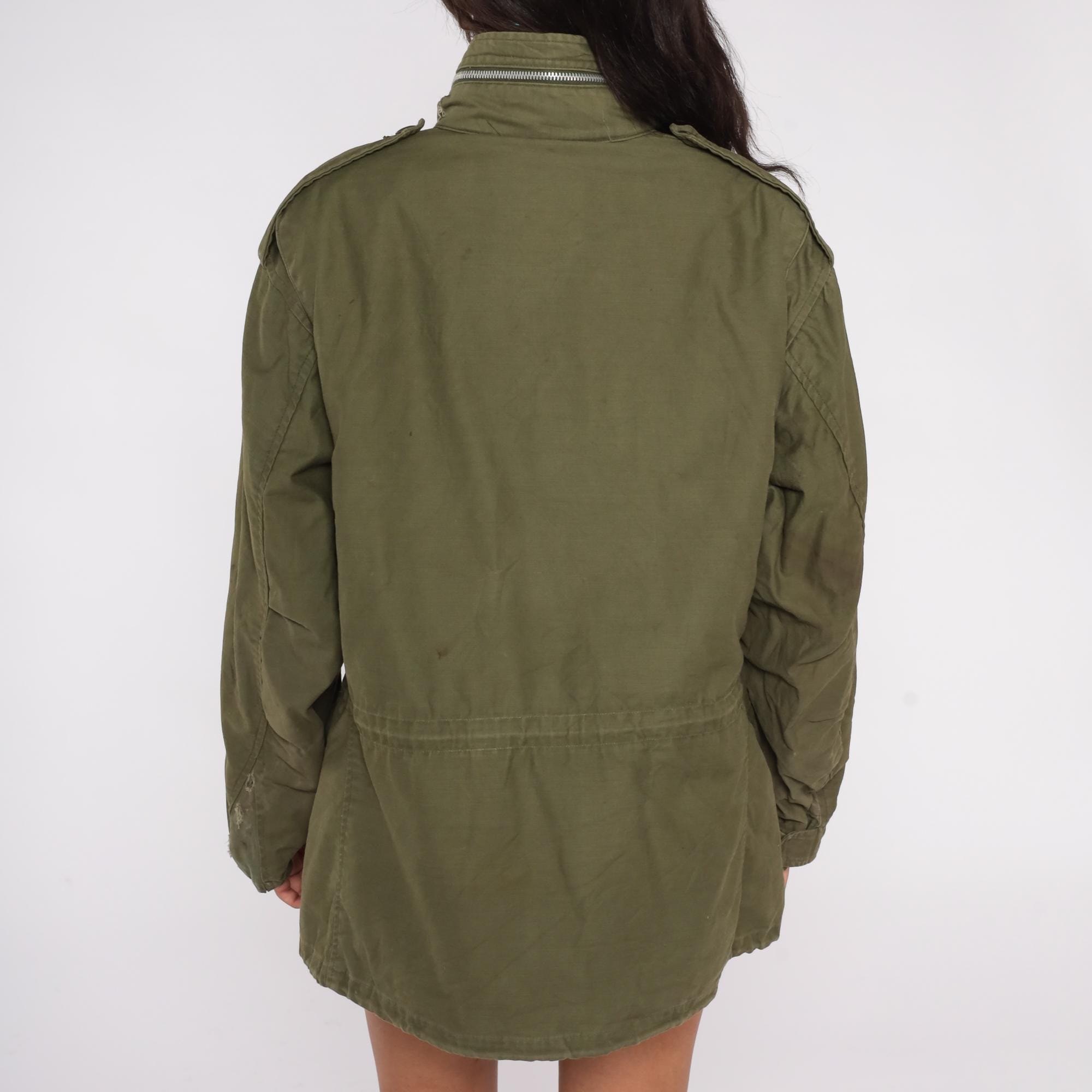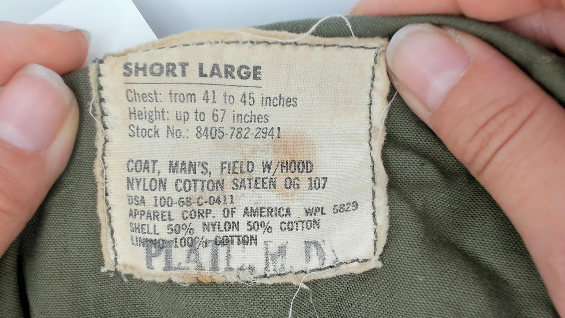 1968 Vietnam War era M-65 field jacket by Apparel Corp of America. Features olive green OG-107 sateen fabric, concealed hood in zippered collar, button-front closure, four front cargo pockets, and internal drawstring waist. Military specification DSA 100-68-C-0411.