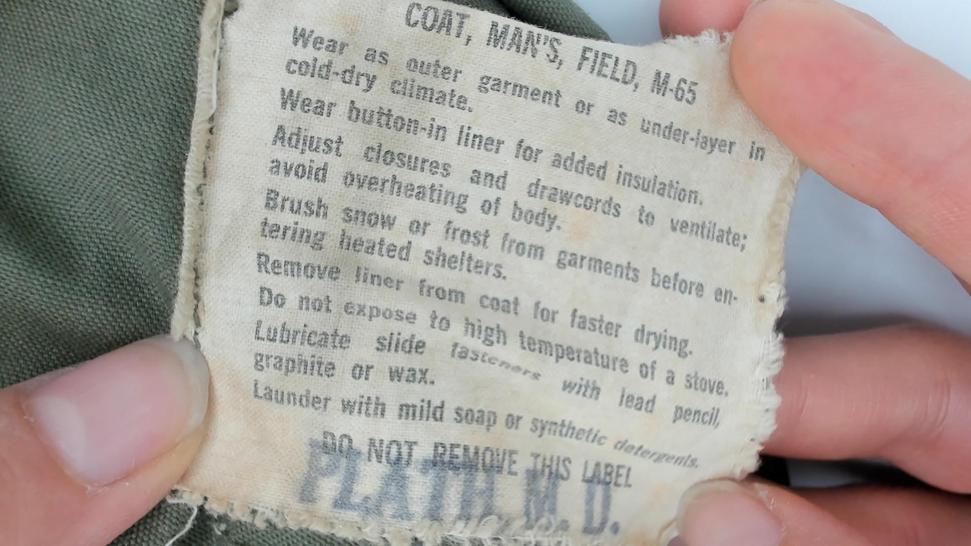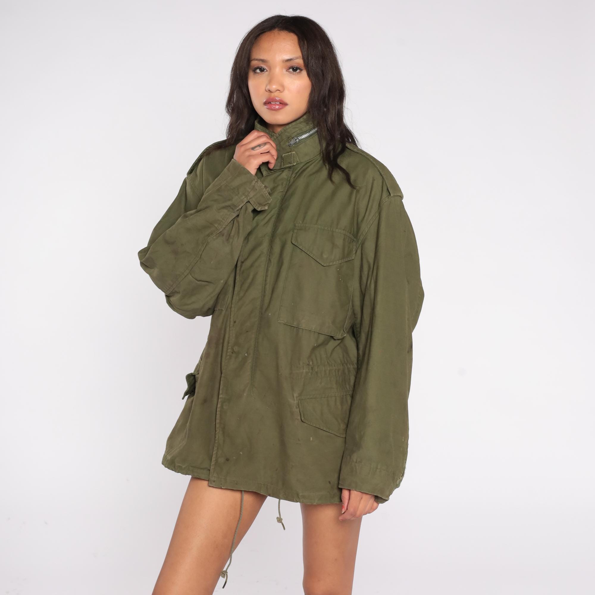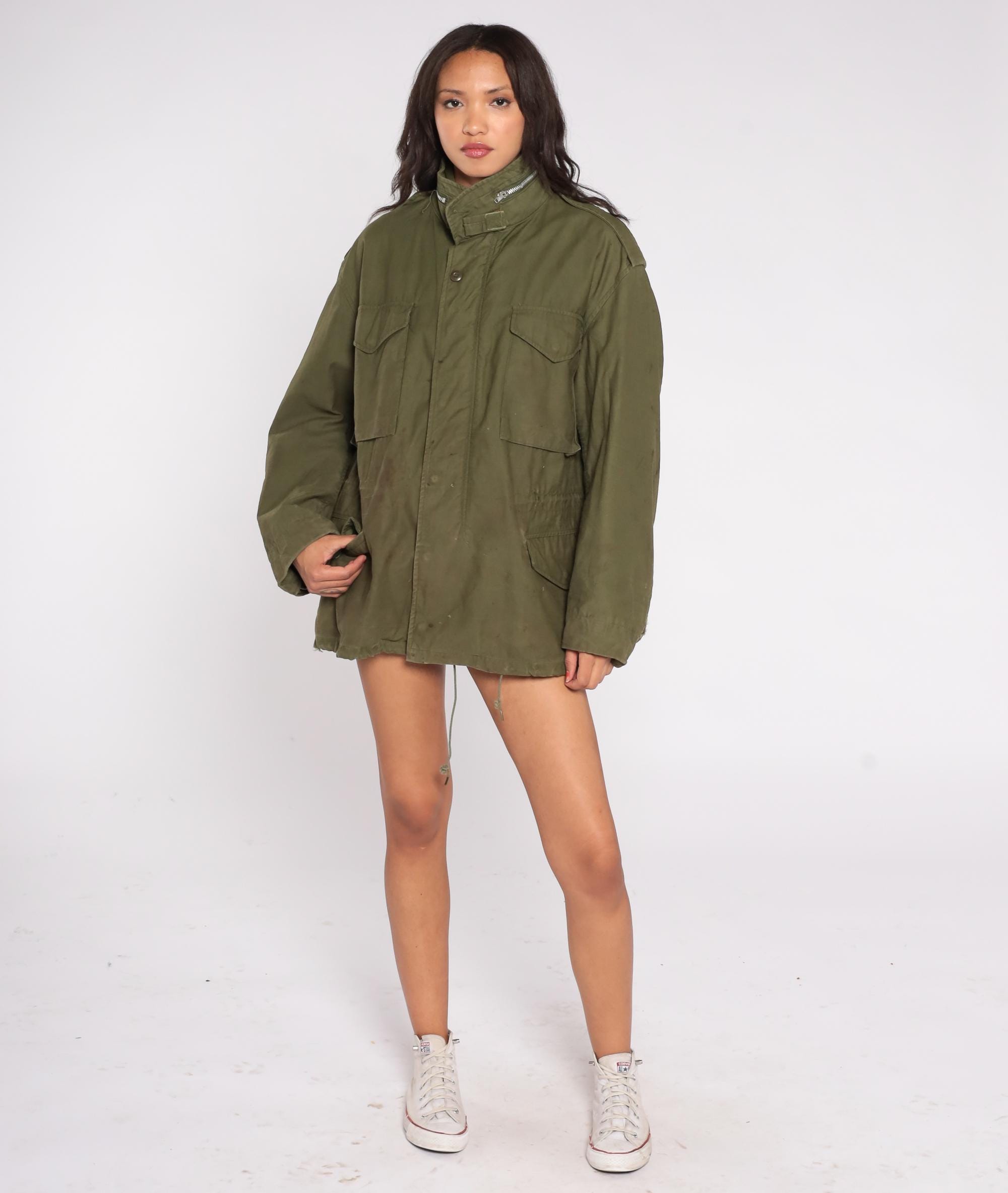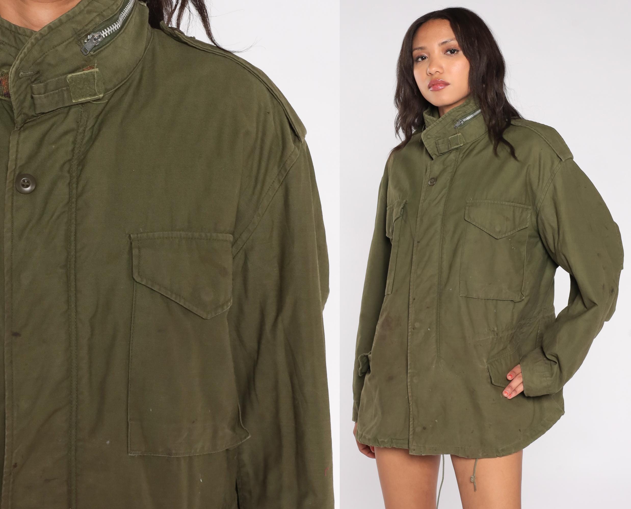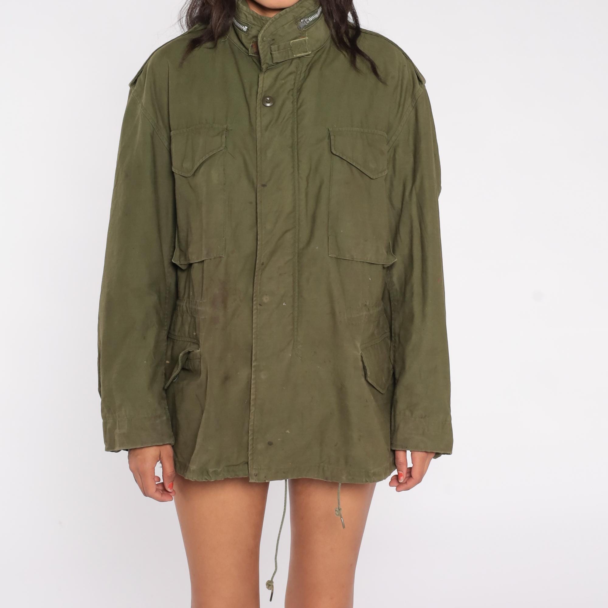 1968 Vietnam War era M-65 field jacket by Apparel Corp of America. Features olive green OG-107 sateen fabric, concealed hood in zippered collar, button-front closure, four front cargo pockets, and internal drawstring waist. Military specification DSA 100-68-C-0411.