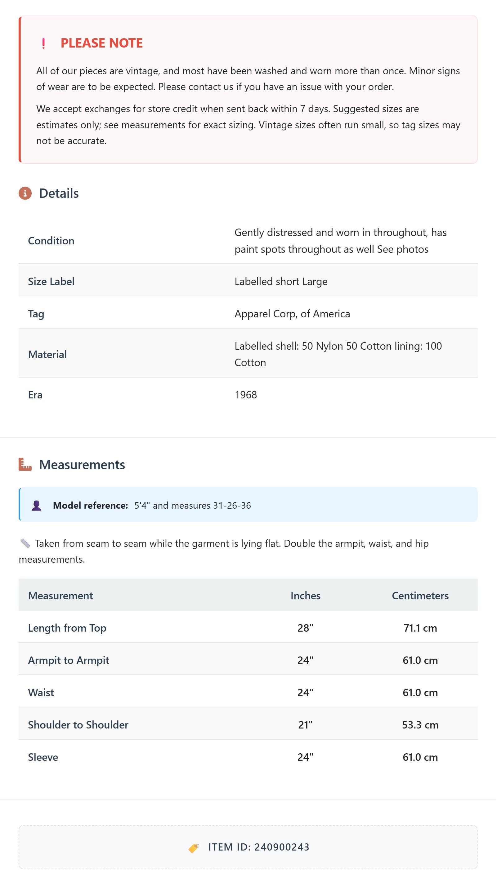 All of our pieces are vintage, and most have been washed and worn more than once. Minor signs of wear are to be expected. Please contact us if you have an issue with your order. We accept exchanges for store credit when sent back within 7 days.