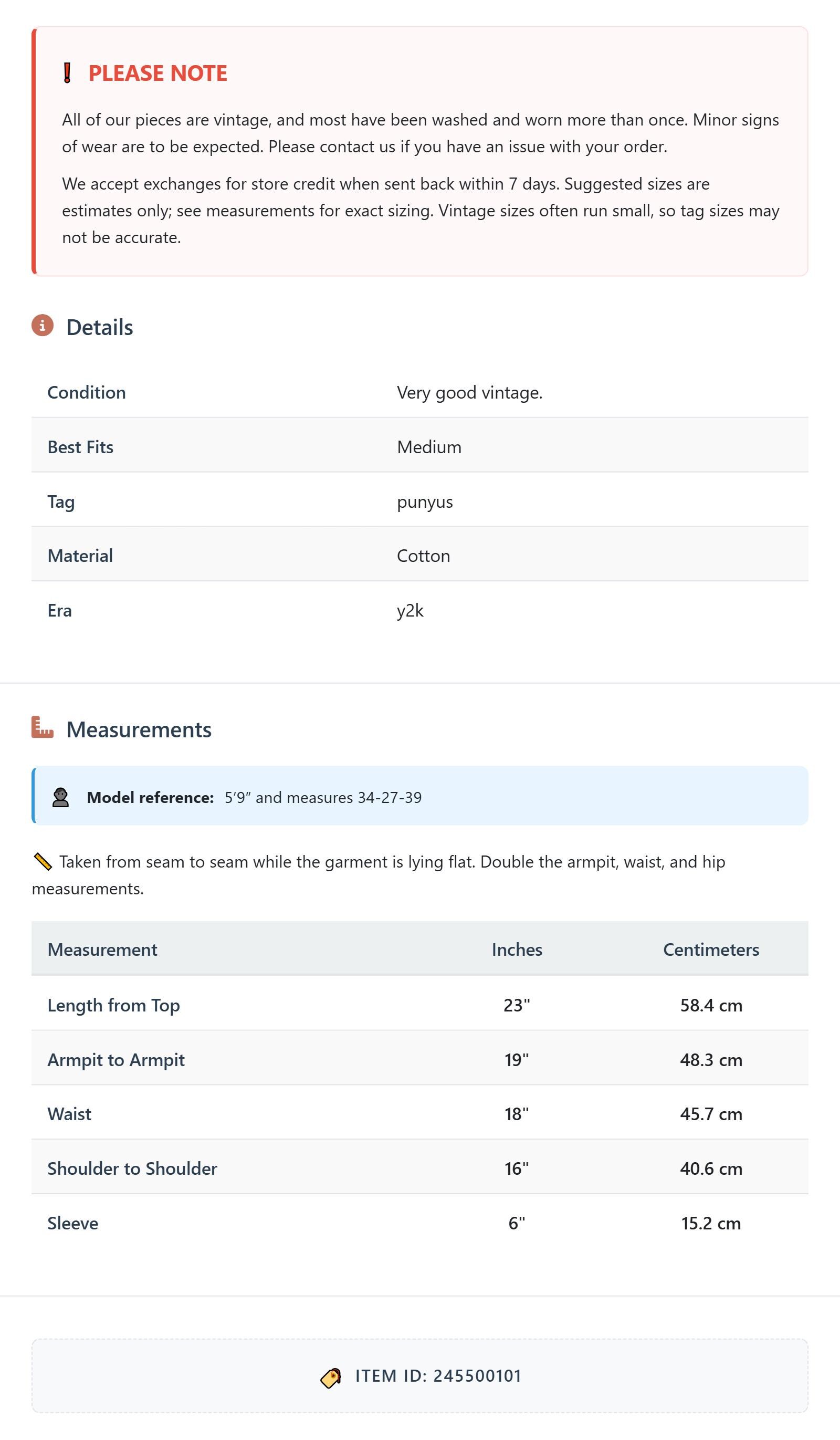 All of our pieces are vintage, and most have been washed and worn more than once. Minor signs of wear are to be expected. Please contact us if you have an issue with your order. We accept exchanges for store credit when sent back within 7 days.