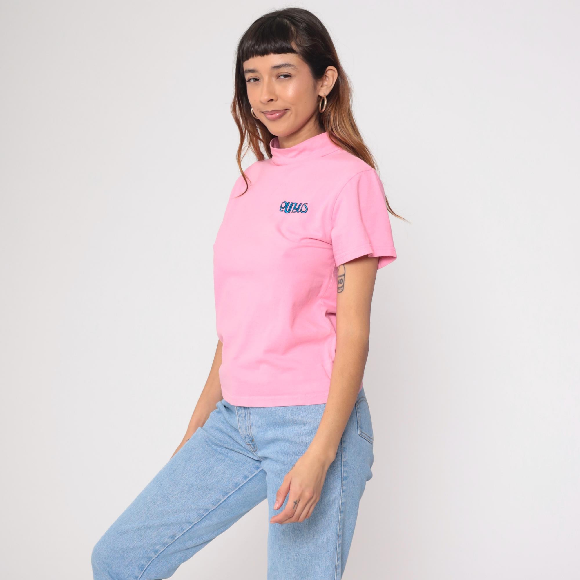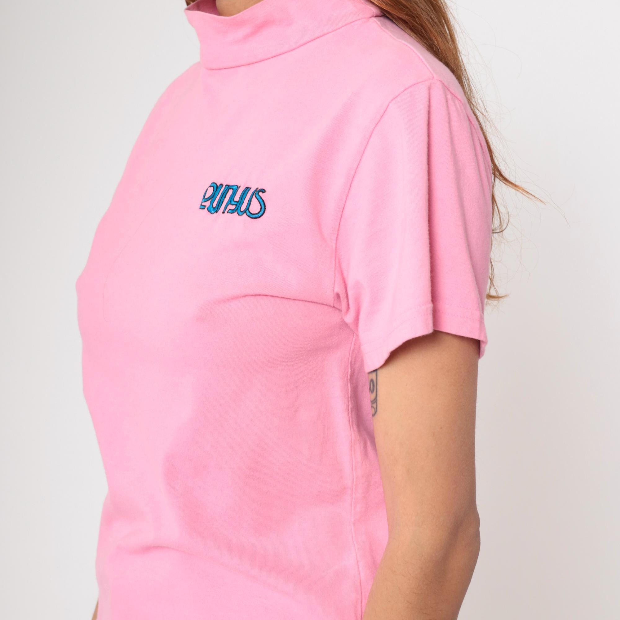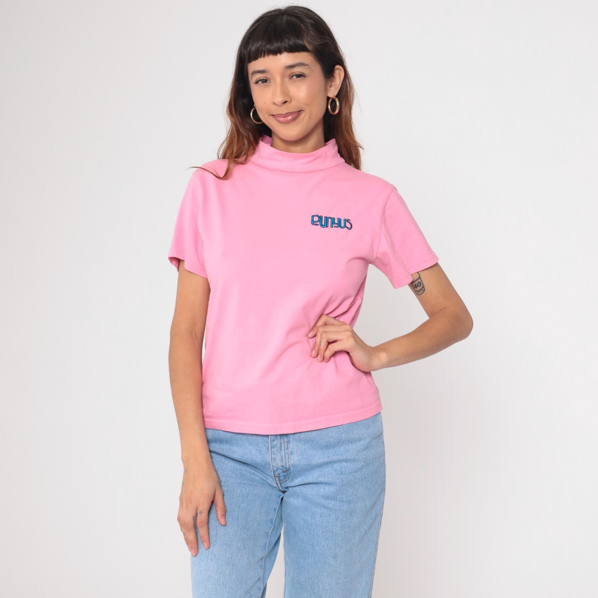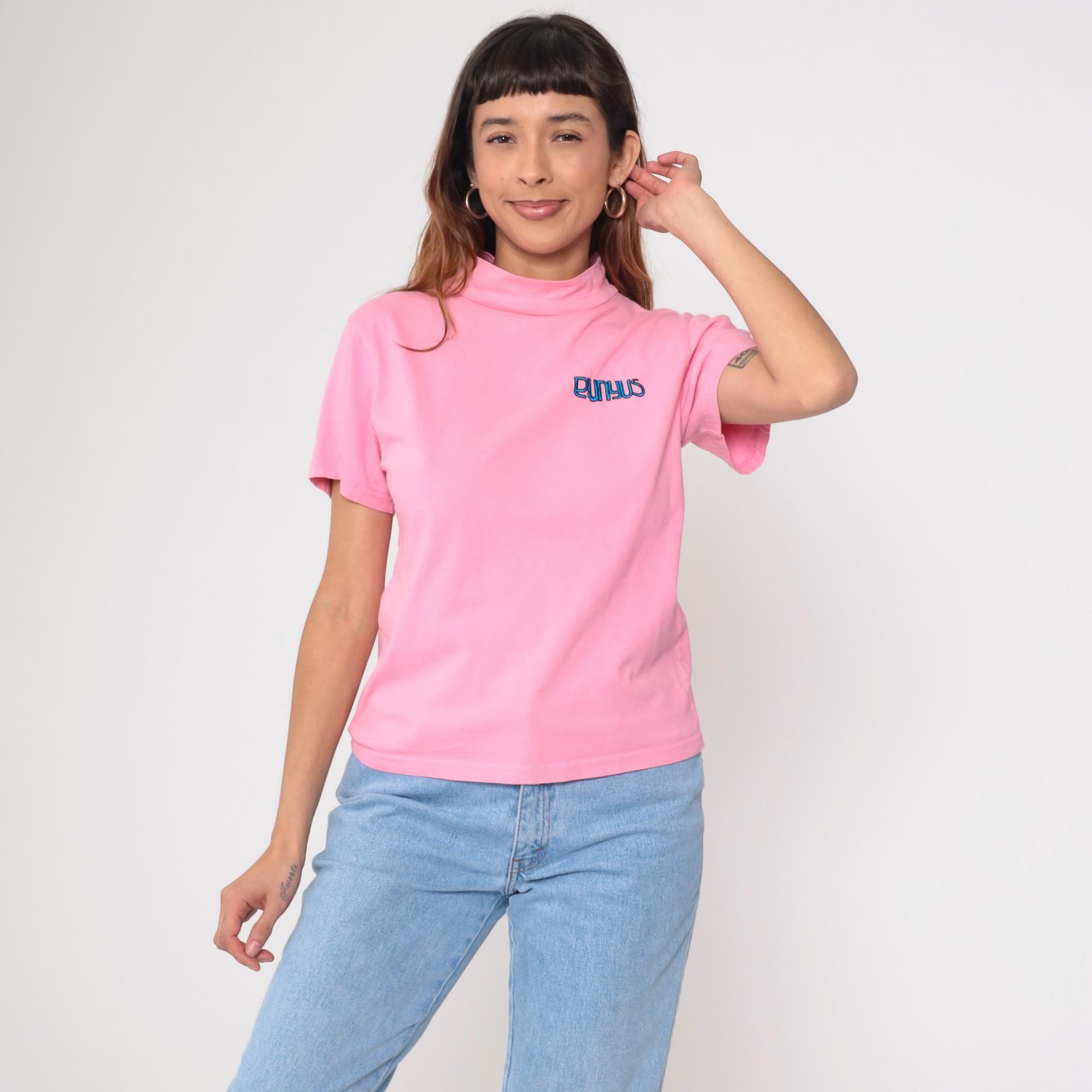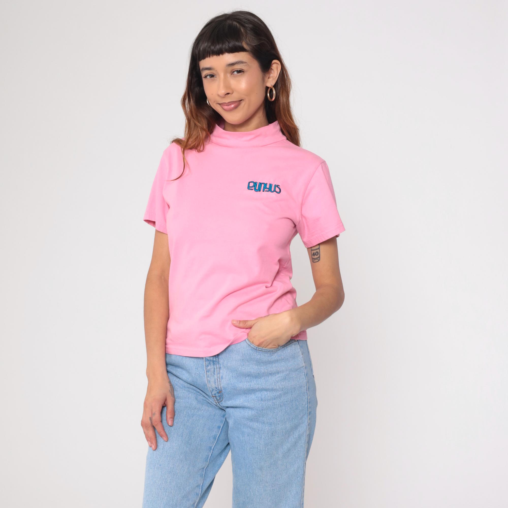 Vintage Y2K Punyus cotton t-shirt in pastel pink with blue embroidered logo. Features a mock neck design and short sleeves.