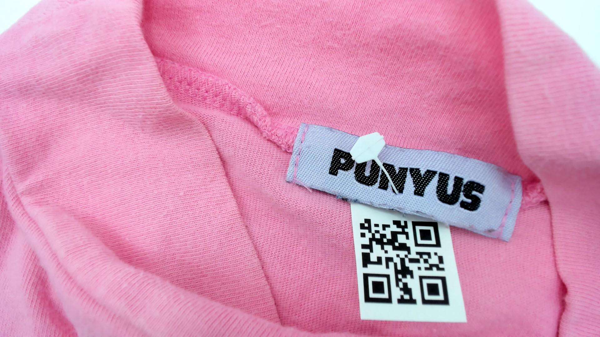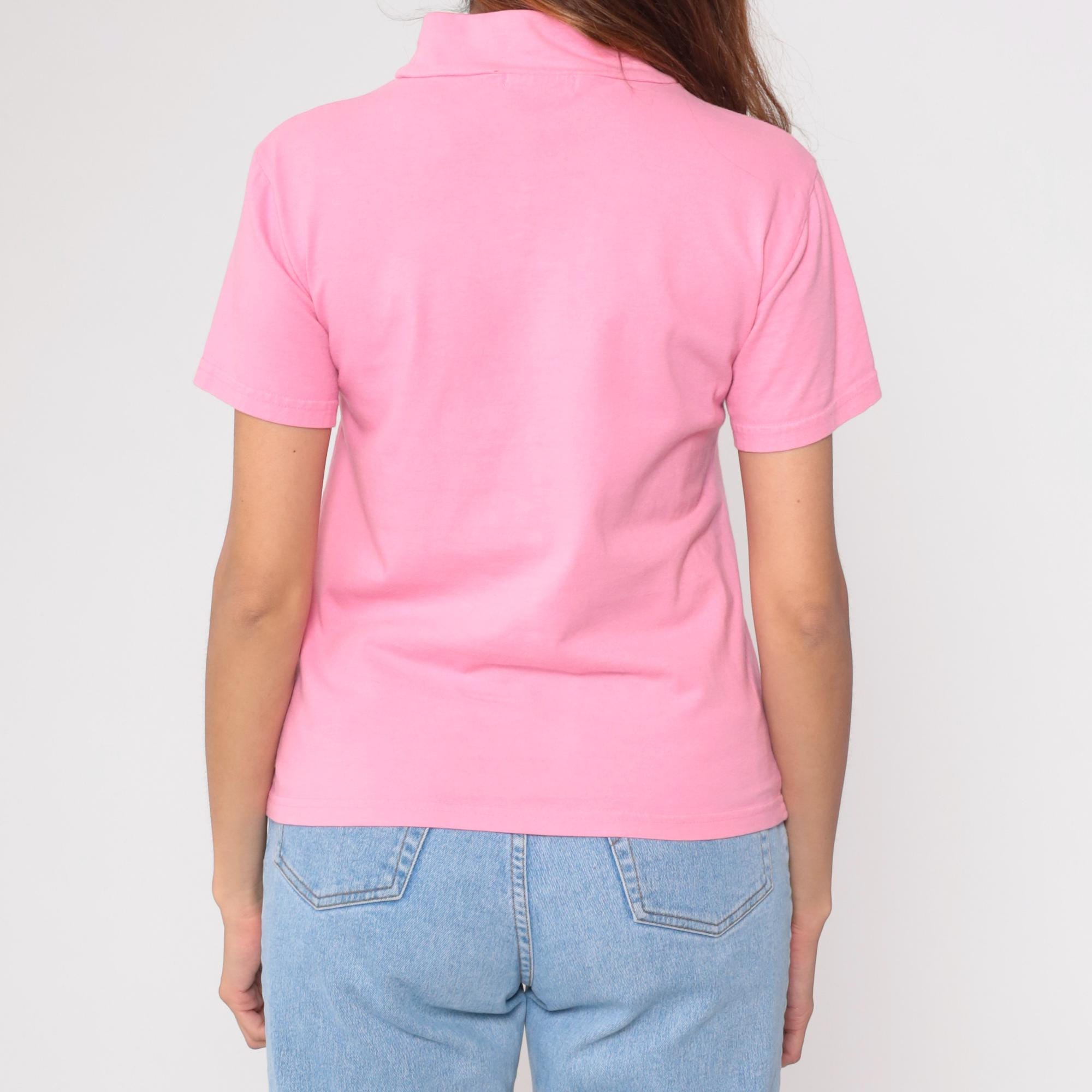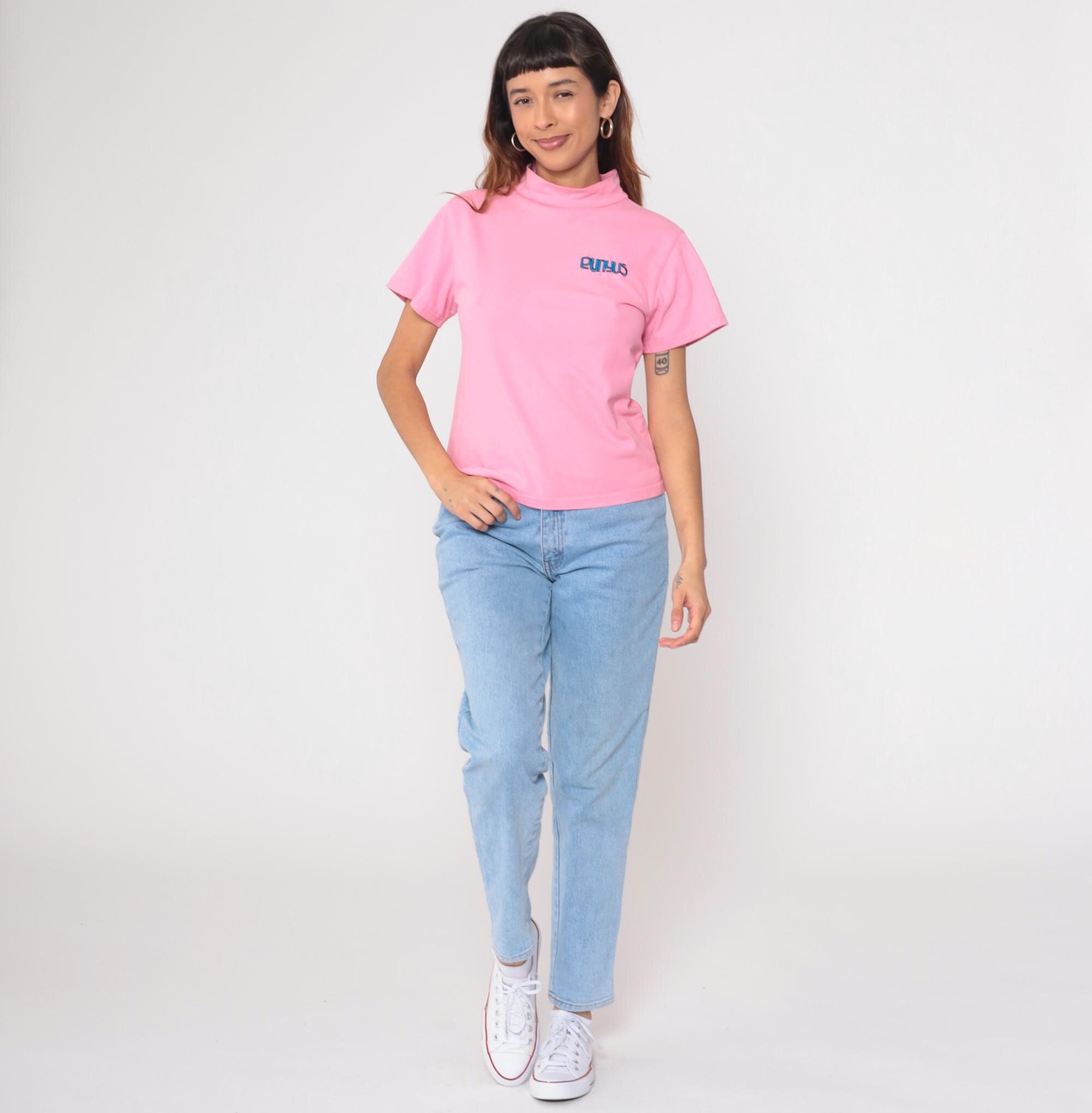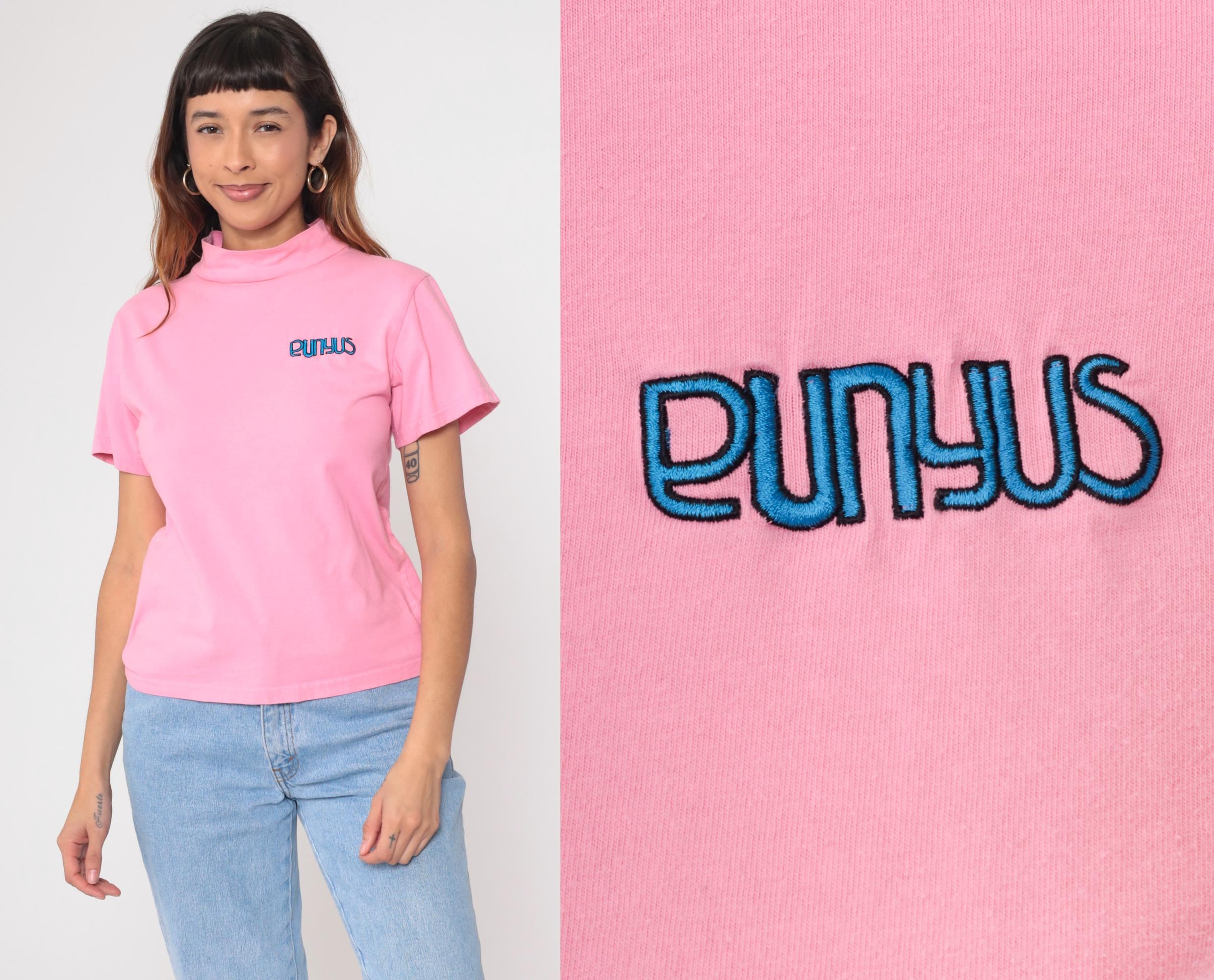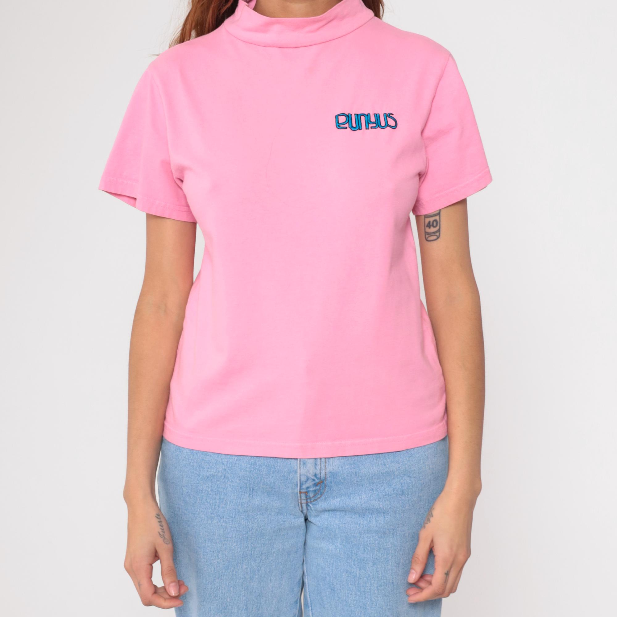 Vintage Y2K Punyus cotton t-shirt in pastel pink with blue embroidered logo. Features a mock neck design and short sleeves.