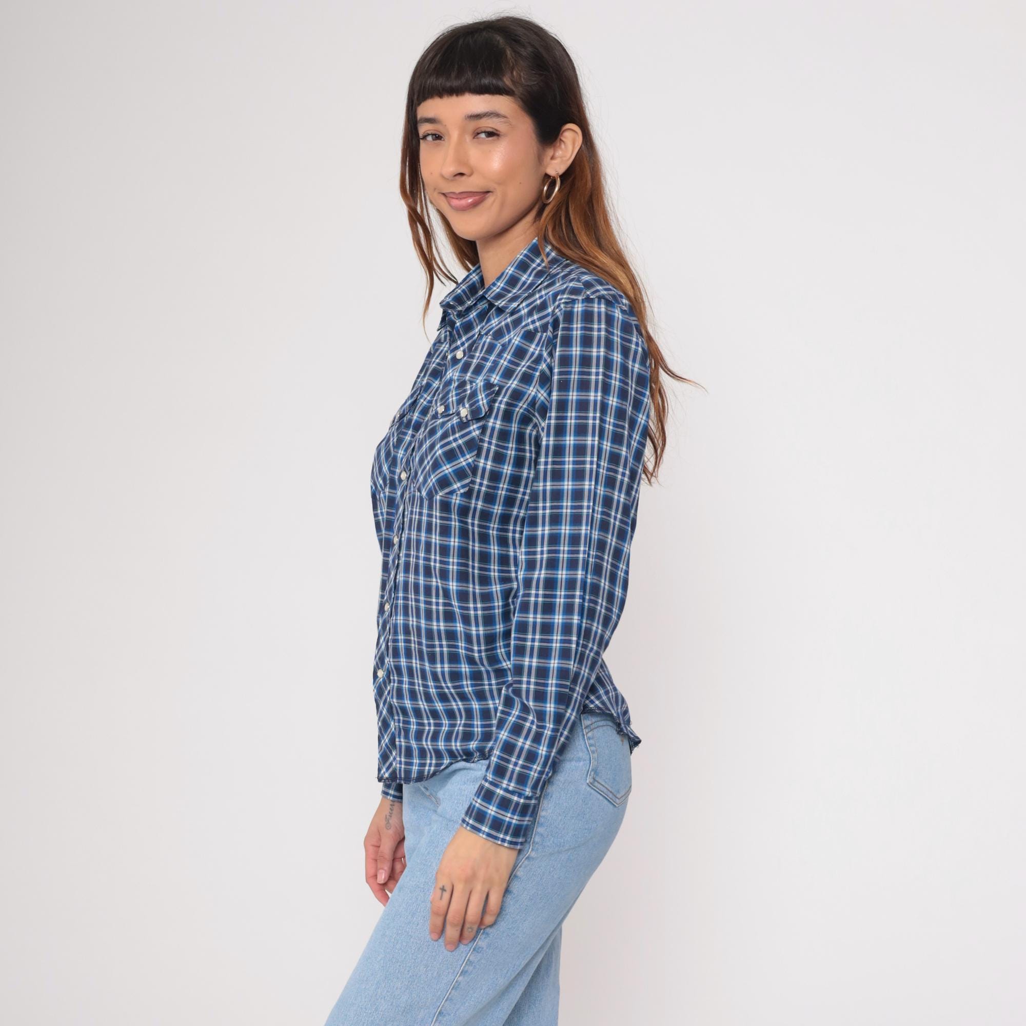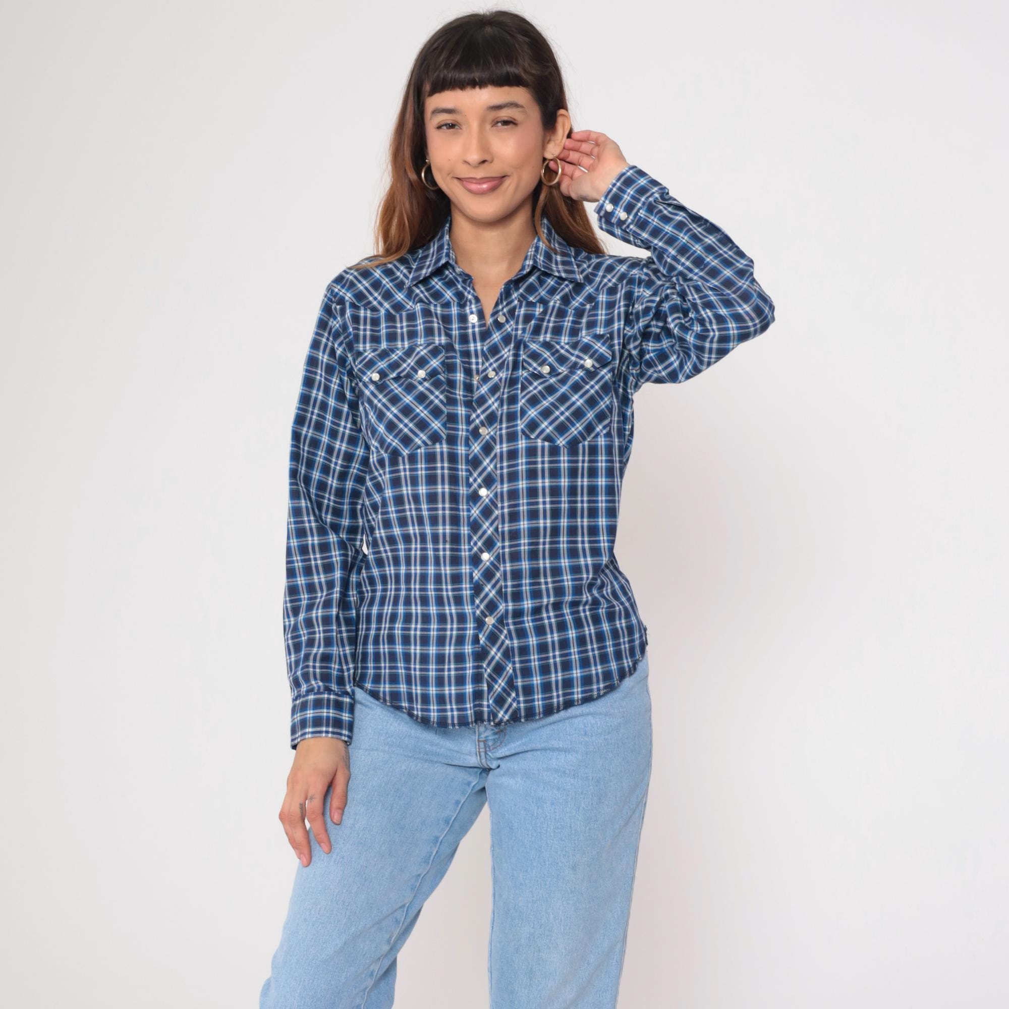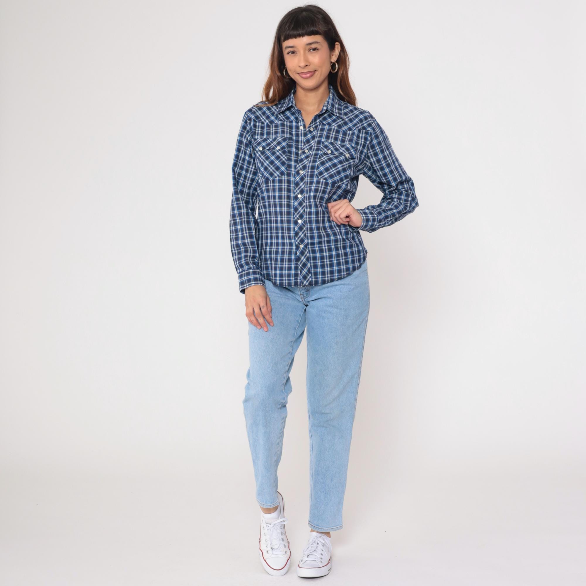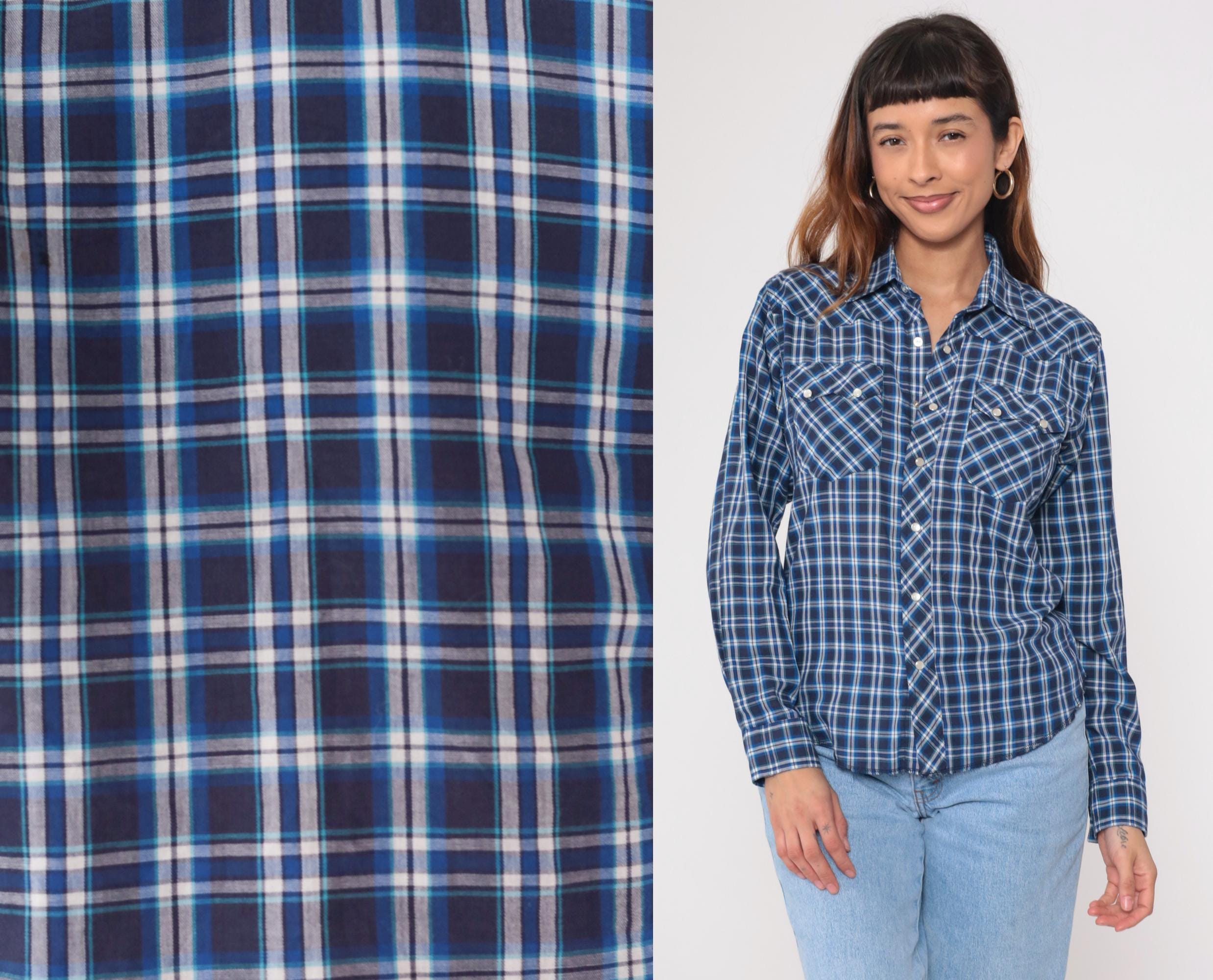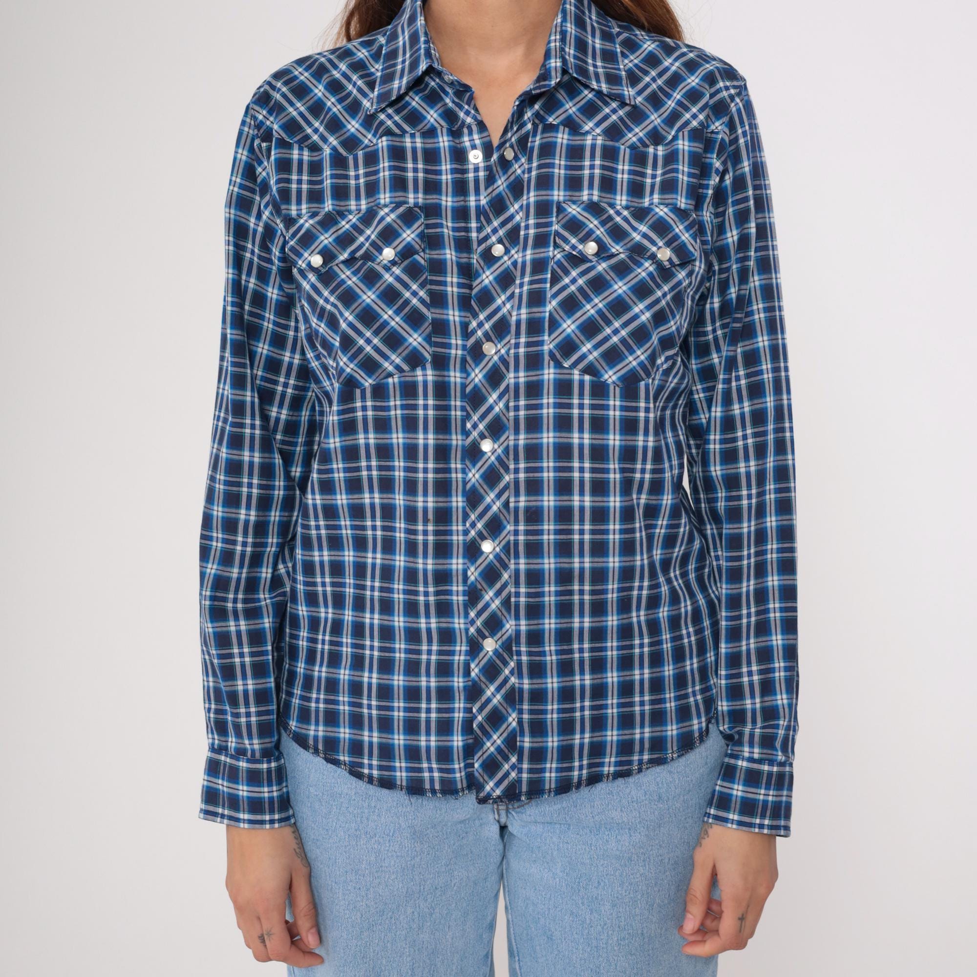 Vintage 90s shirt in a blue and white plaid print. It has long sleeves and pearl snaps down the front.