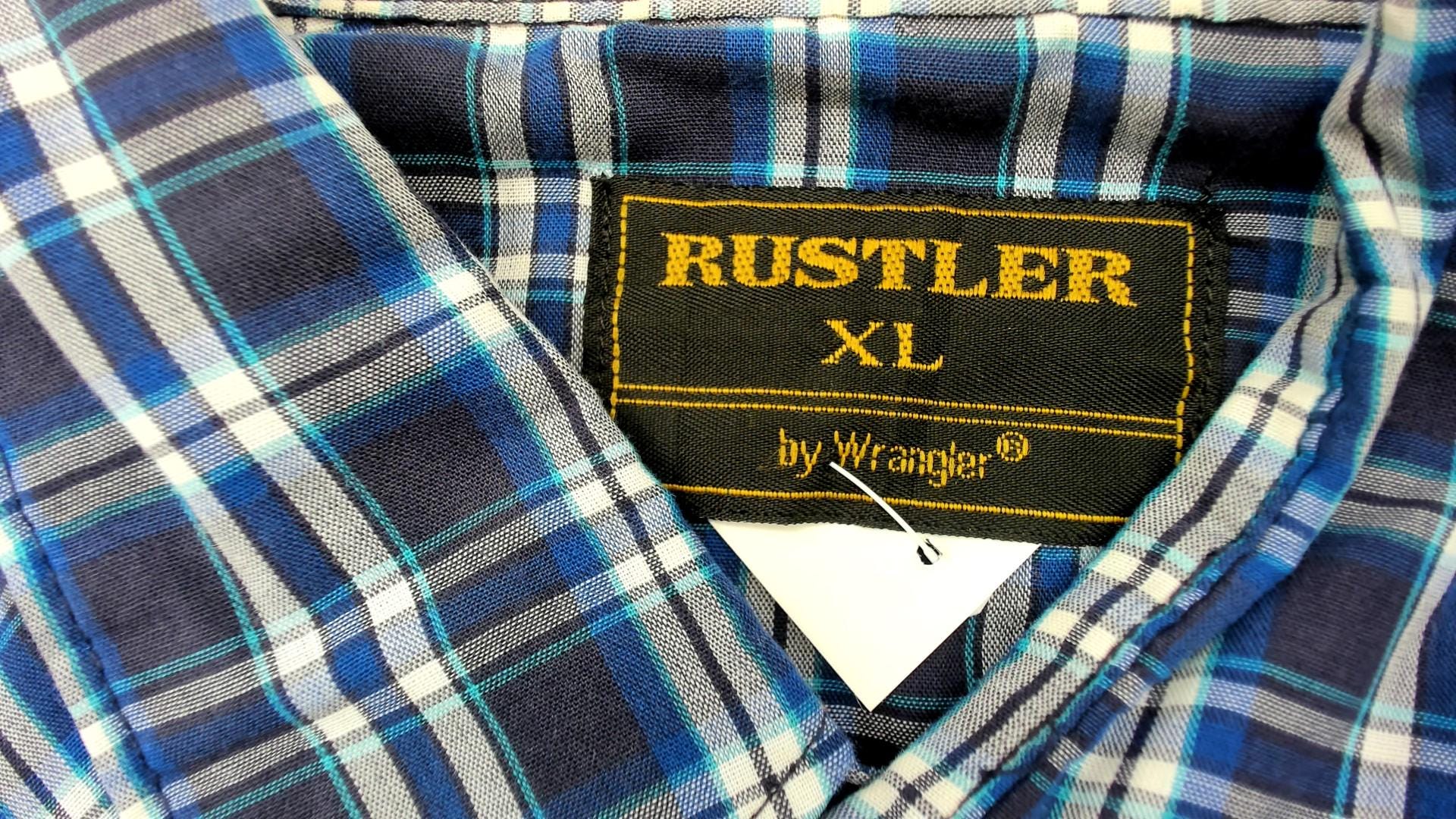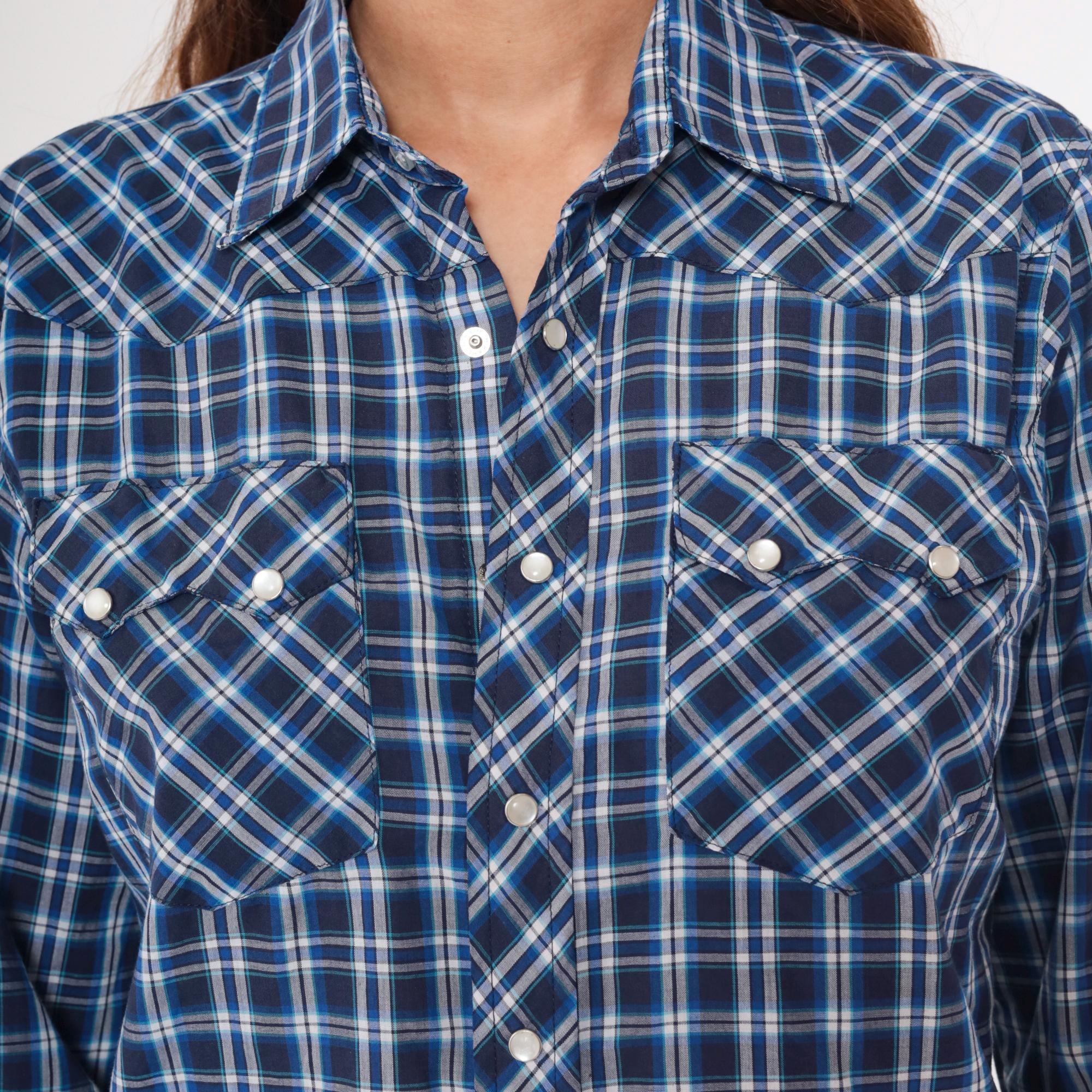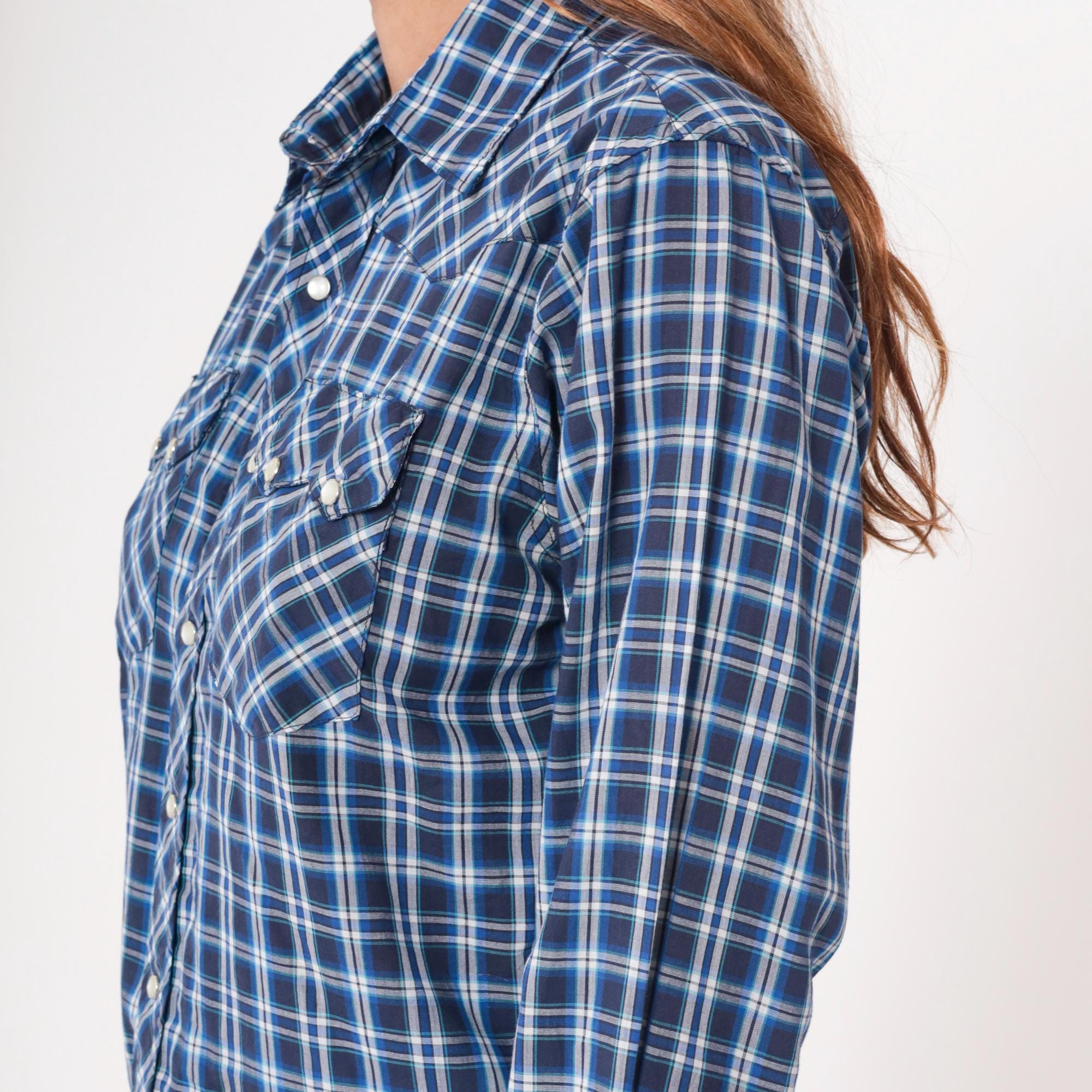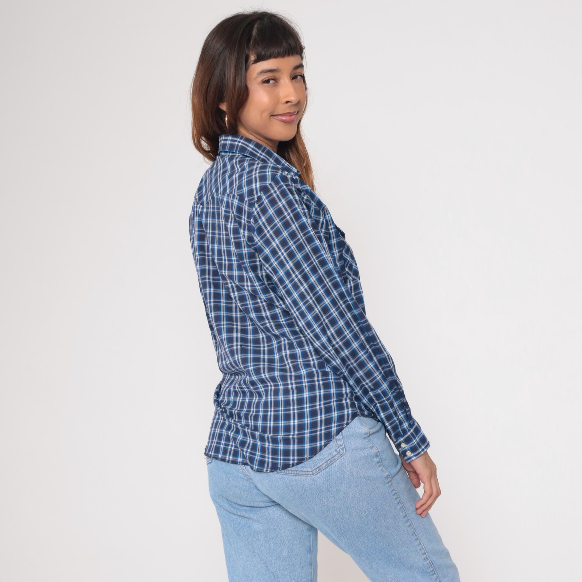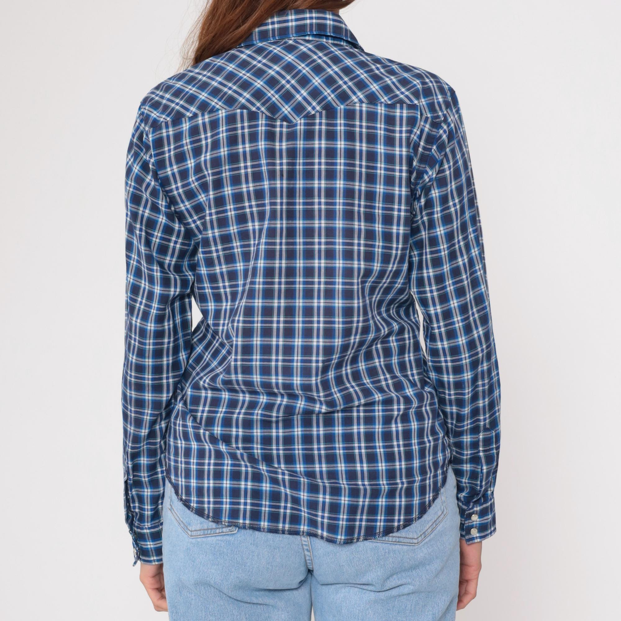 Vintage 90s shirt in a blue and white plaid print. It has long sleeves and pearl snaps down the front.