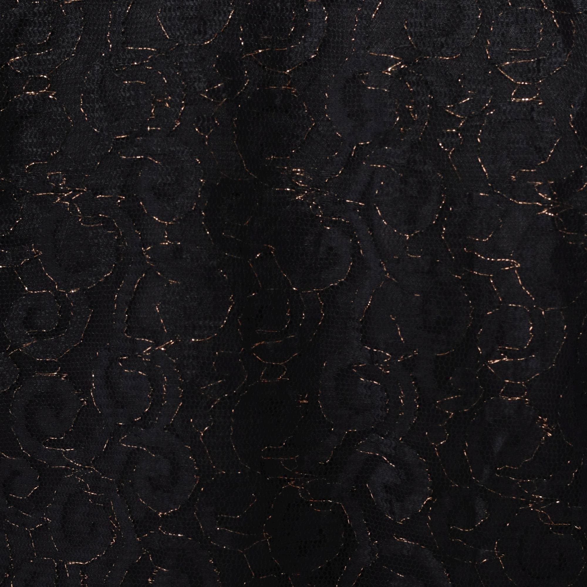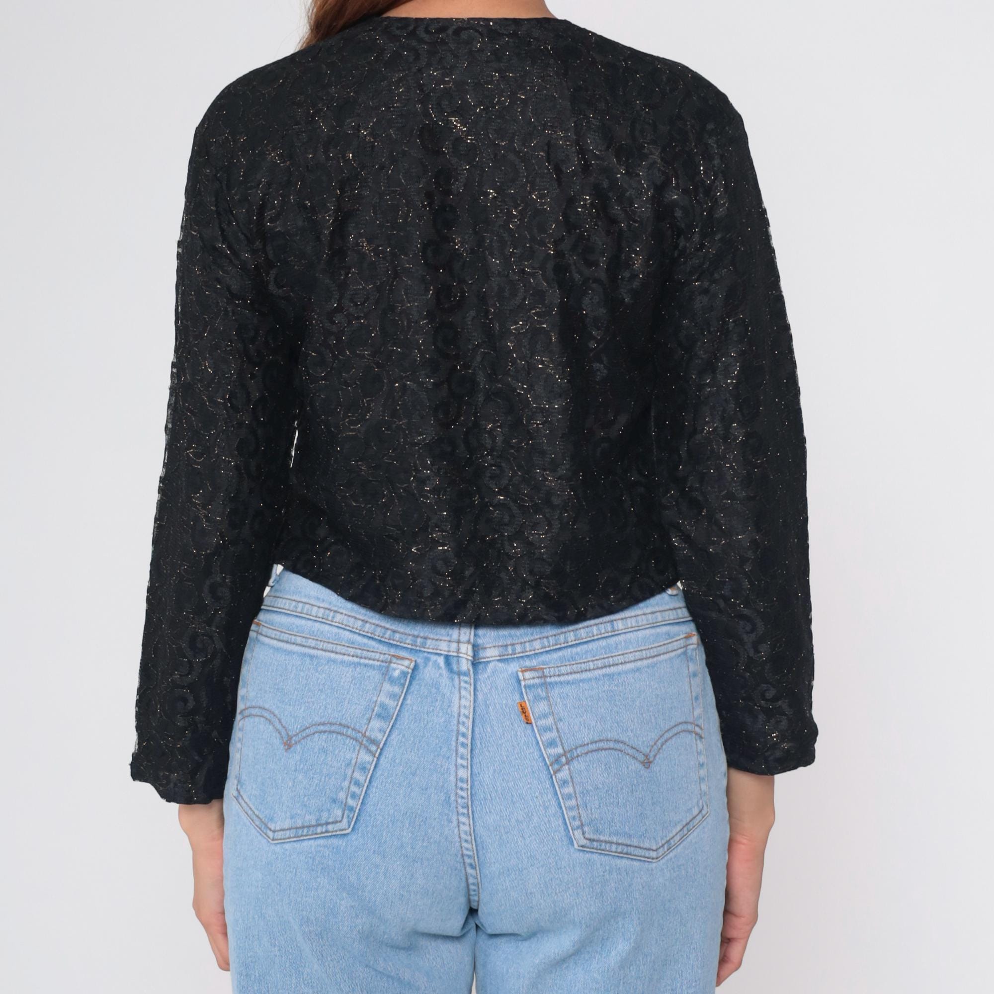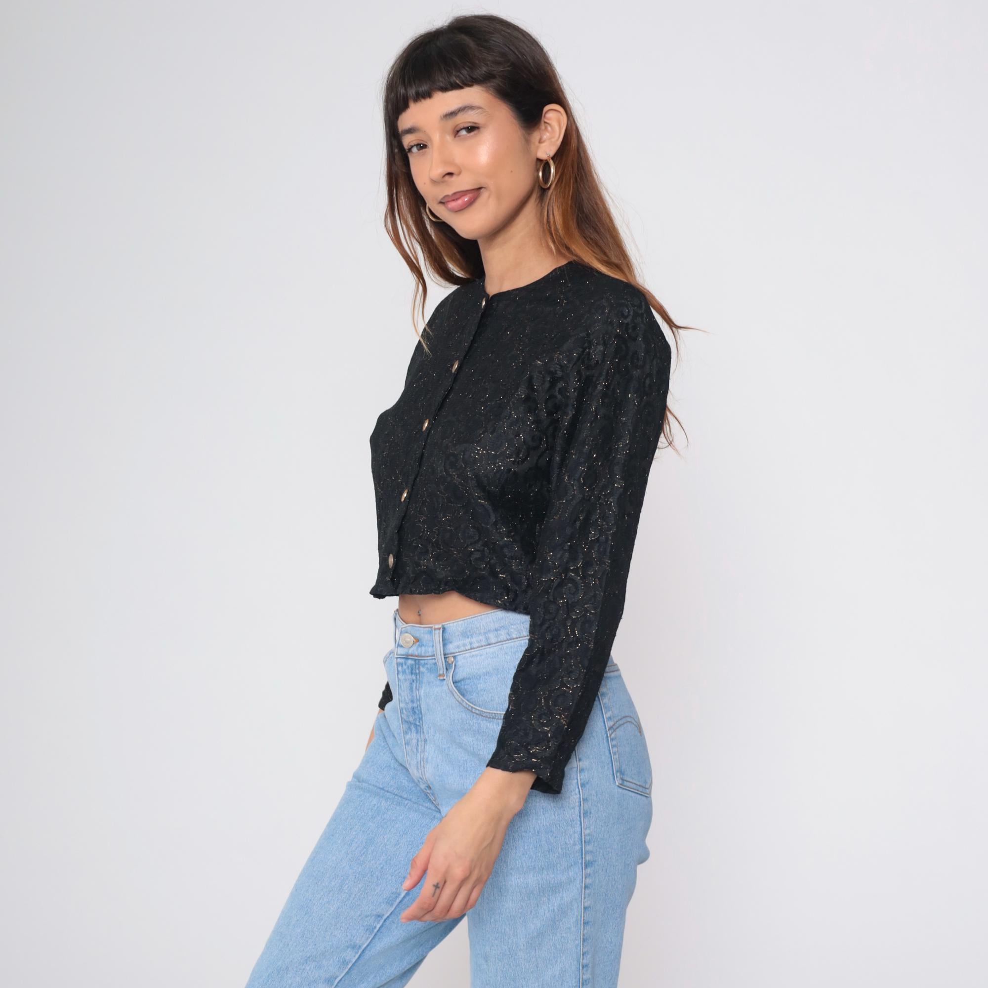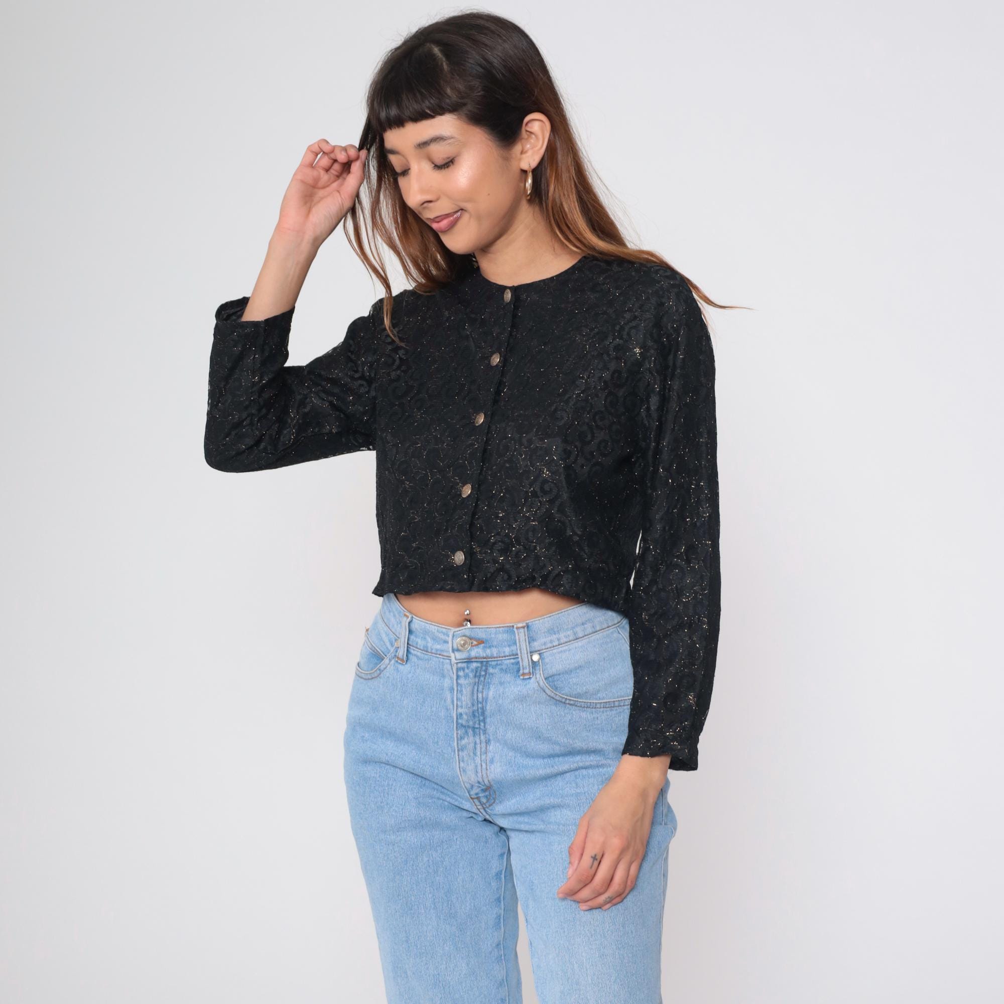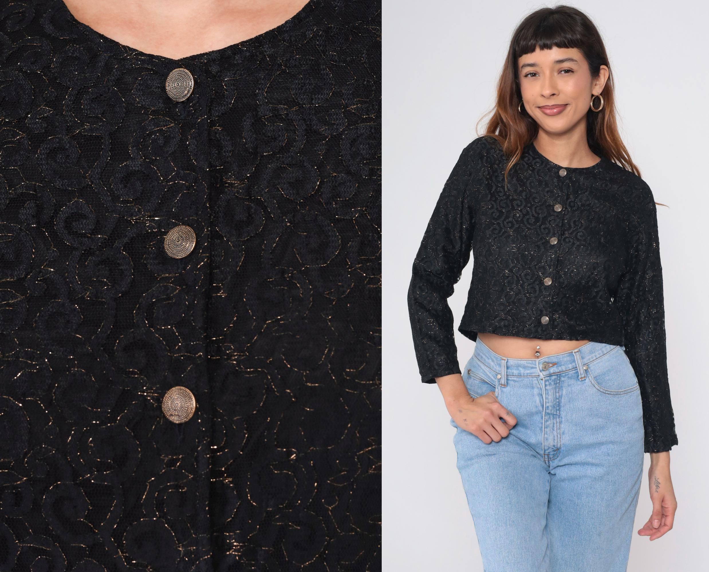 Vintage black crop top with textured floral lace pattern and gold metallic thread. Features Indian-style embroidery throughout. Round neckline with button front closure. Long sleeves with a boxy fit.