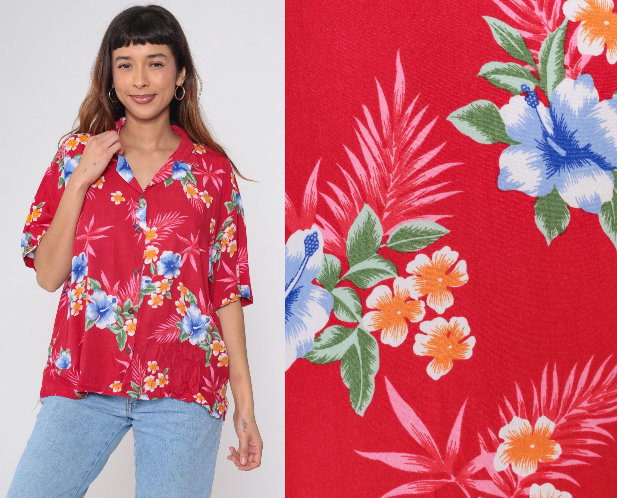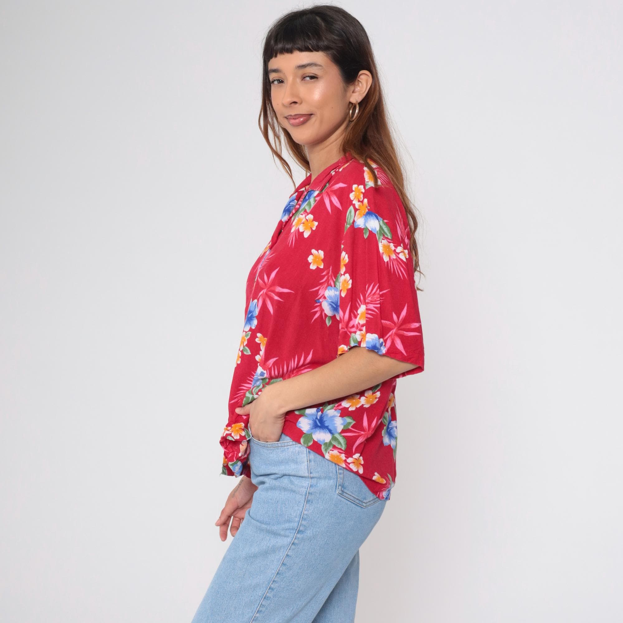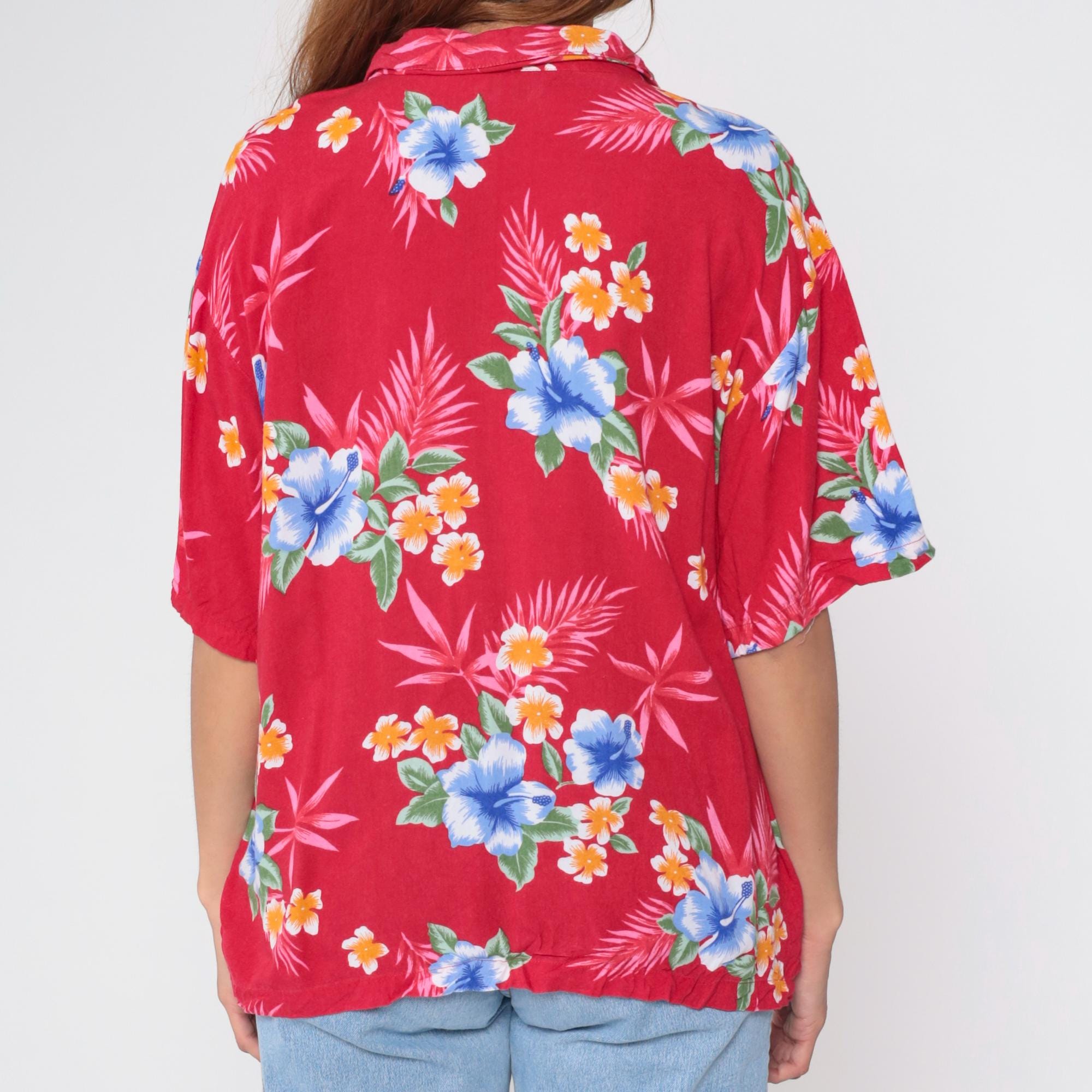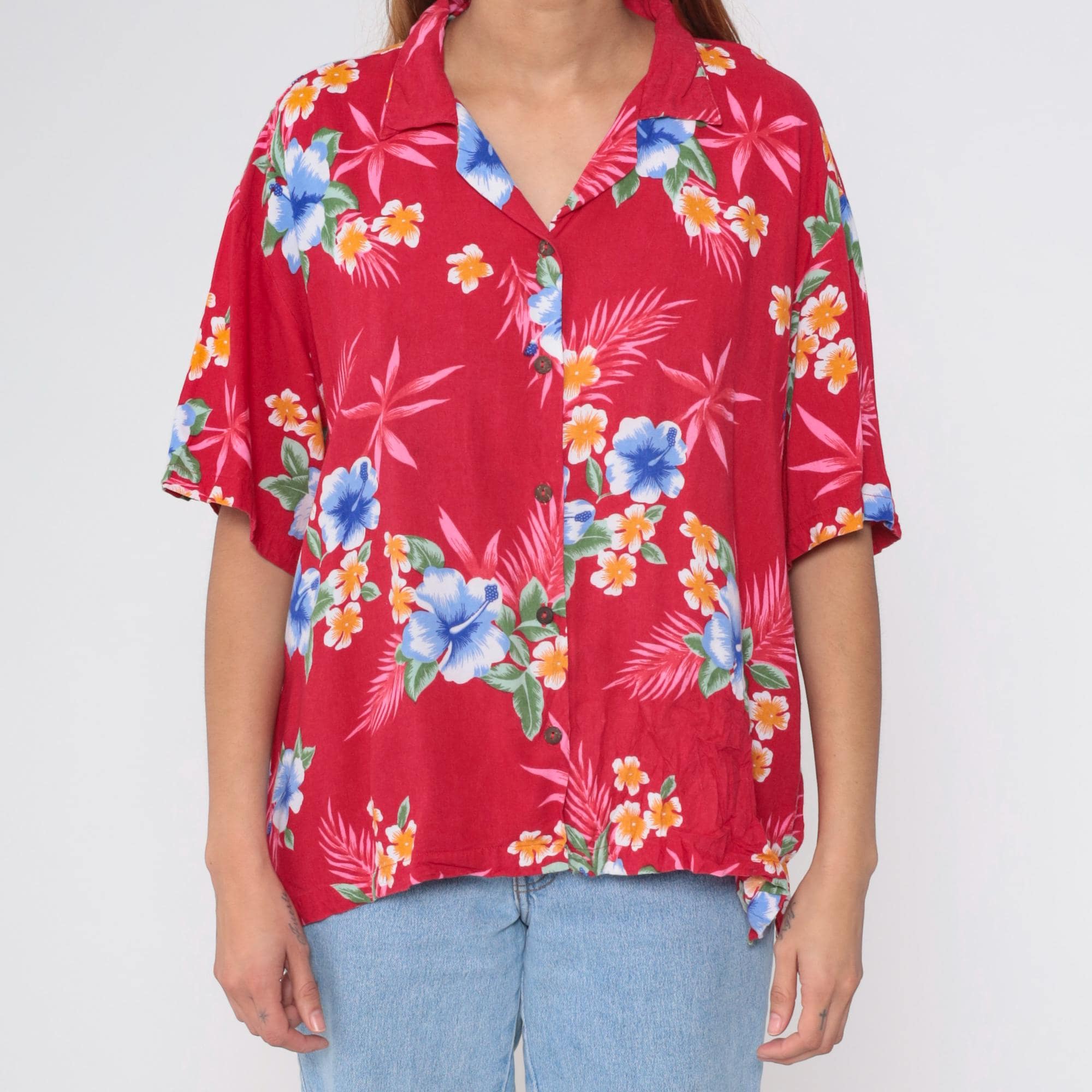 Vintage 90s shirt in red with a tropical floral print. It has short sleeves and buttons up the front.