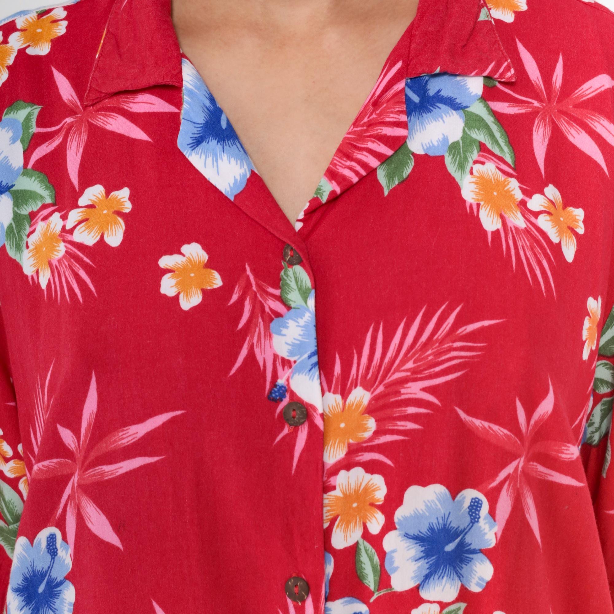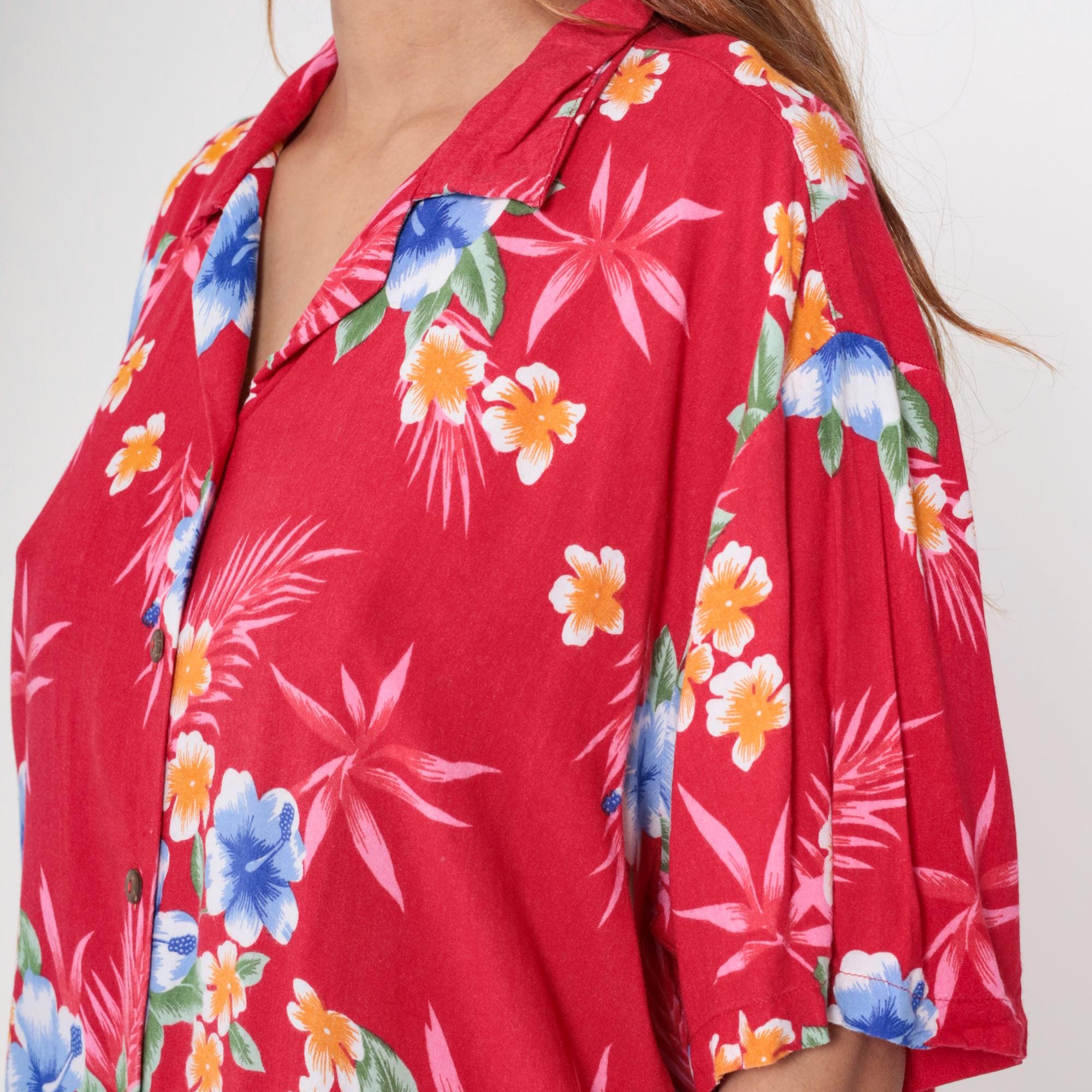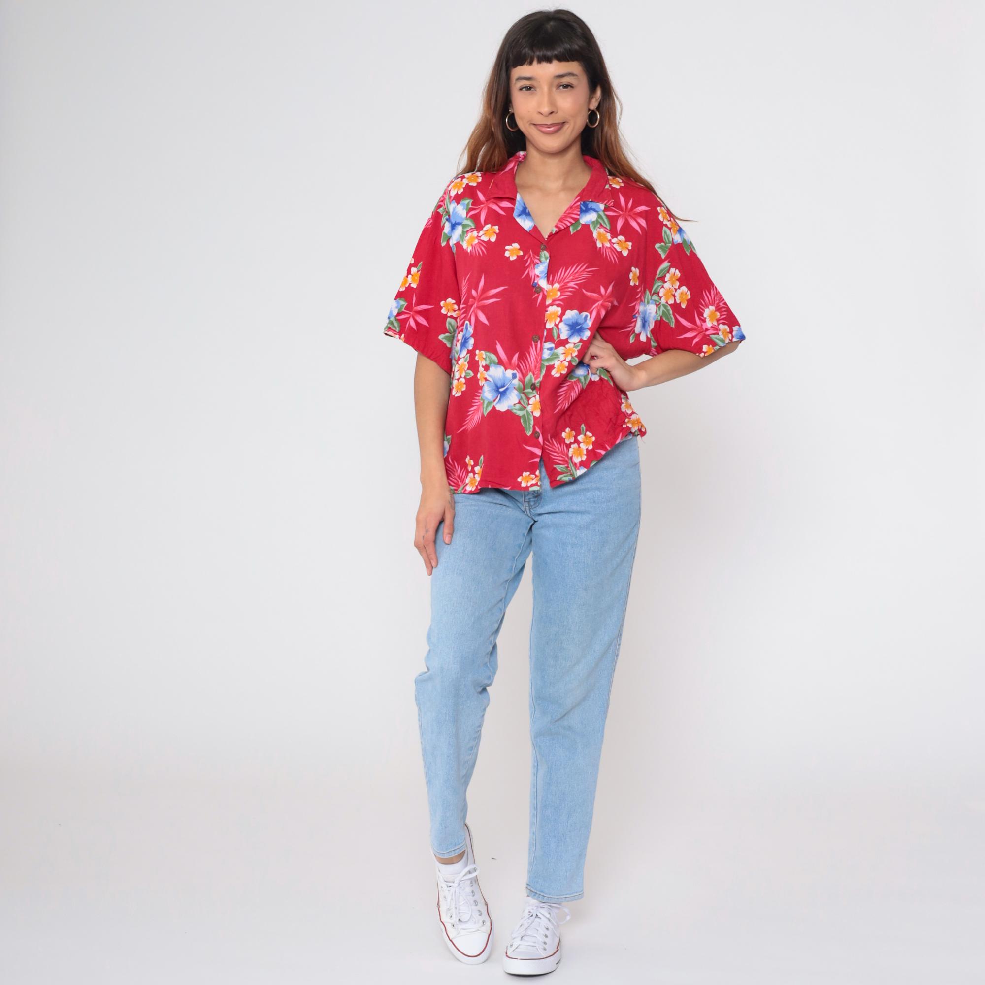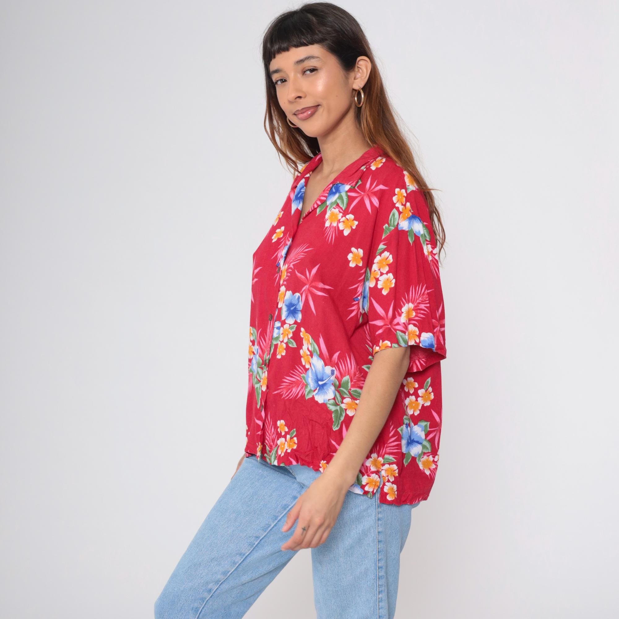 Vintage 90s shirt in red with a tropical floral print. It has short sleeves and buttons up the front.