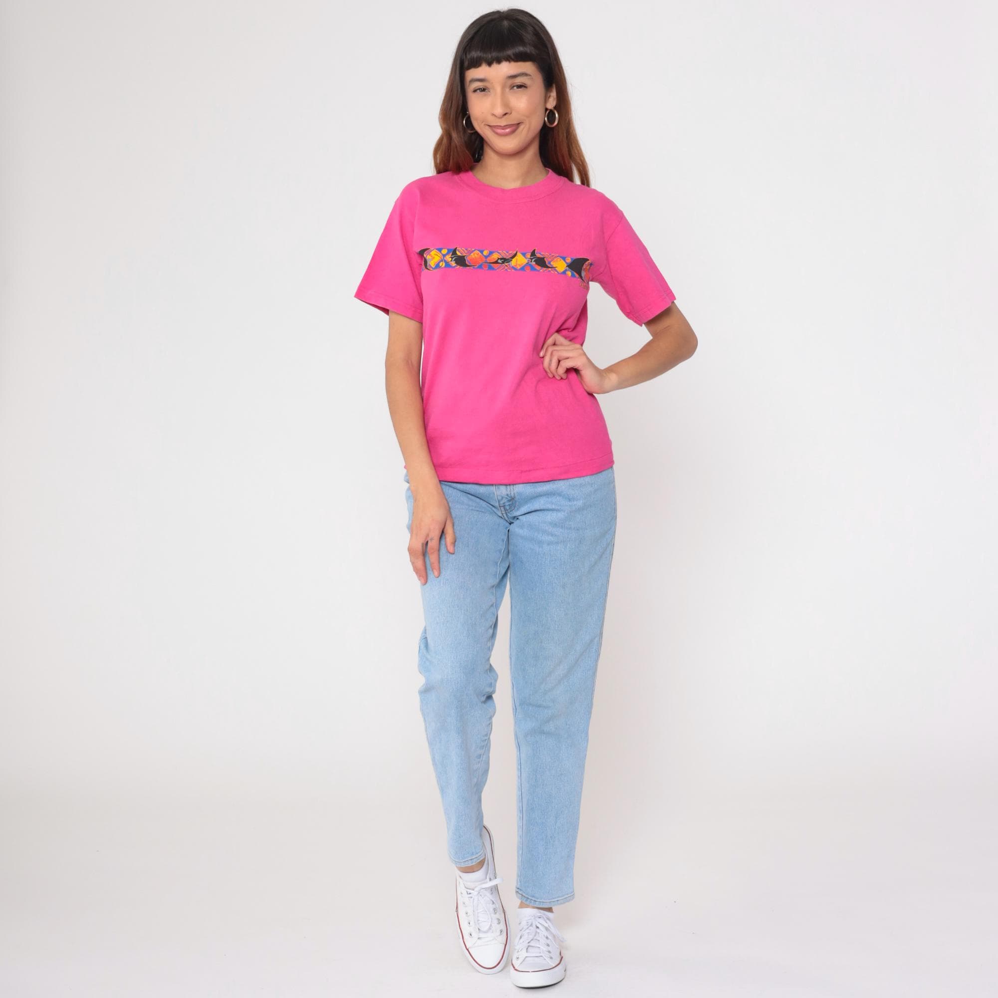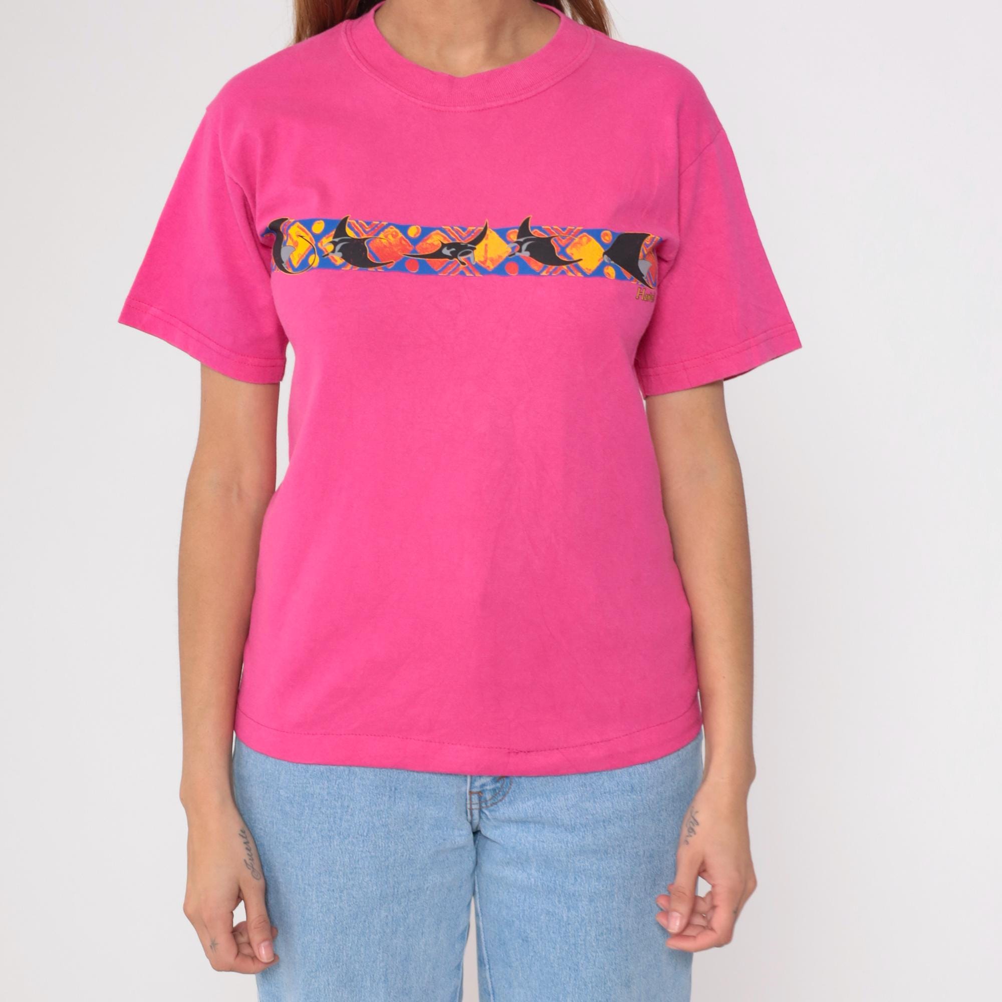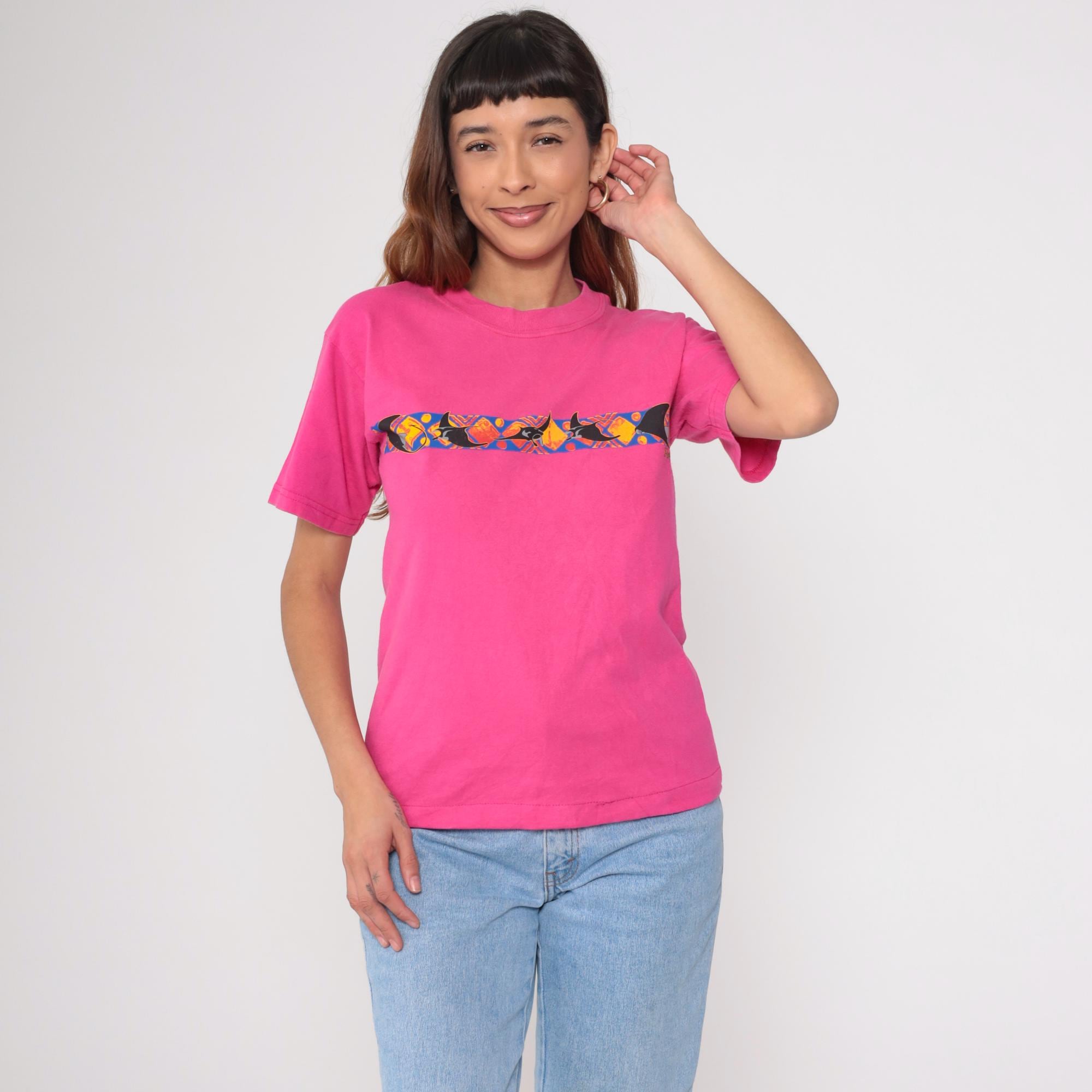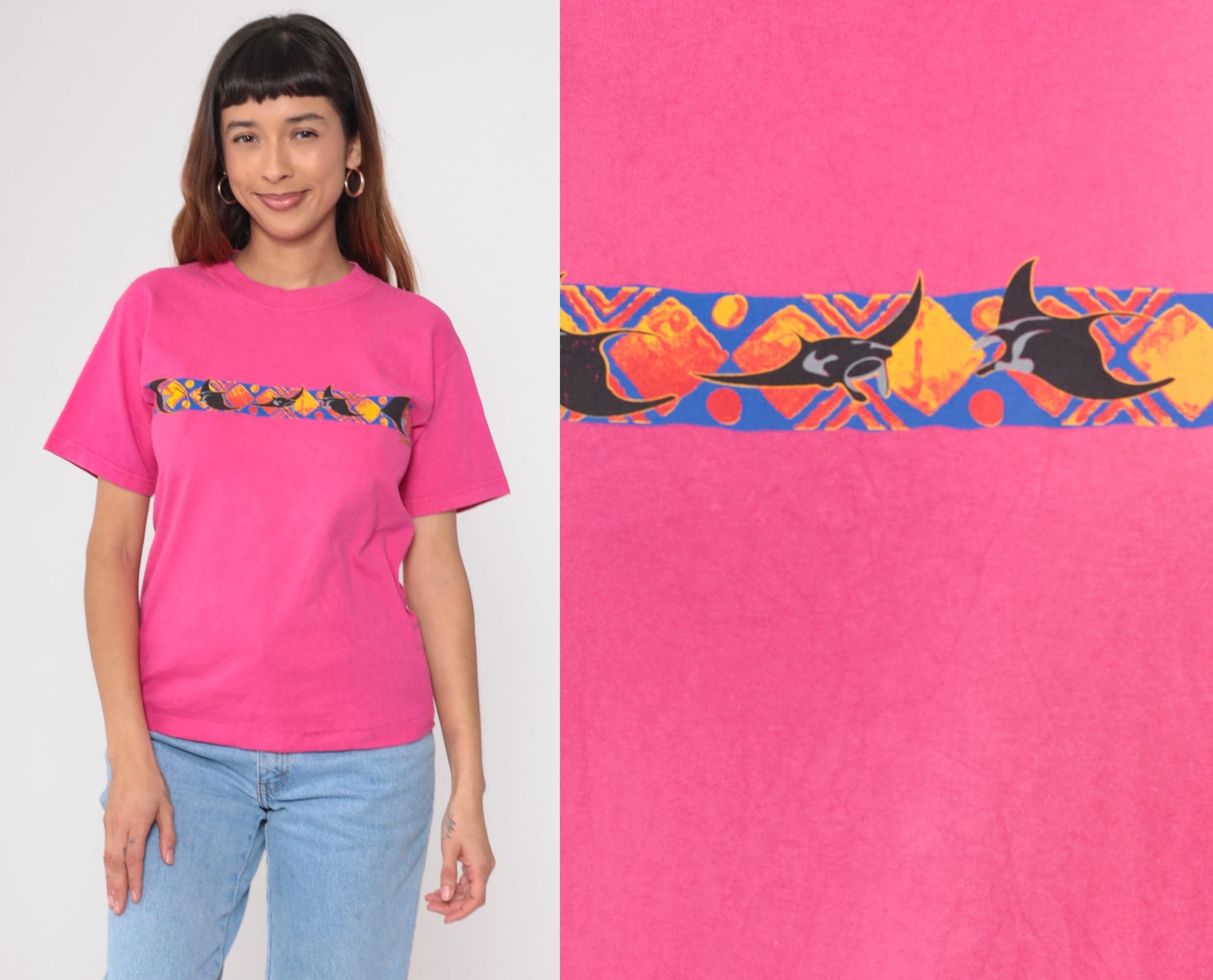 intage 90s Gildan t-shirt in hot pink with manta ray graphic stripe. Features colorful geometric pattern with black sea creatures on blue background. Short sleeves with crew neck.