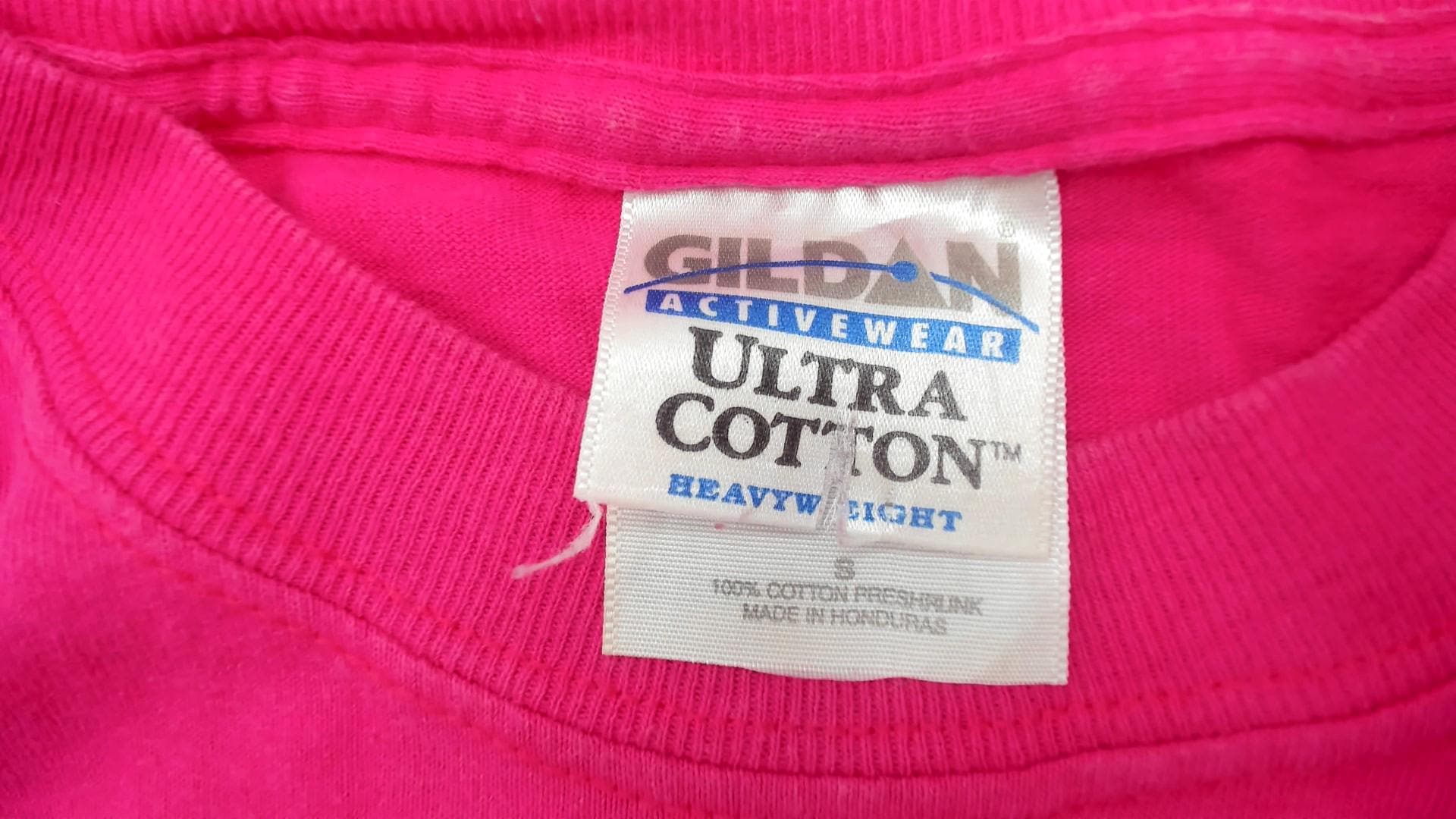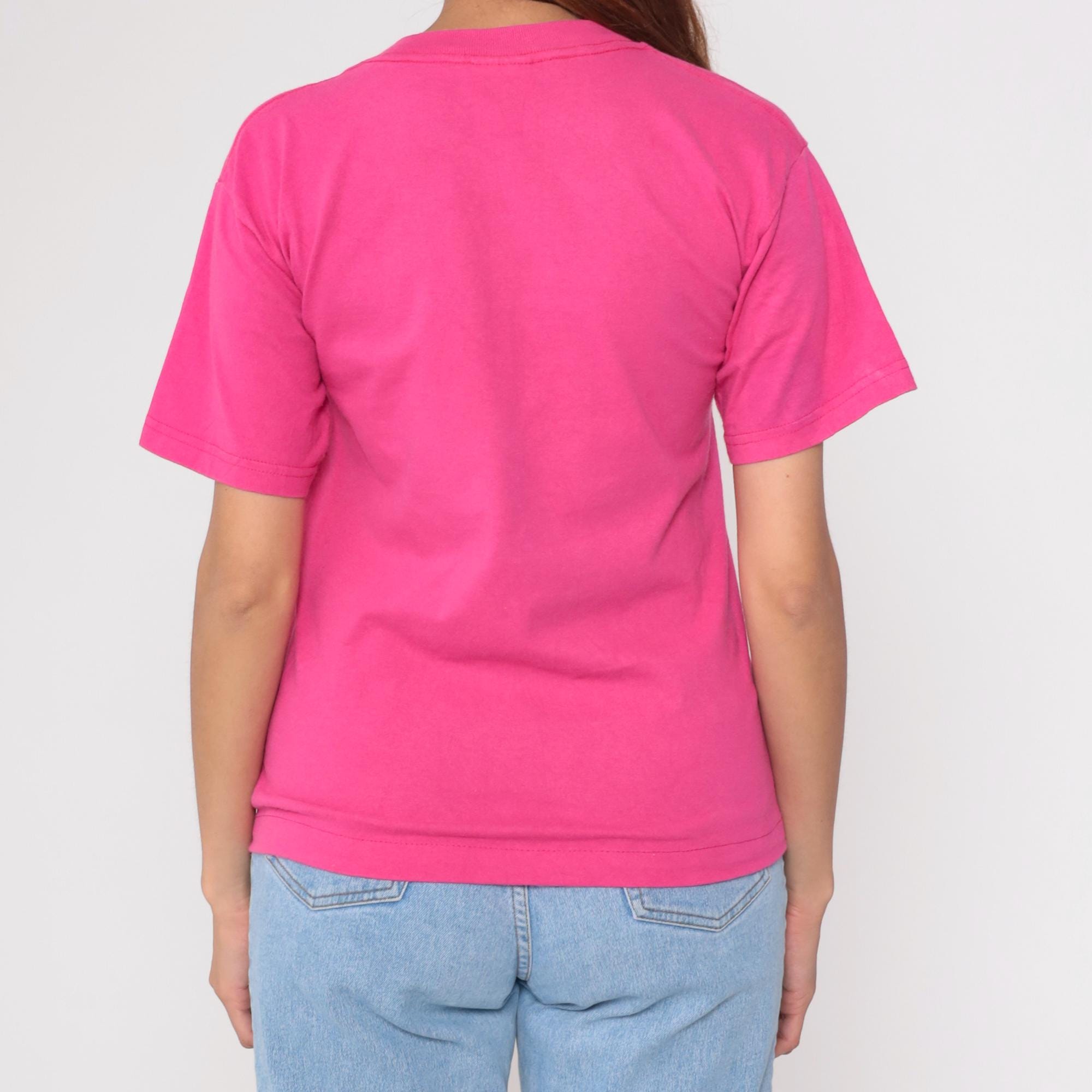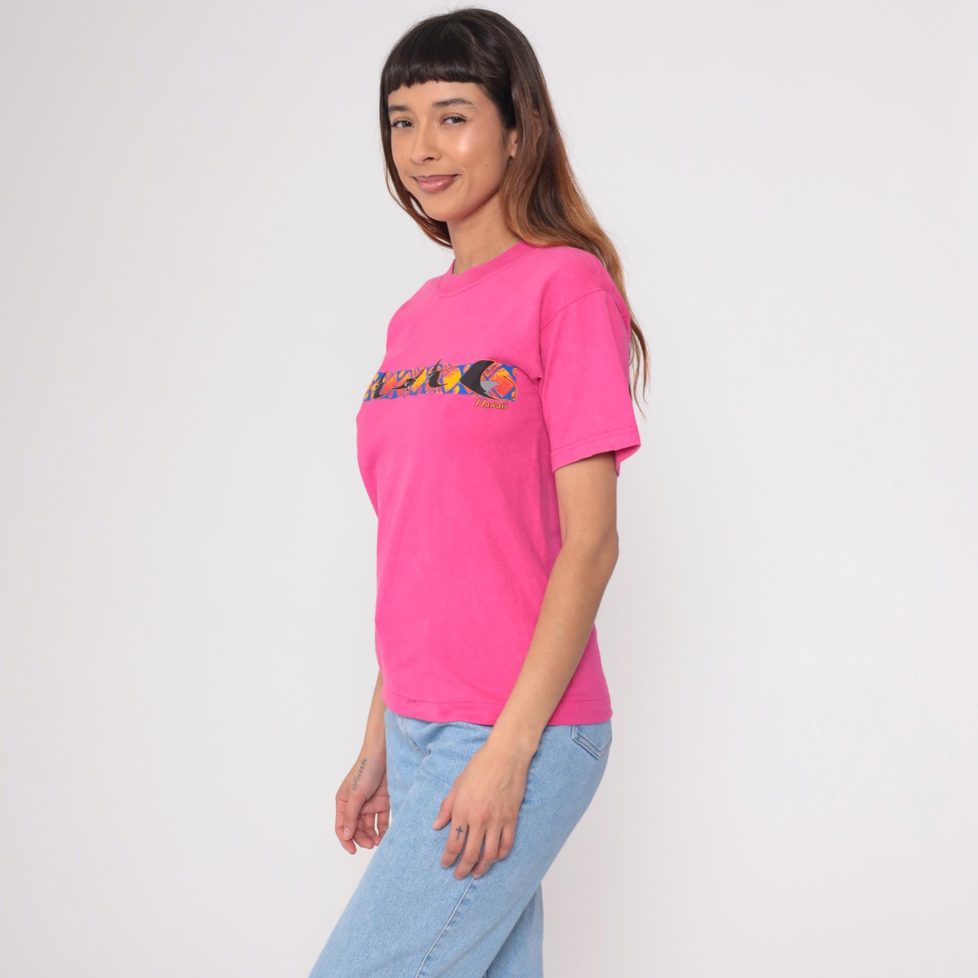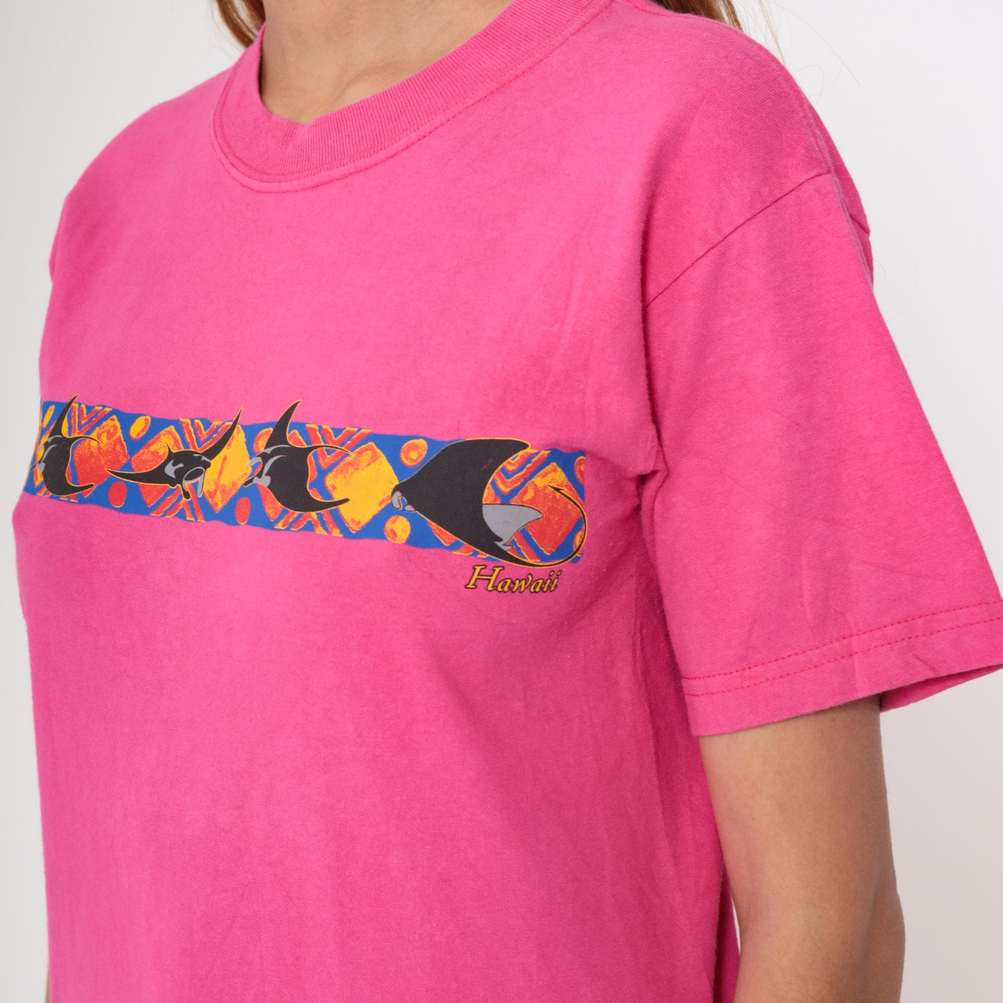 intage 90s Gildan t-shirt in hot pink with manta ray graphic stripe. Features colorful geometric pattern with black sea creatures on blue background. Short sleeves with crew neck.
