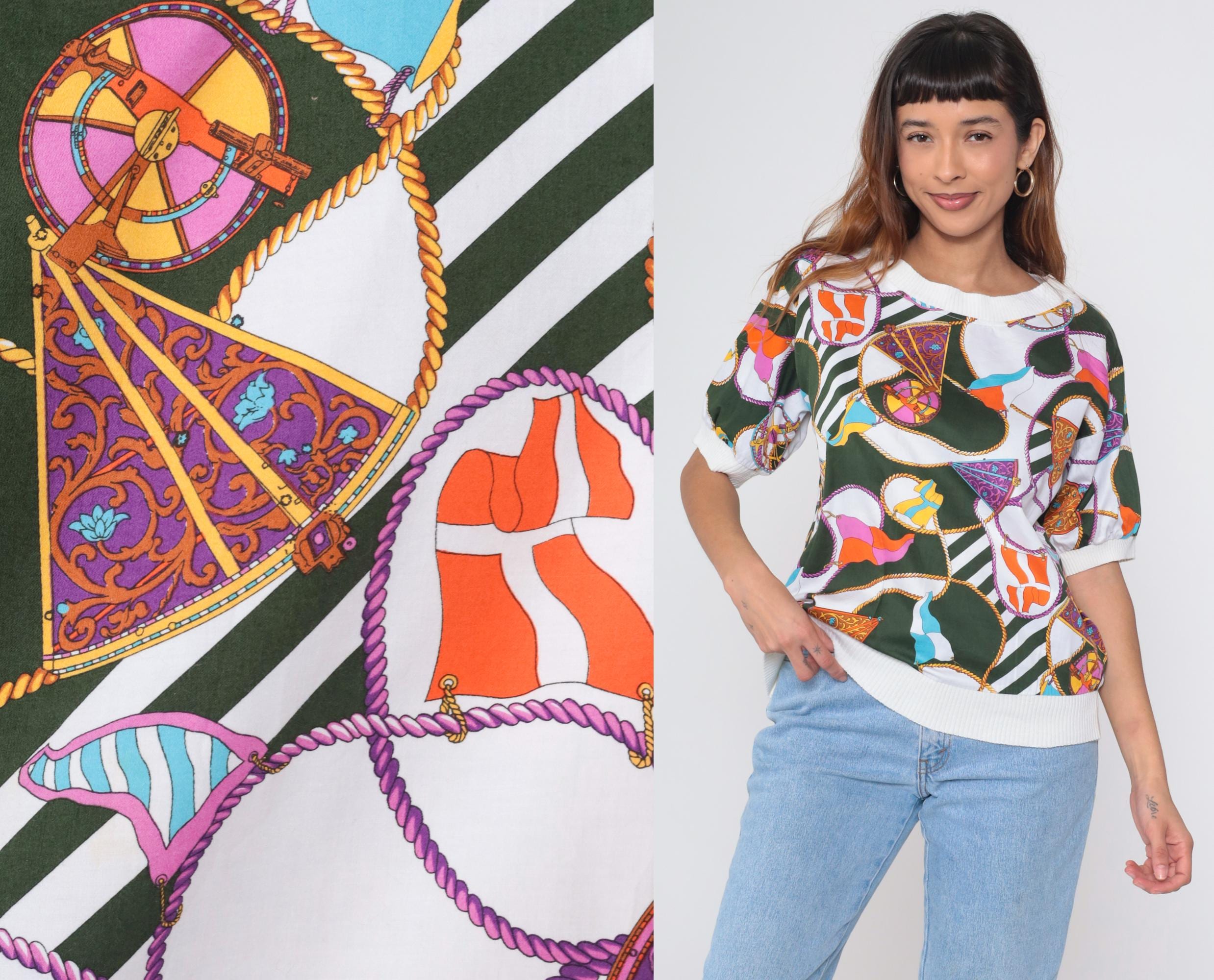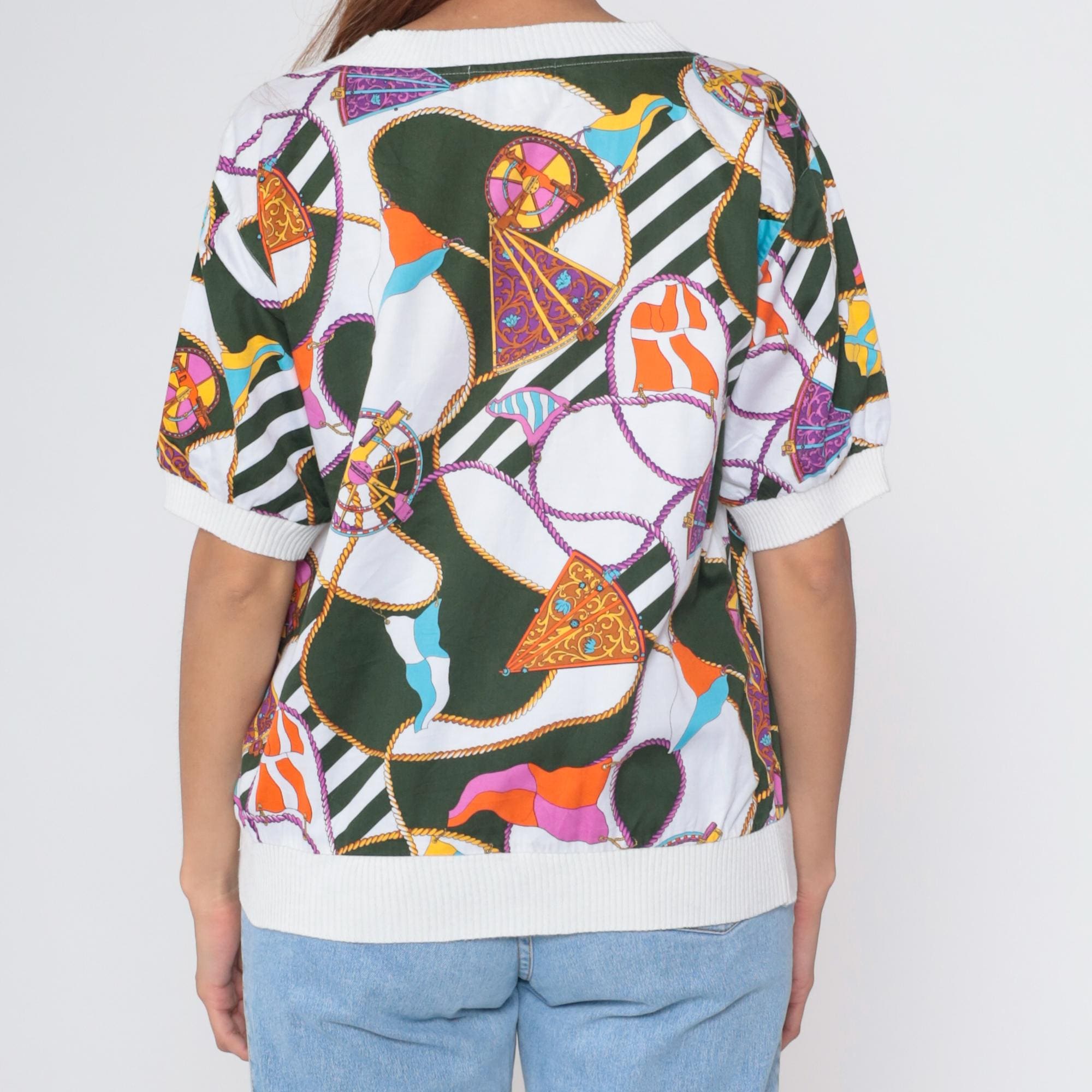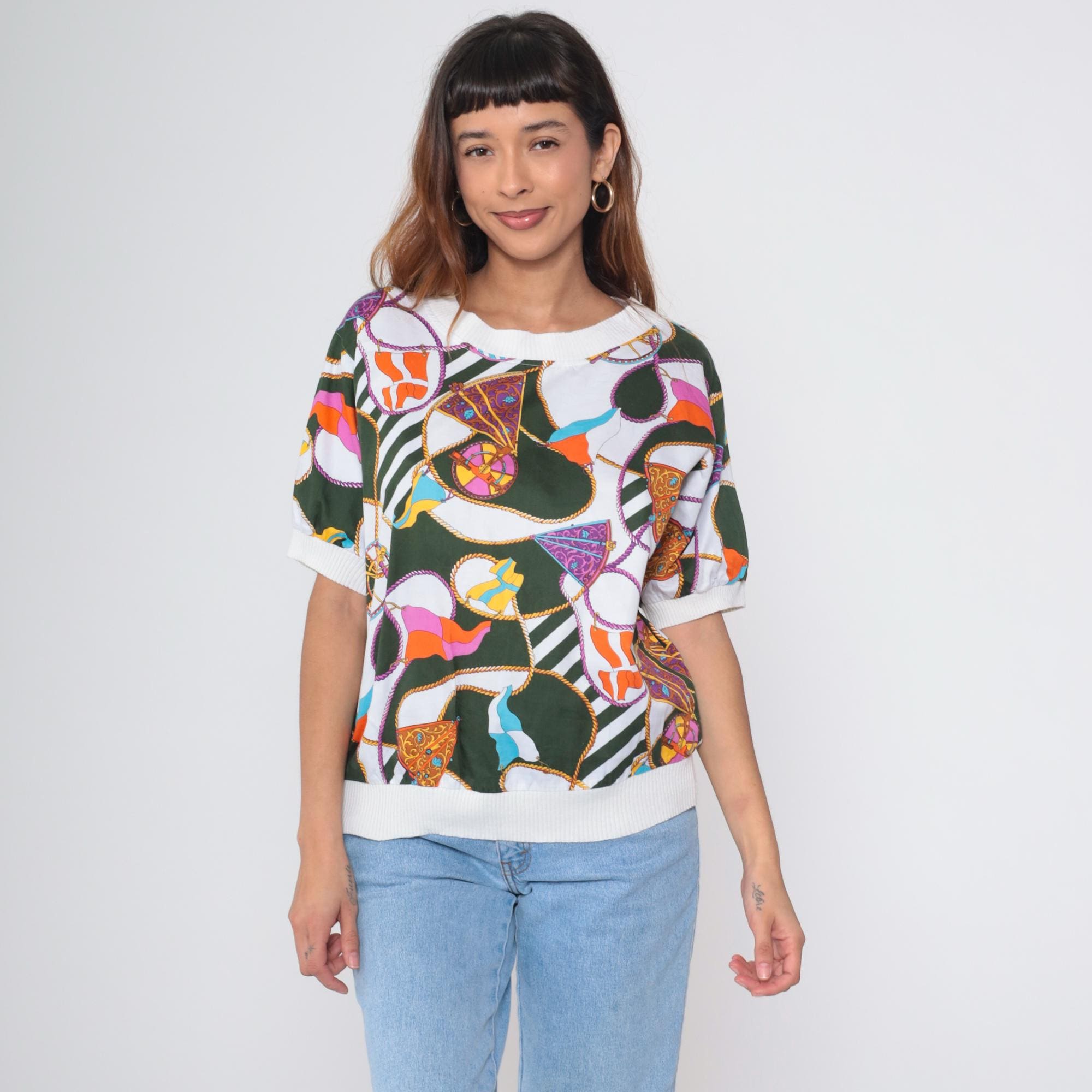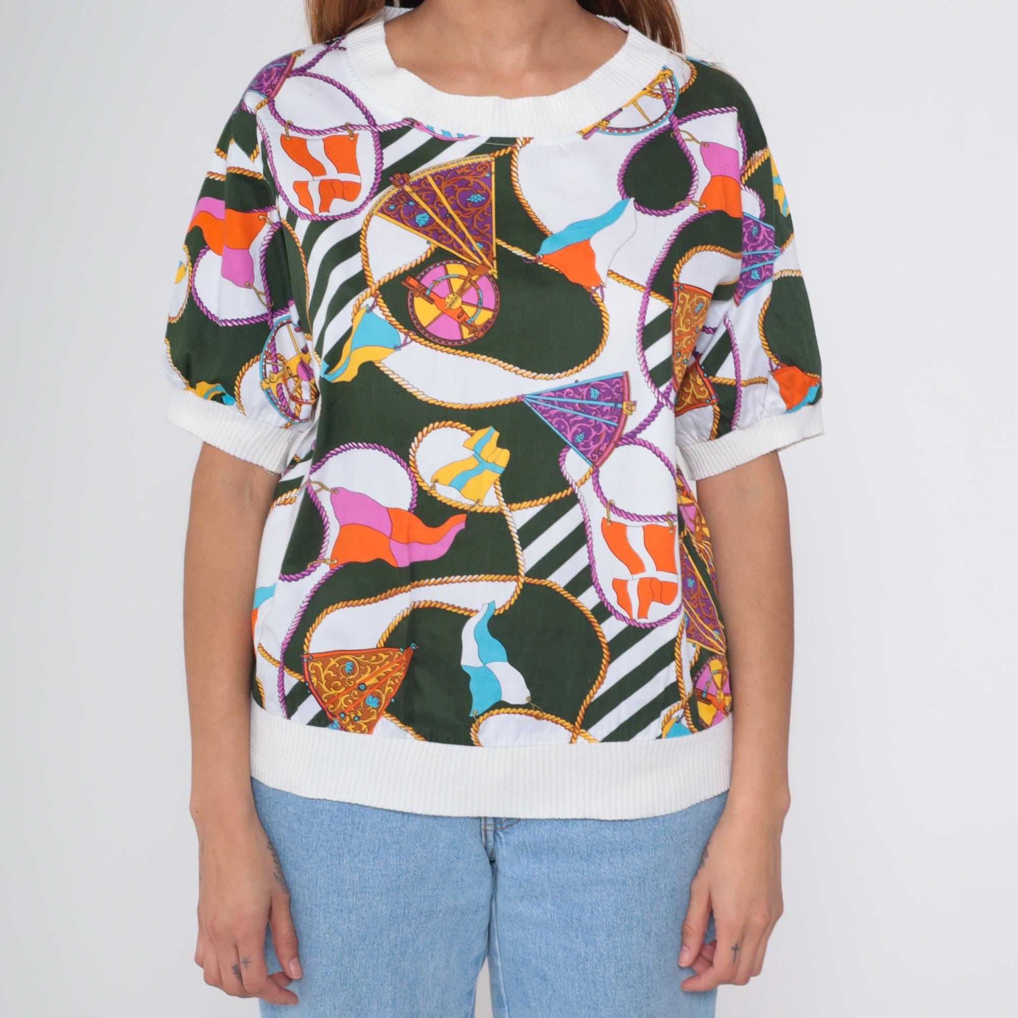 Vintage 90s Boutique J&J short sleeve shirt with colorful nautical scarf print. Features boat flags, wheel, and rope details in green, orange, purple, blue and white. White ribbed crew neck, cuffs, and hem.