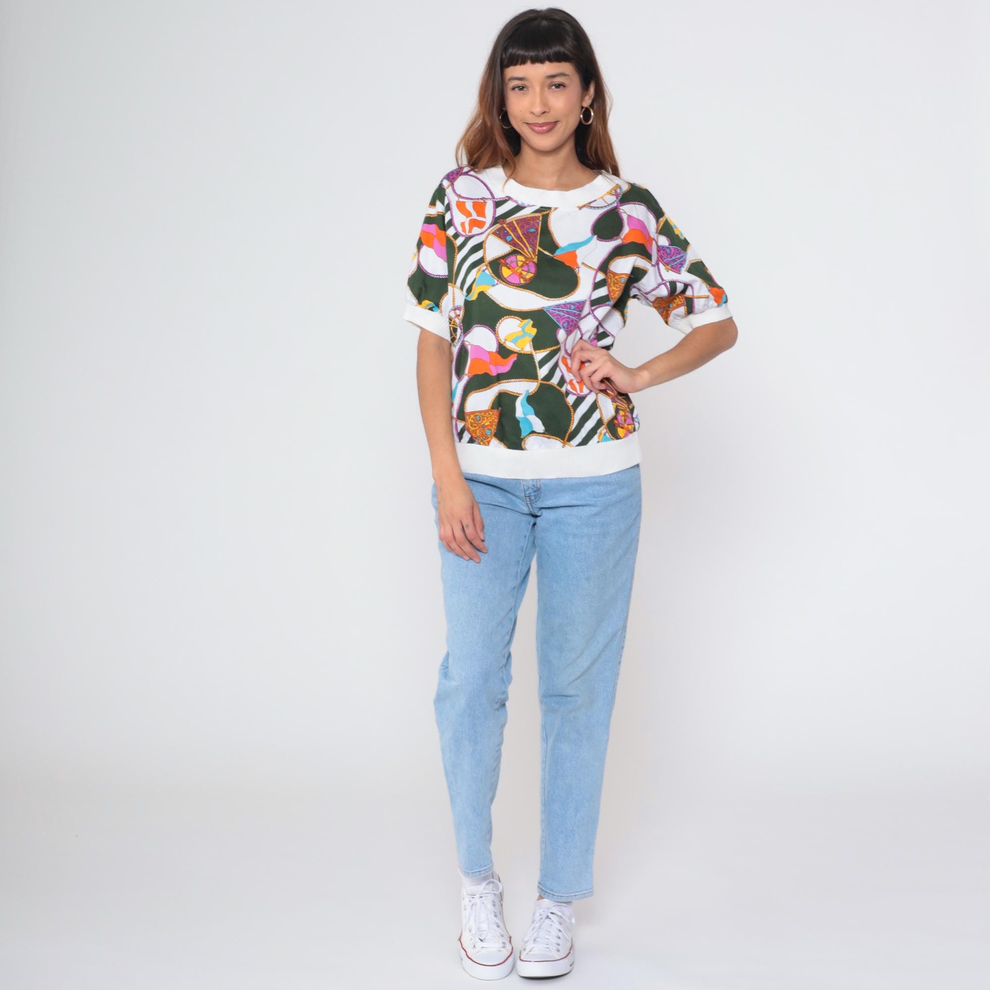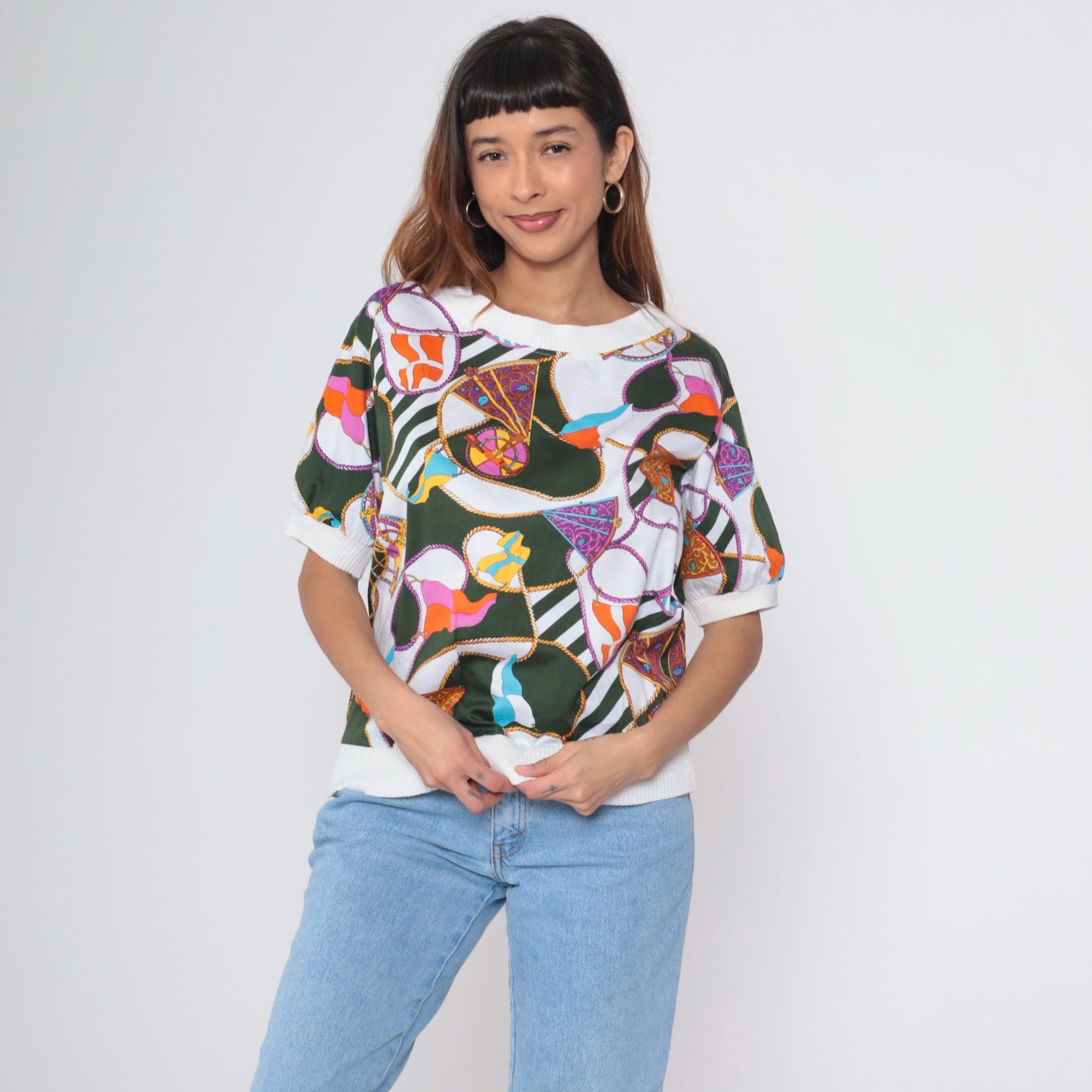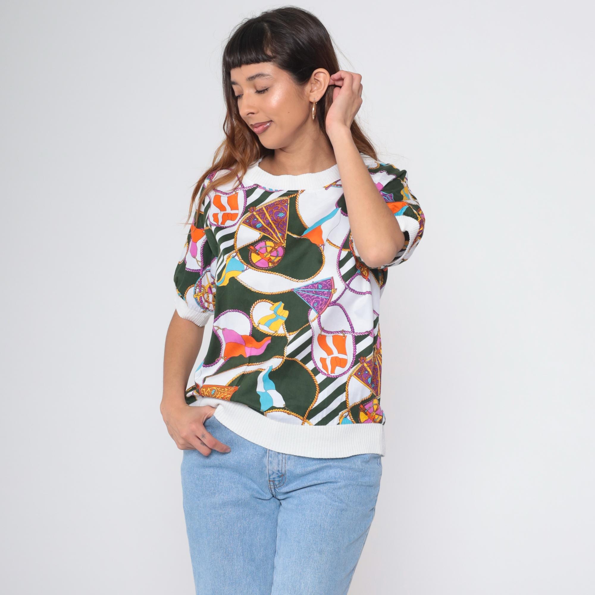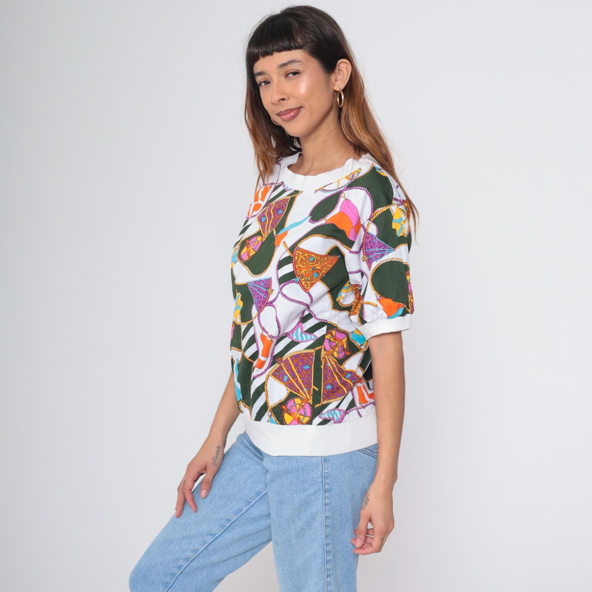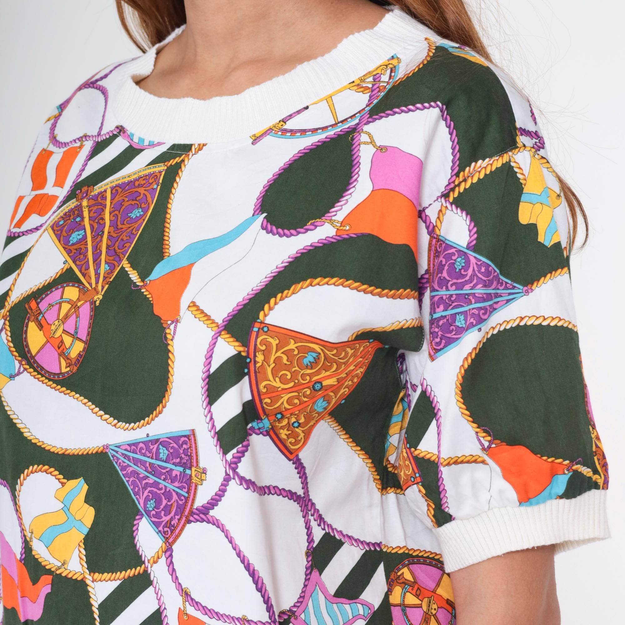 Vintage 90s Boutique J&J short sleeve shirt with colorful nautical scarf print. Features boat flags, wheel, and rope details in green, orange, purple, blue and white. White ribbed crew neck, cuffs, and hem.