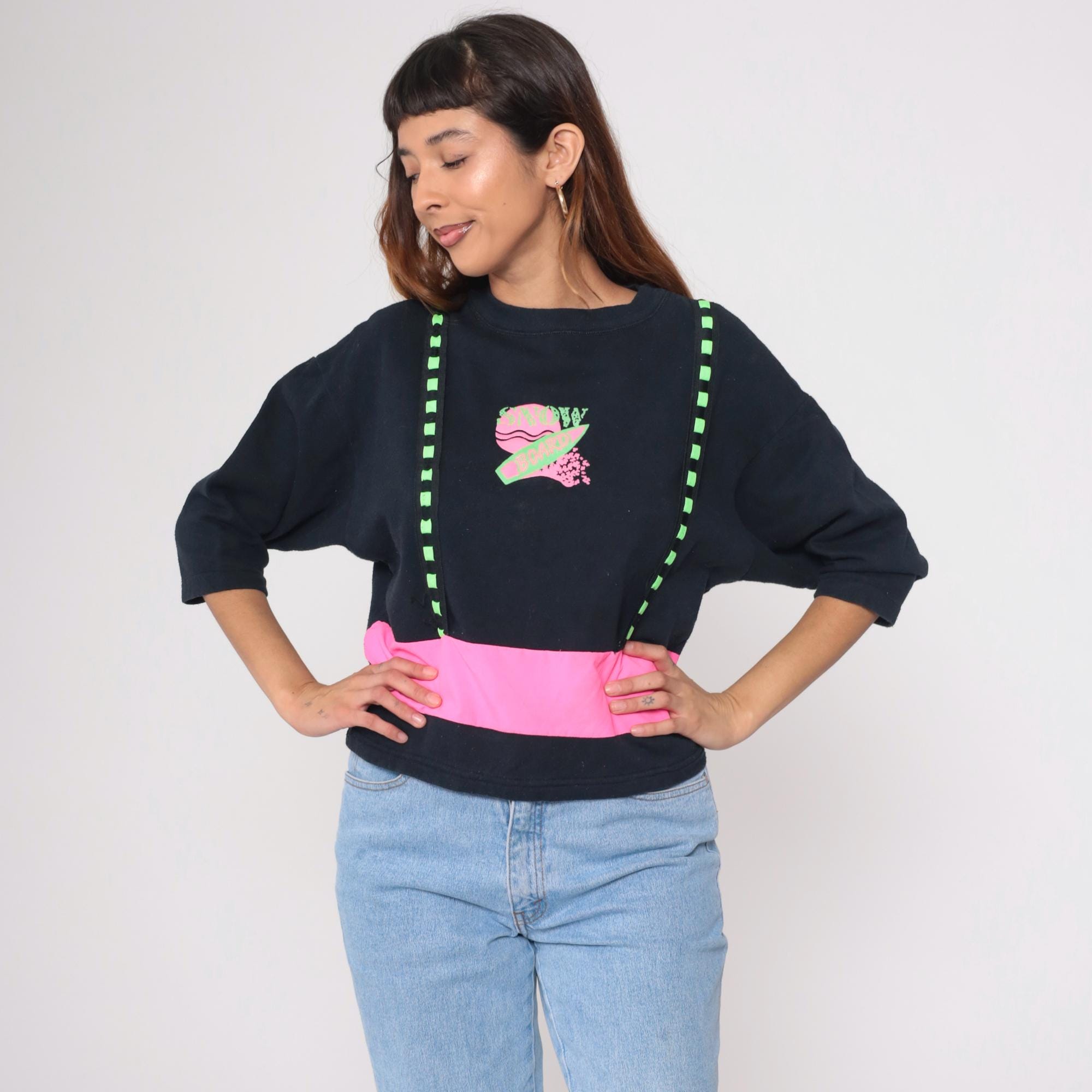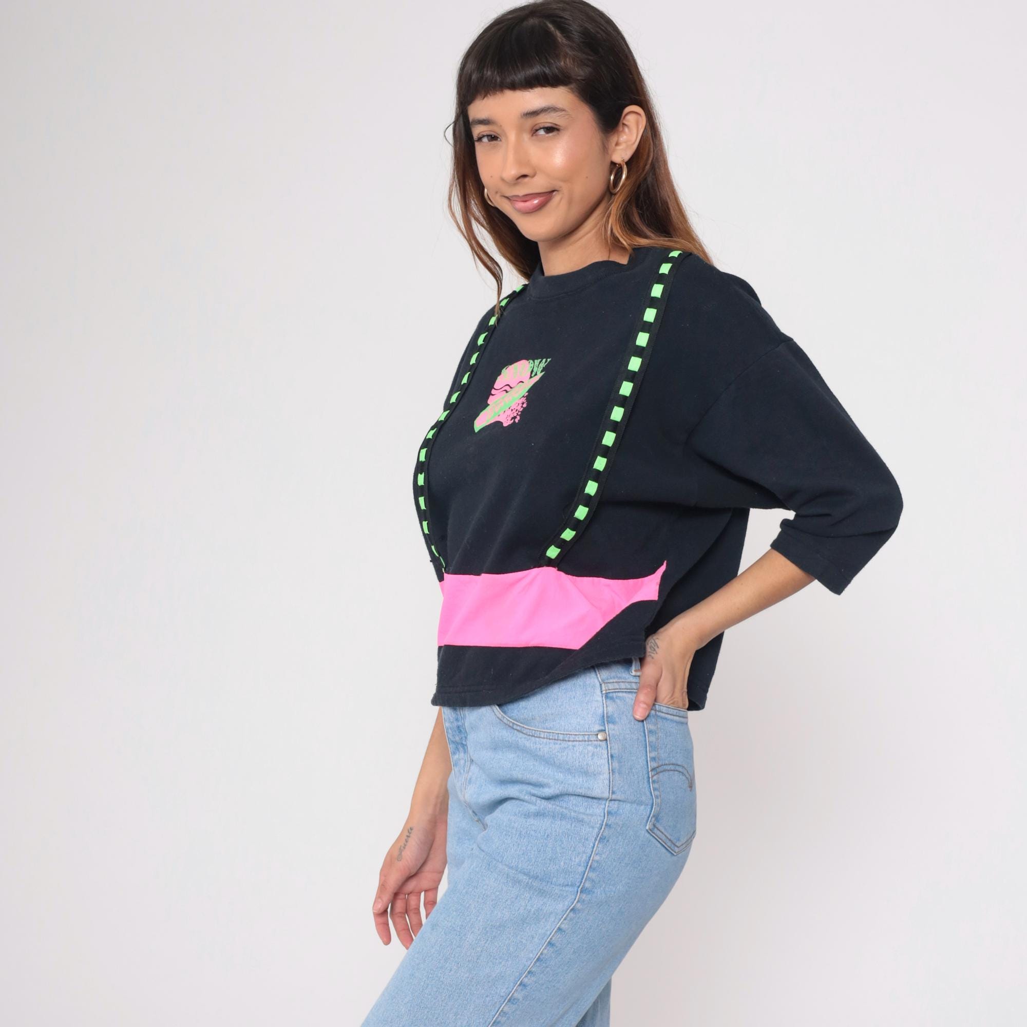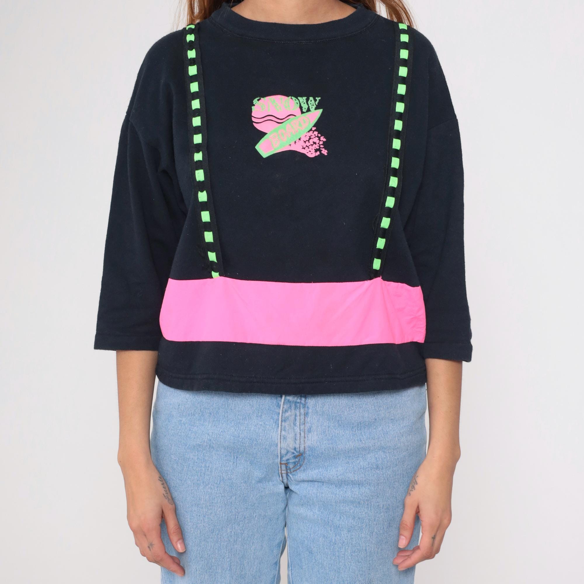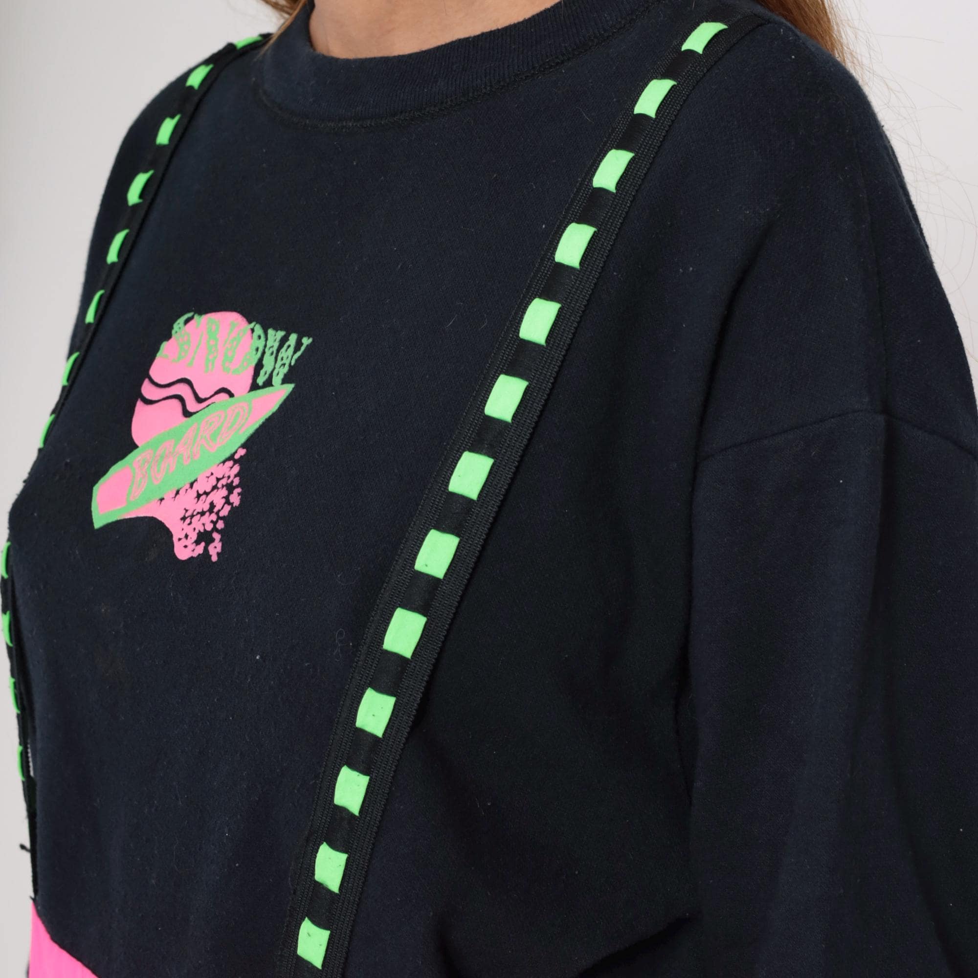 Vintage 90s Obvious black cropped sweatshirt with neon pink and green snow board graphic. Features pink band across bottom with green checkered suspender detail. 3/4 length sleeves and crew neckline.