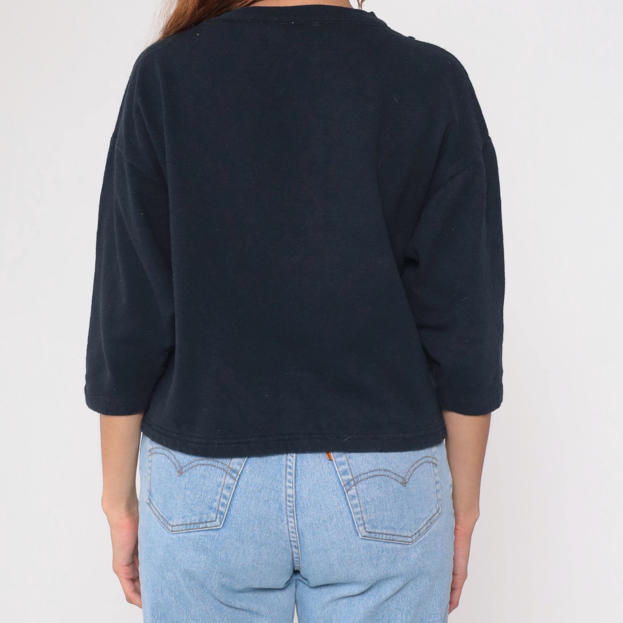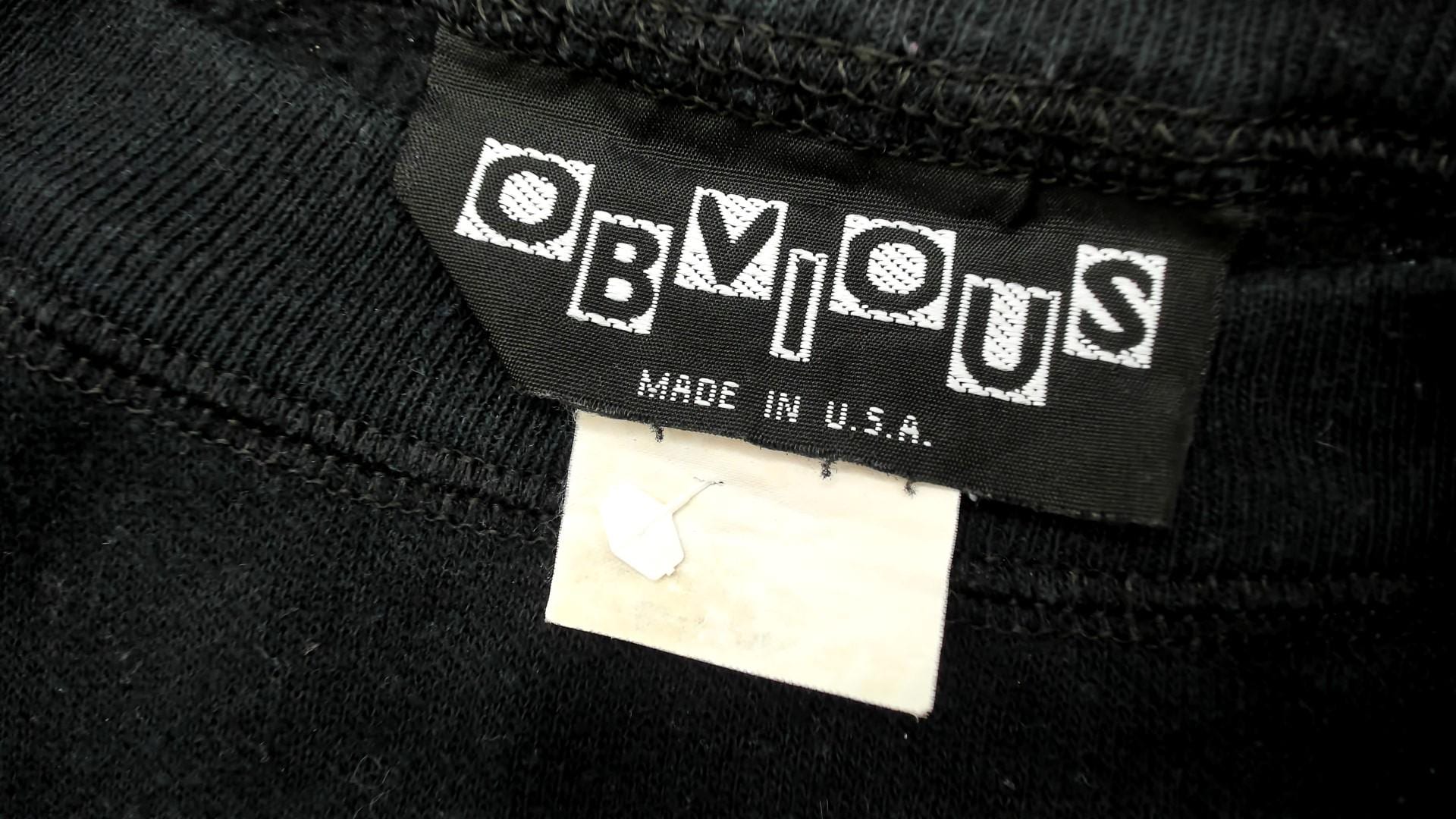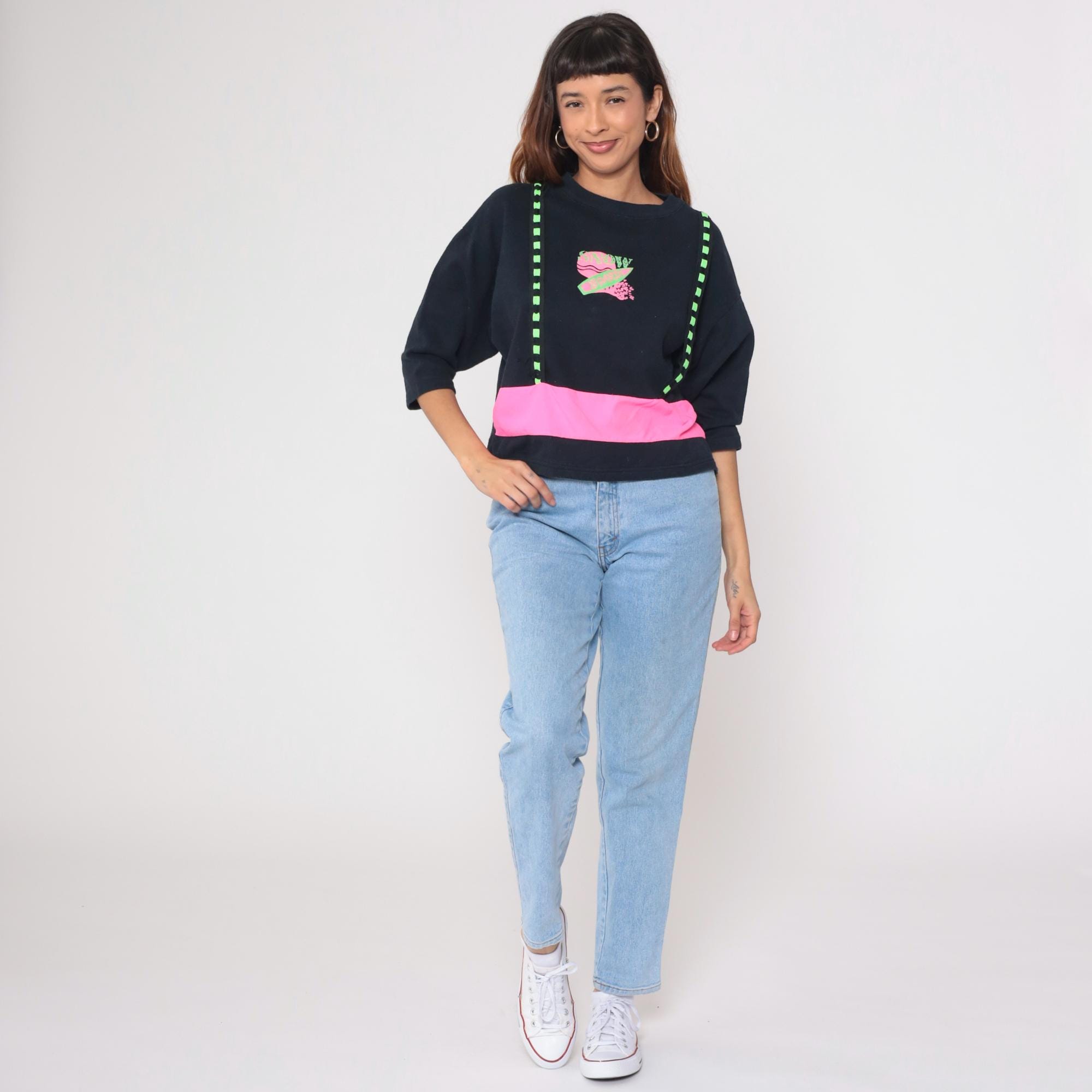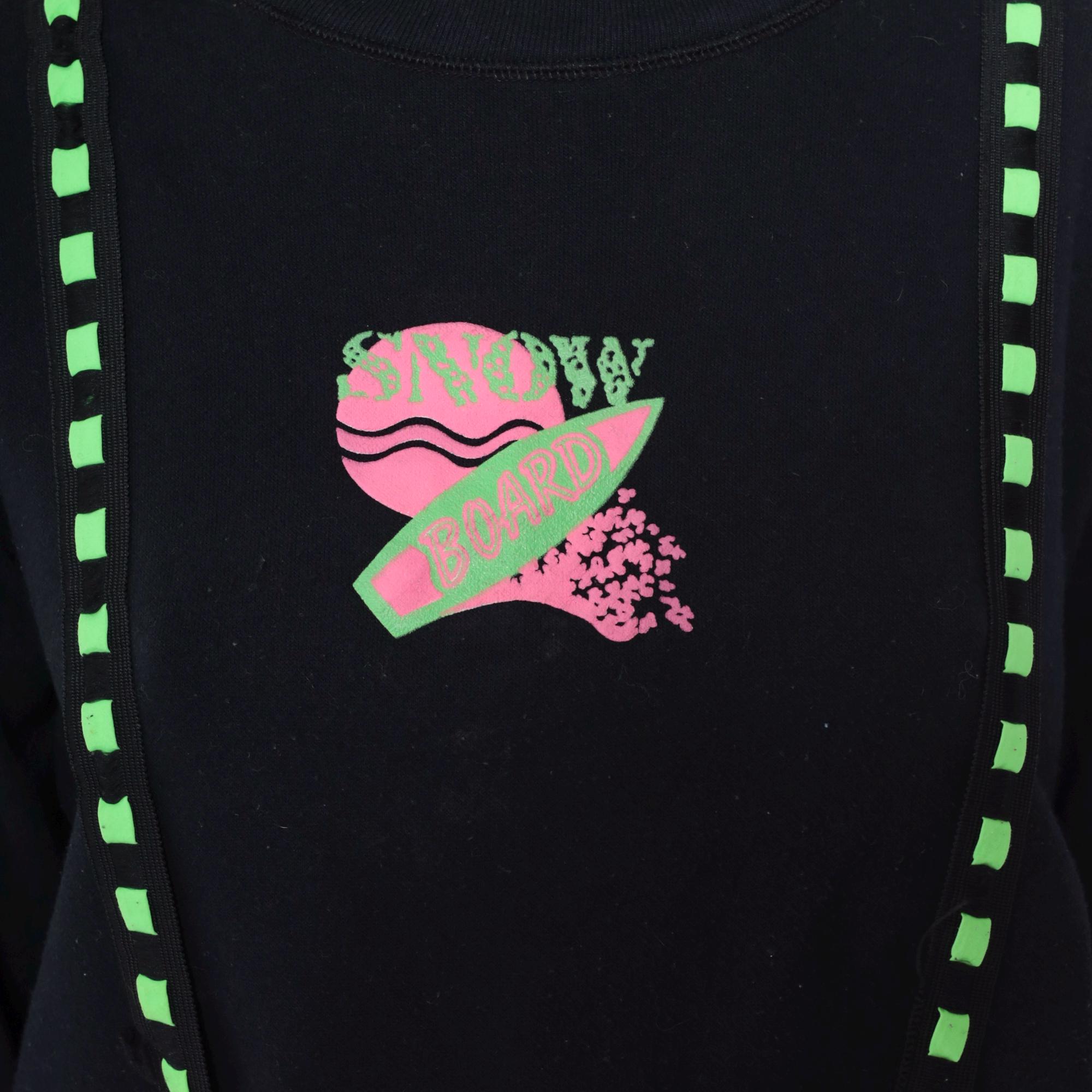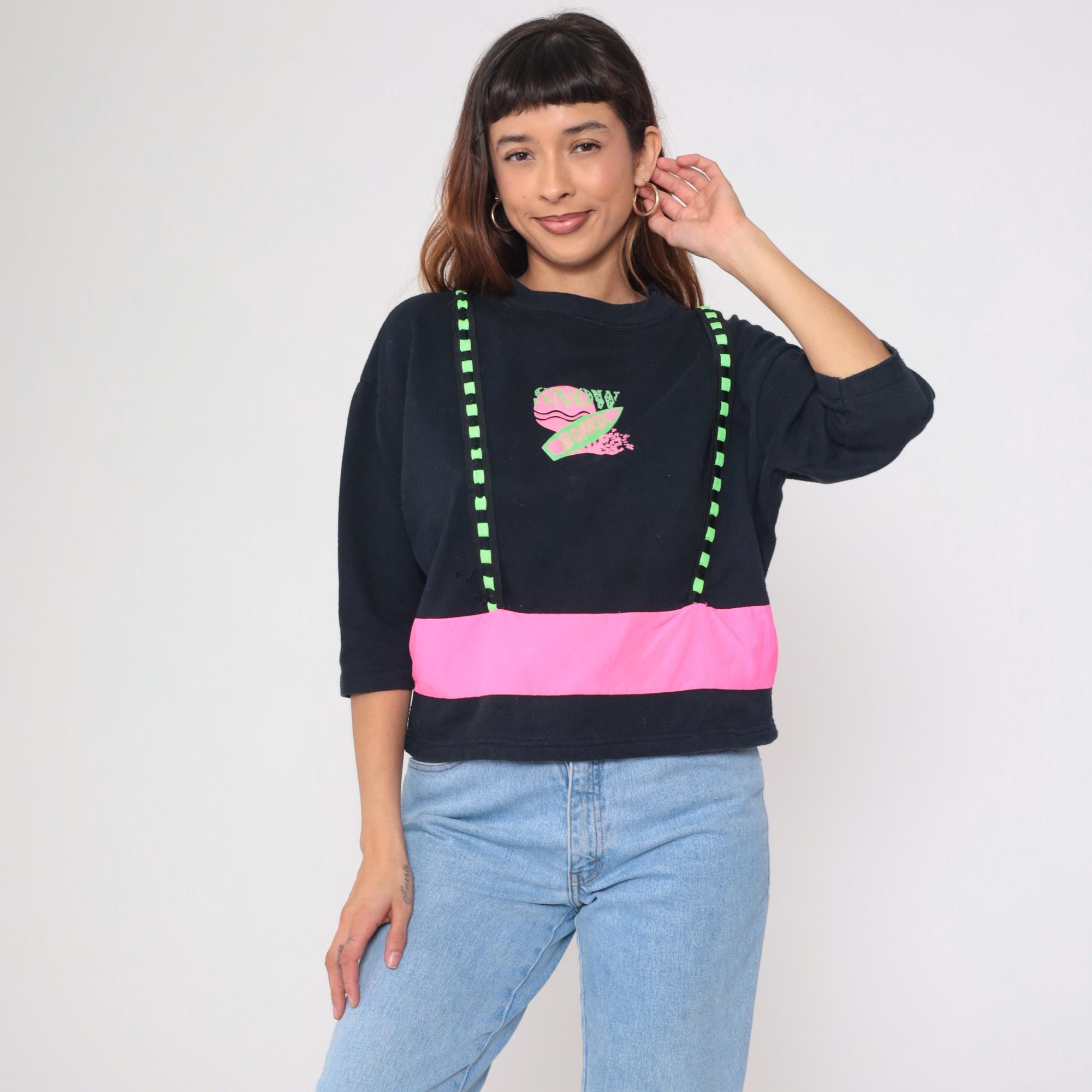 Vintage 90s Obvious black cropped sweatshirt with neon pink and green snow board graphic. Features pink band across bottom with green checkered suspender detail. 3/4 length sleeves and crew neckline.