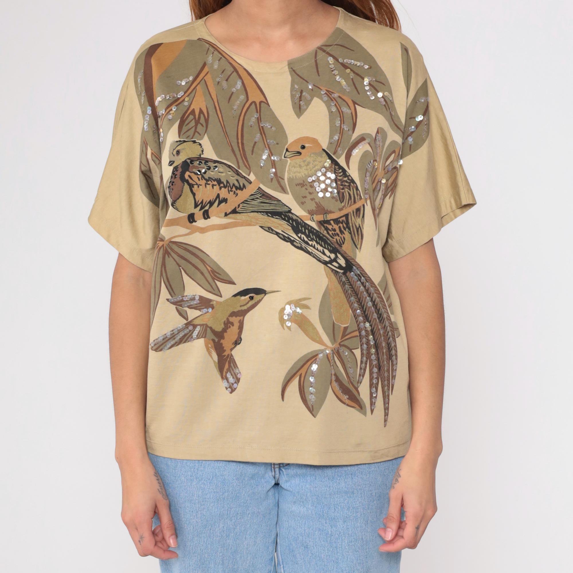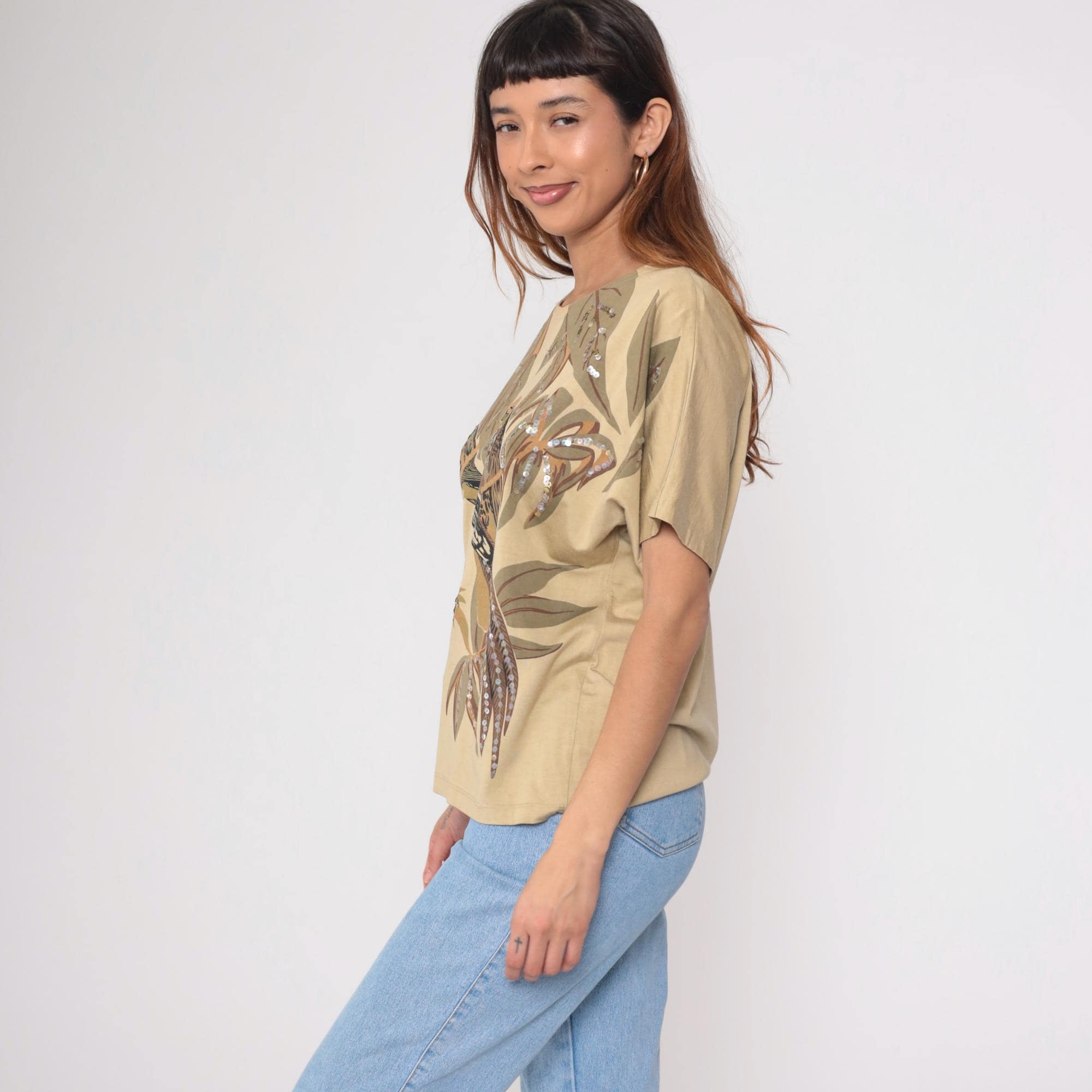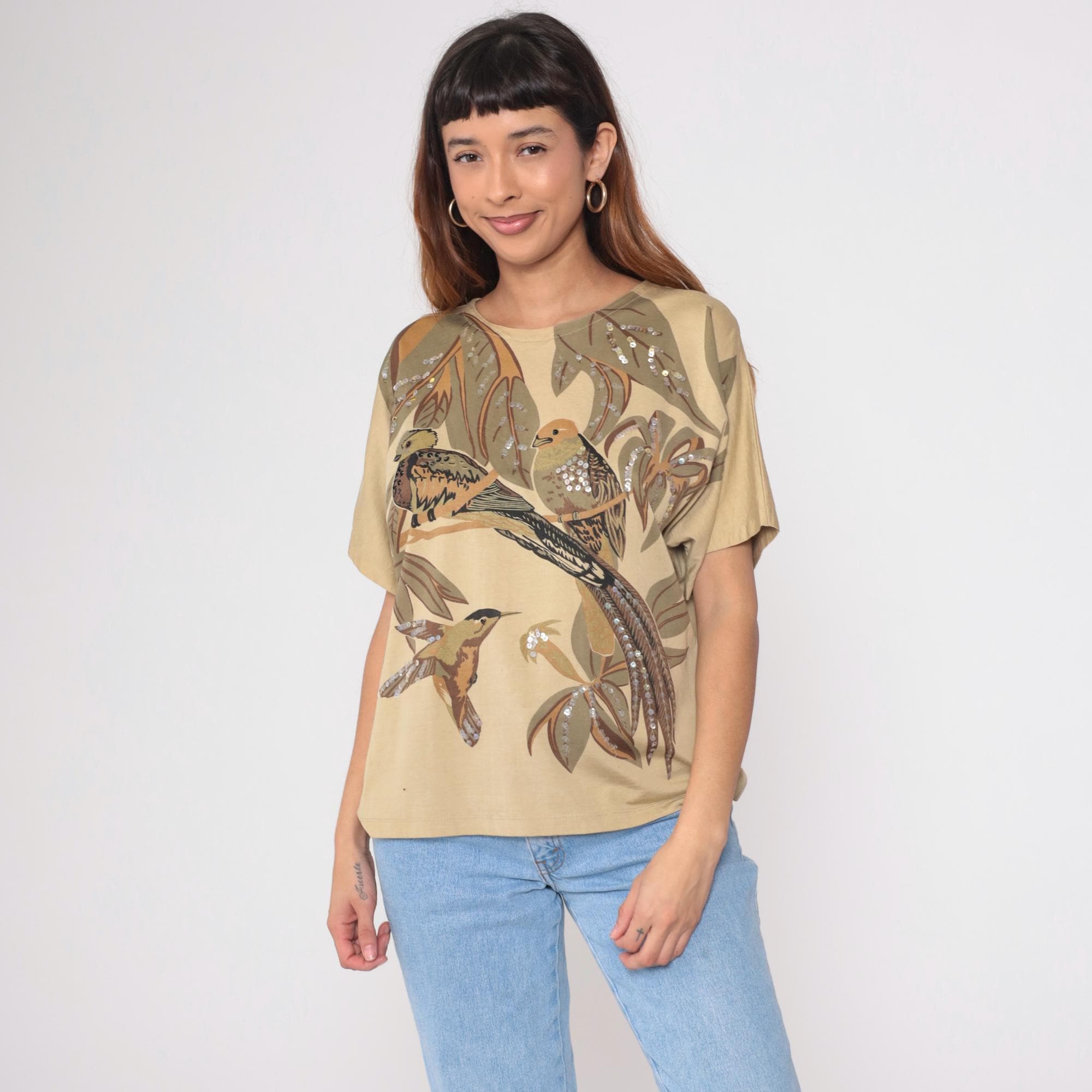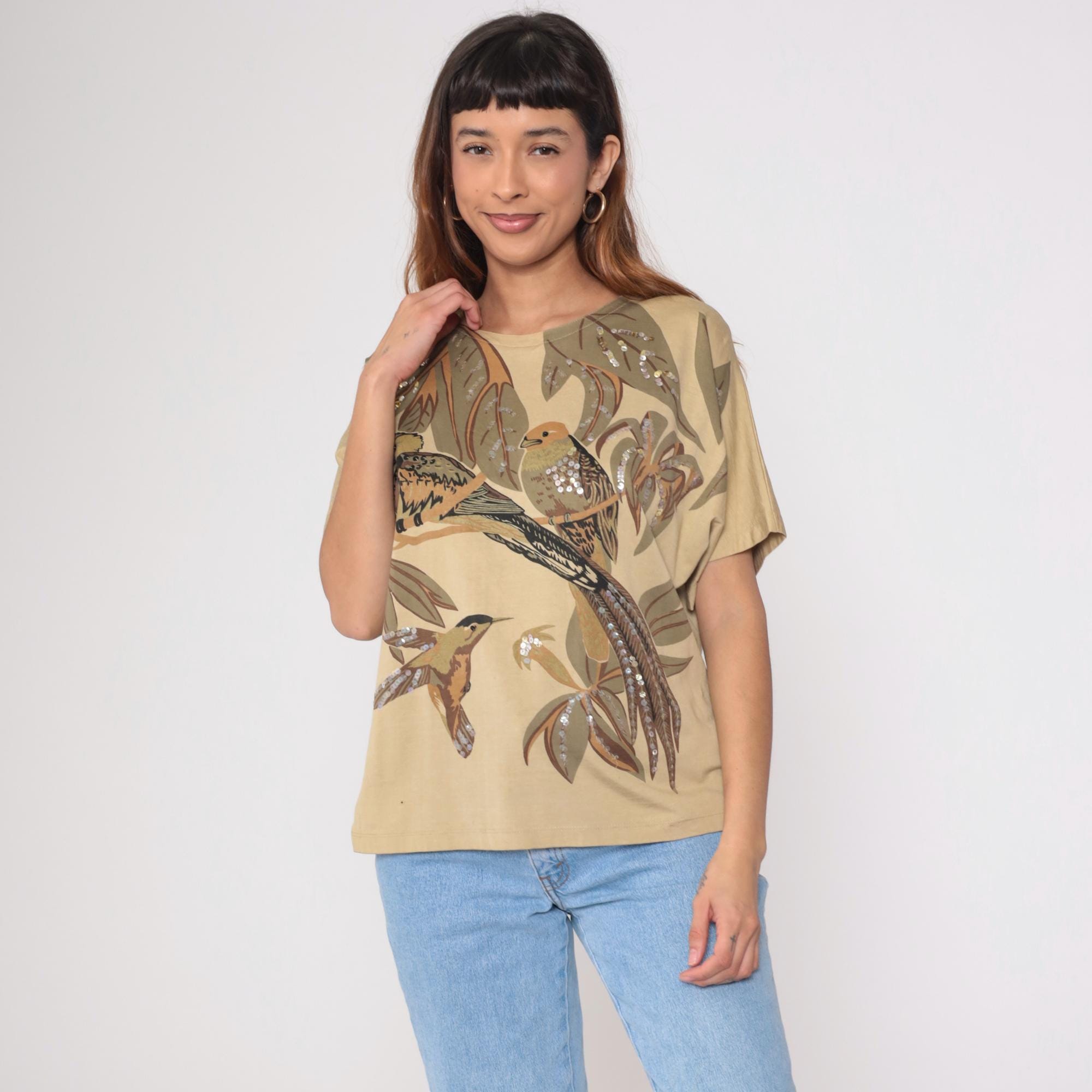 Vintage 90s tan top with exotic bird print featuring sequin and bead embellishments. Short sleeve with boxy cut and crew neck. Olive leaf pattern with tropical foliage design.