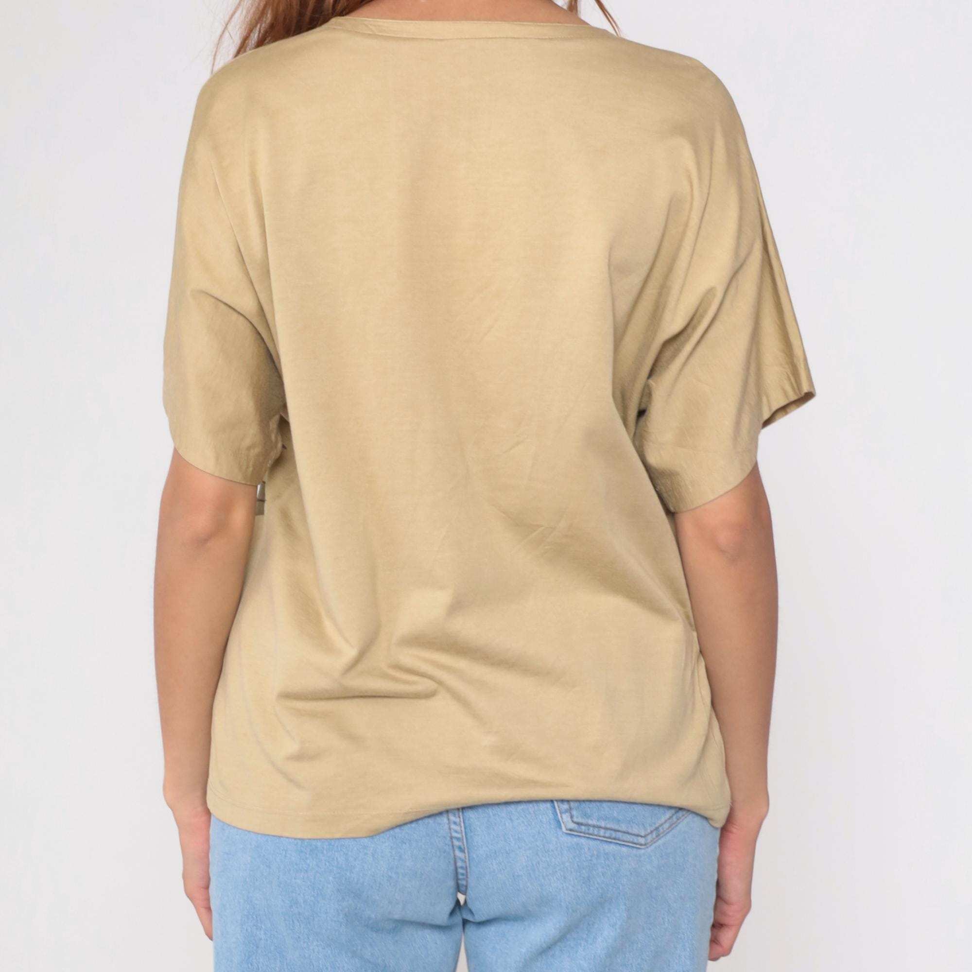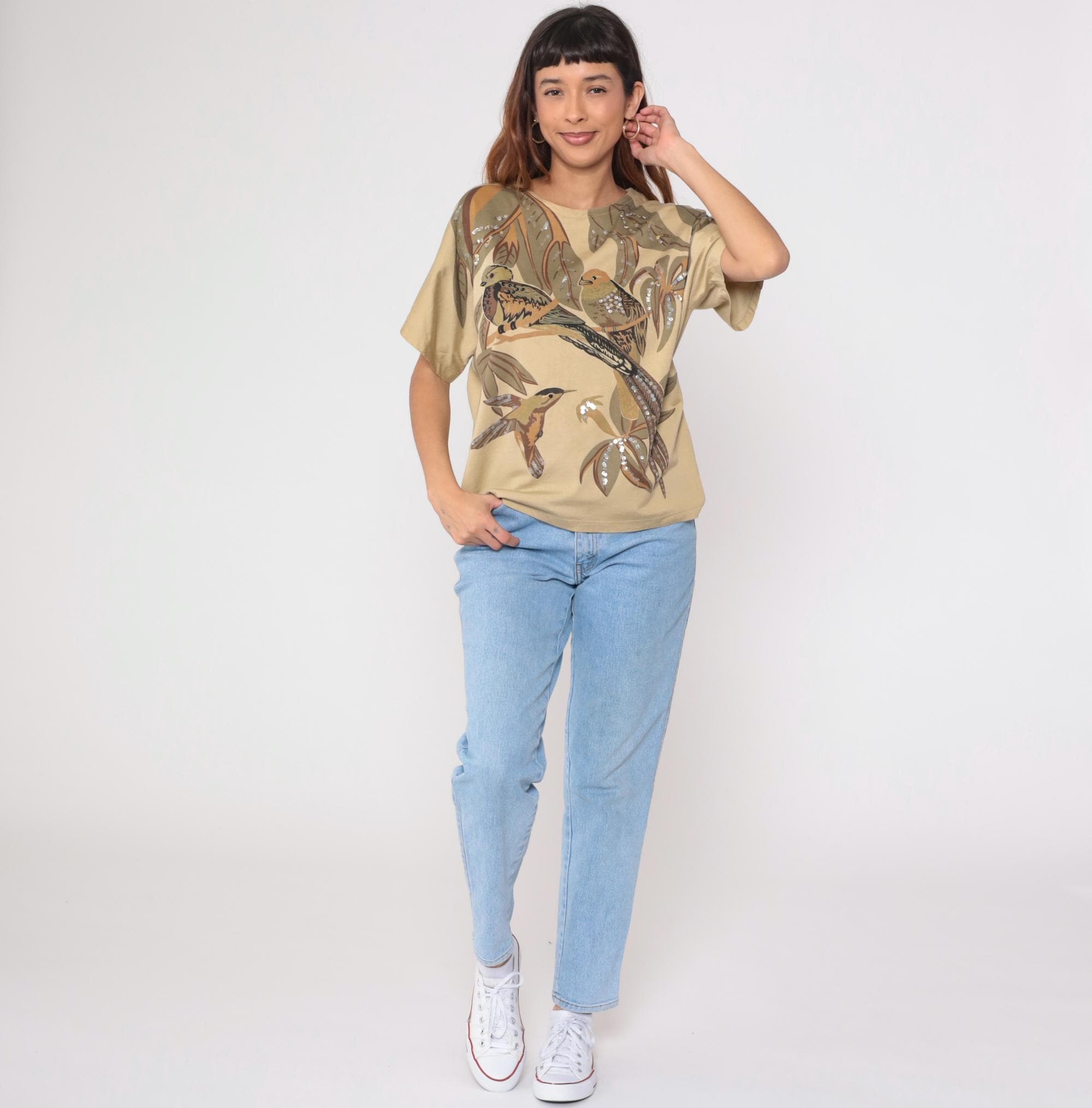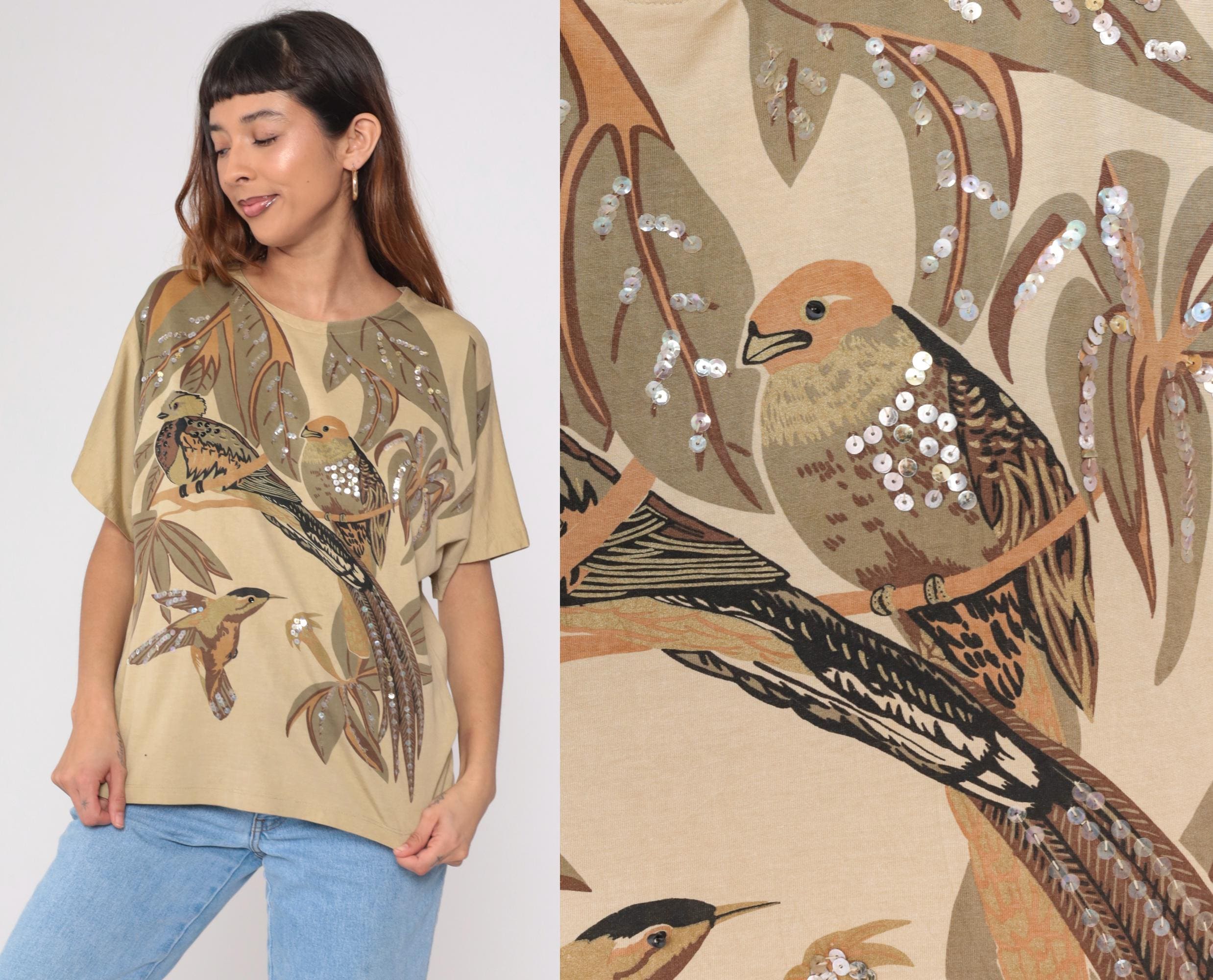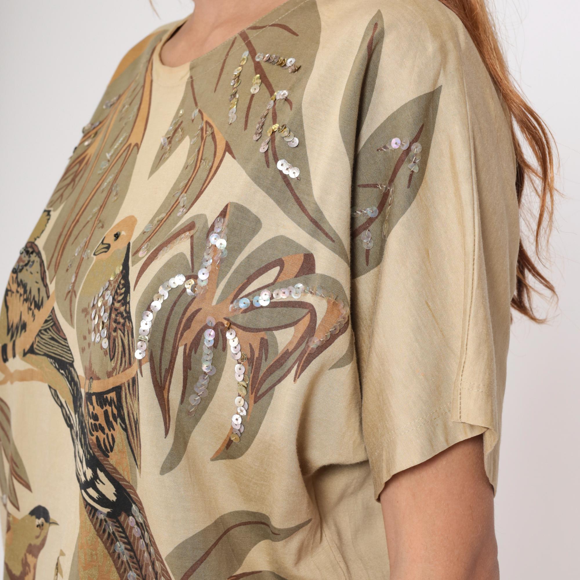 Vintage 90s tan top with exotic bird print featuring sequin and bead embellishments. Short sleeve with boxy cut and crew neck. Olive leaf pattern with tropical foliage design.