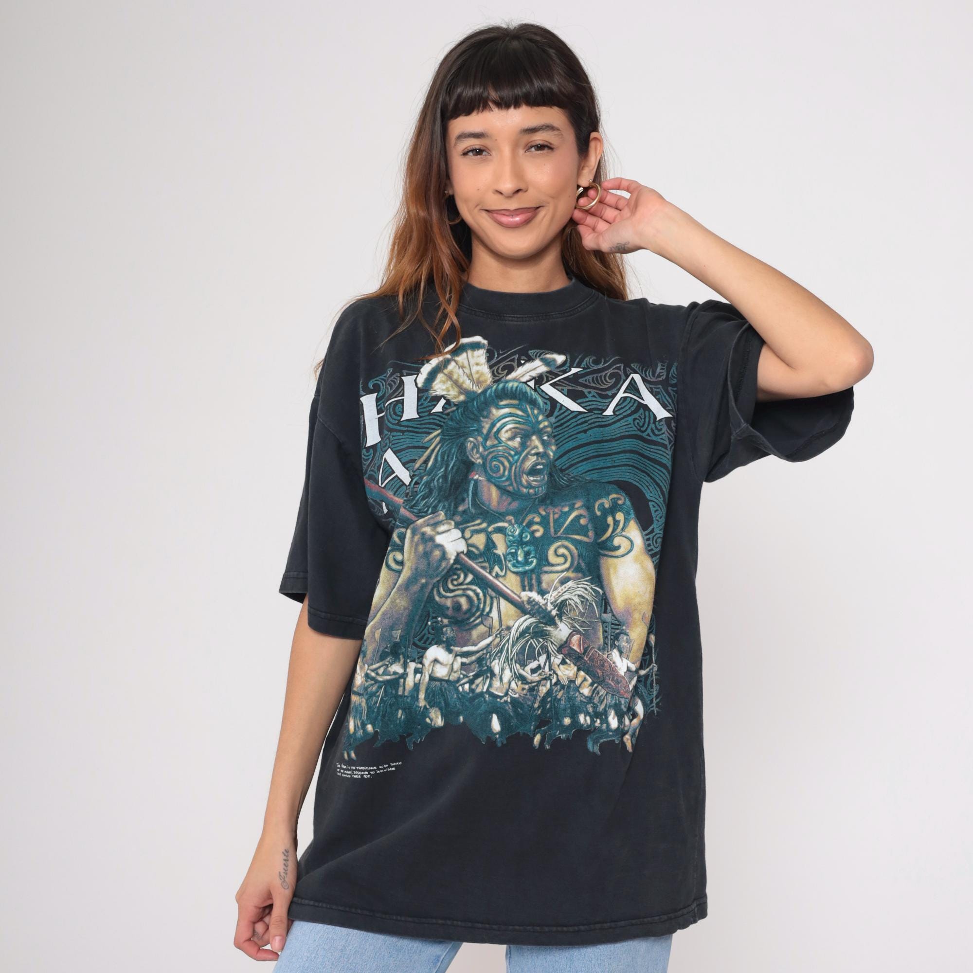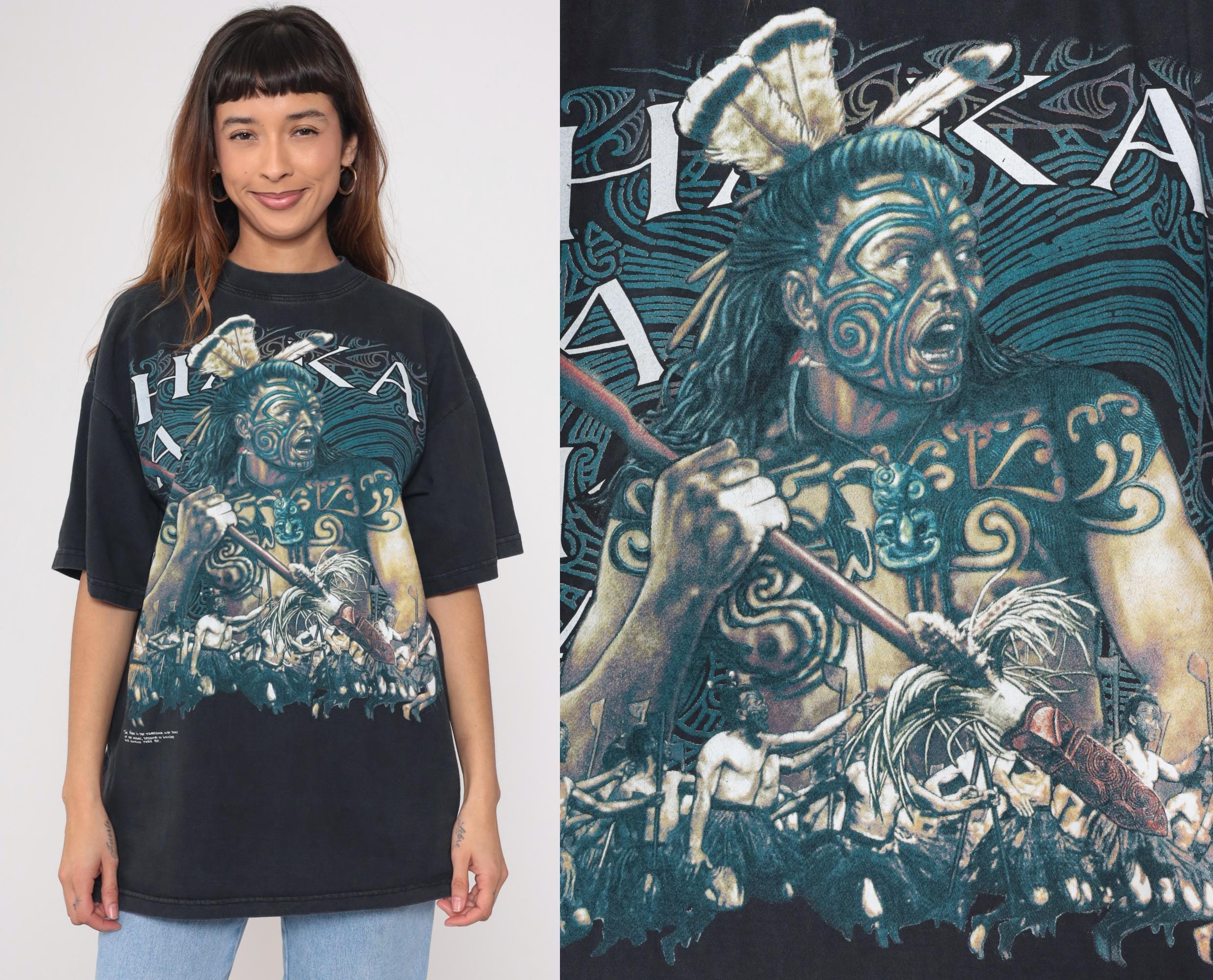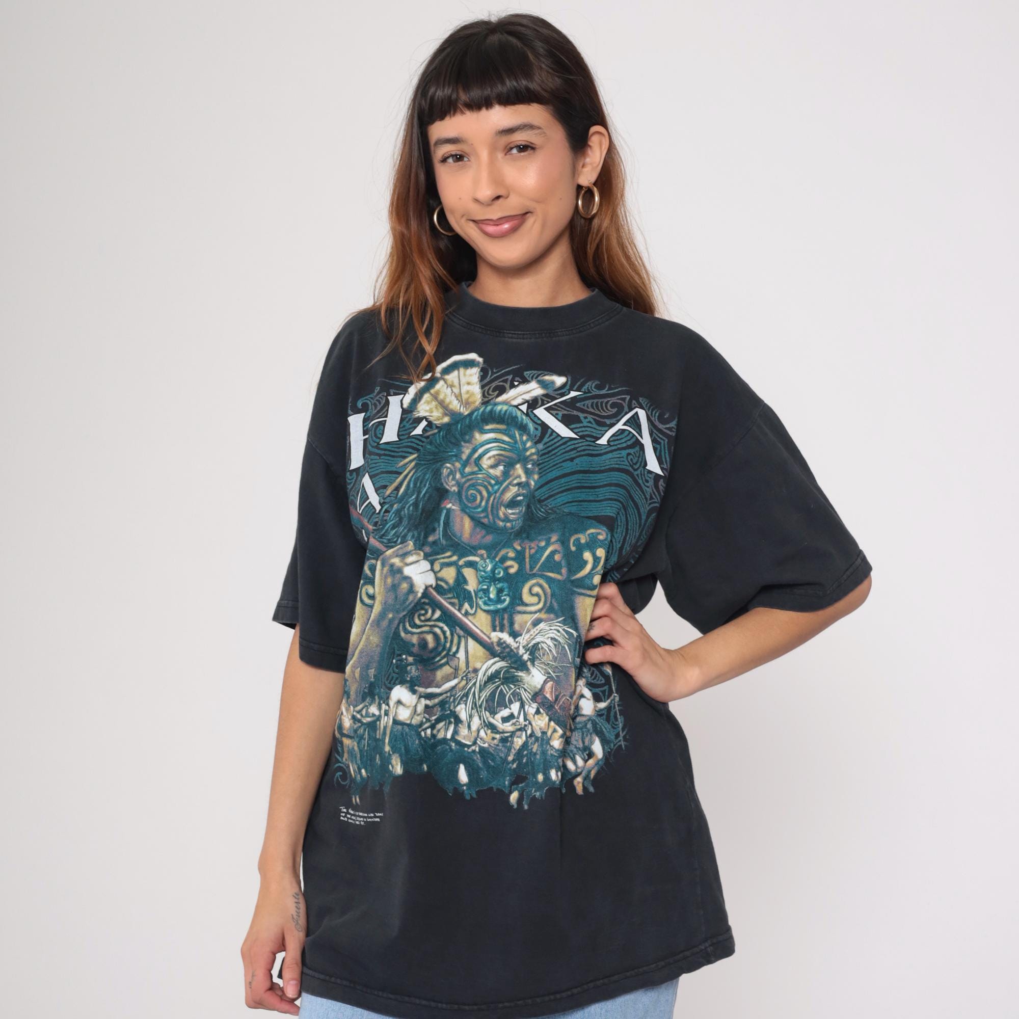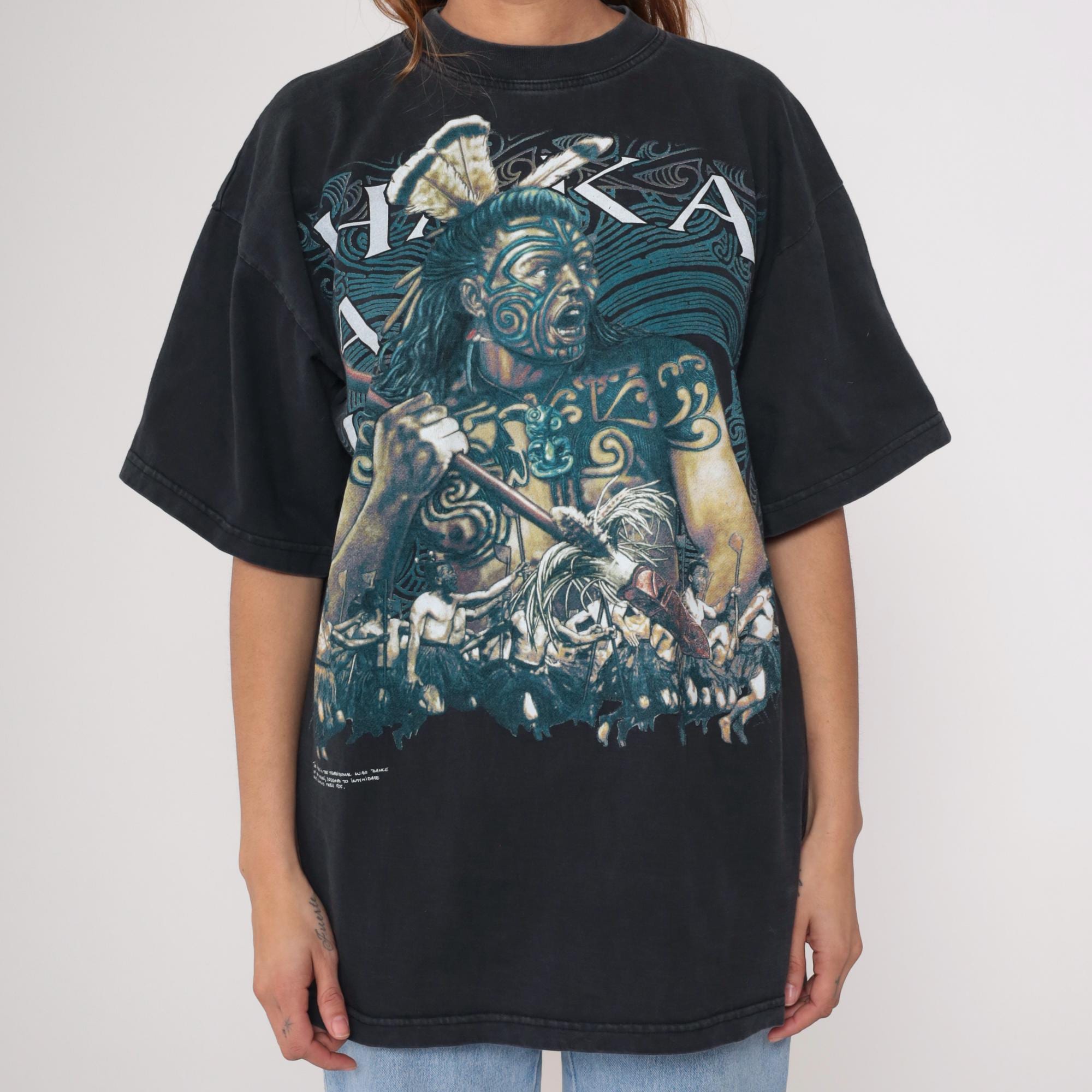 Vintage 90s Aotearoa black t-shirt with Maori warrior graphic. Features traditional facial tattoo and taiaha weapon. Oversize fit with crew neck and short sleeves.