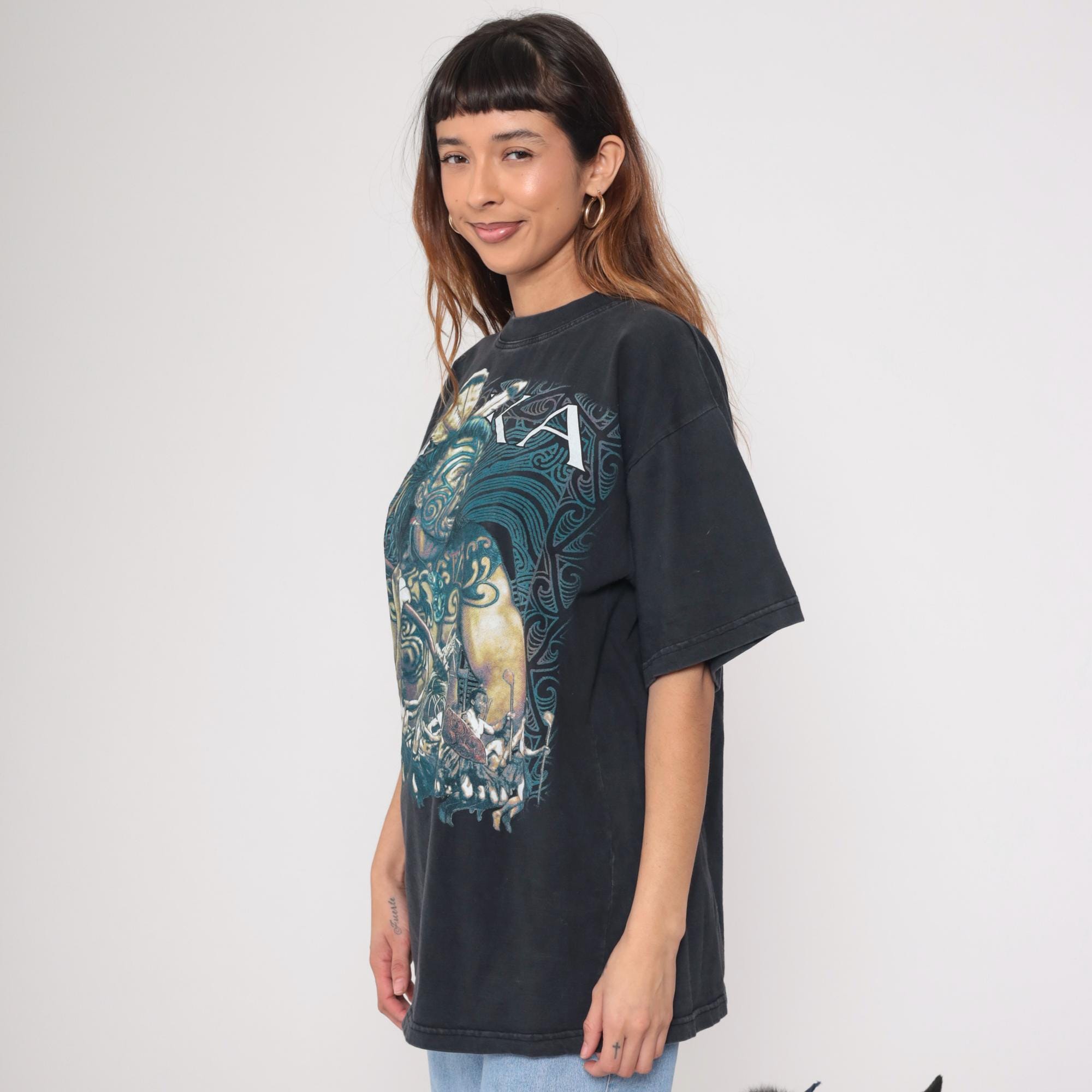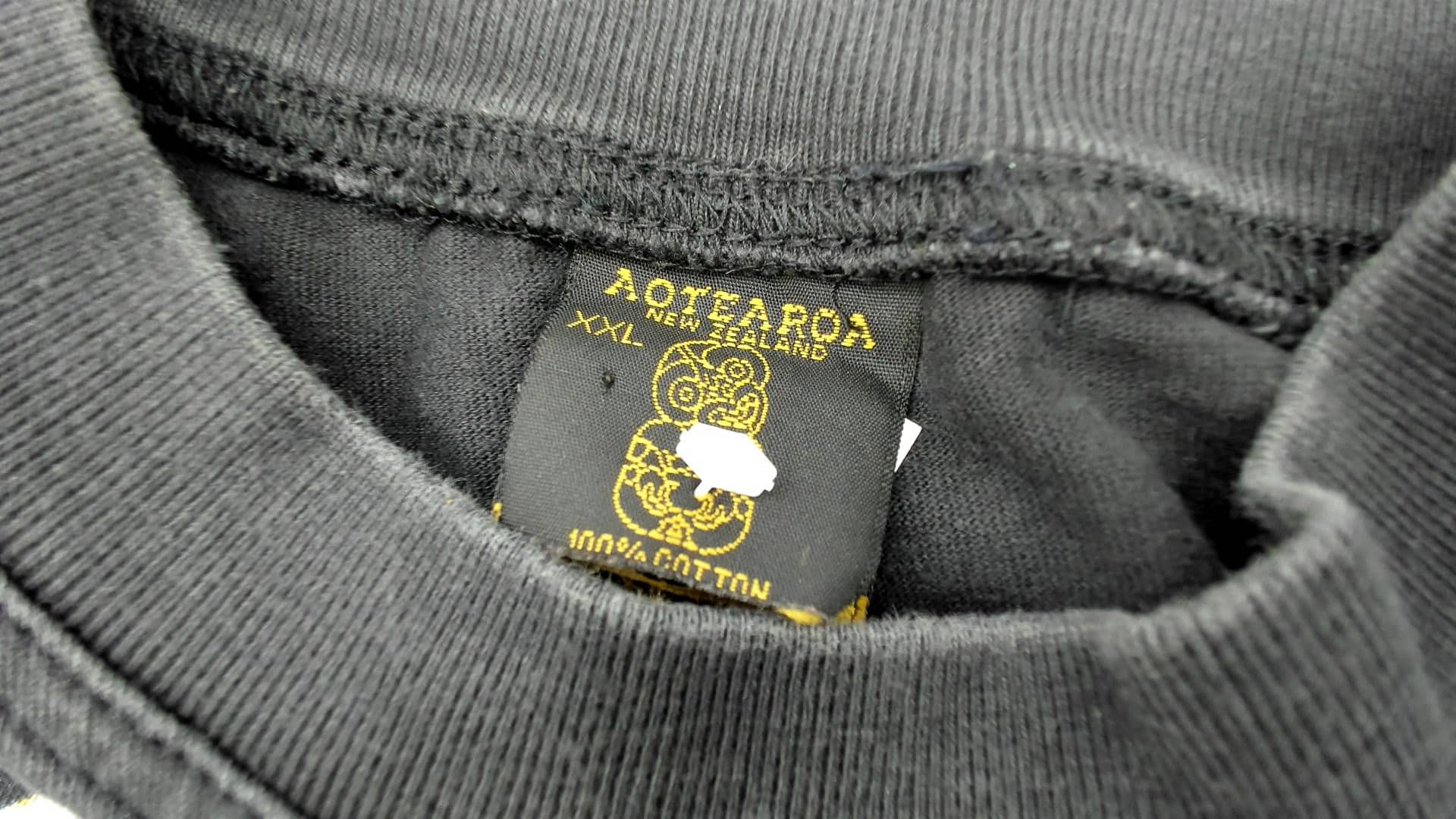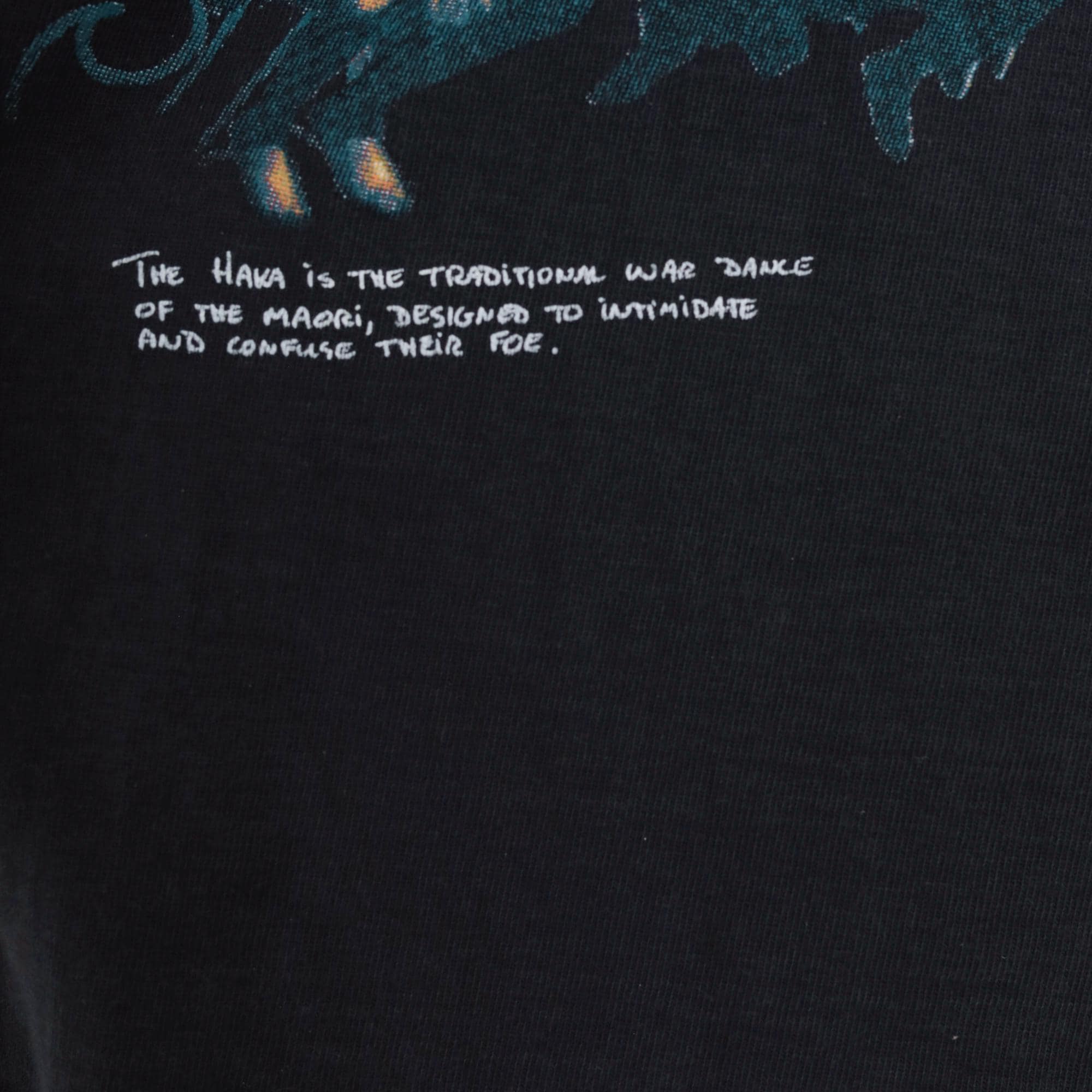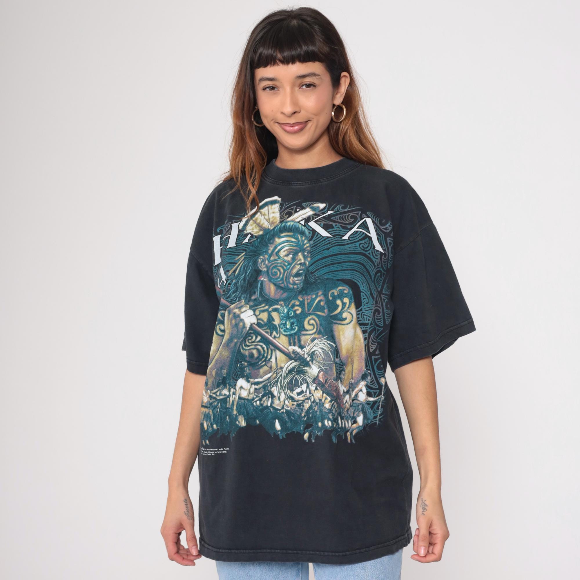 Vintage 90s Aotearoa black t-shirt with Maori warrior graphic. Features traditional facial tattoo and taiaha weapon. Oversize fit with crew neck and short sleeves.