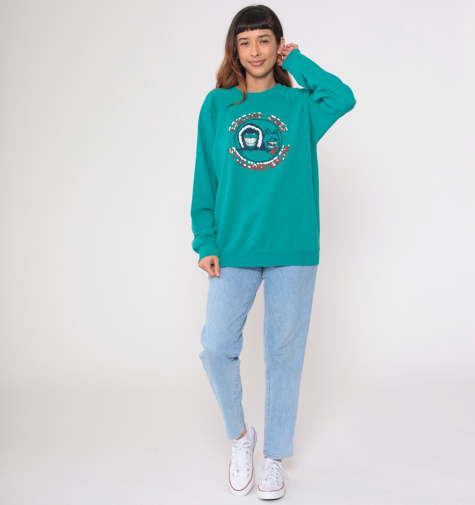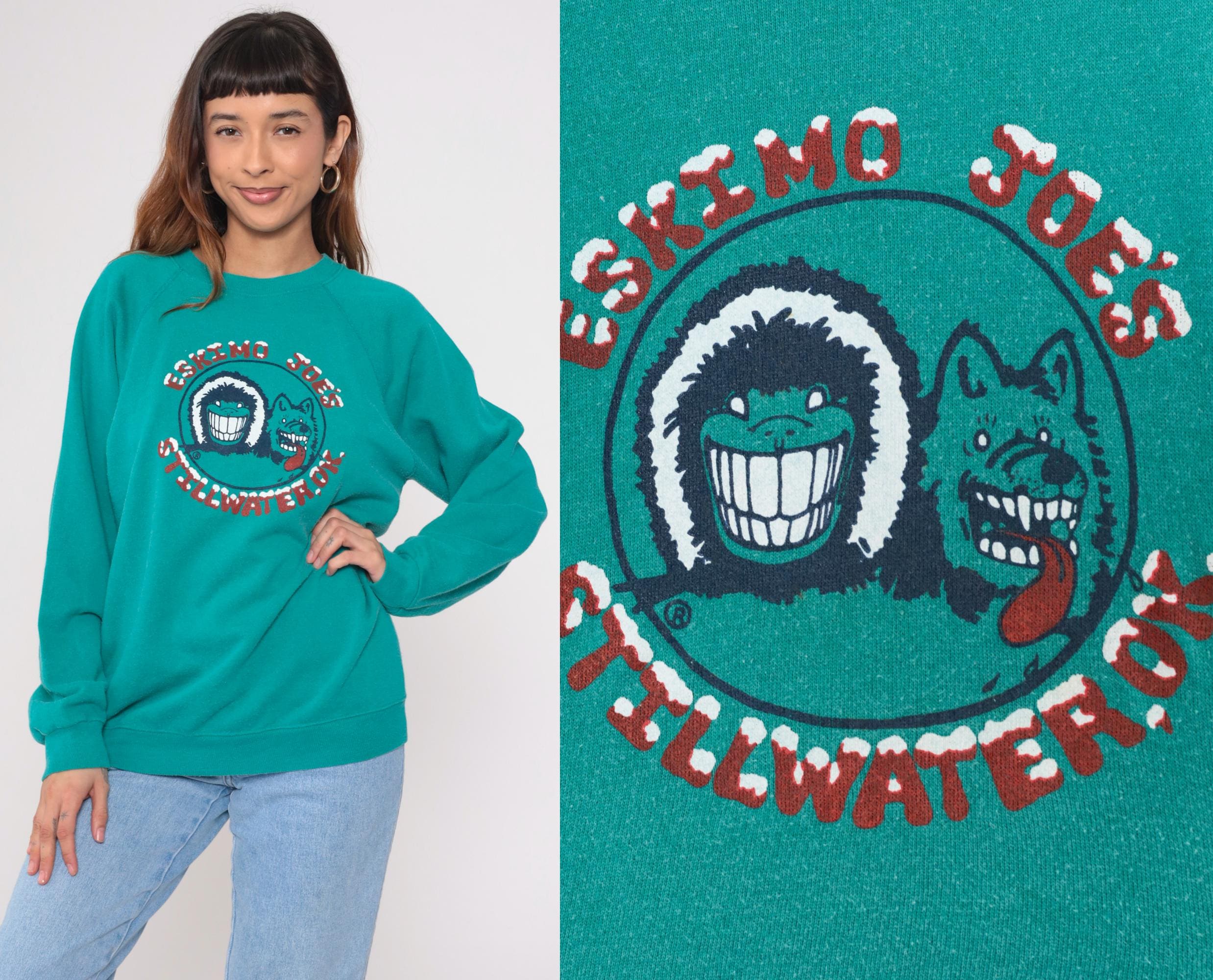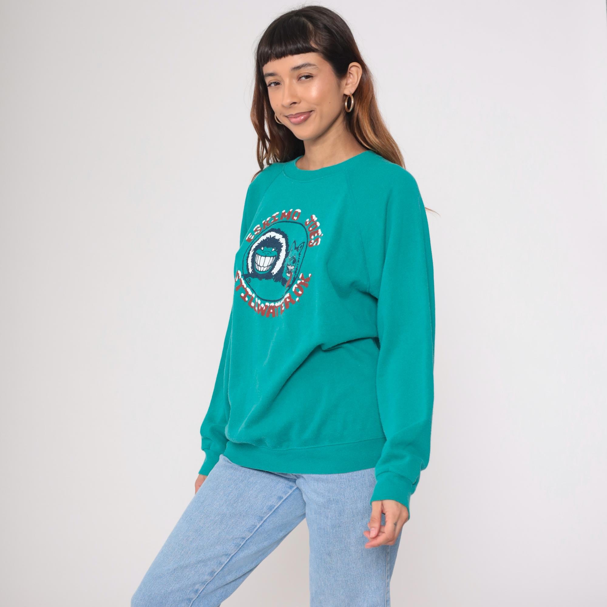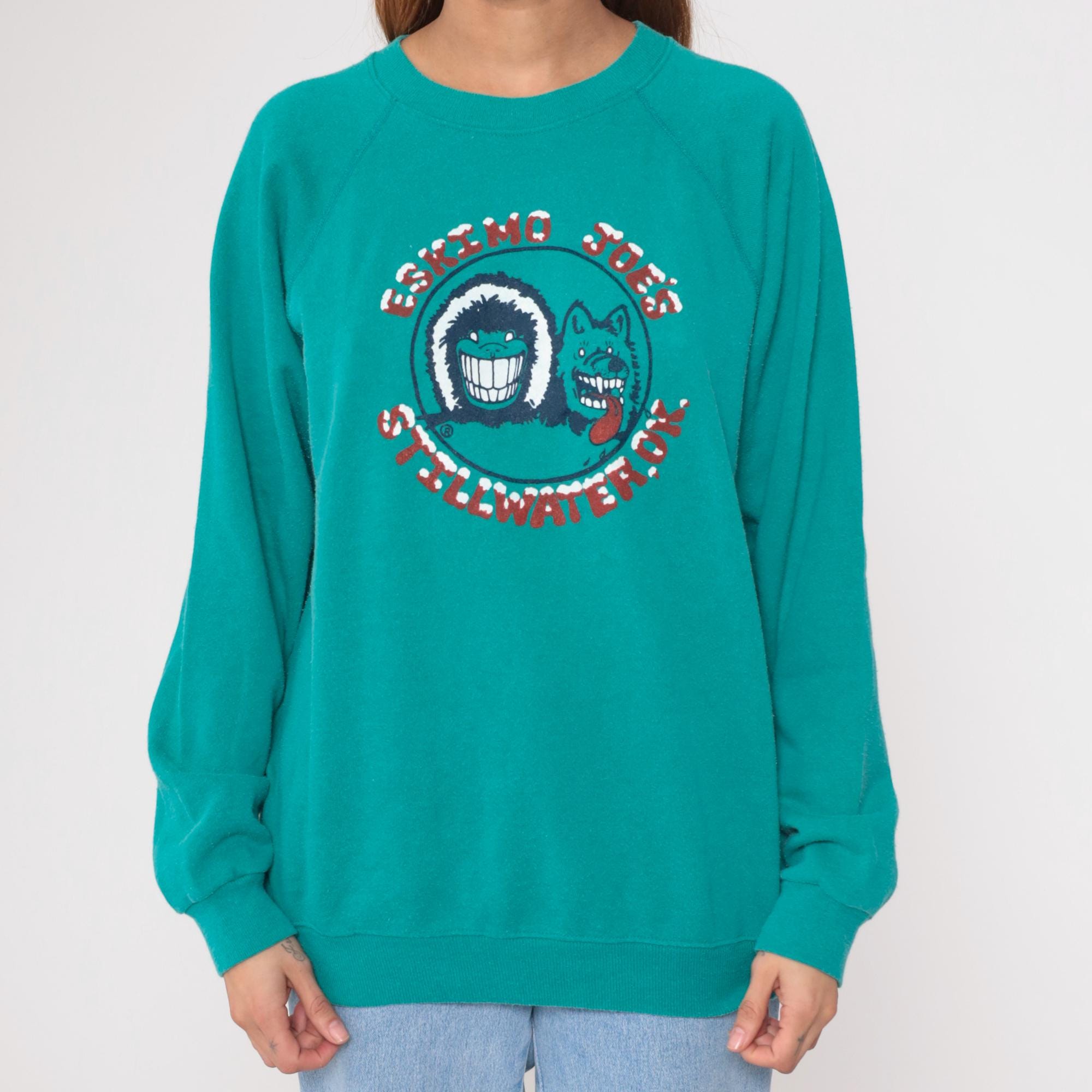 Vintage 90s Hanes sweatshirt from Eskimo Joes restaurant in Stillwater. Features cartoon graphic with wolf face. Teal with red lettering. Long sleeve with crew neck and raglan shoulders.