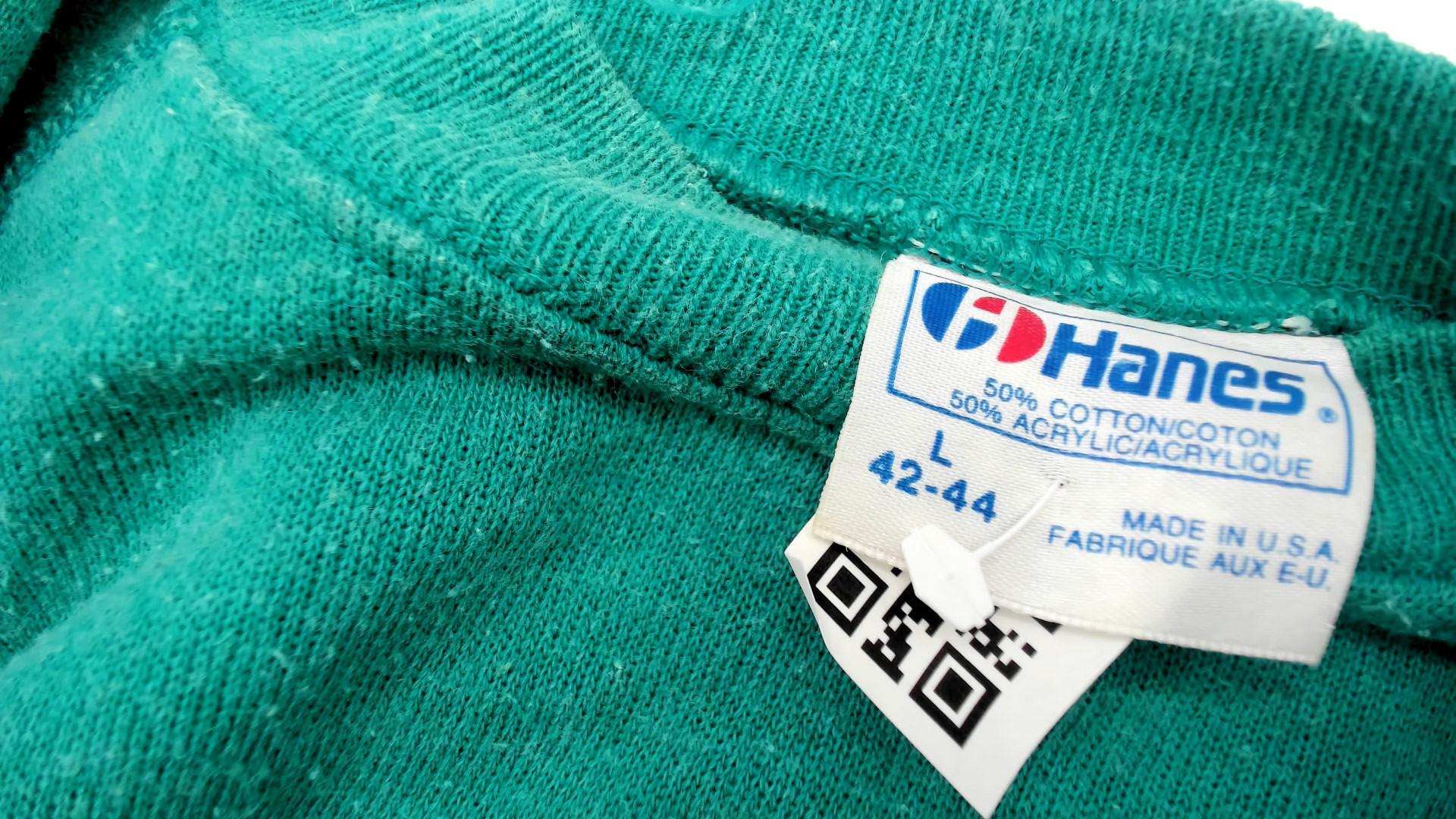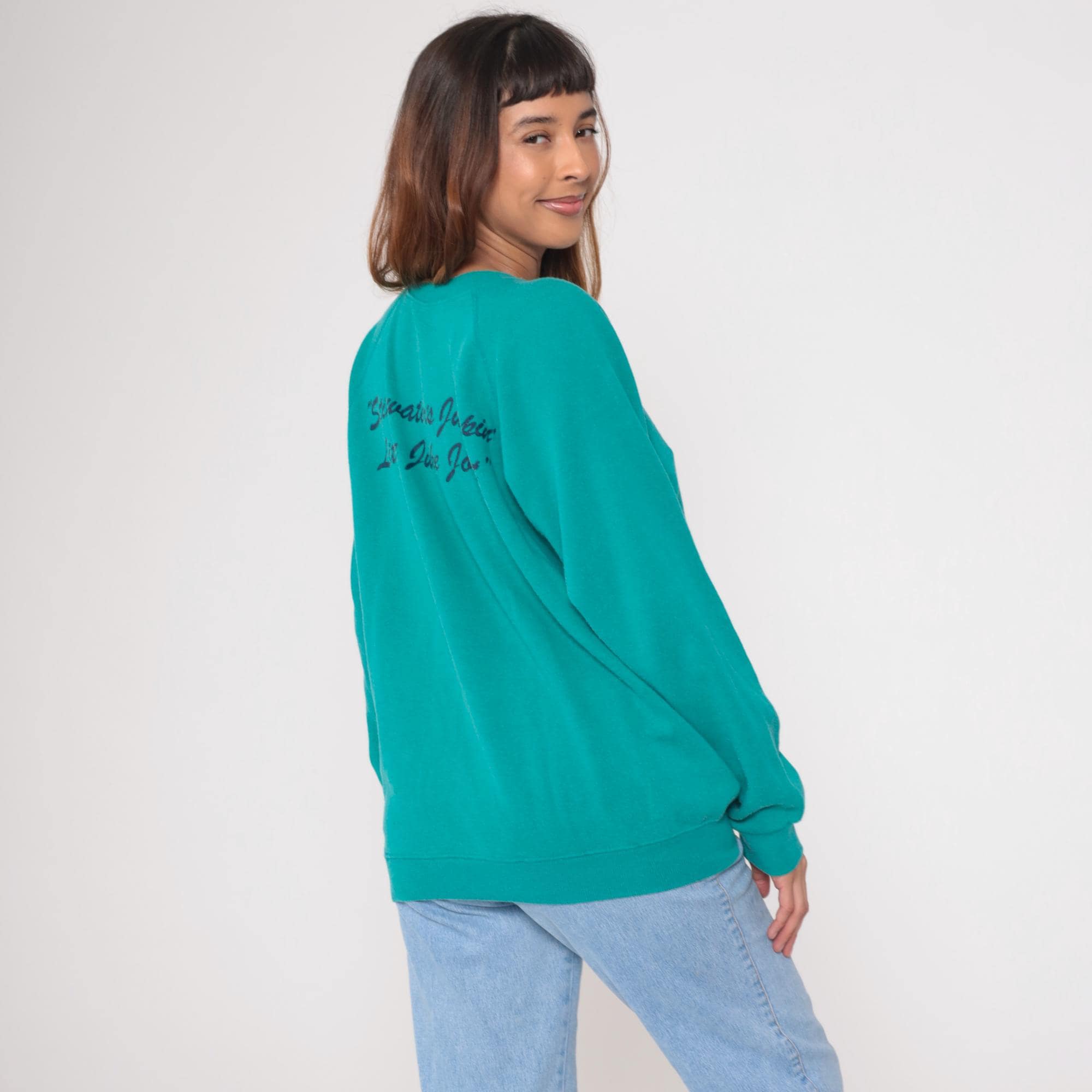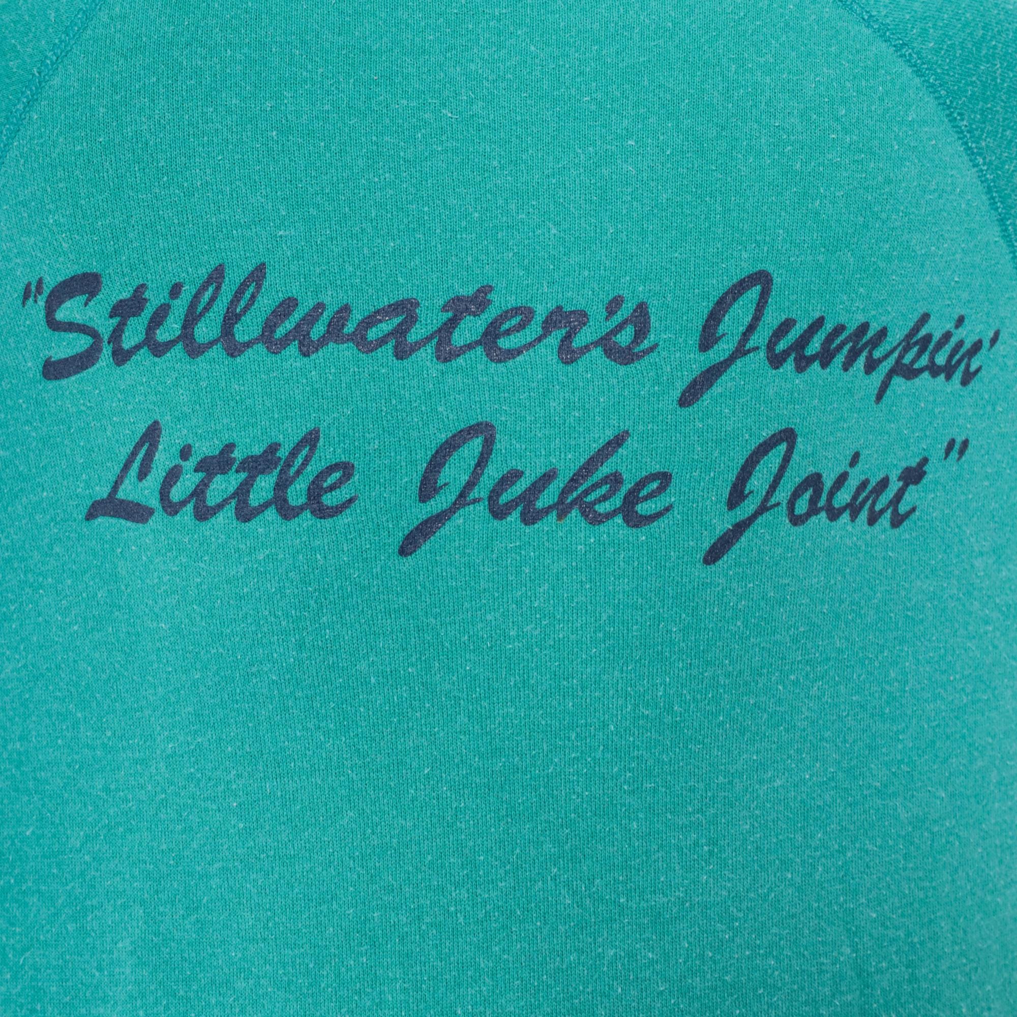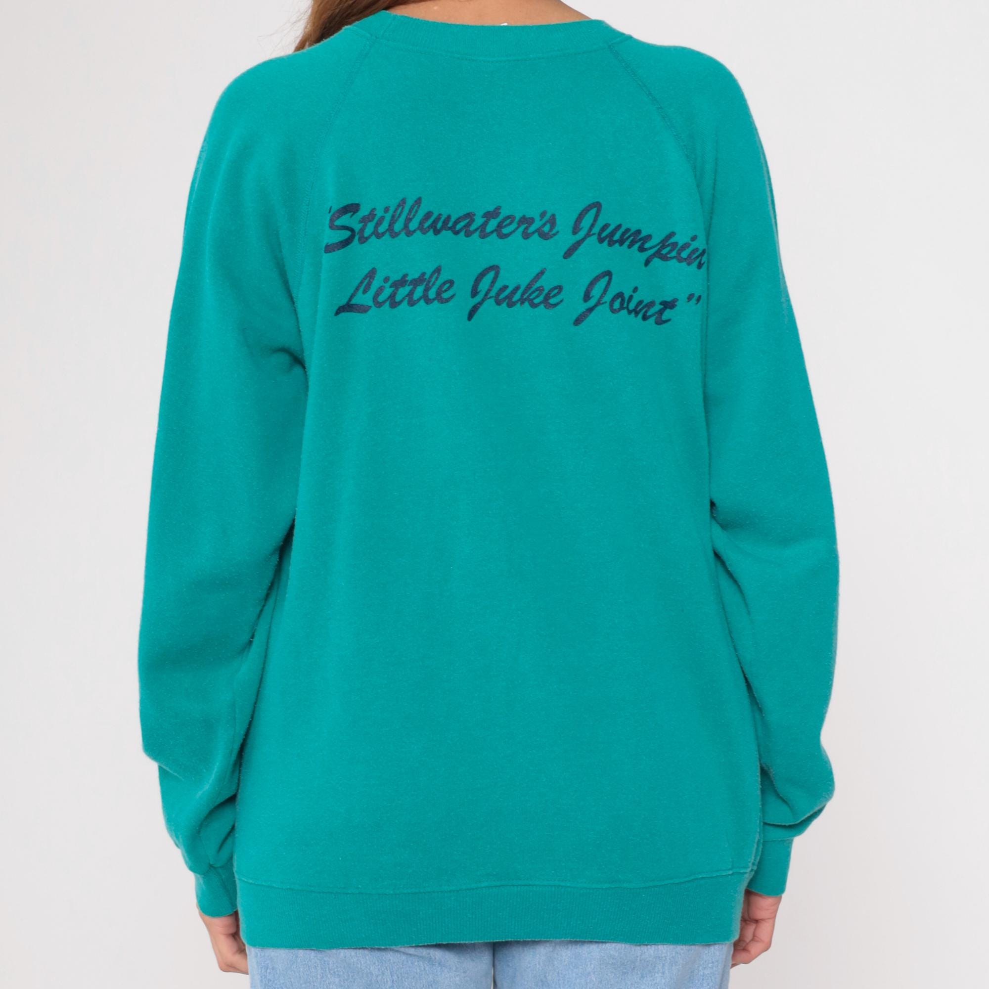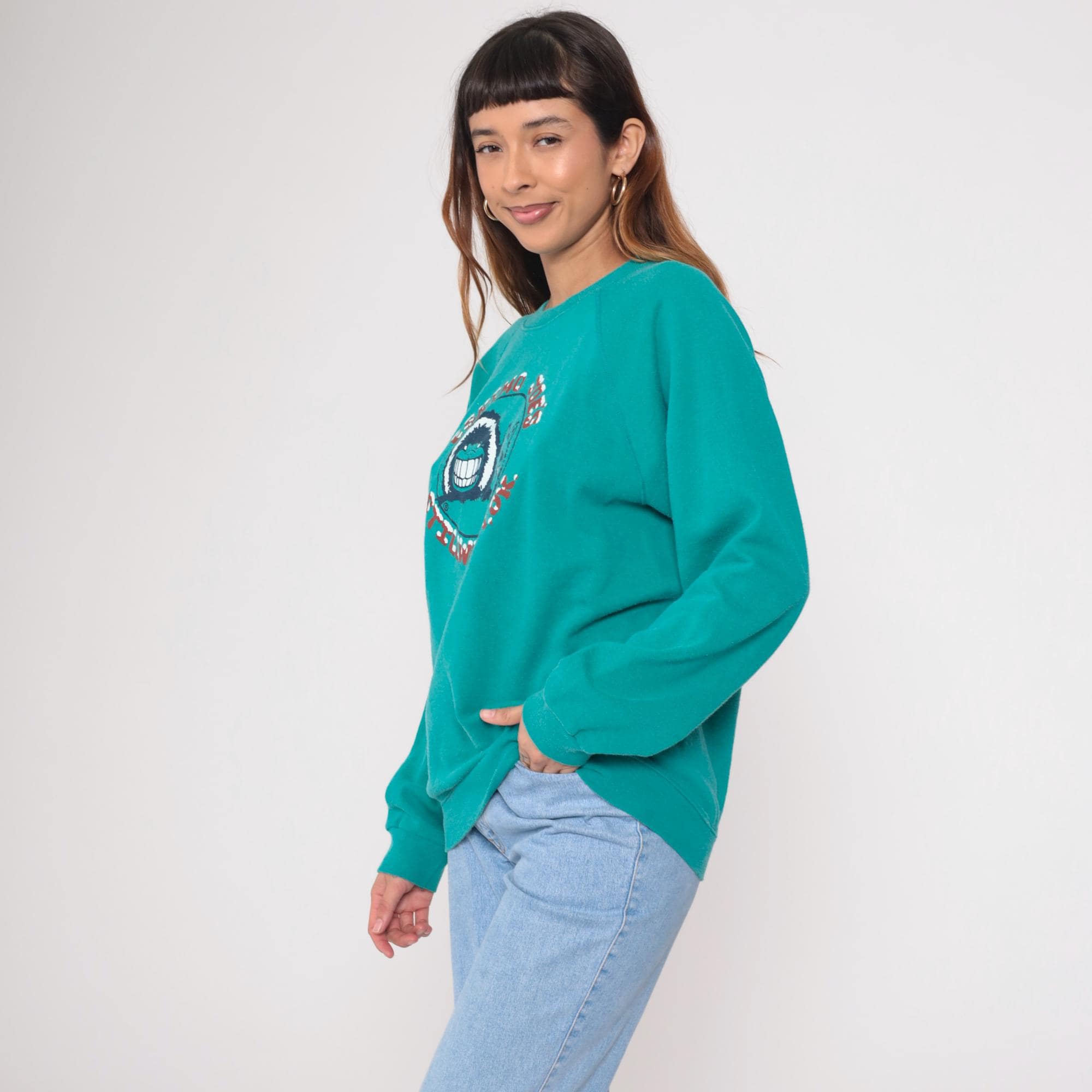Vintage 90s Hanes sweatshirt from Eskimo Joes restaurant in Stillwater. Features cartoon graphic with wolf face. Teal with red lettering. Long sleeve with crew neck and raglan shoulders.