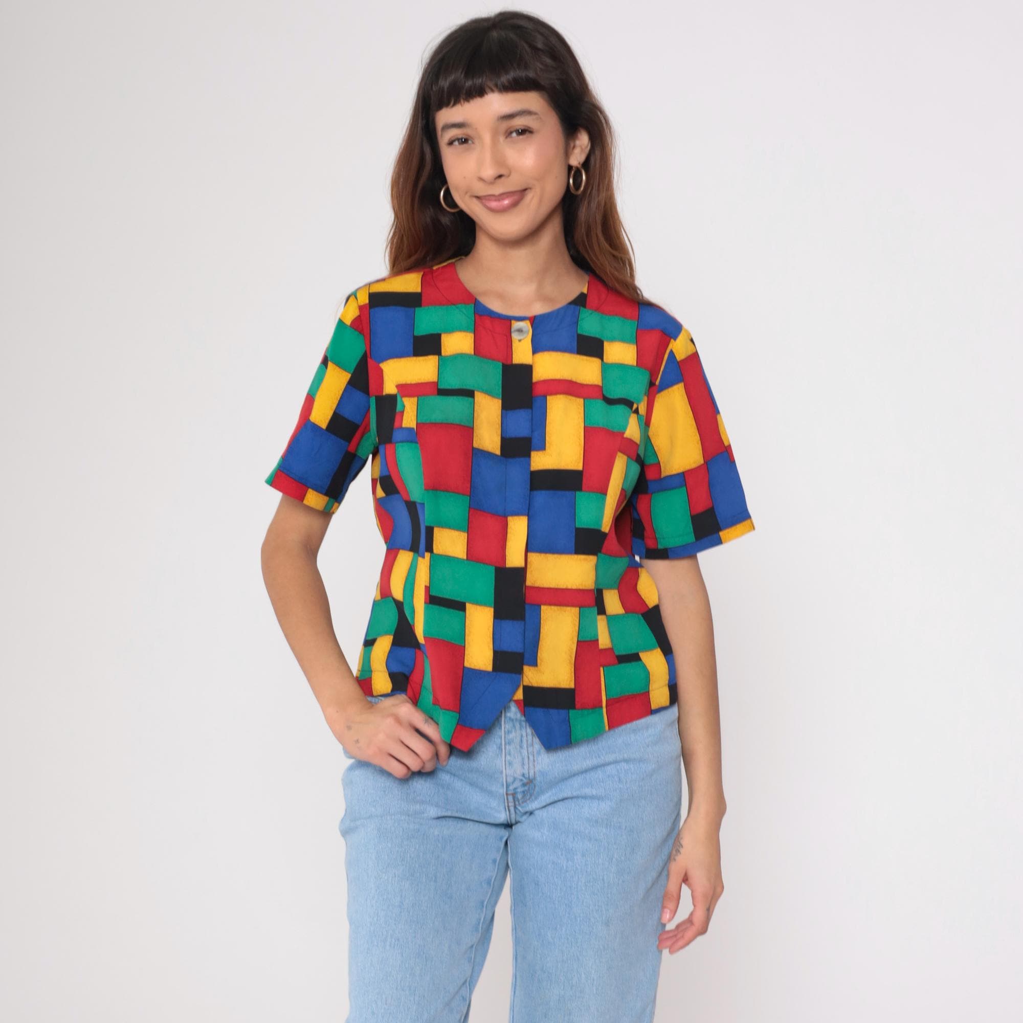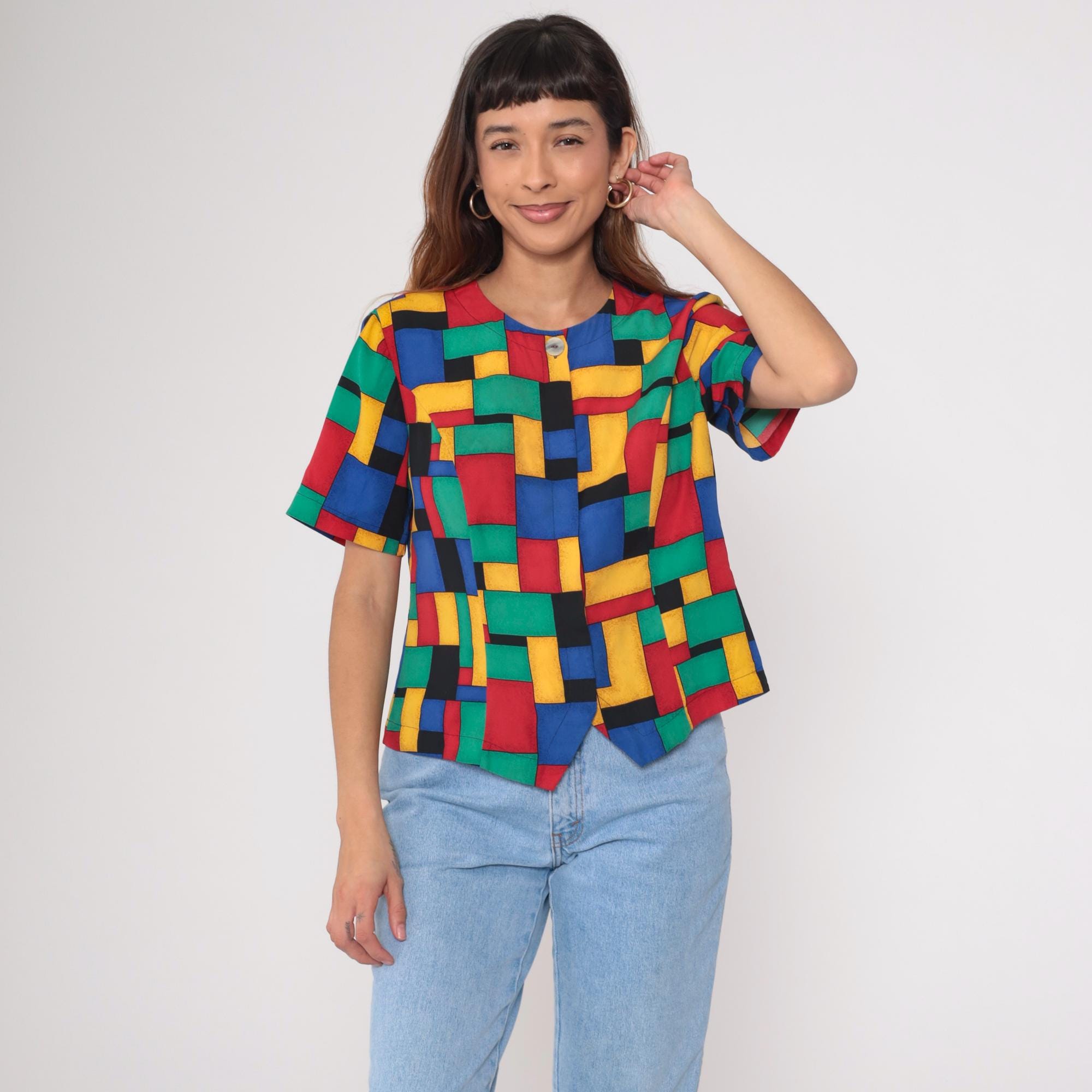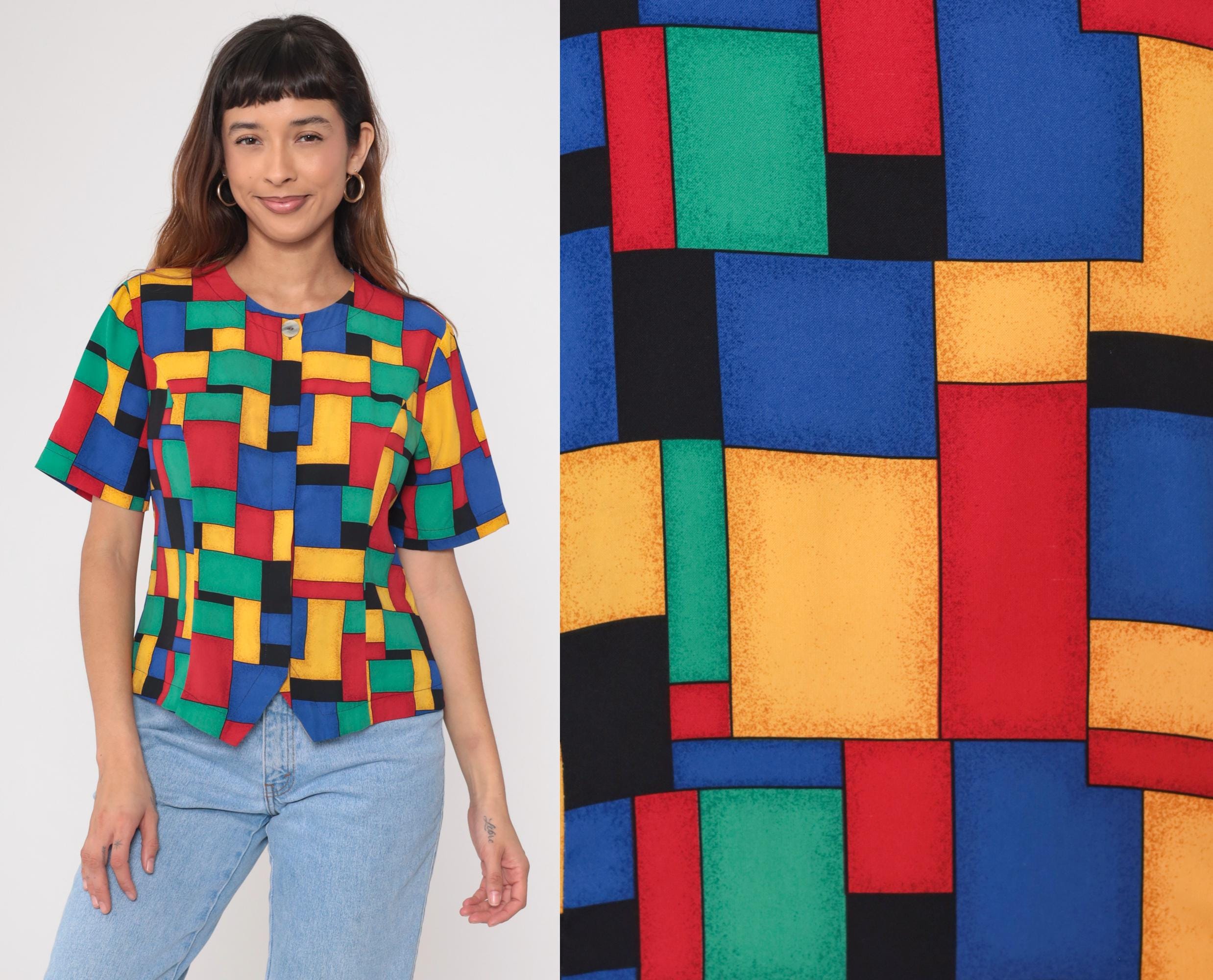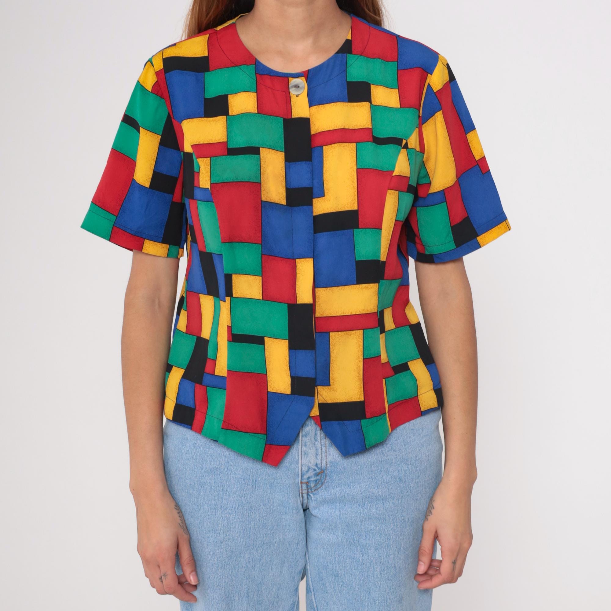 Vintage 90s Kathy Che blouse with primary color block pattern. Features blue, red, yellow, green and black geometric squares. Short sleeves with asymmetric hemline and single button closure.