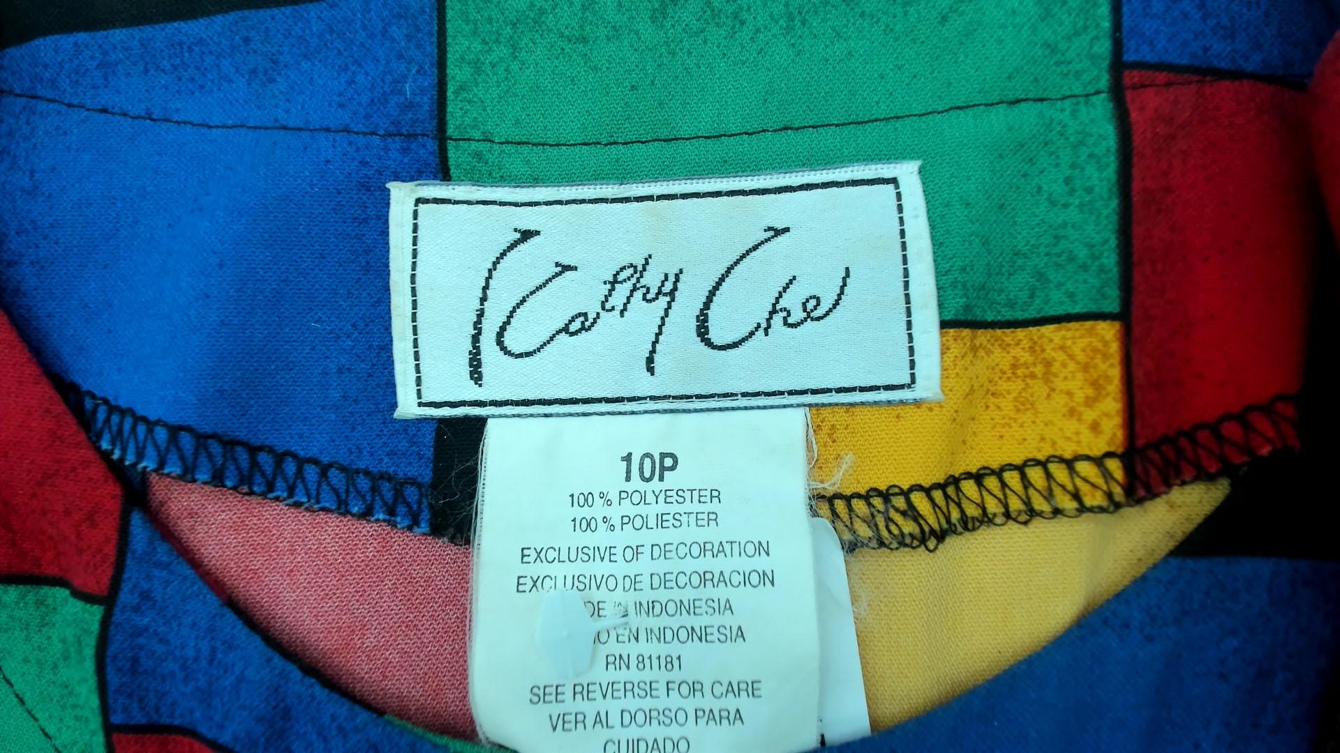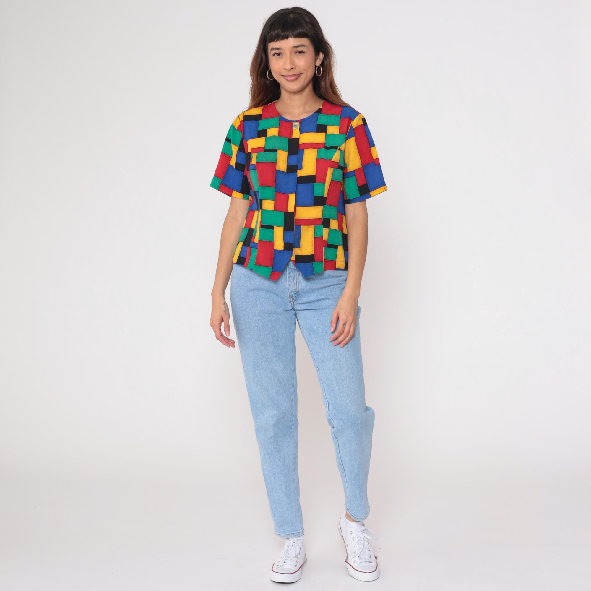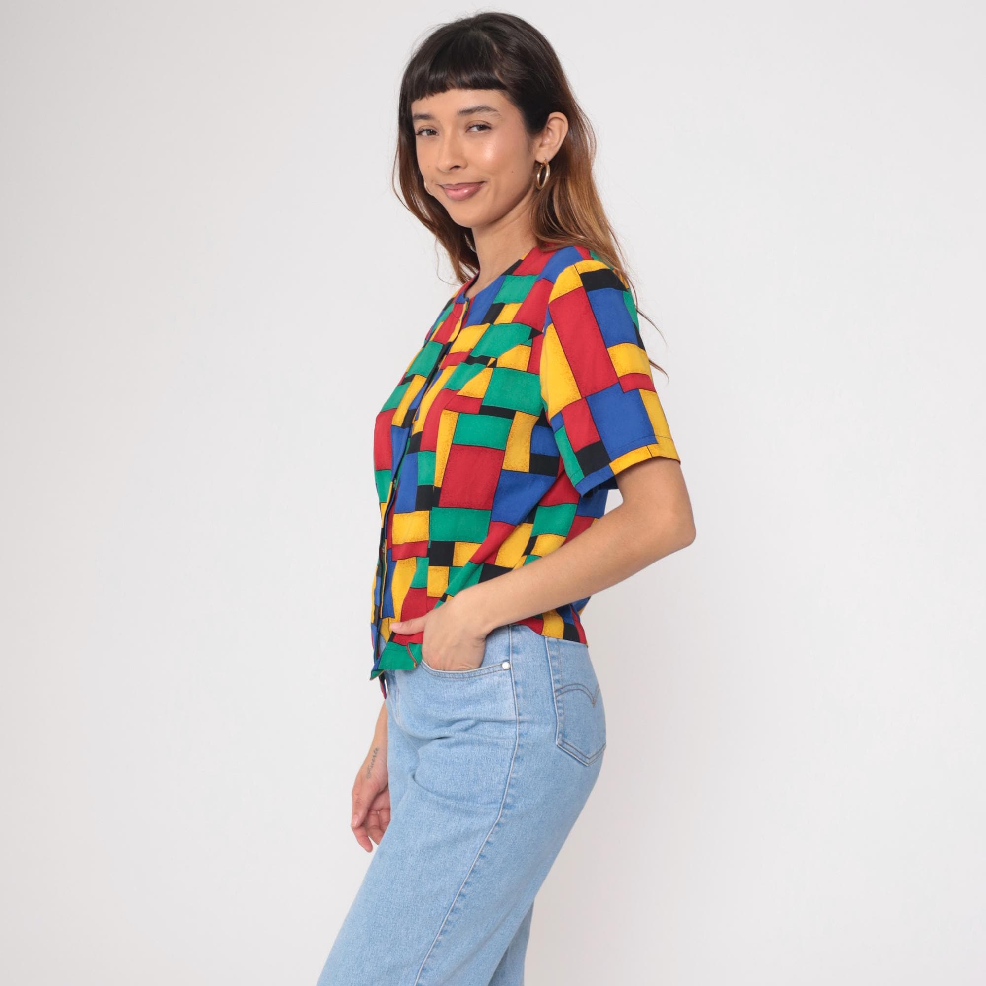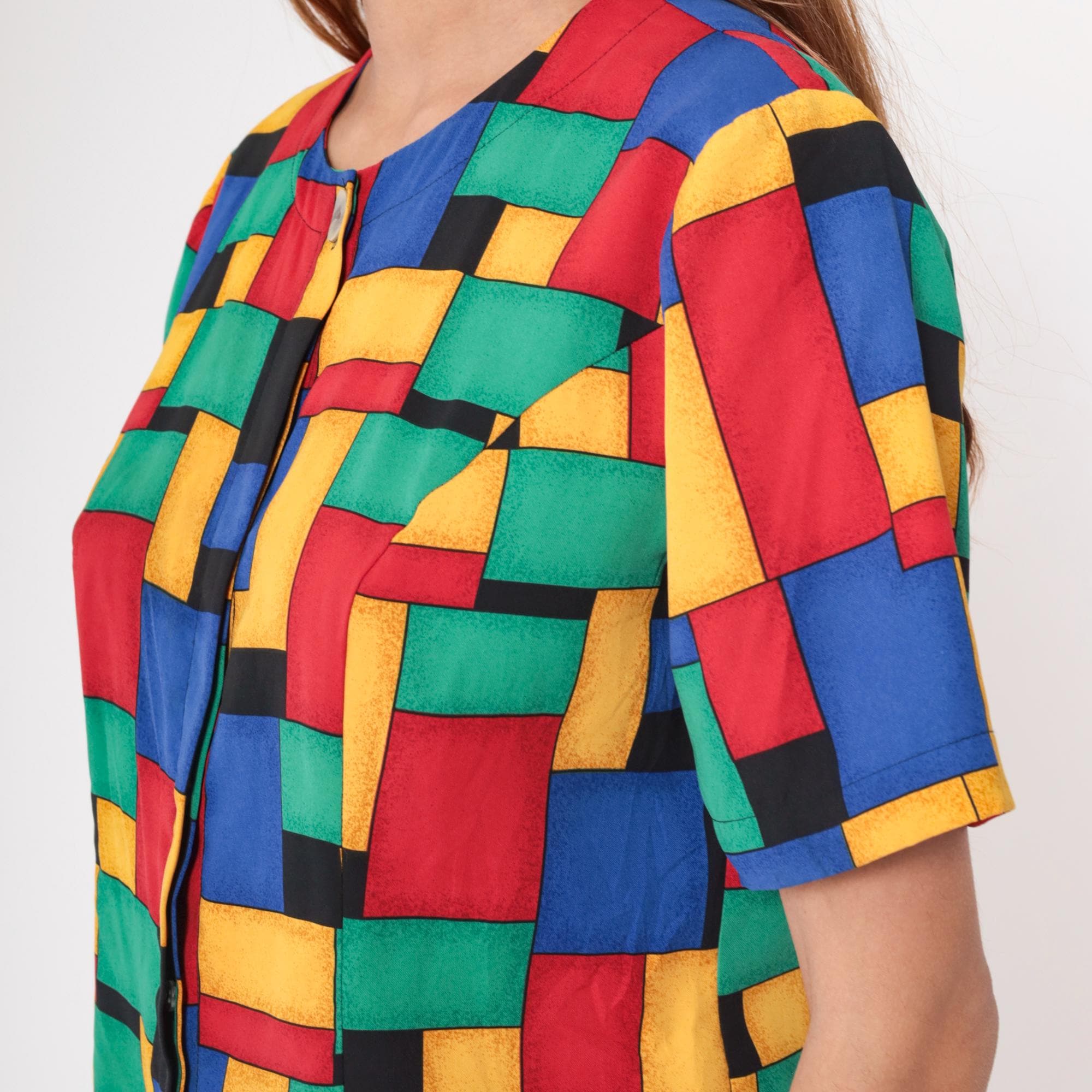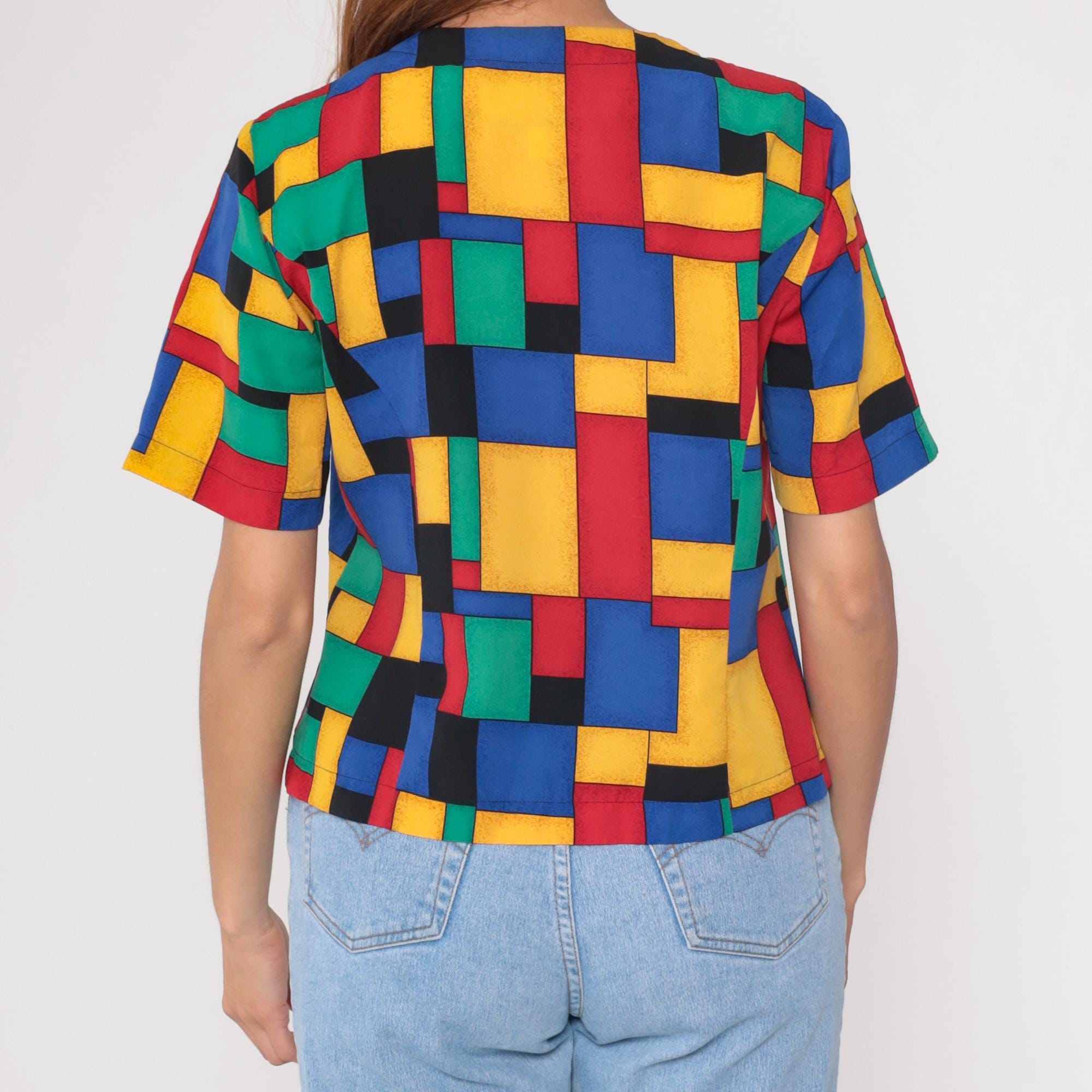 Vintage 90s Kathy Che blouse with primary color block pattern. Features blue, red, yellow, green and black geometric squares. Short sleeves with asymmetric hemline and single button closure.