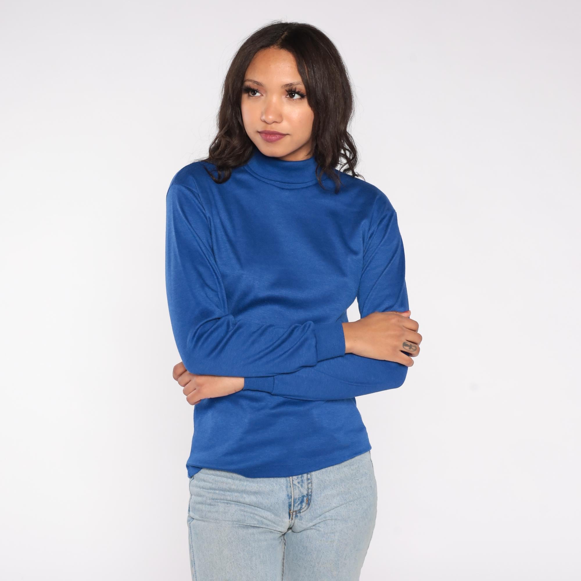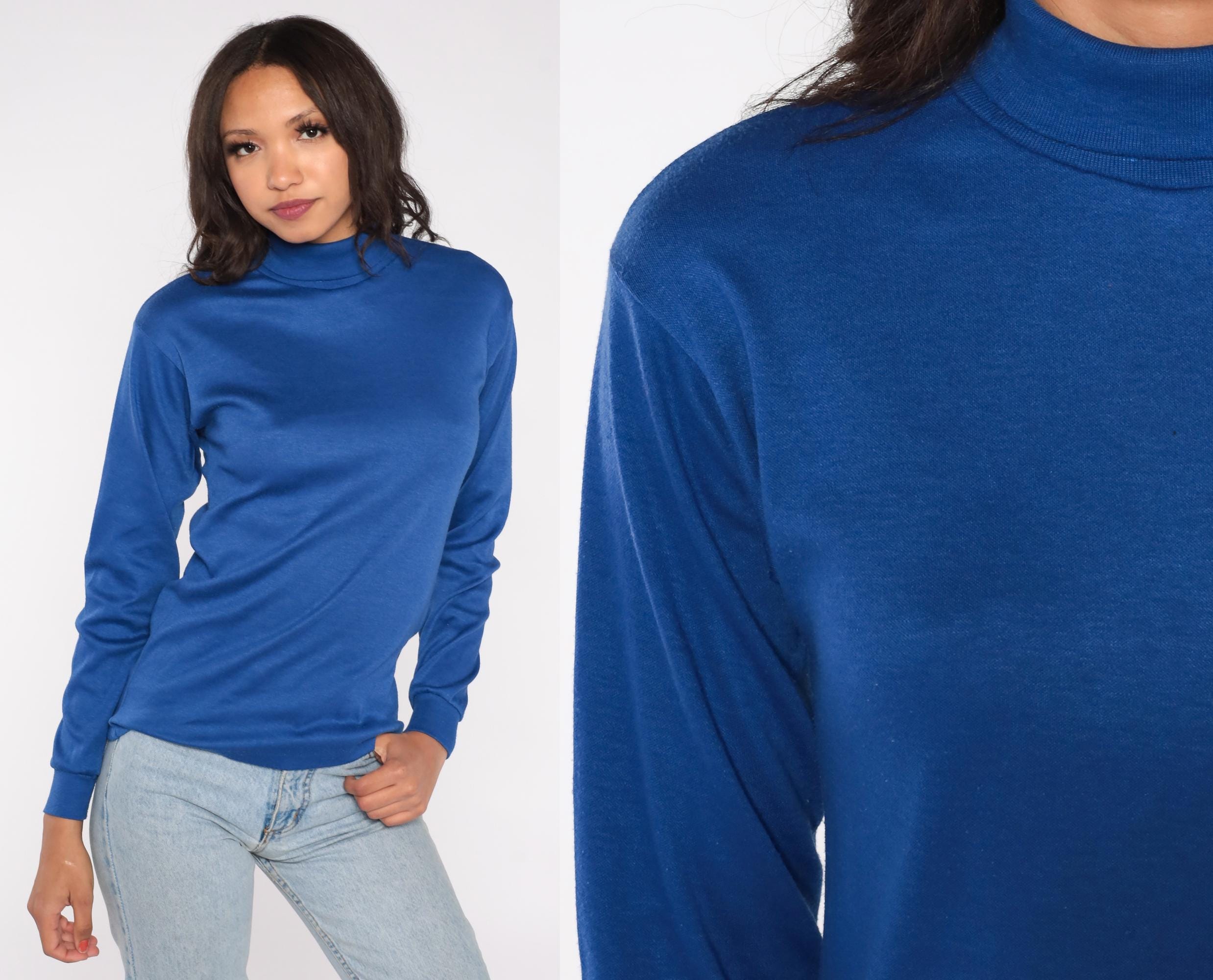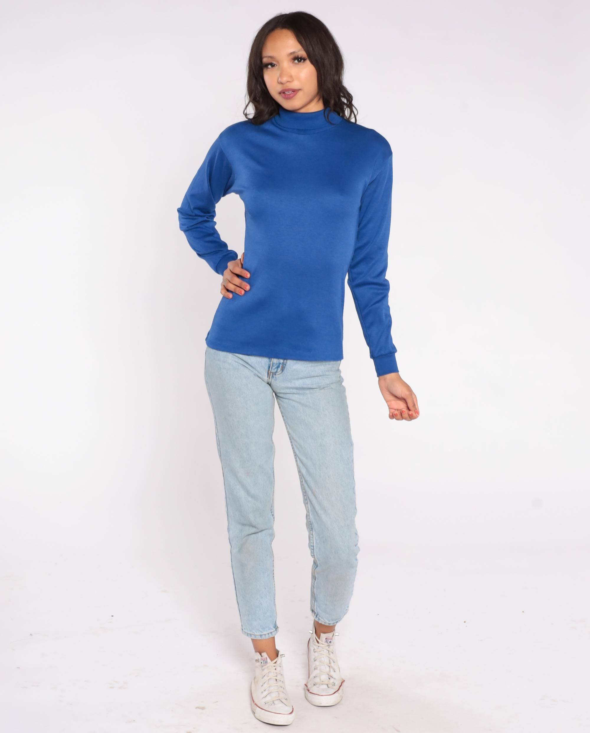 80s royal blue turtleneck from Favorites brand. Features vibrant cobalt blue cotton-polyester blend fabric with classic mock neck design. Long sleeves with ribbed cuffs and hem.