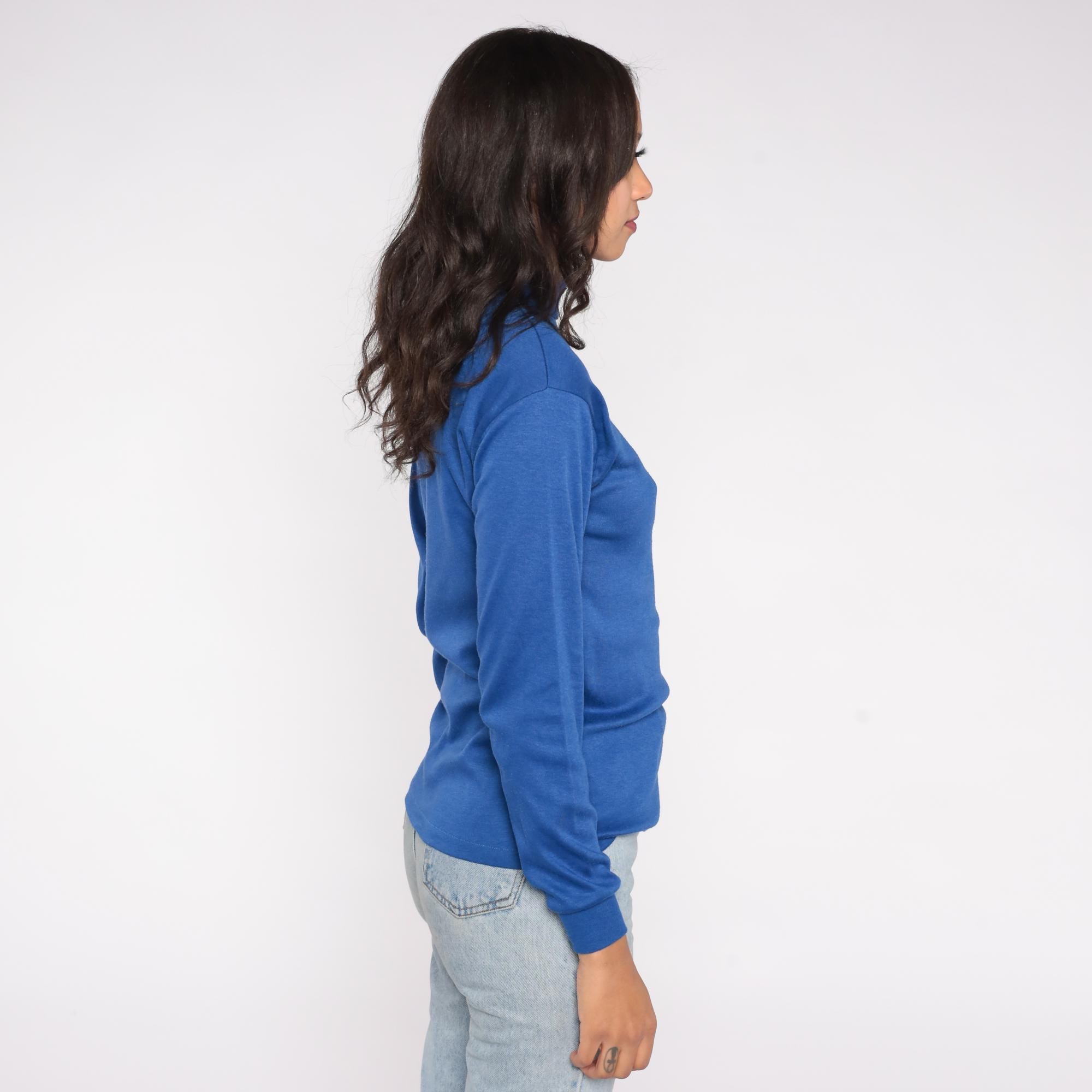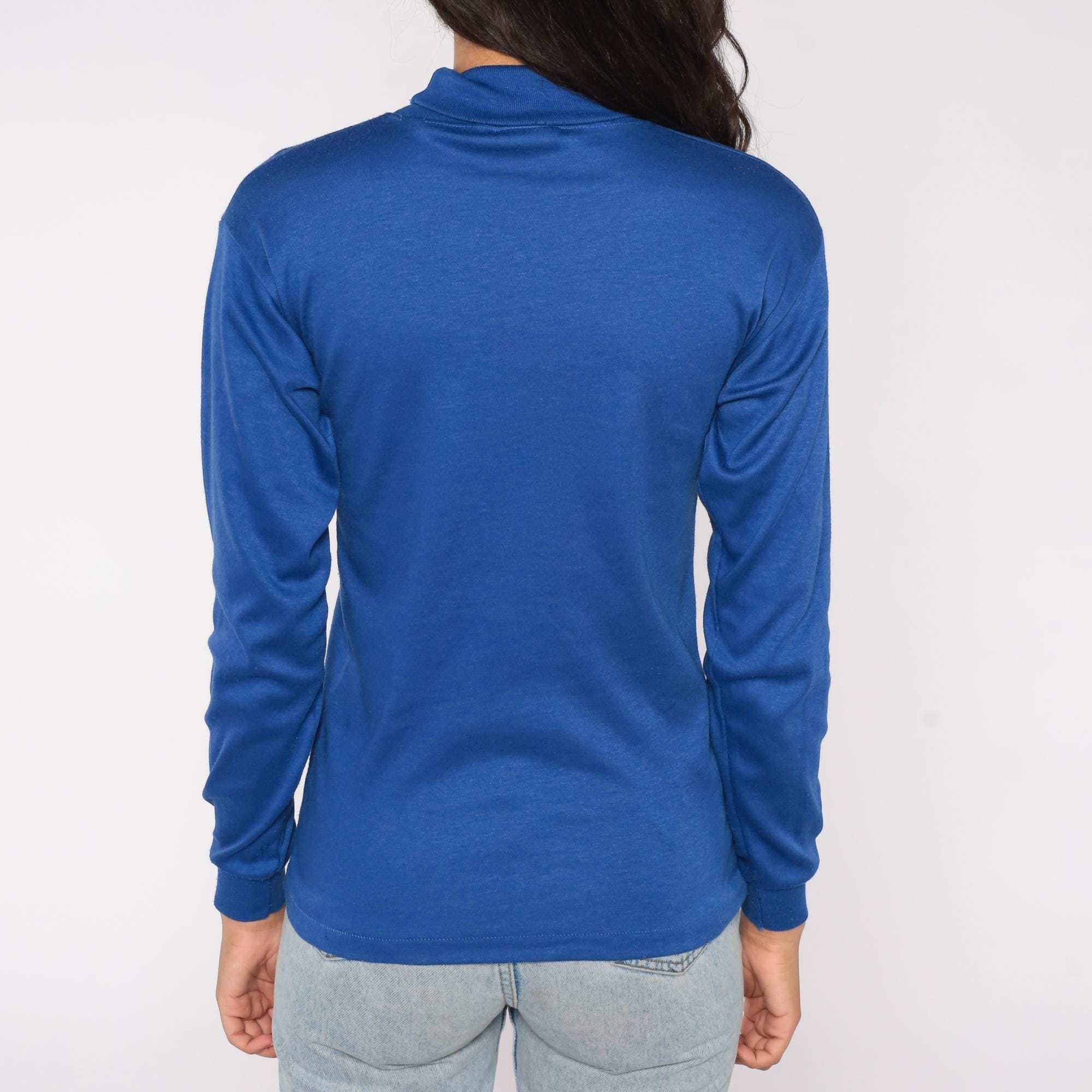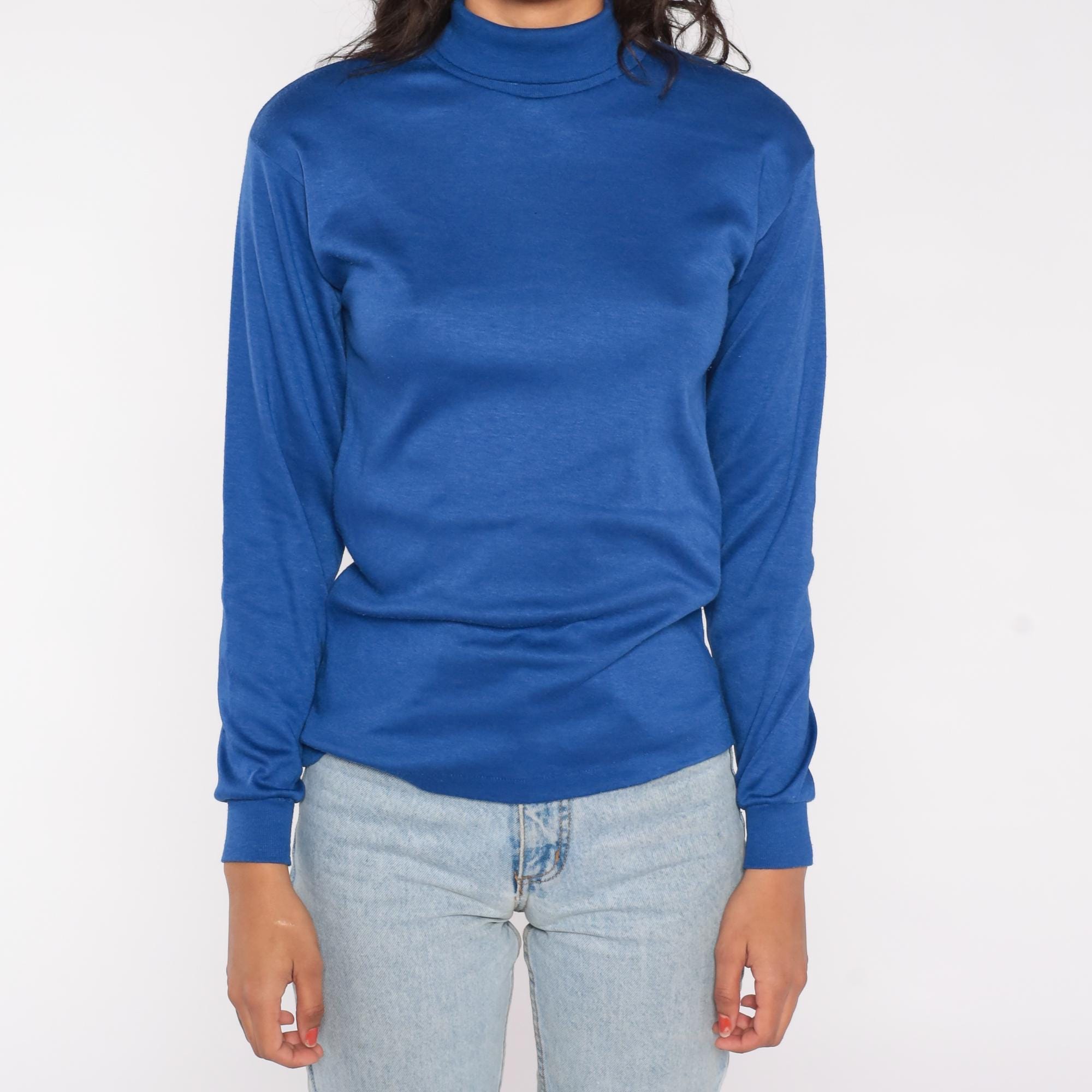 80s royal blue turtleneck from Favorites brand. Features vibrant cobalt blue cotton-polyester blend fabric with classic mock neck design. Long sleeves with ribbed cuffs and hem.