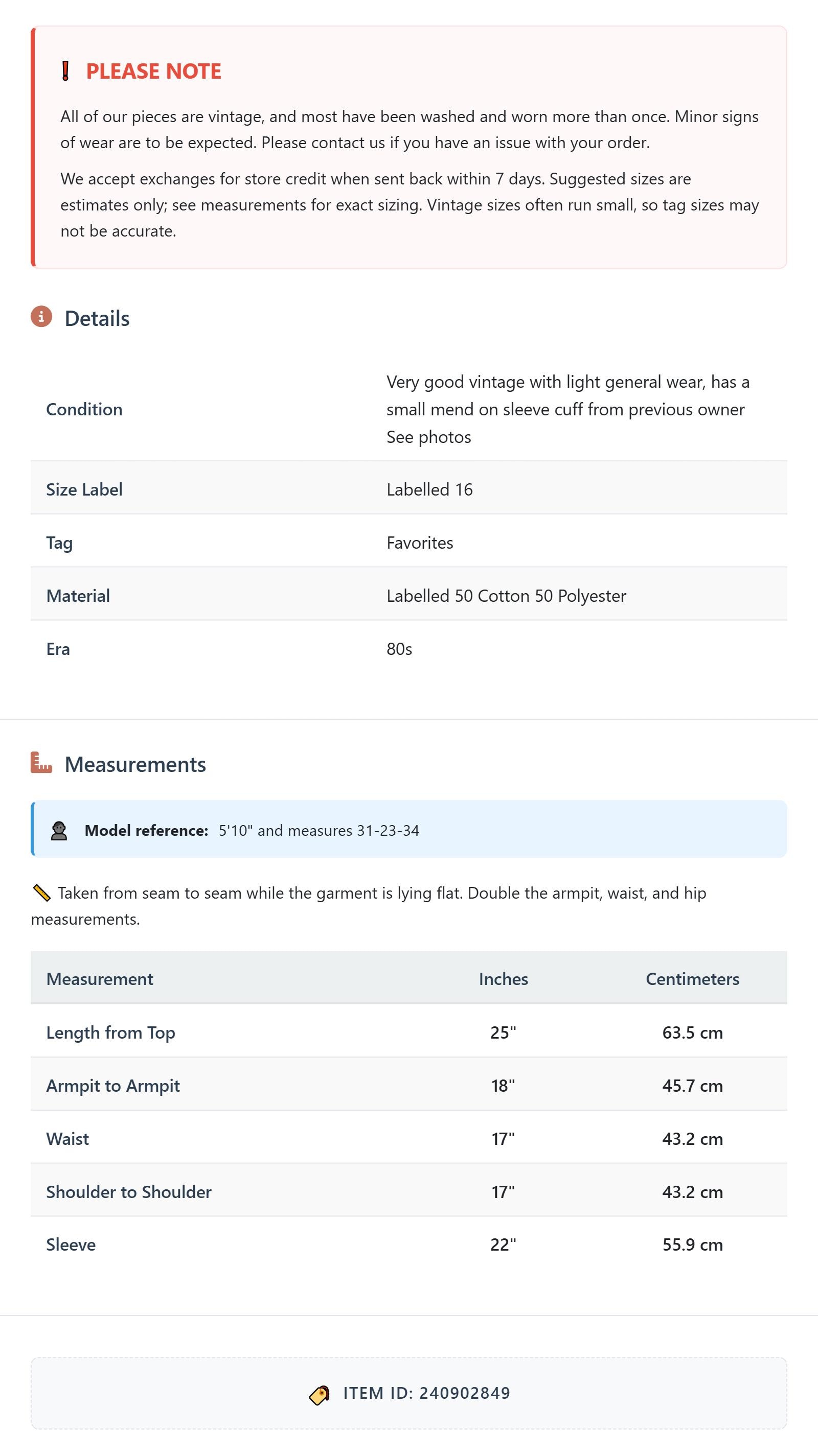 All of our pieces are vintage, and most have been washed and worn more than once. Minor signs of wear are to be expected. Please contact us if you have an issue with your order. We accept exchanges for store credit when sent back within 7 days.